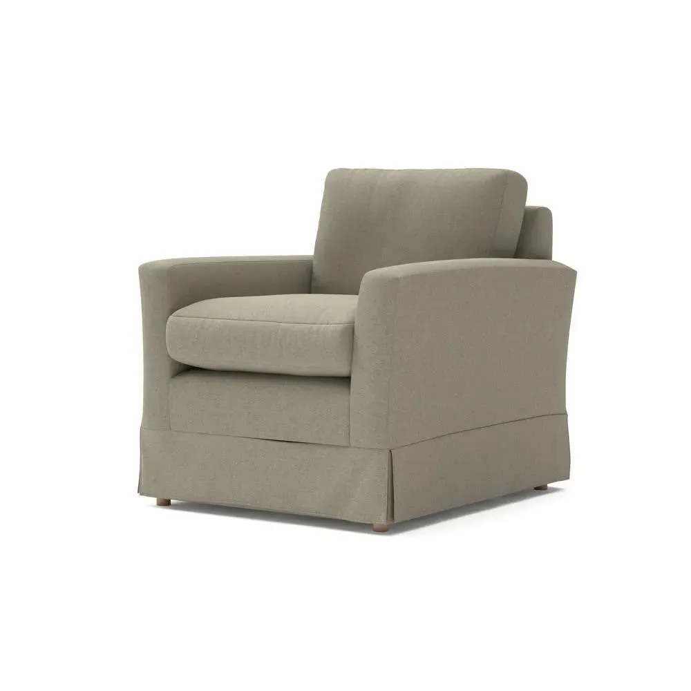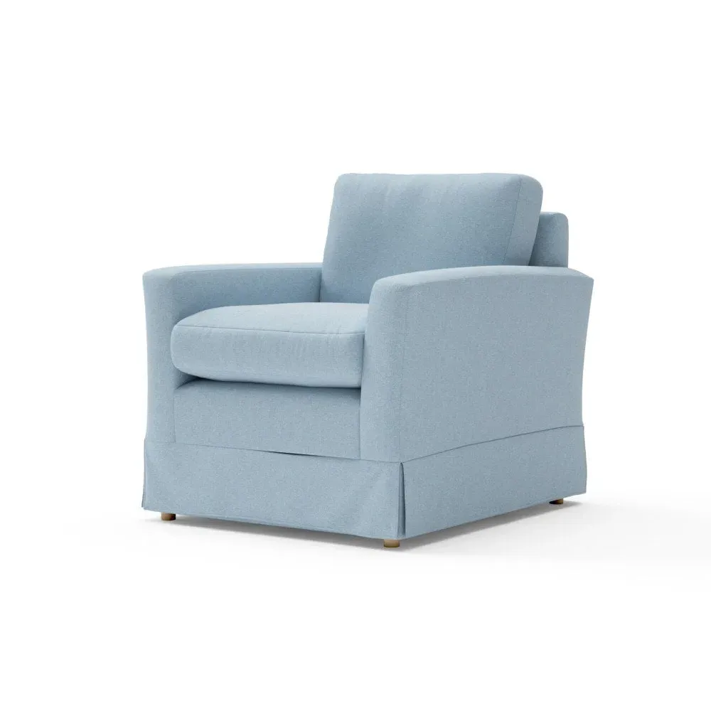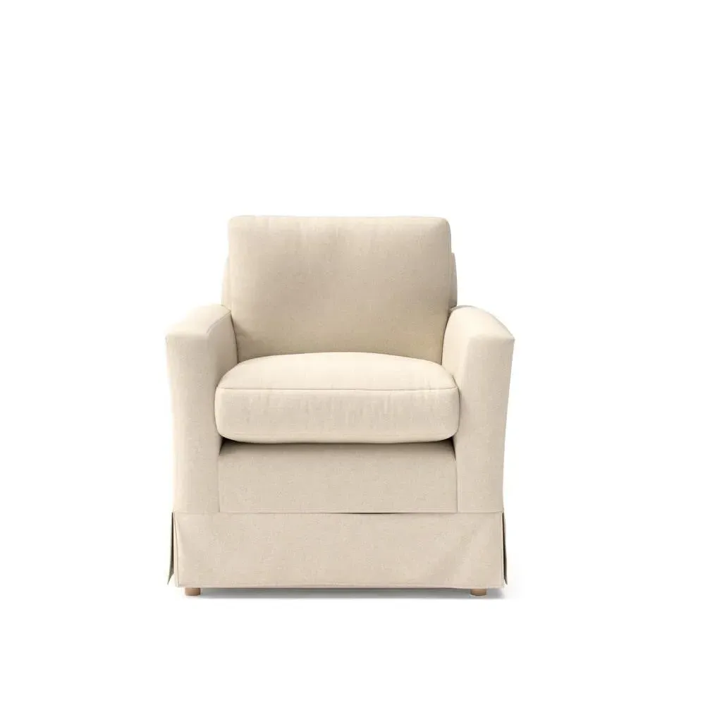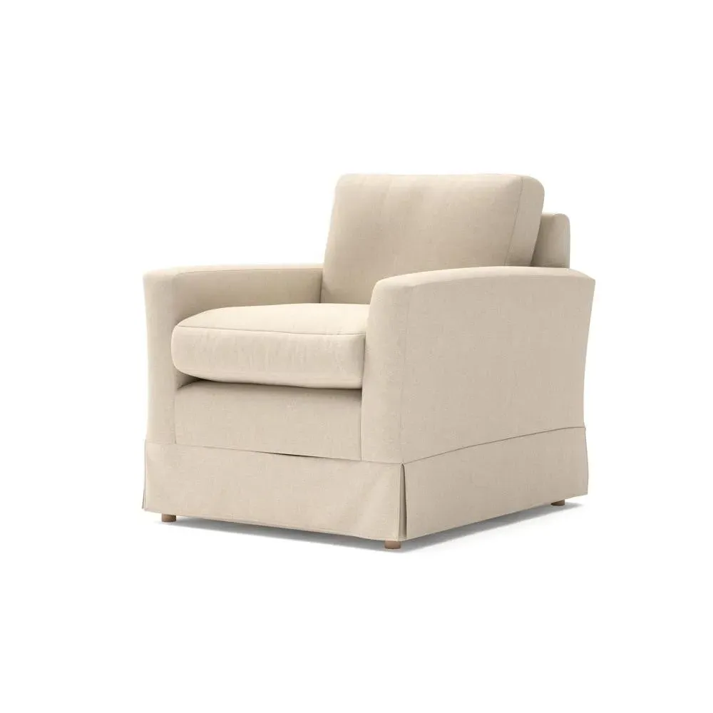 The armchair offers comfort with its slim arms and clean-lined silhouette, featuring a straight back that invites extra cushions for added support. Its house linen mix upholstery provides durability, while the streamlined design suits various living spaces. Available in both luxurious feather or low maintenance interior options, with loose covers available separately.