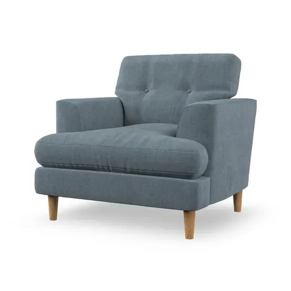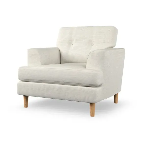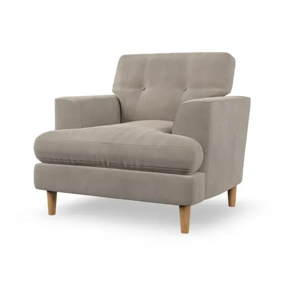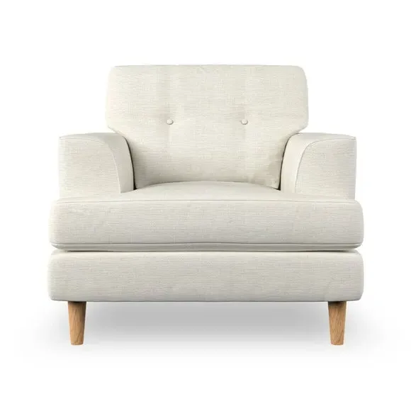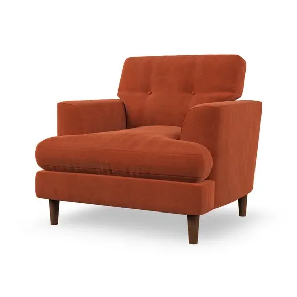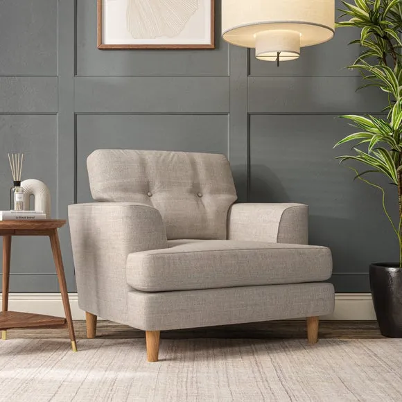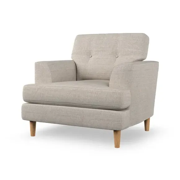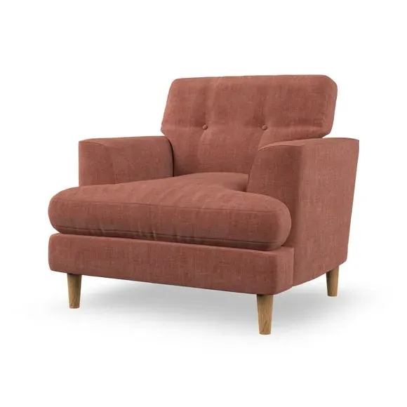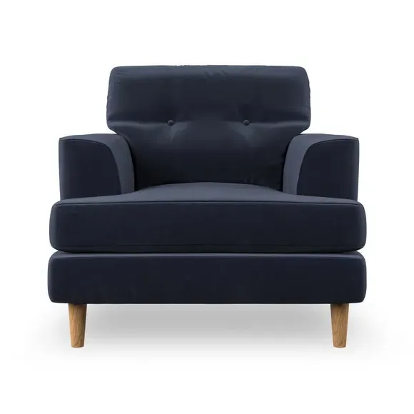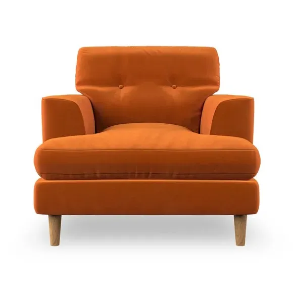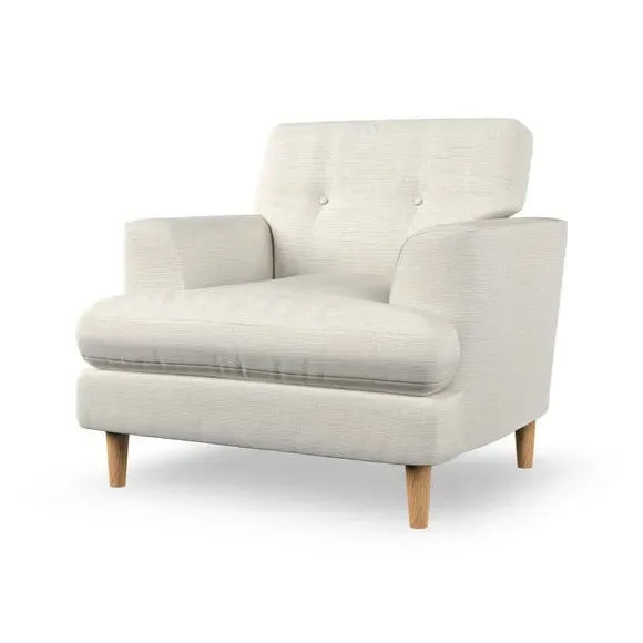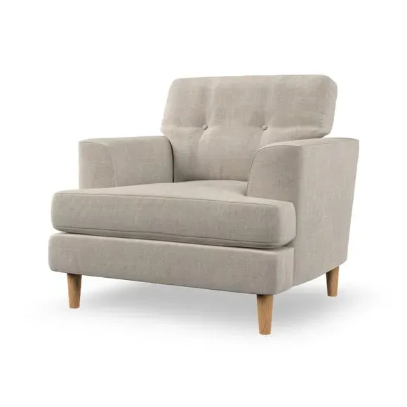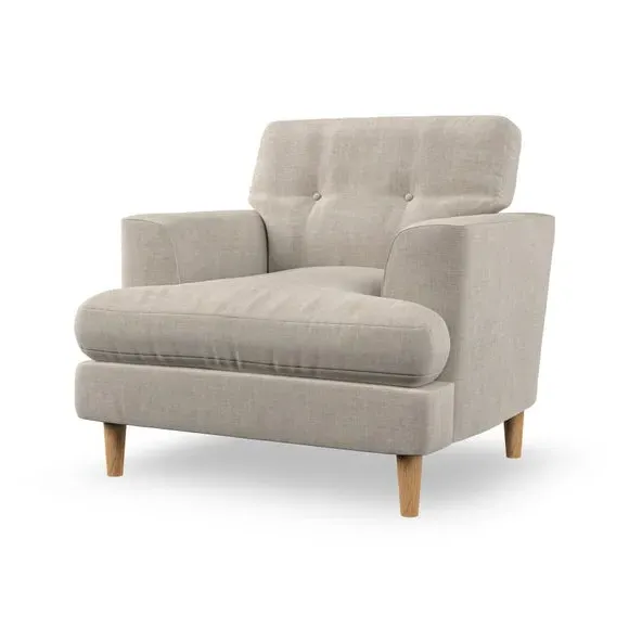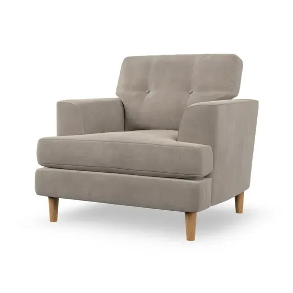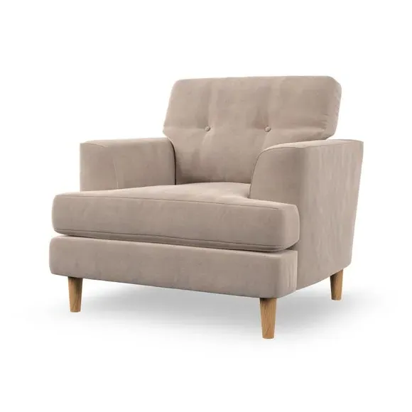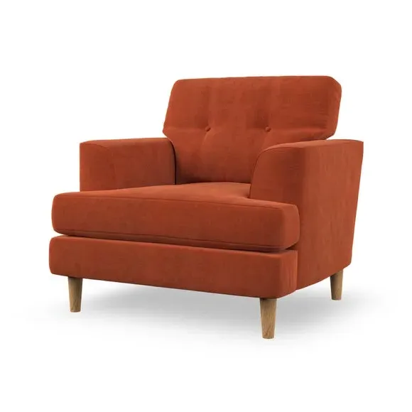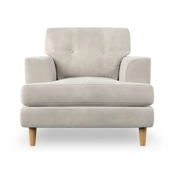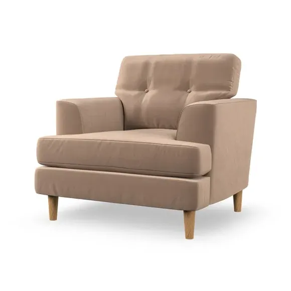 * Scandi inspired design* High legs* Button pull detailing* Choose the cushion filling, leg colour and fabric The Cooper Armchair is a compact yet striking piece that embodies Scandinavian-inspired sophistication. Featuring clean lines, an elegant high-leg frame, and a generous T-shaped seat cushion, it’s a stylish addition to any room. The fibre-filled back cushion, adorned with button-pull detailing, provides excellent support and comfort. Customise this armchair to suit your décor with a choice of fabrics, leg finishes, and cushion fillings.