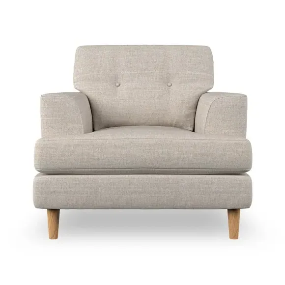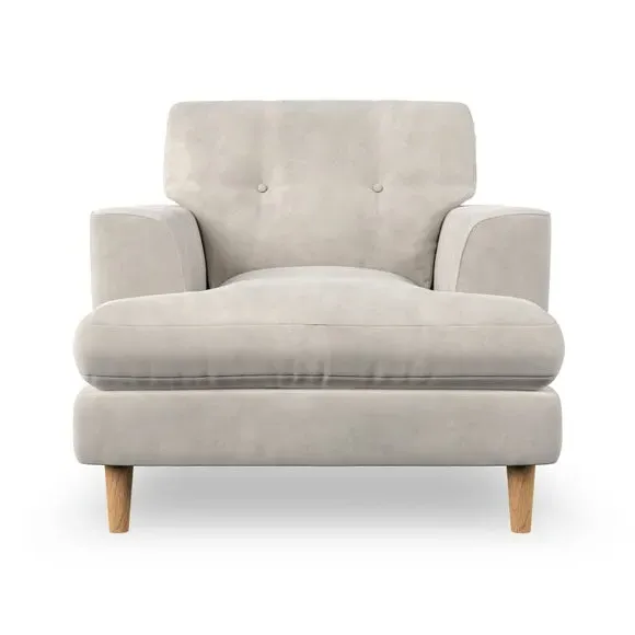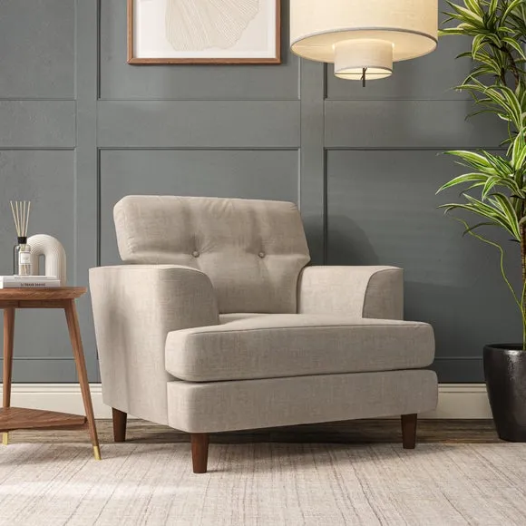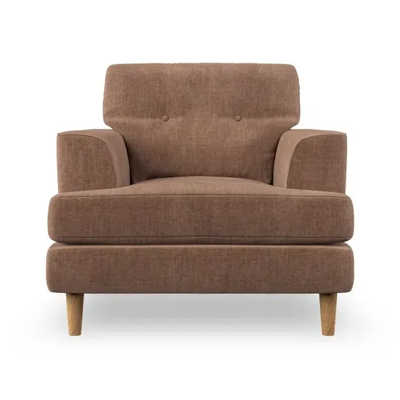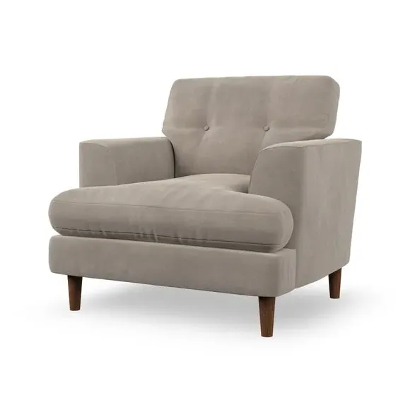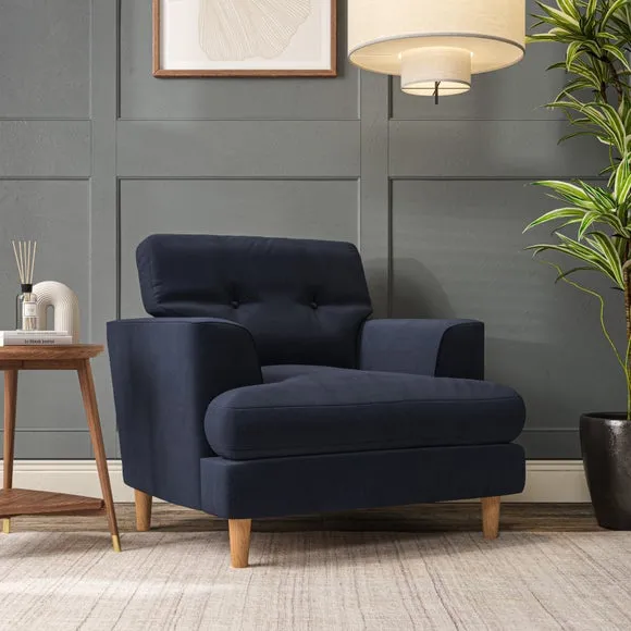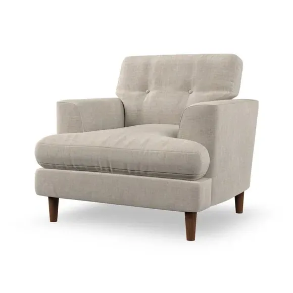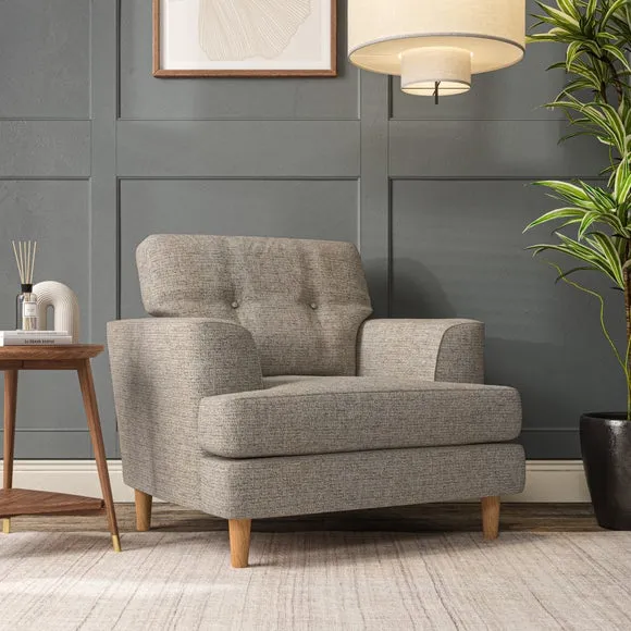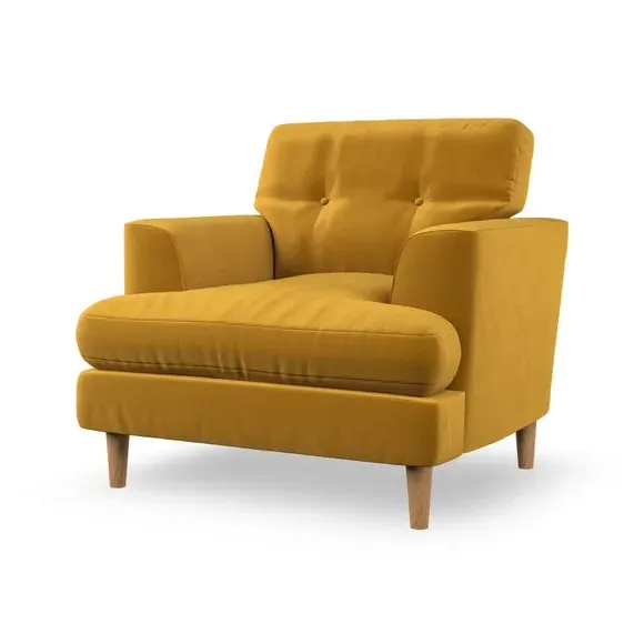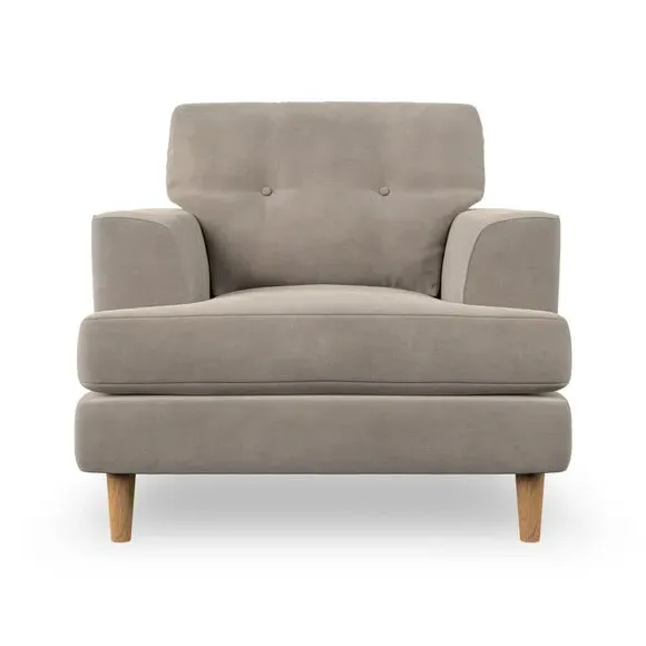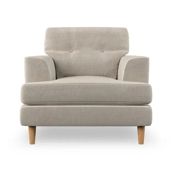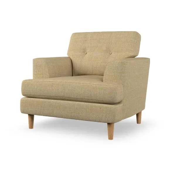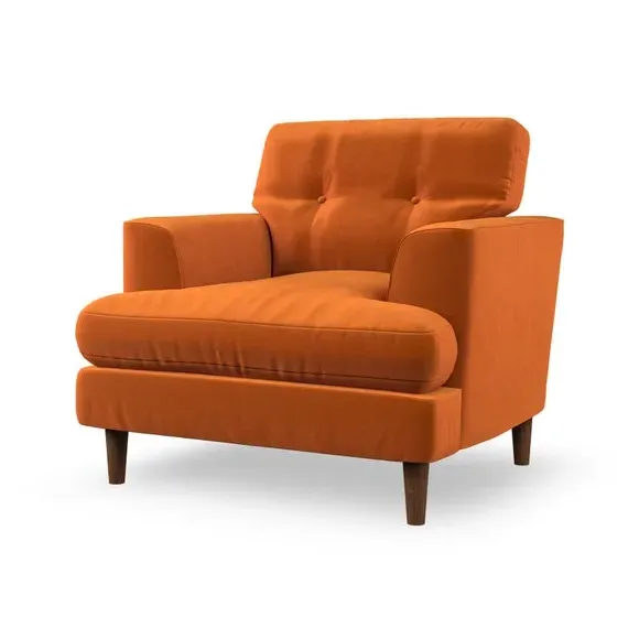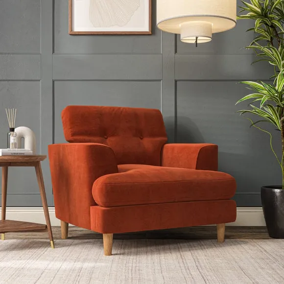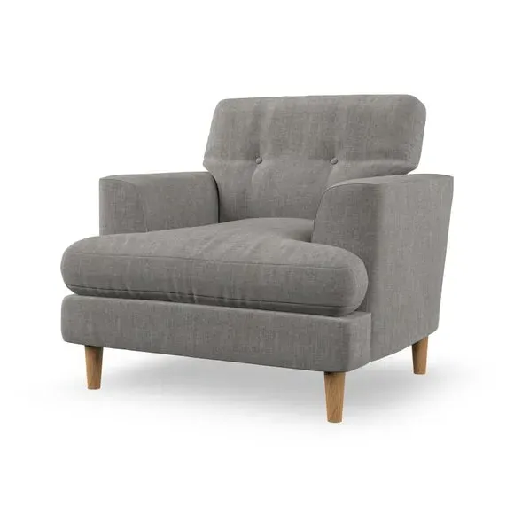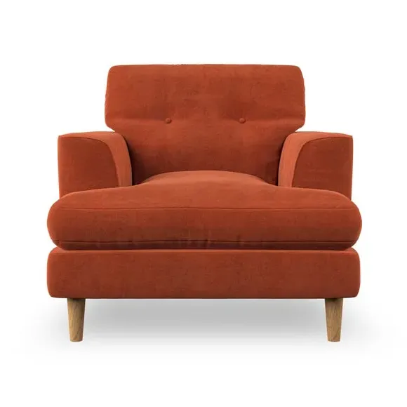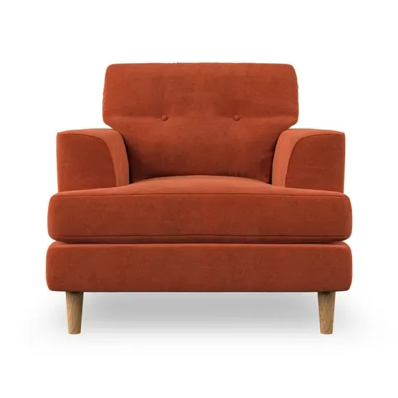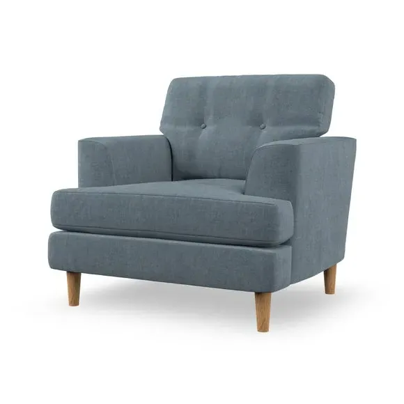 * Scandi inspired design* High legs* Button pull detailing* Choose the cushion filling, leg colour and fabric The Cooper Armchair is a compact yet striking piece that embodies Scandinavian-inspired sophistication. Featuring clean lines, an elegant high-leg frame, and a generous T-shaped seat cushion, it’s a stylish addition to any room. The fibre-filled back cushion, adorned with button-pull detailing, provides excellent support and comfort. Customise this armchair to suit your décor with a choice of fabrics, leg finishes, and cushion fillings.