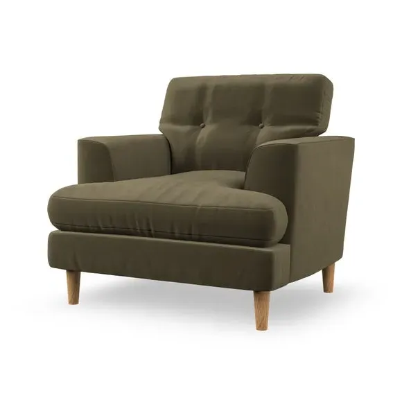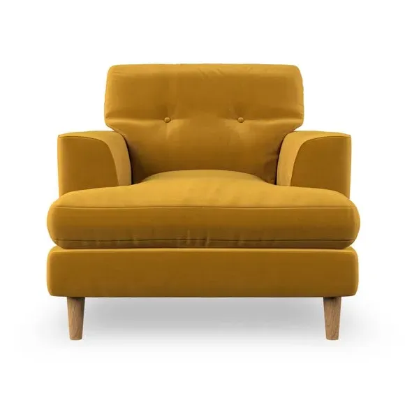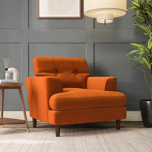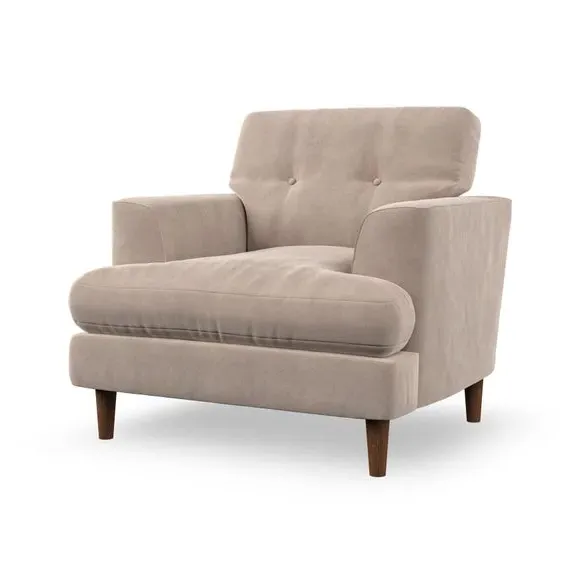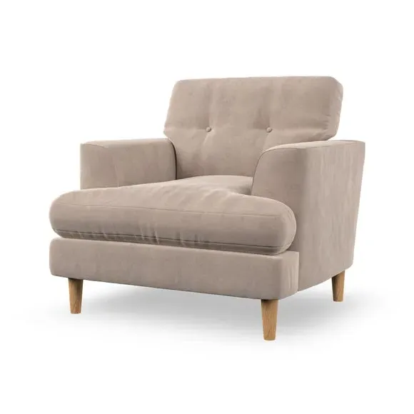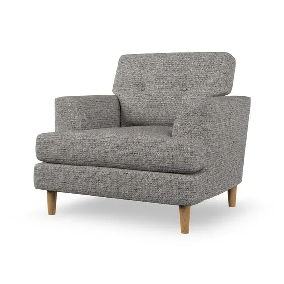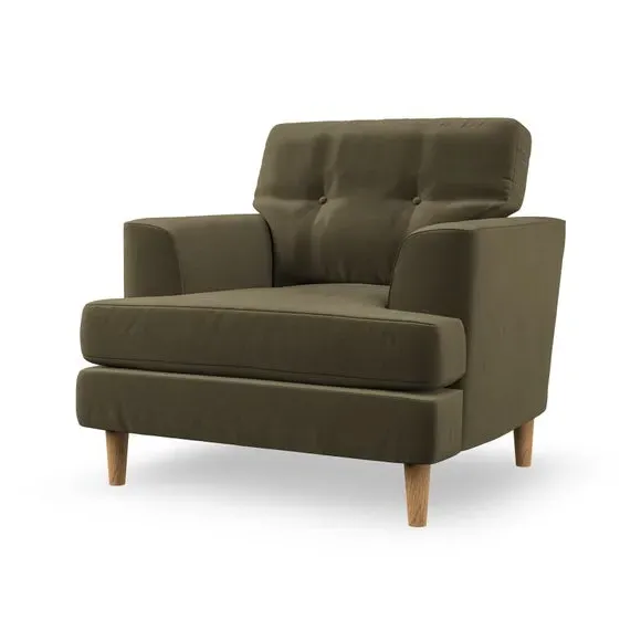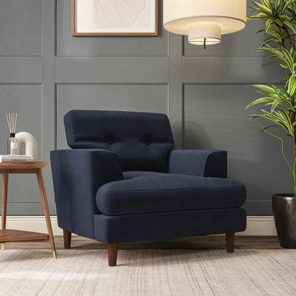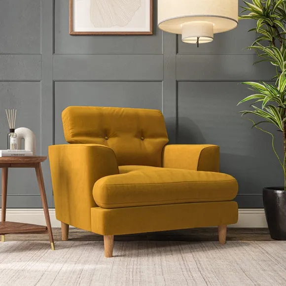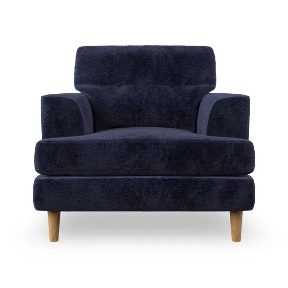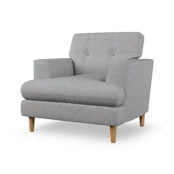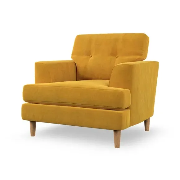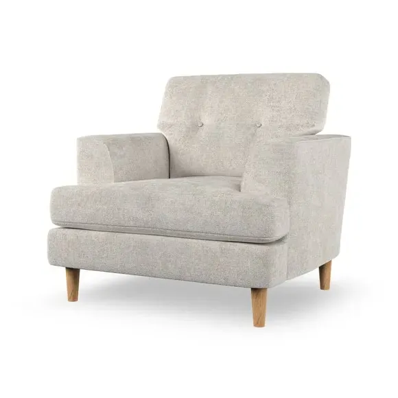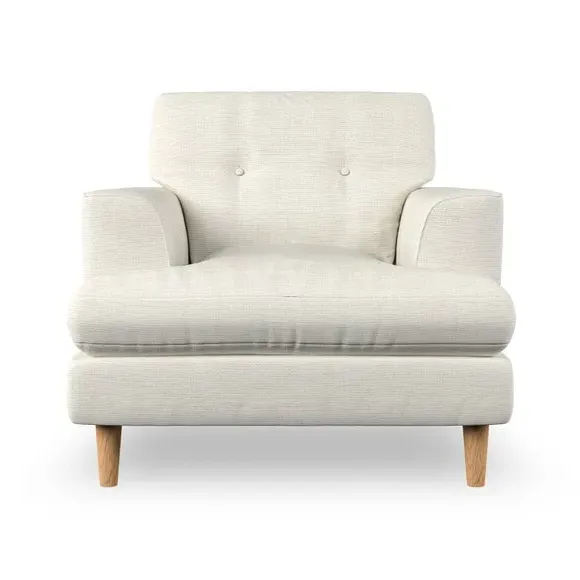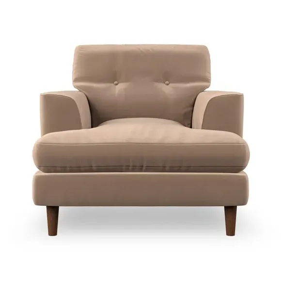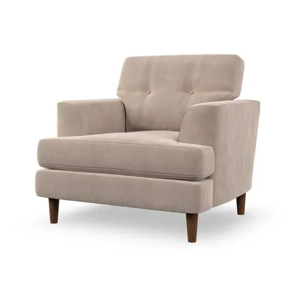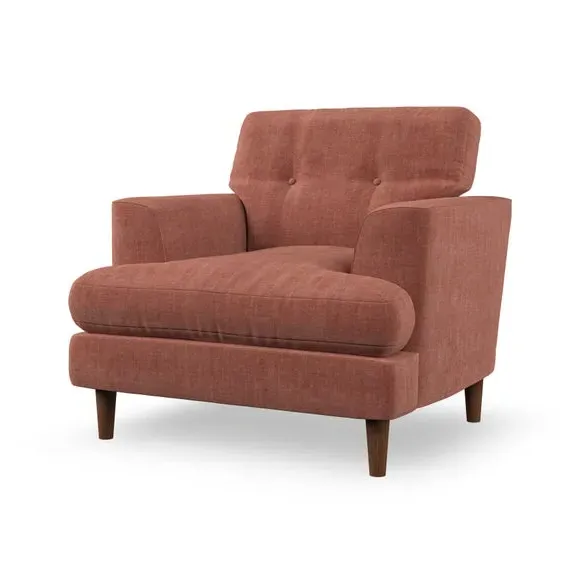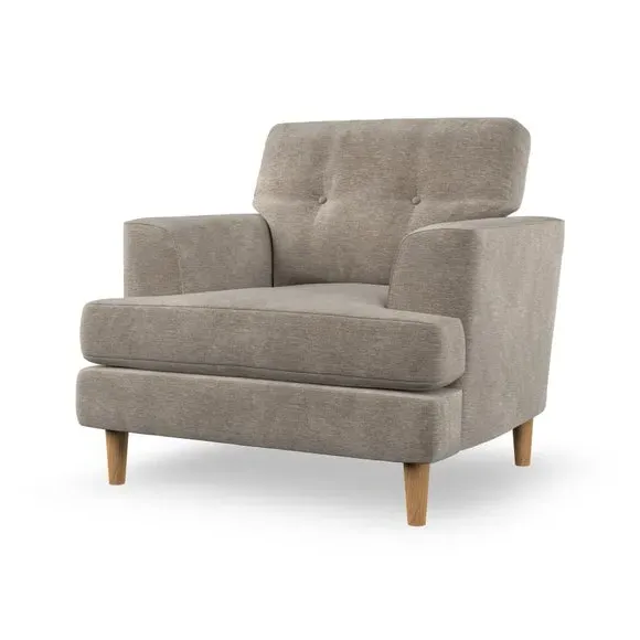 * Scandi inspired design* High legs* Button pull detailing* Choose the cushion filling, leg colour and fabric The Cooper Armchair is a compact yet striking piece that embodies Scandinavian-inspired sophistication. Featuring clean lines, an elegant high-leg frame, and a generous T-shaped seat cushion, it’s a stylish addition to any room. The fibre-filled back cushion, adorned with button-pull detailing, provides excellent support and comfort. Customise this armchair to suit your décor with a choice of fabrics, leg finishes, and cushion fillings.