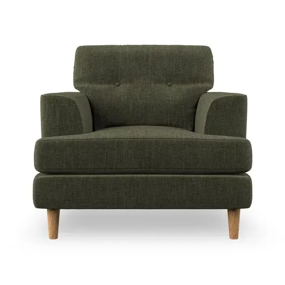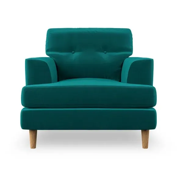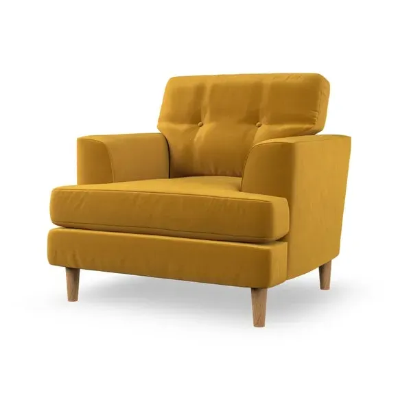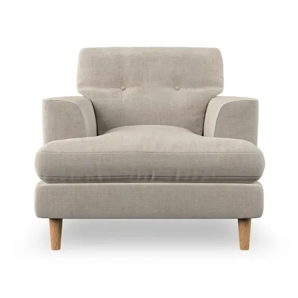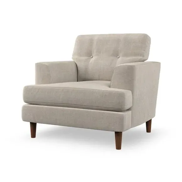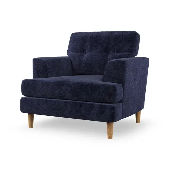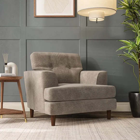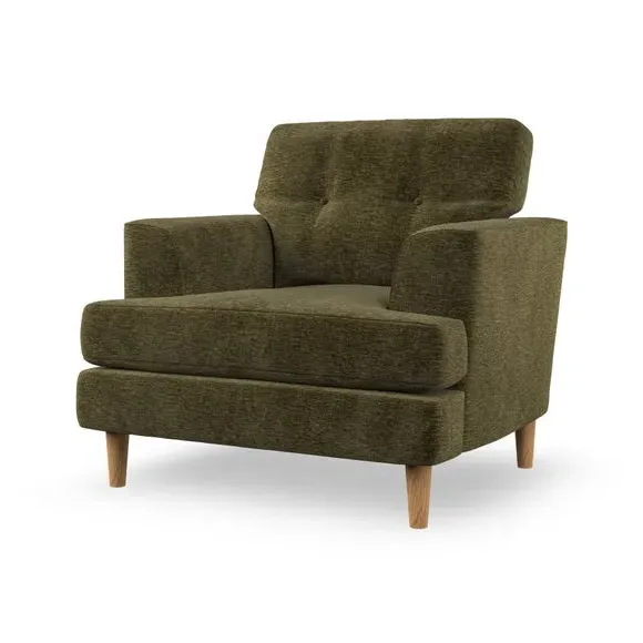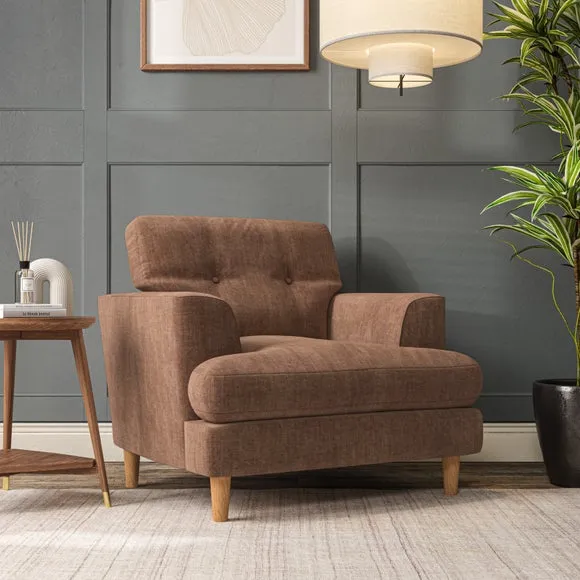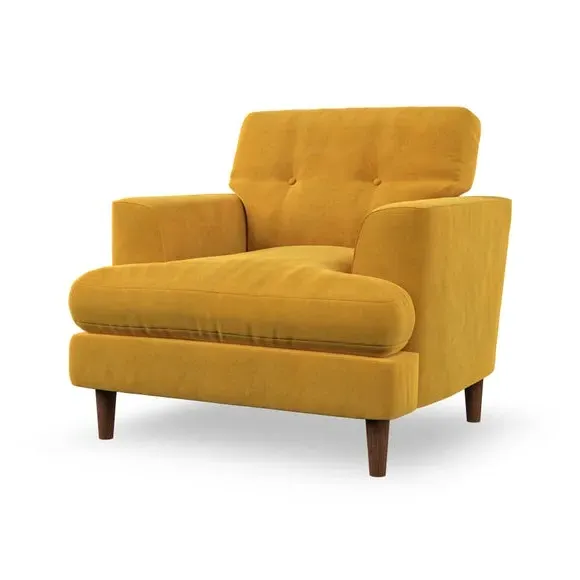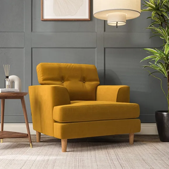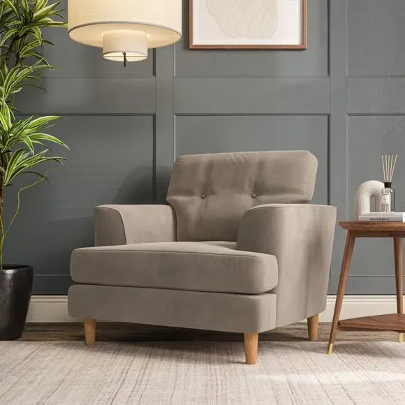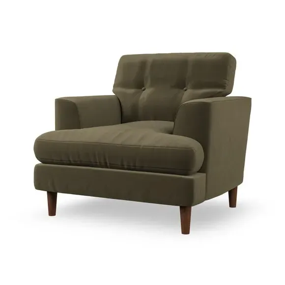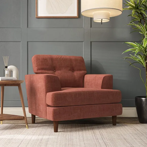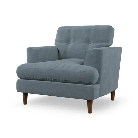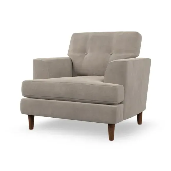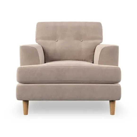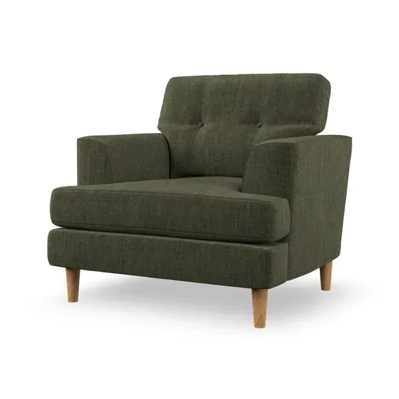 * Scandi inspired design* High legs* Button pull detailing* Choose the cushion filling, leg colour and fabric The Cooper Armchair is a compact yet striking piece that embodies Scandinavian-inspired sophistication. Featuring clean lines, an elegant high-leg frame, and a generous T-shaped seat cushion, it’s a stylish addition to any room. The fibre-filled back cushion, adorned with button-pull detailing, provides excellent support and comfort. Customise this armchair to suit your décor with a choice of fabrics, leg finishes, and cushion fillings.