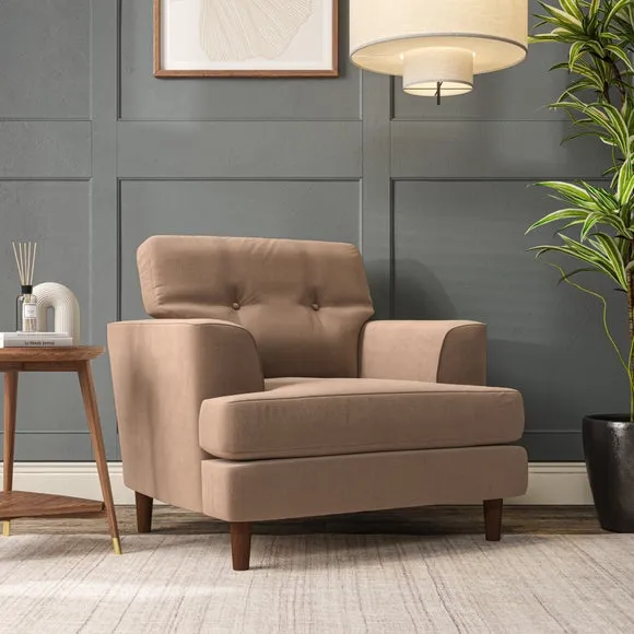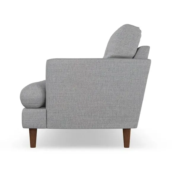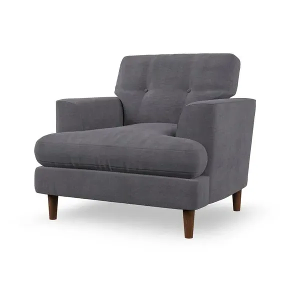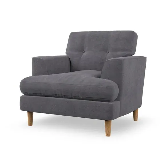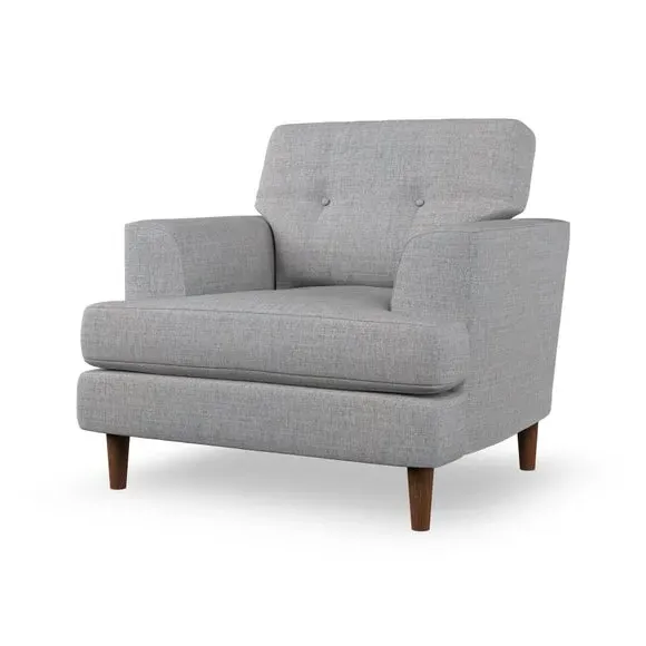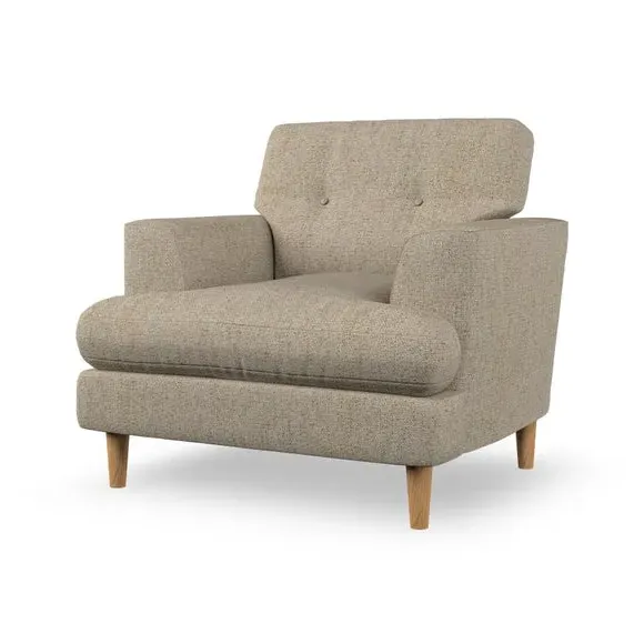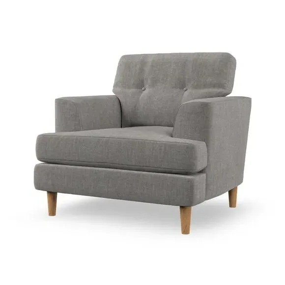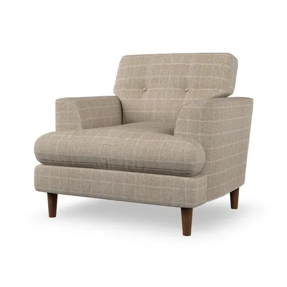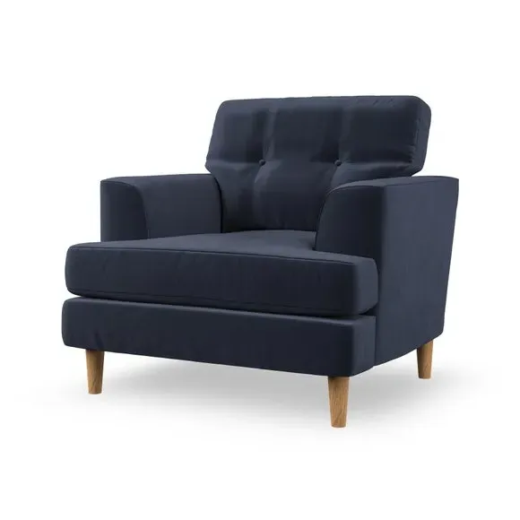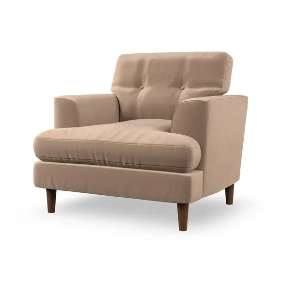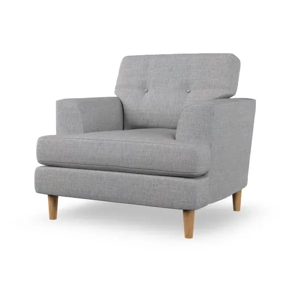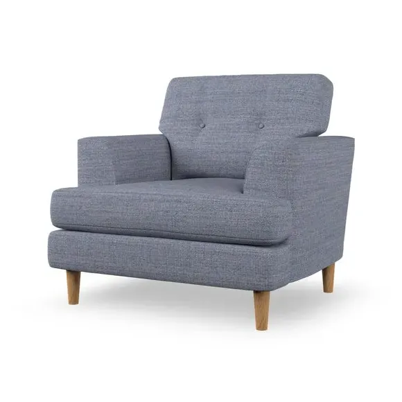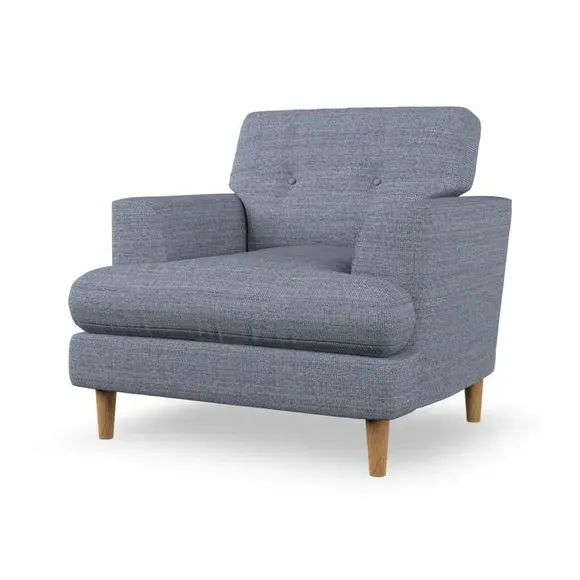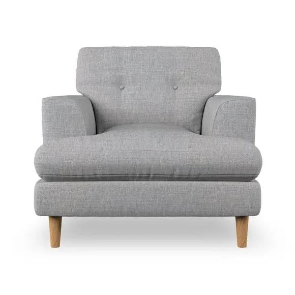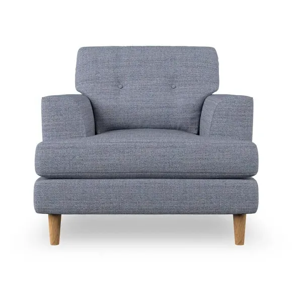 The armchair combines Scandinavian-inspired design with contemporary comfort through its clean lines and high-leg frame. Its generous T-shaped seat cushion provides ample seating space, while the fibre-filled back cushion features distinctive button-pull detailing for both style and support. The elevated leg design adds visual lightness to the compact frame, and customizable options allow for personalized fabric and finish selections.