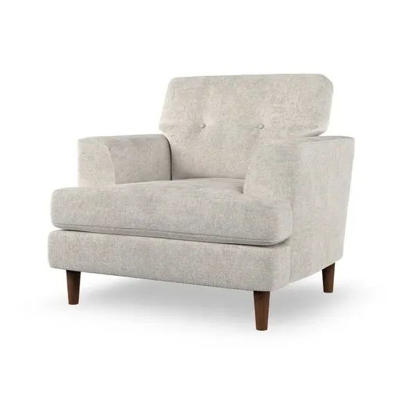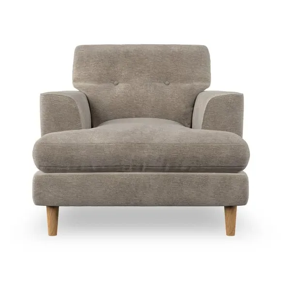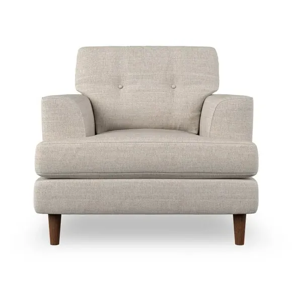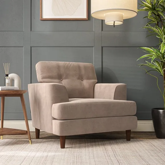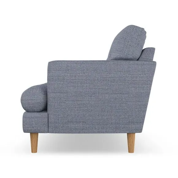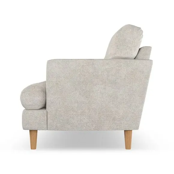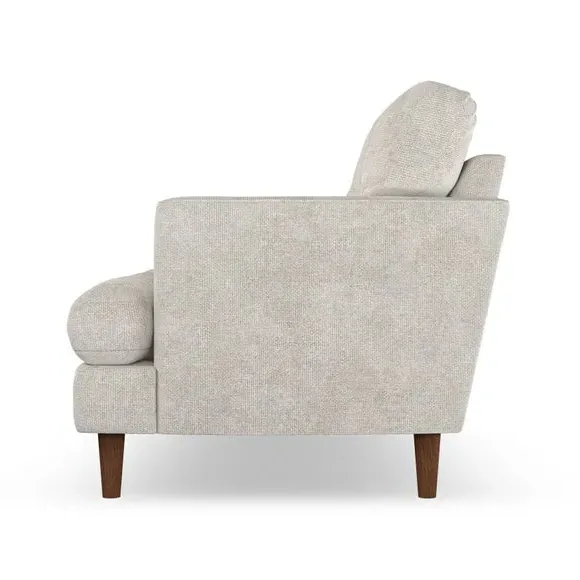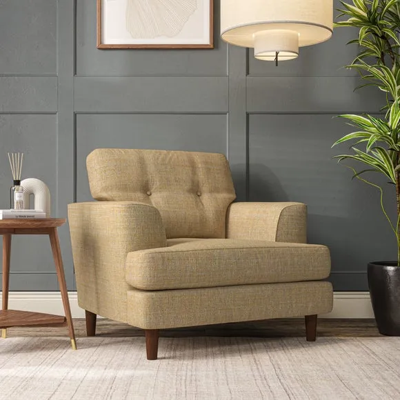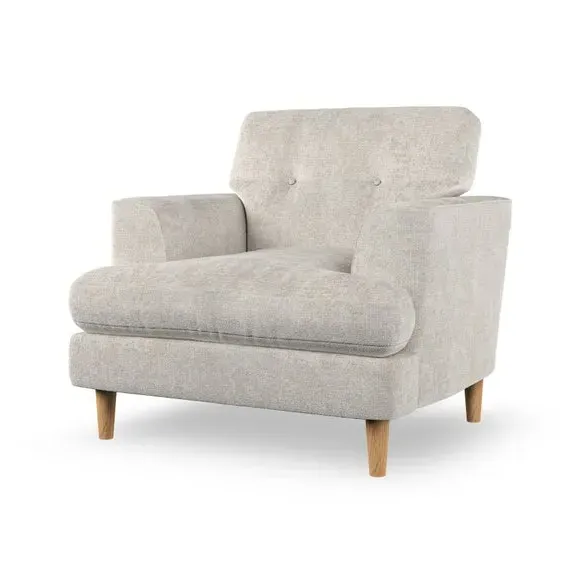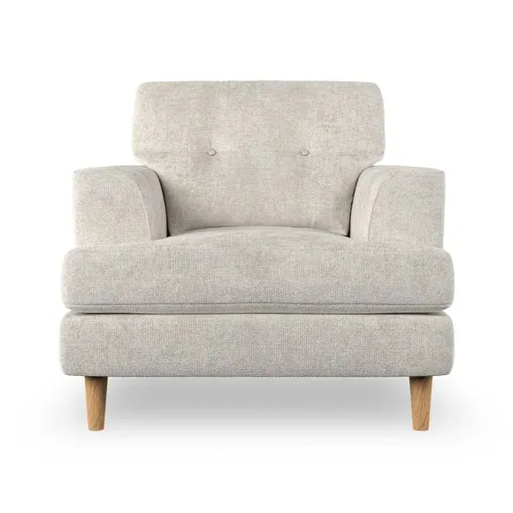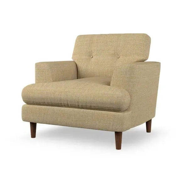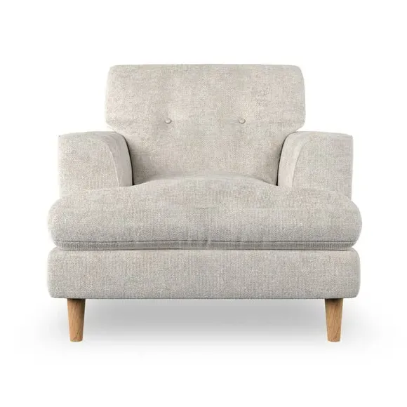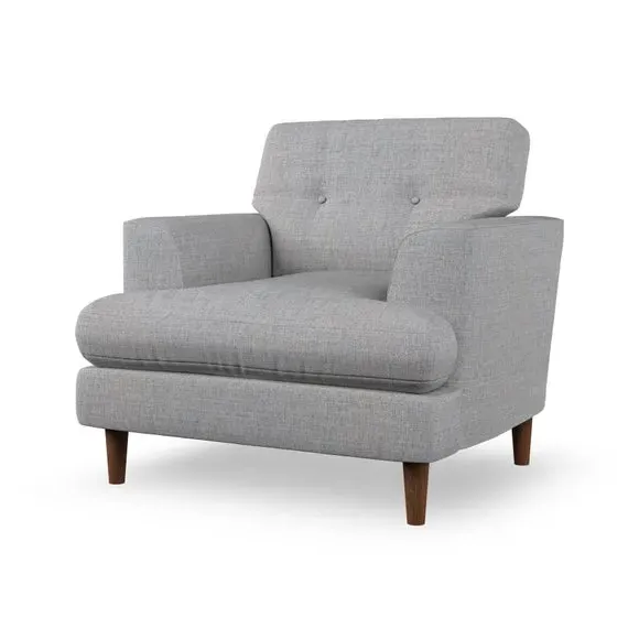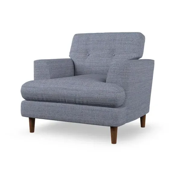 The armchair combines Scandinavian-inspired design with contemporary comfort through its clean lines and high-leg frame. Its generous T-shaped seat cushion provides ample seating space, while the fibre-filled back cushion features distinctive button-pull detailing for both style and support. The elevated leg design adds visual lightness to the compact frame, and customizable options allow for personalized fabric and finish selections.