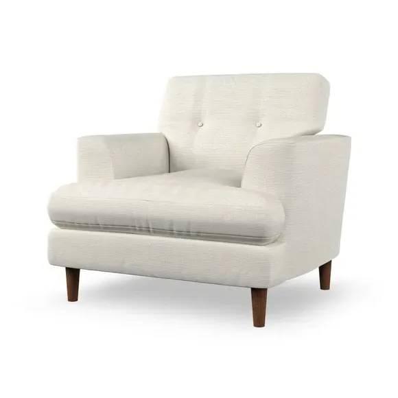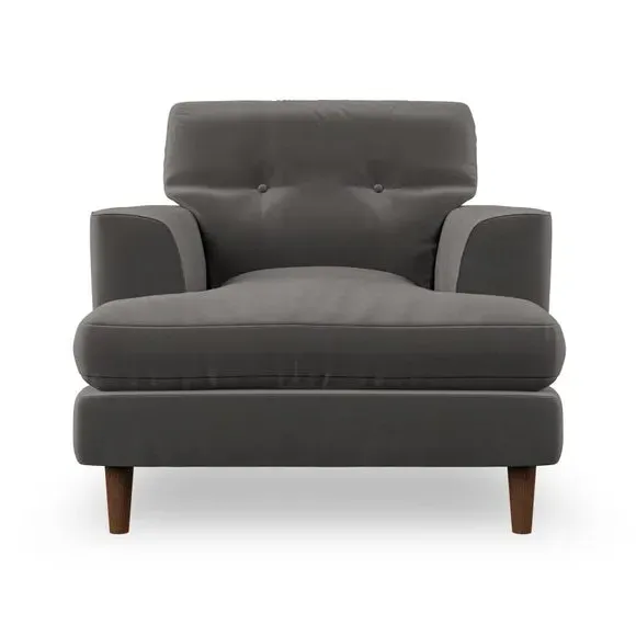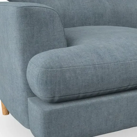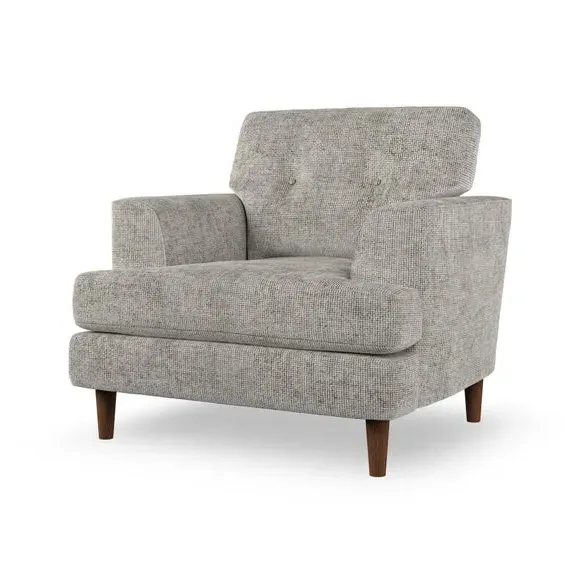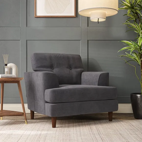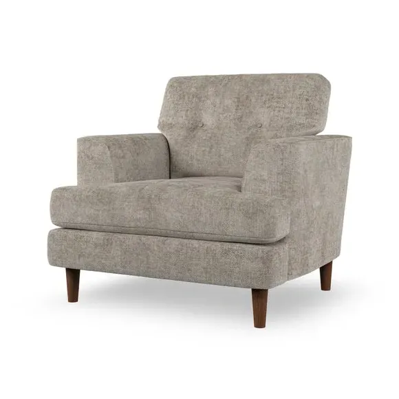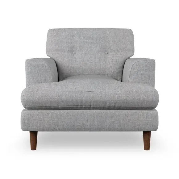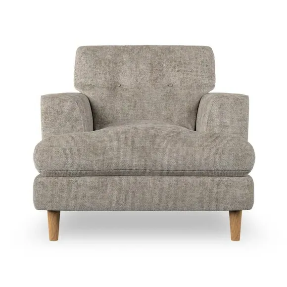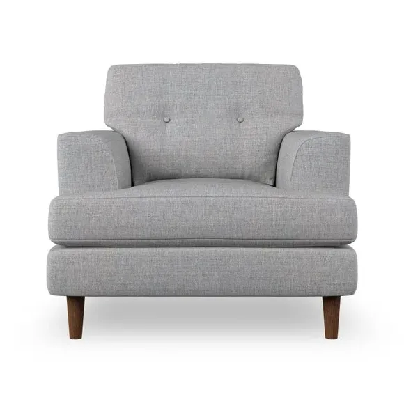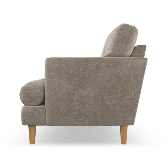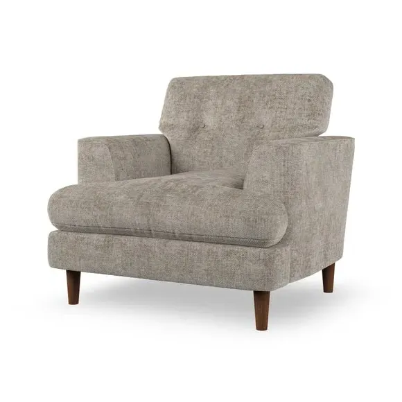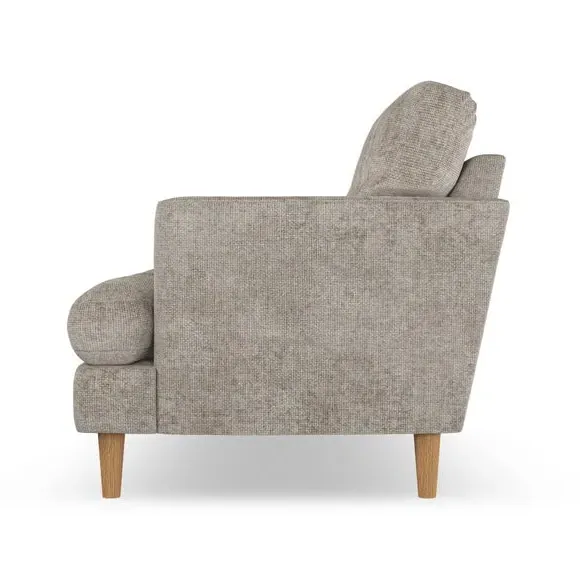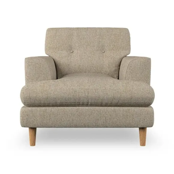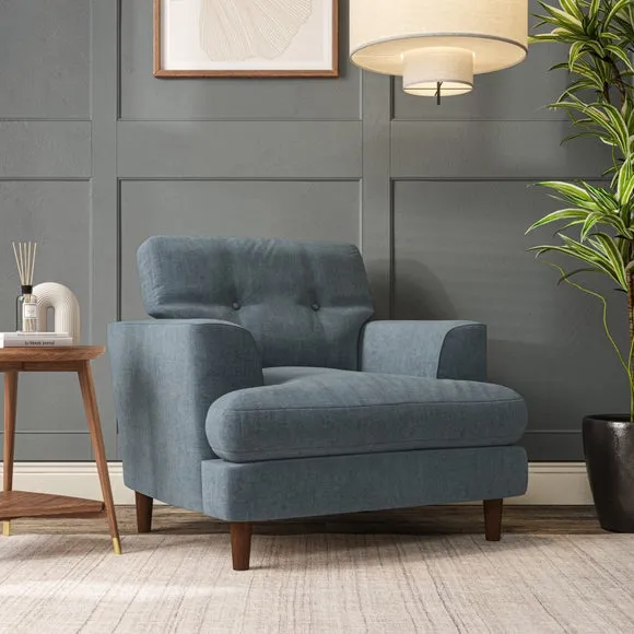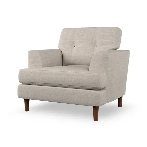 The armchair combines Scandinavian-inspired design with contemporary comfort through its clean lines and high-leg frame. Its generous T-shaped seat cushion provides ample seating space, while the fibre-filled back cushion features distinctive button-pull detailing for both style and support. The elevated leg design adds visual lightness to the compact frame, and customizable options allow for personalized fabric and finish selections.