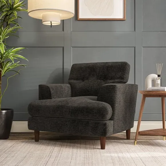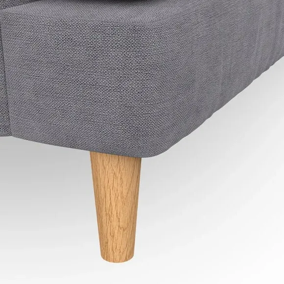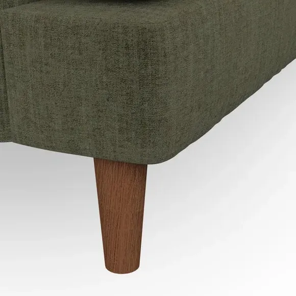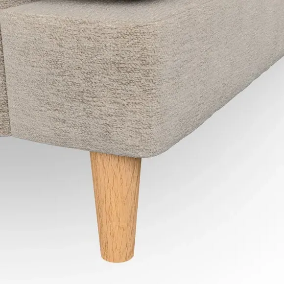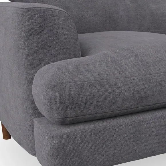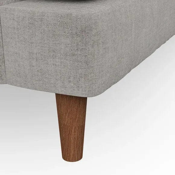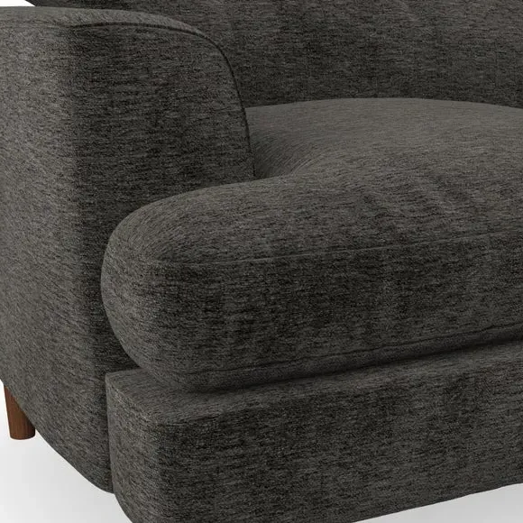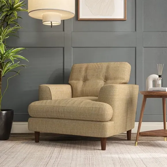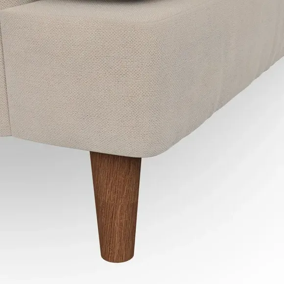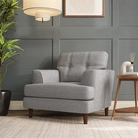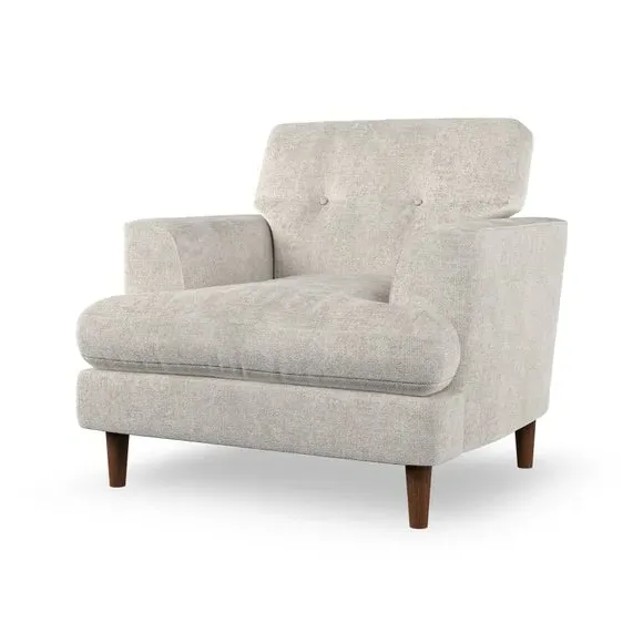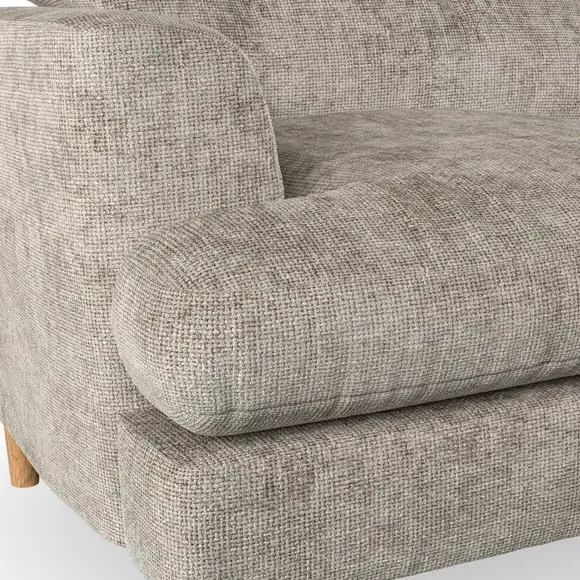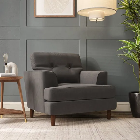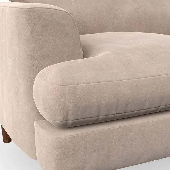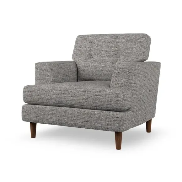 The armchair combines Scandinavian-inspired design with contemporary comfort through its clean lines and high-leg frame. Its generous T-shaped seat cushion provides ample seating space, while the fibre-filled back cushion features distinctive button-pull detailing for both style and support. The elevated leg design adds visual lightness to the compact frame, and customizable options allow for personalized fabric and finish selections.