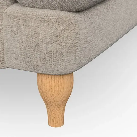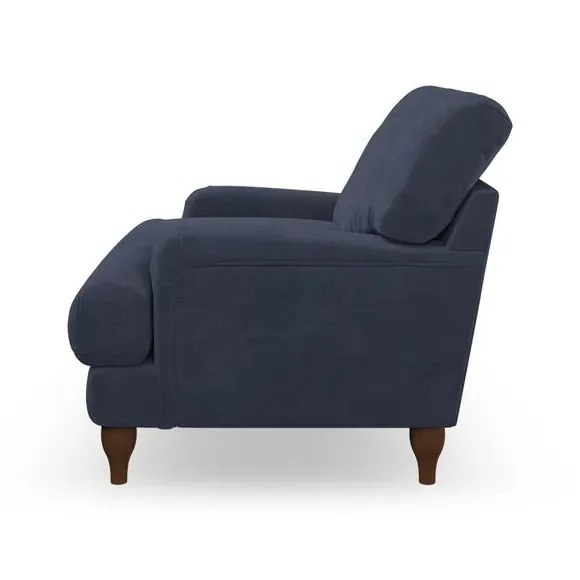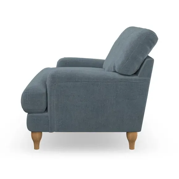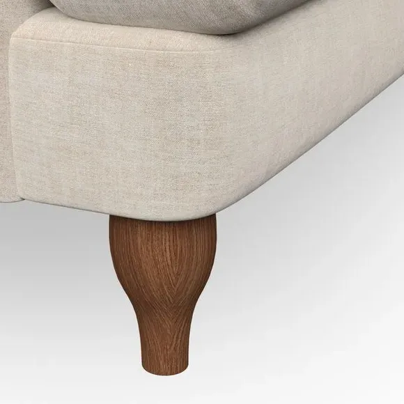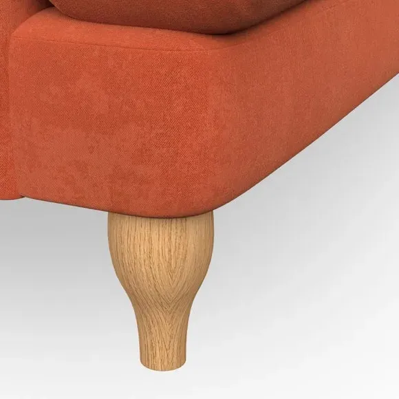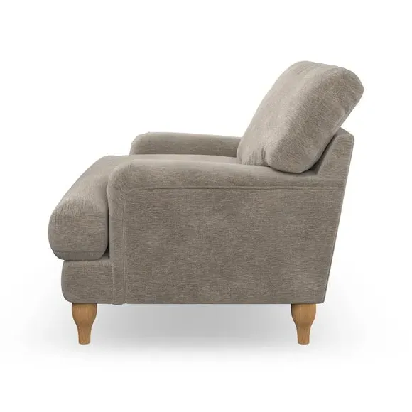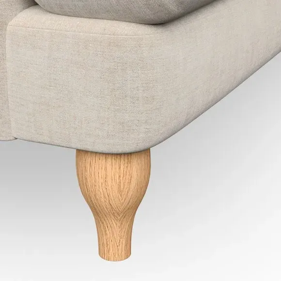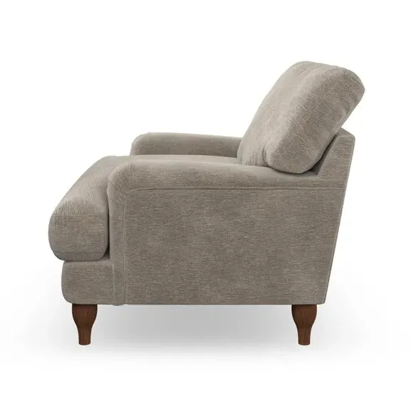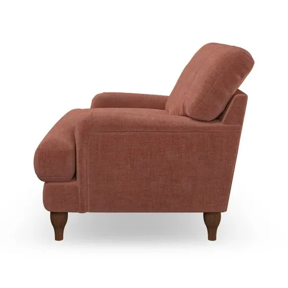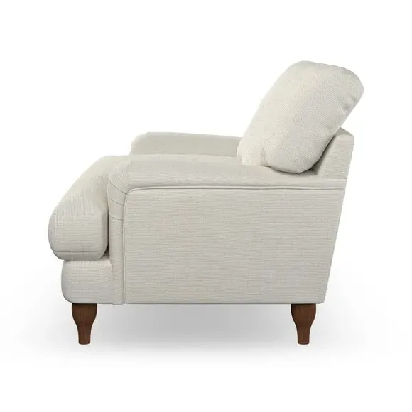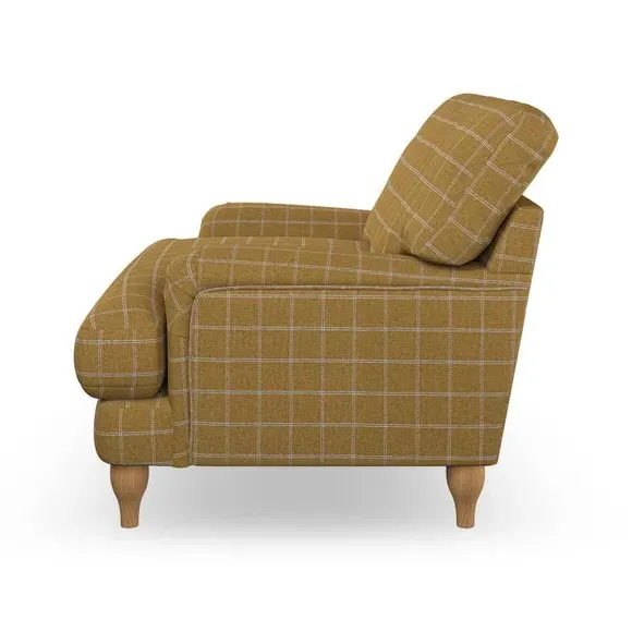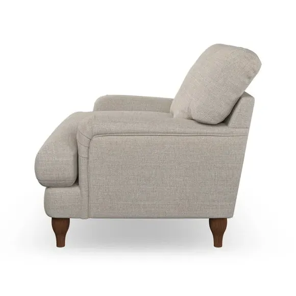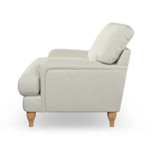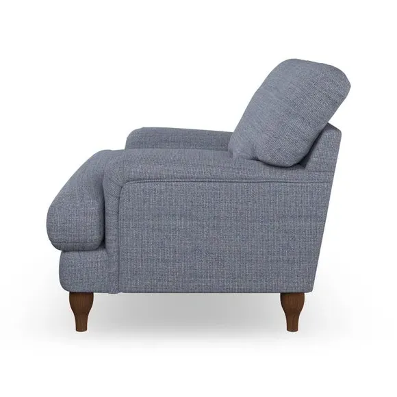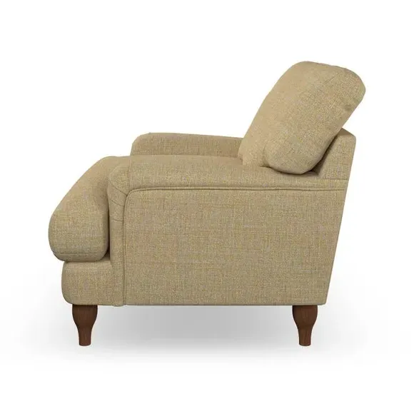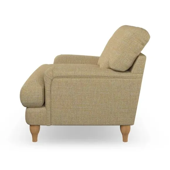 * Classic style* Bandaged Arms* Pleated details* Serpentine seat springs* Choose your support, fabric and leg colour This chair offers a fresh take on the classic bandaged arm design, featuring pleat details and a lugged seat for a unique look. Built for longevity and comfort, it includes serpentine seat springs and deep fibre-filled back cushions for excellent support. Customise your comfort by choosing between a low-maintenance foam seat or the inviting ‘Qualofill Blue’ fibre seat, made from 100% recycled polyester. The ‘T’ cushion seat and arm design ensure a compact and contemporary feel, complemented by self-sewn seat and back cushions. Available with ‘hour glass’ shaped turned hardwood legs in two finishes, this chair is both easy to fit and perfect for creating a snug, stylish corner in your living space. Plus, you can select your preferred fabric and colour to perfectly match your decor.