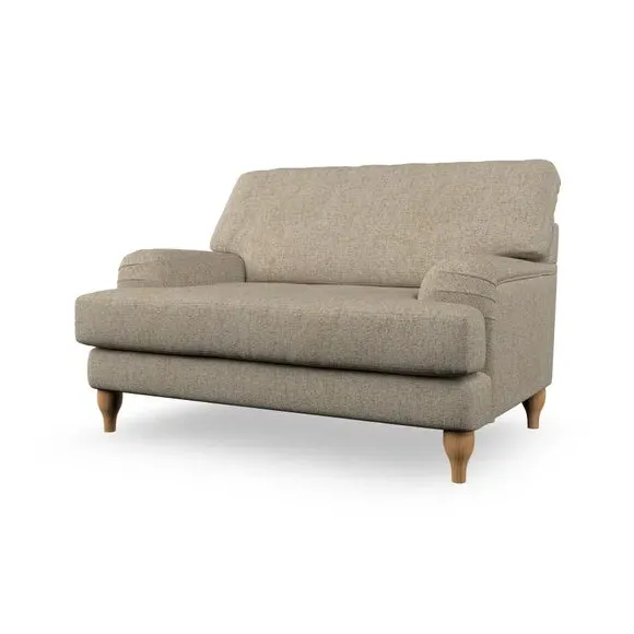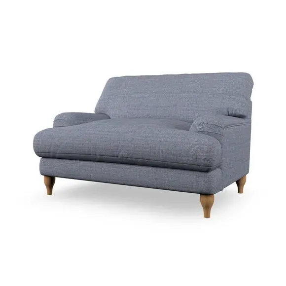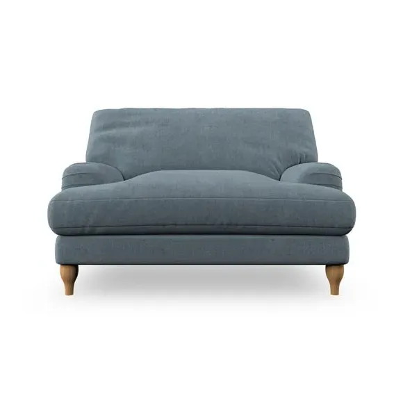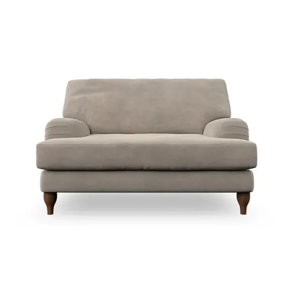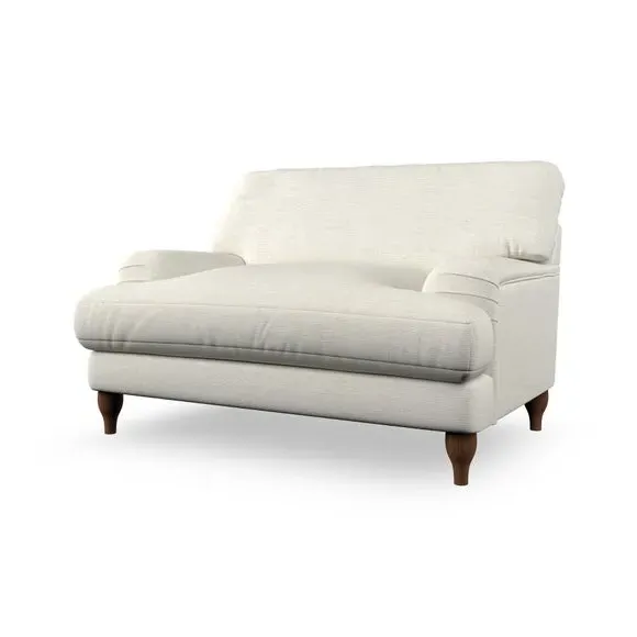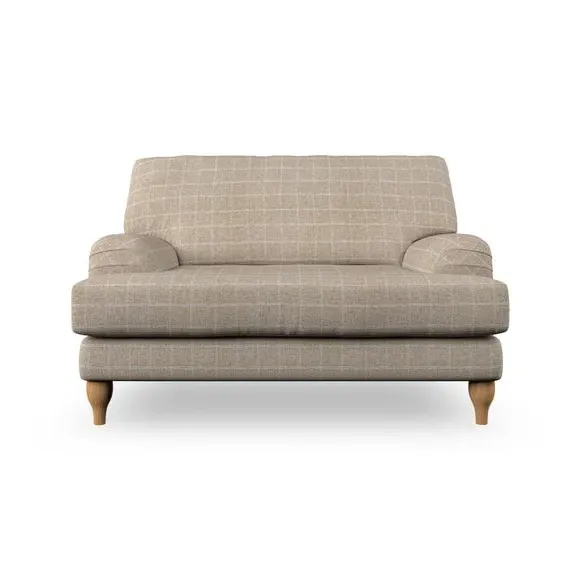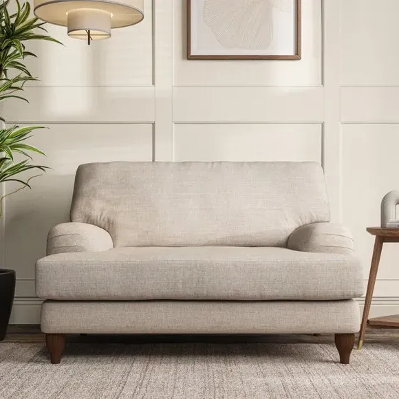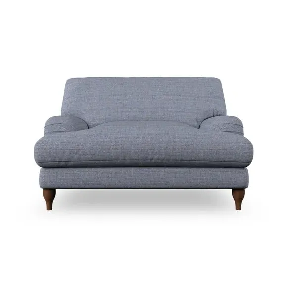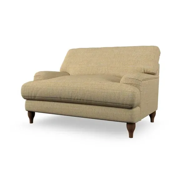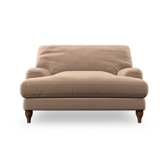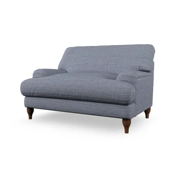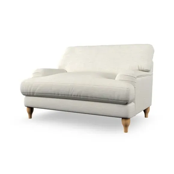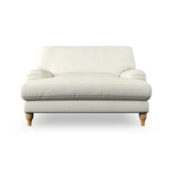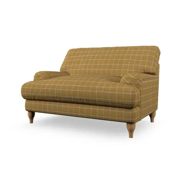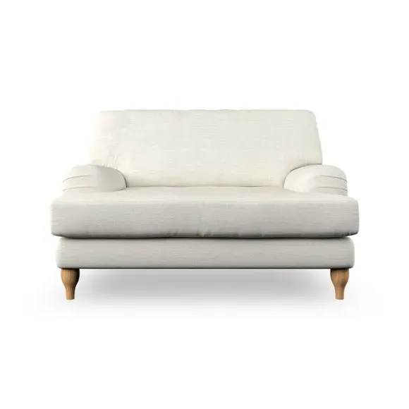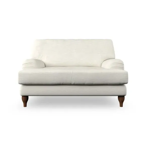 The snuggle chair combines classic bandaged arm design with contemporary pleat details and a lugged seat construction. Its serpentine seat springs provide excellent support, while deep fibre-filled back cushions add comfort. The T-cushion seat design ensures a compact feel, and the hour glass shaped turned hardwood legs offer stability with style.