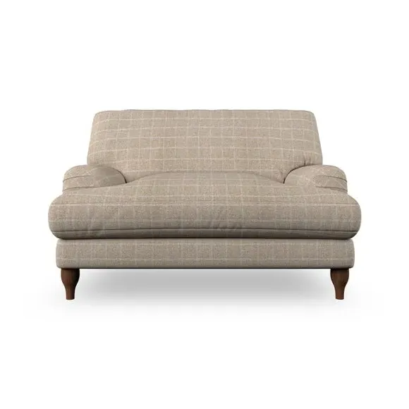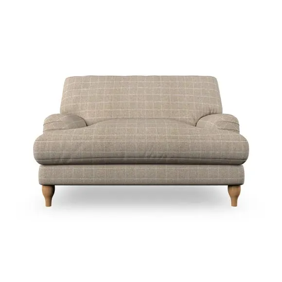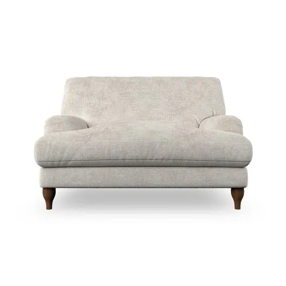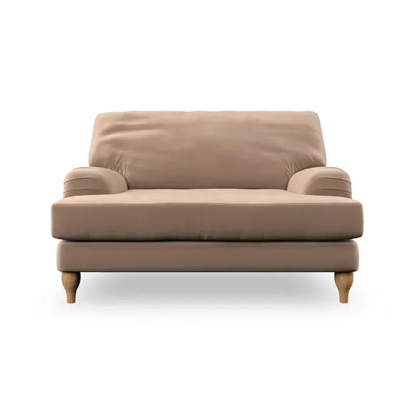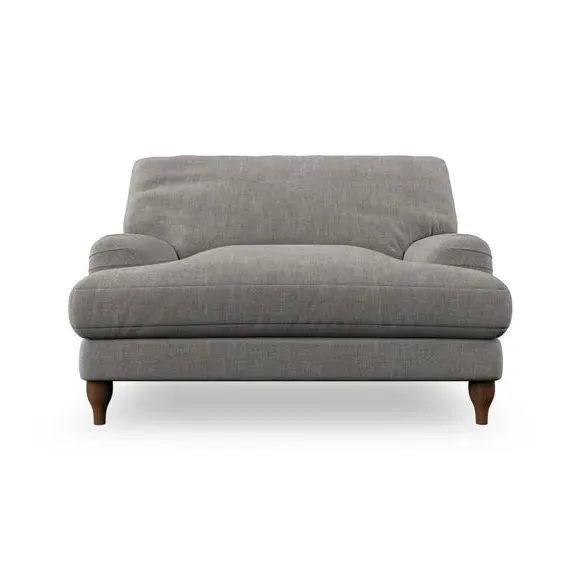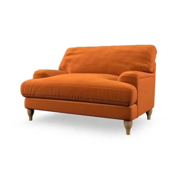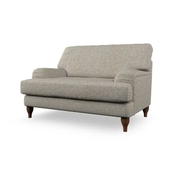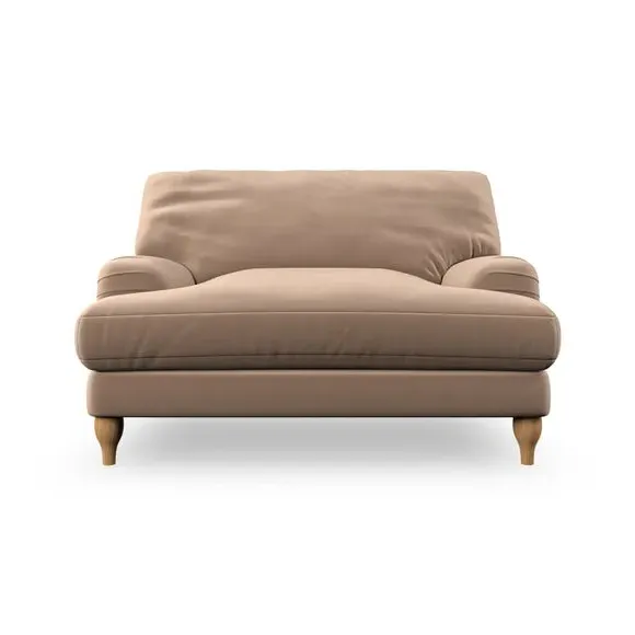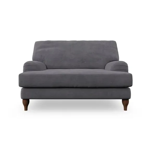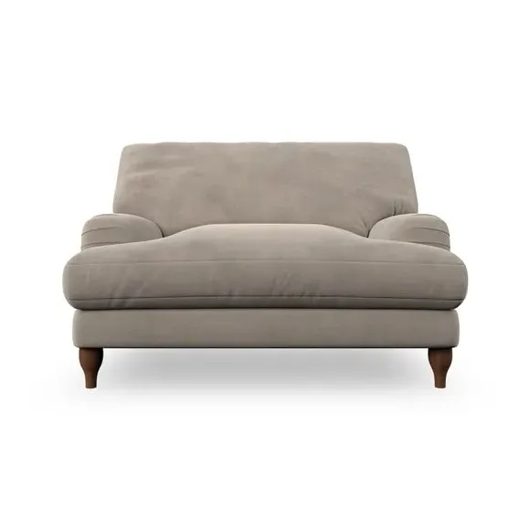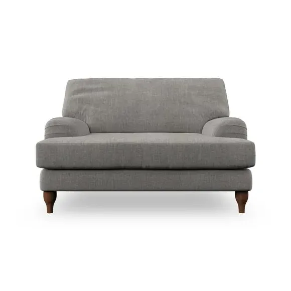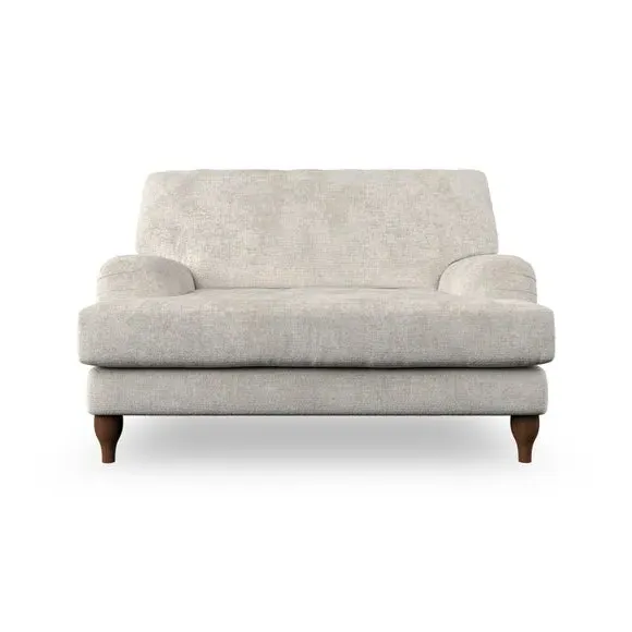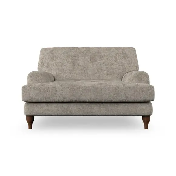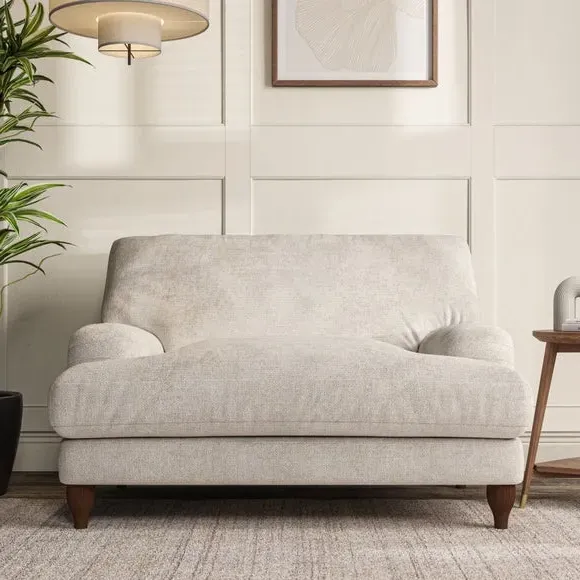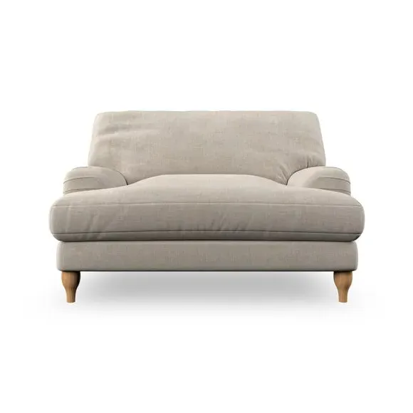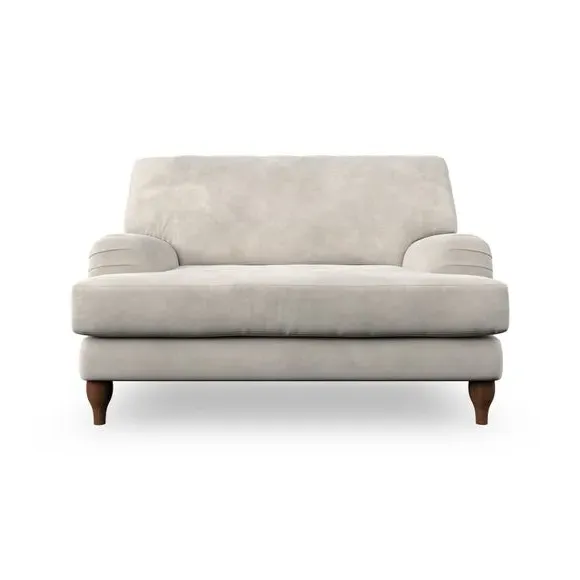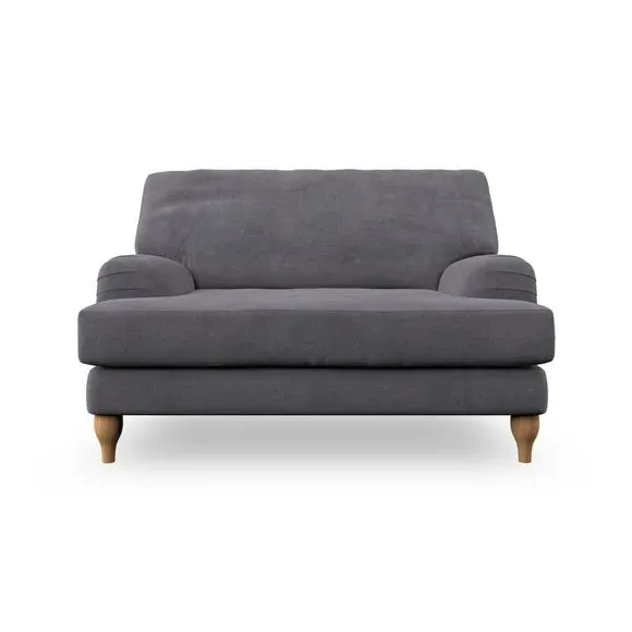 The snuggle chair combines classic bandaged arm design with contemporary pleat details and a lugged seat construction. Its serpentine seat springs provide excellent support, while deep fibre-filled back cushions add comfort. The T-cushion seat design ensures a compact feel, and the hour glass shaped turned hardwood legs offer stability with style.