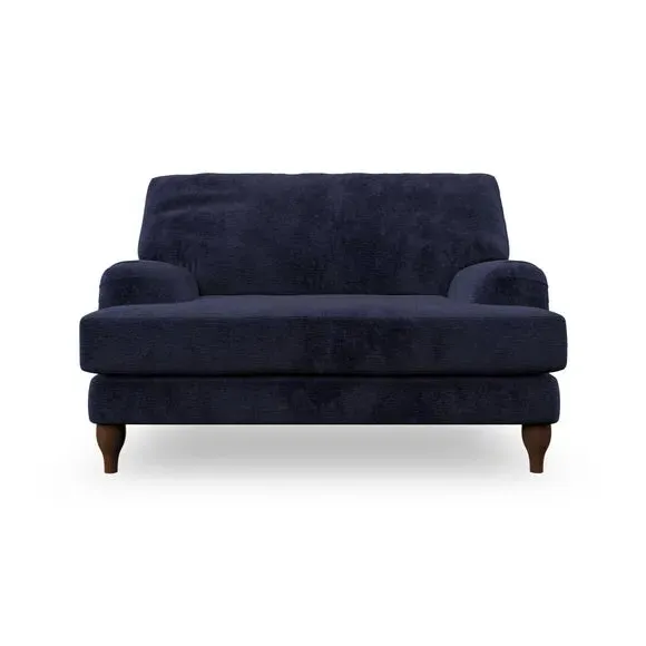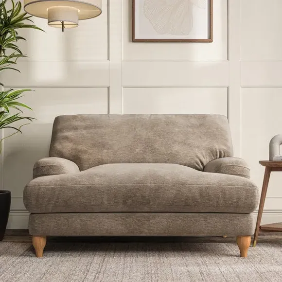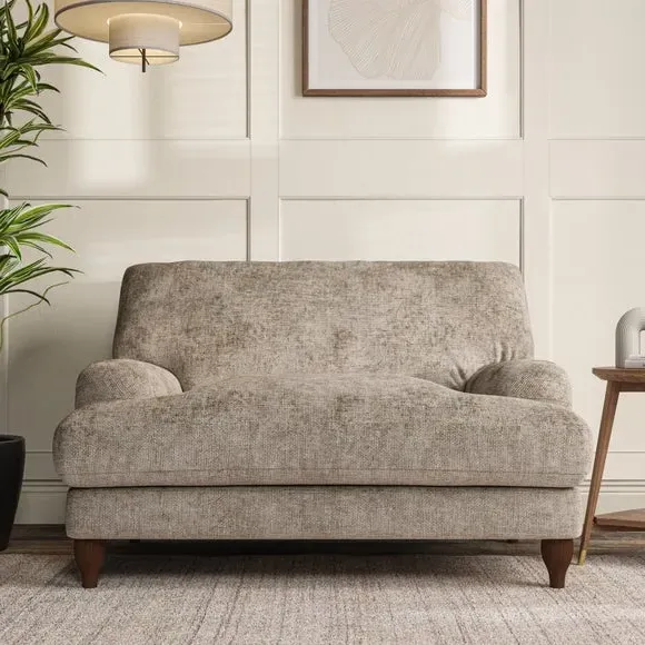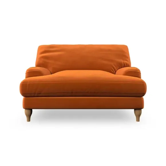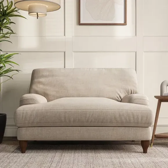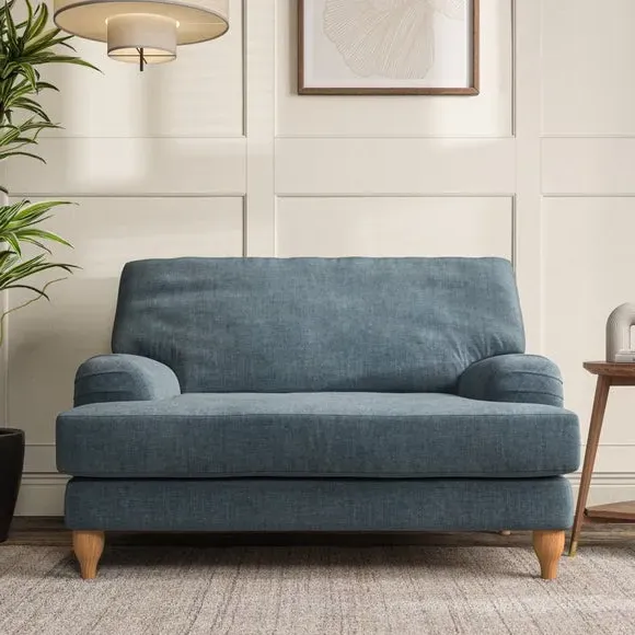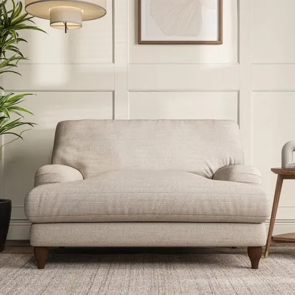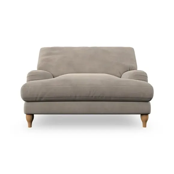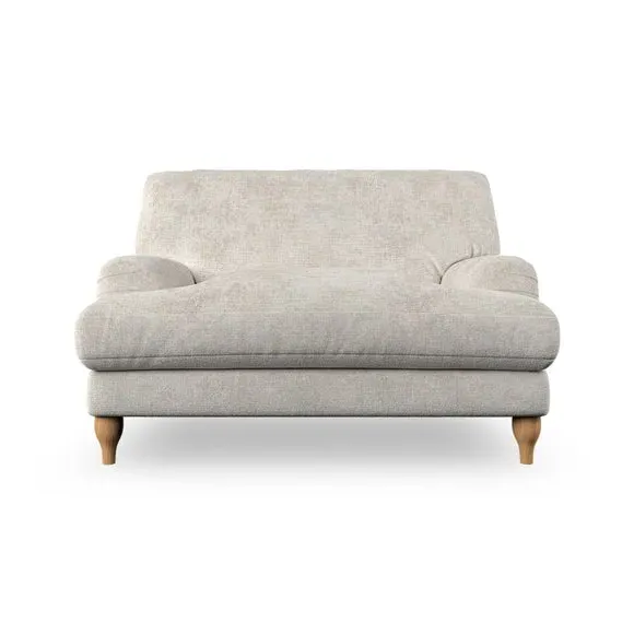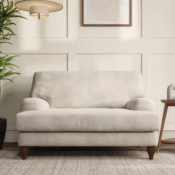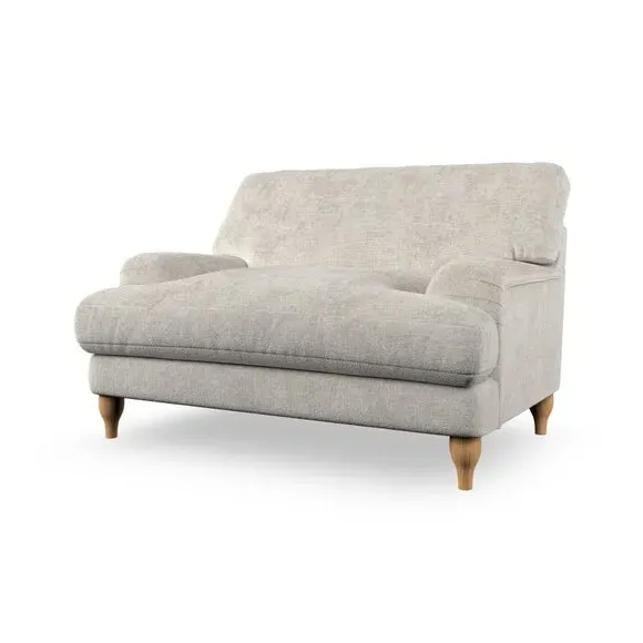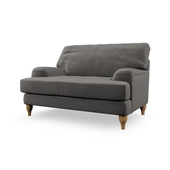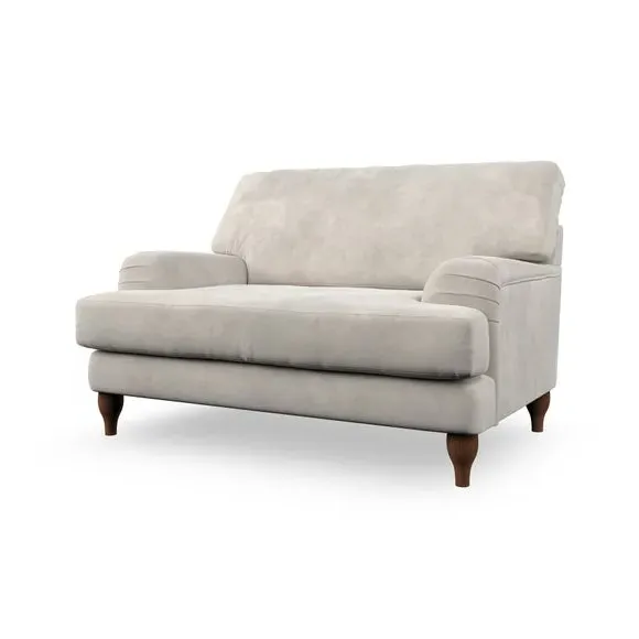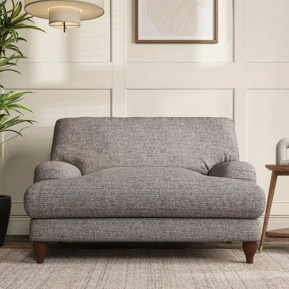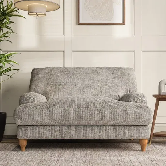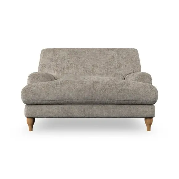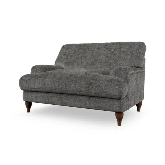 The snuggle chair combines classic bandaged arm design with contemporary pleat details and a lugged seat construction. Its serpentine seat springs provide excellent support, while deep fibre-filled back cushions add comfort. The T-cushion seat design ensures a compact feel, and the hour glass shaped turned hardwood legs offer stability with style.