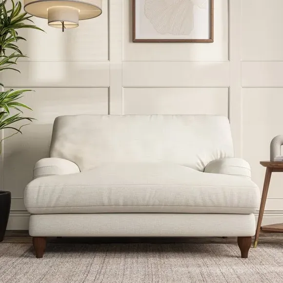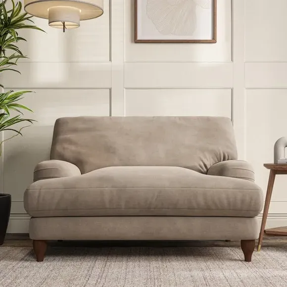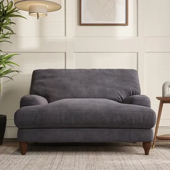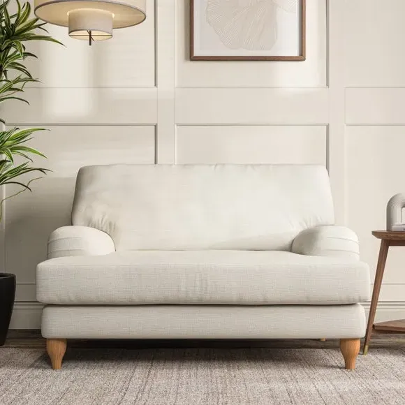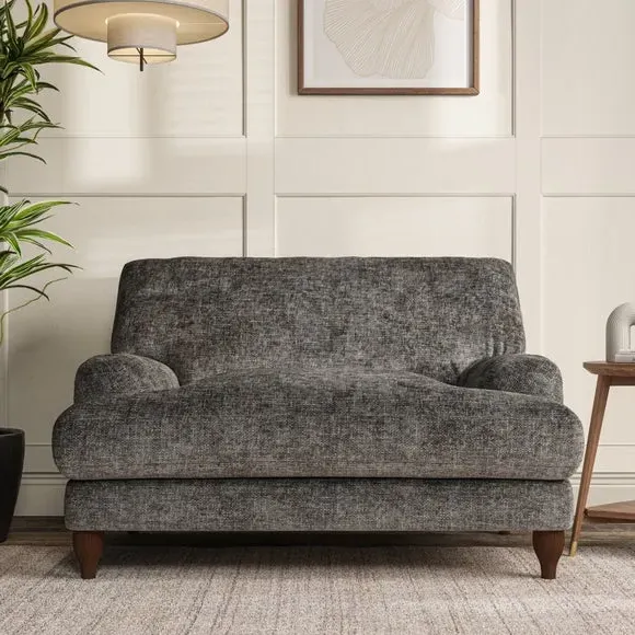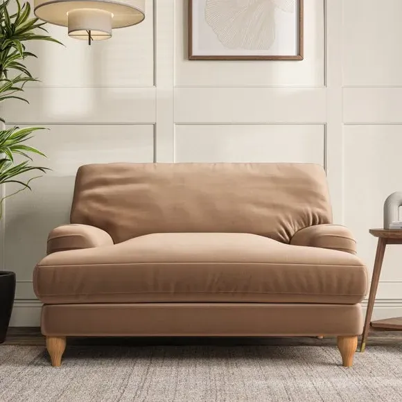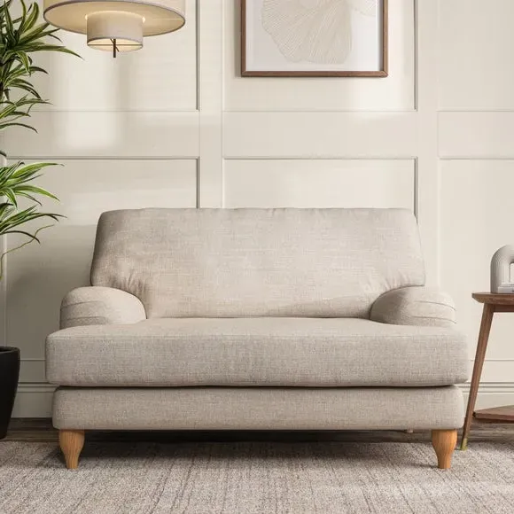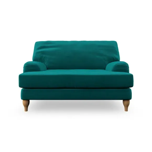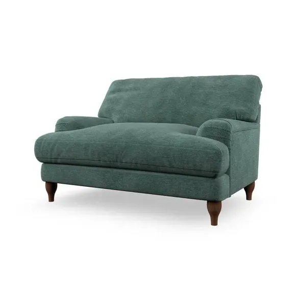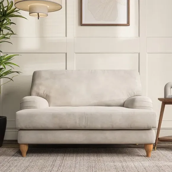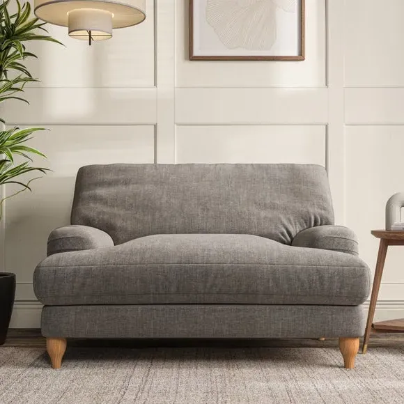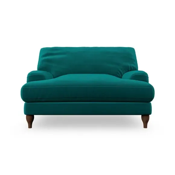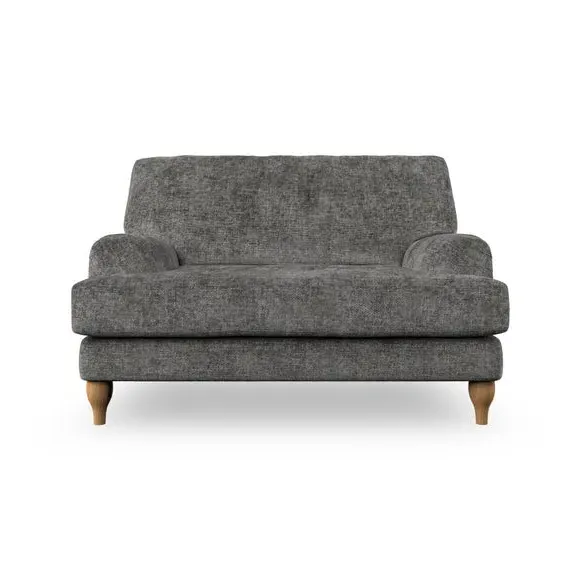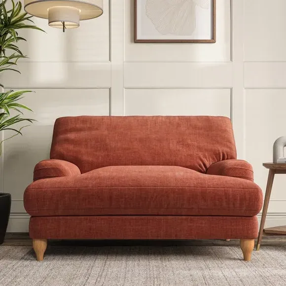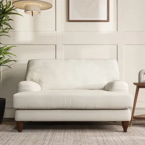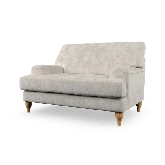 The snuggle chair combines classic bandaged arm design with contemporary pleat details and a lugged seat construction. Its serpentine seat springs provide excellent support, while deep fibre-filled back cushions add comfort. The T-cushion seat design ensures a compact feel, and the hour glass shaped turned hardwood legs offer stability with style.