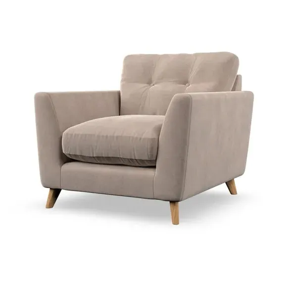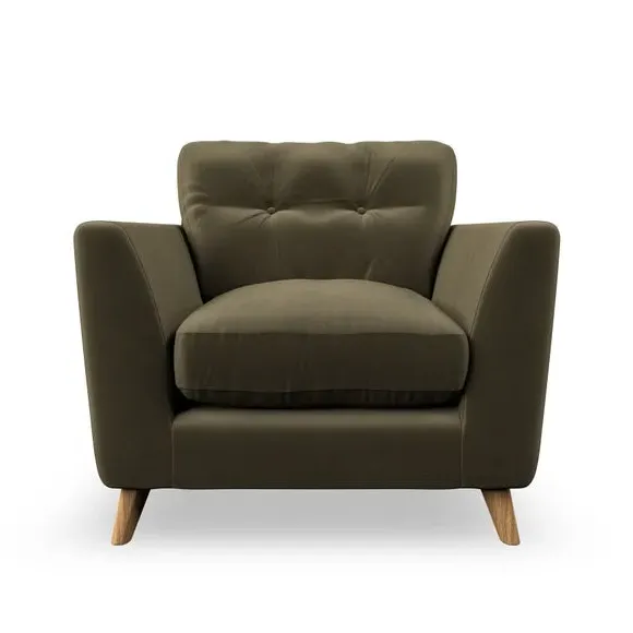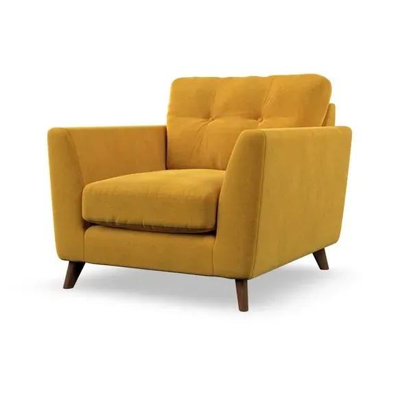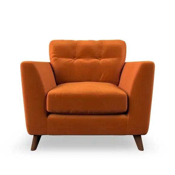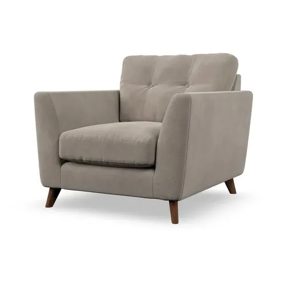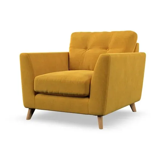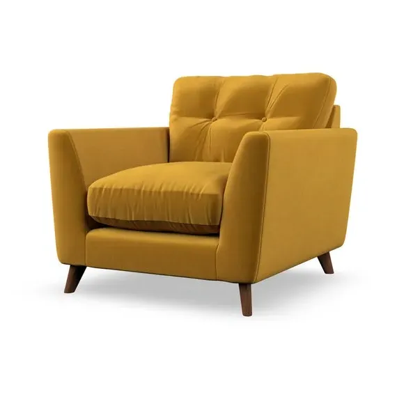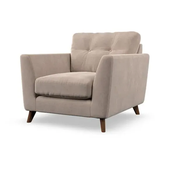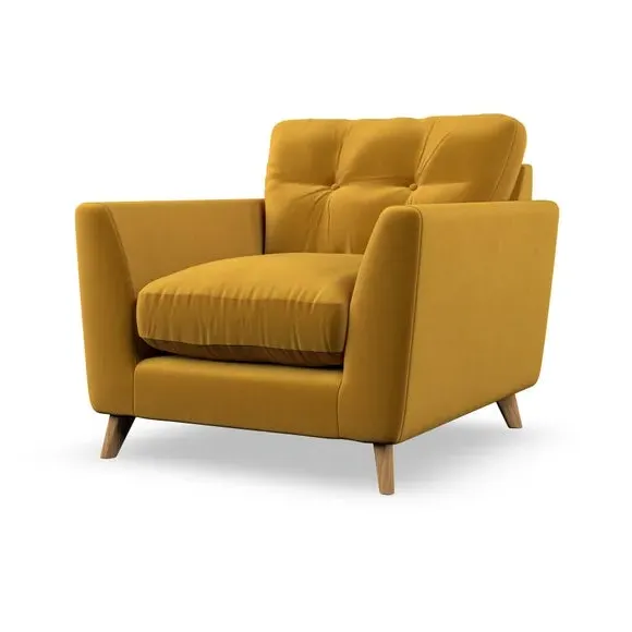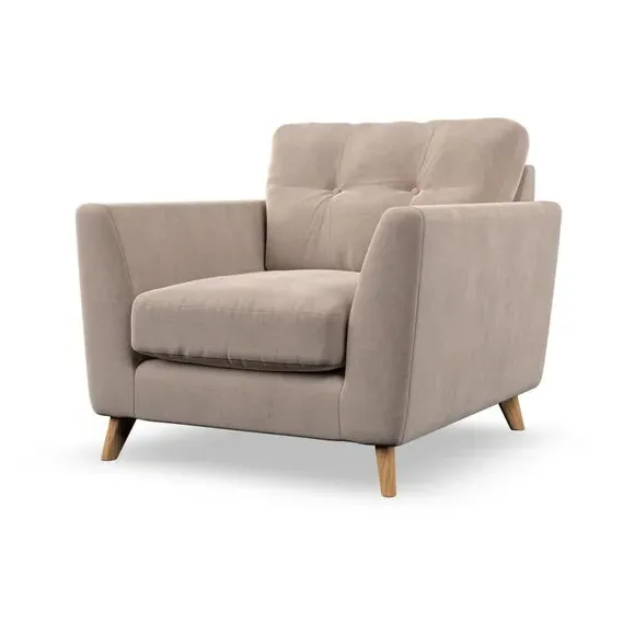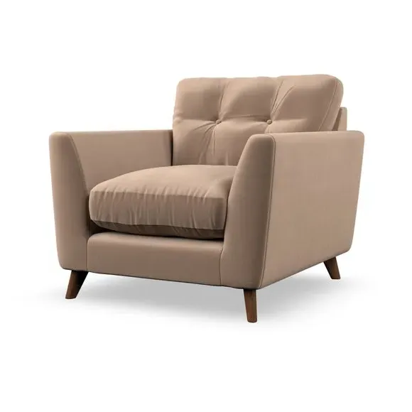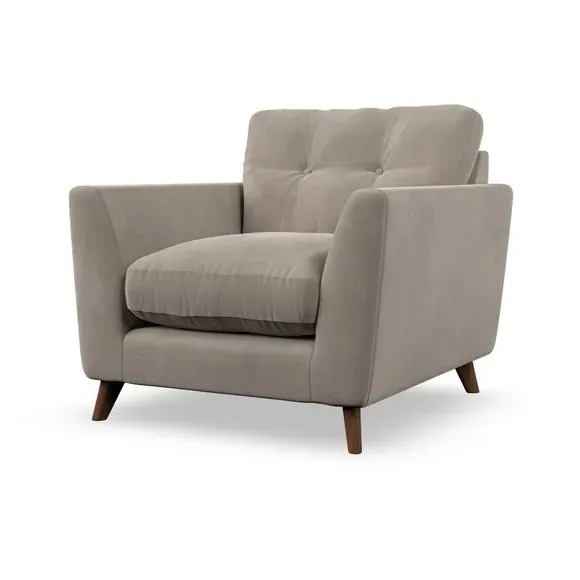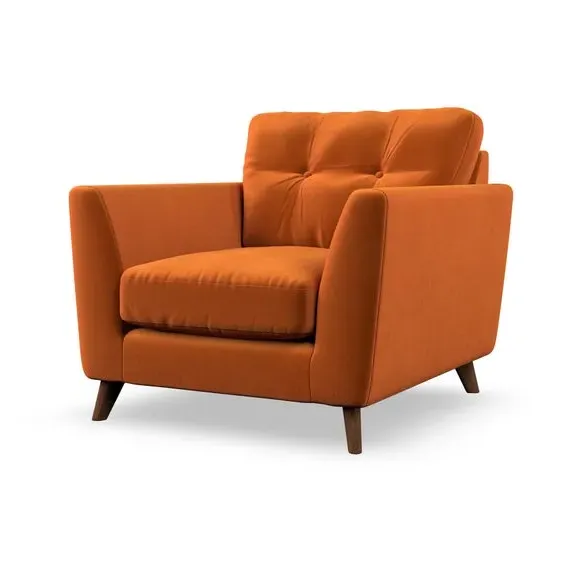 The armchair combines mid-century style with plush comfort, featuring fibre-filled arm pads and button-pull details on the supportive back cushion. Its higher back design provides excellent support for your back and shoulders, while the serpentine seat springs ensure lasting durability. The splayed hardwood legs add a customisable element to the overall design and are easy to fit.
