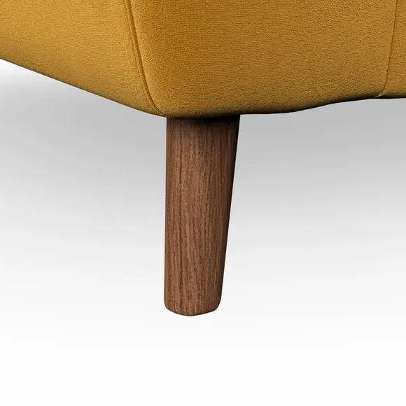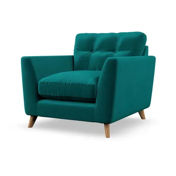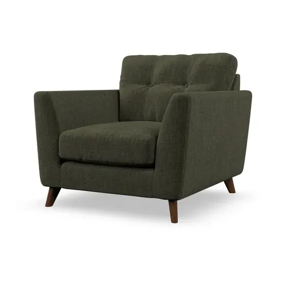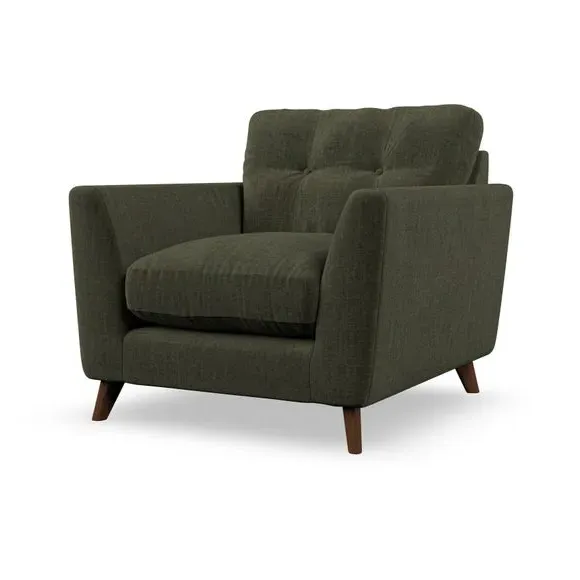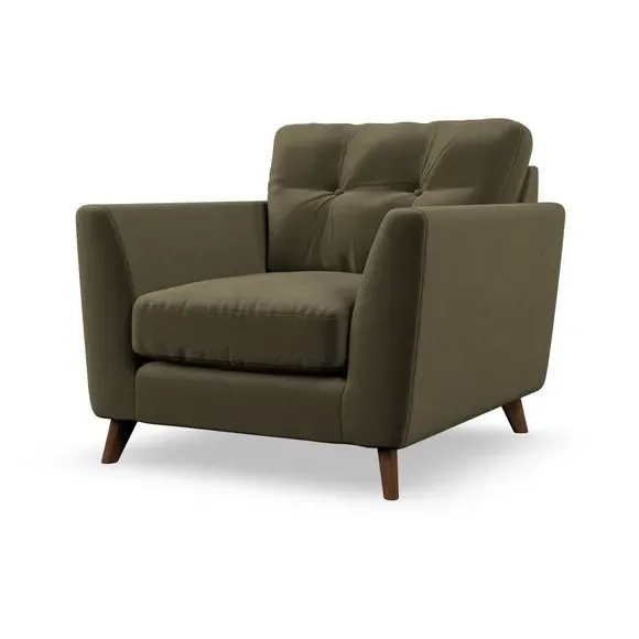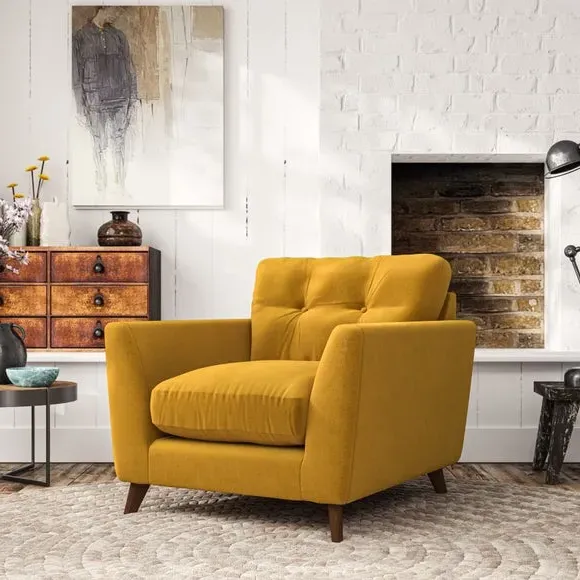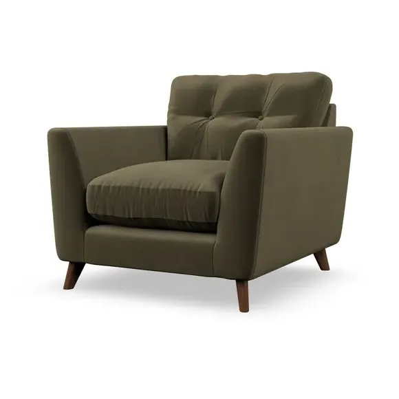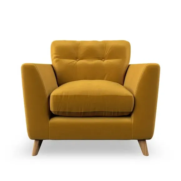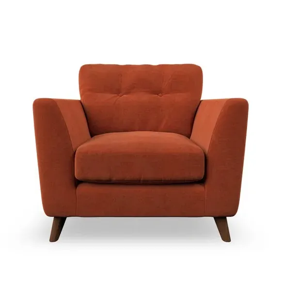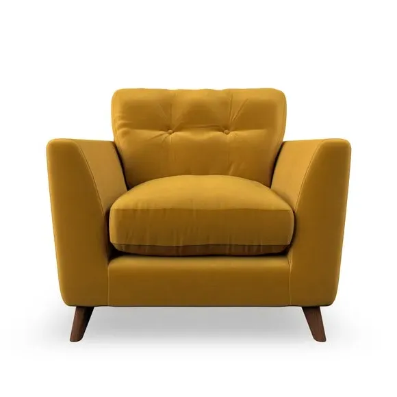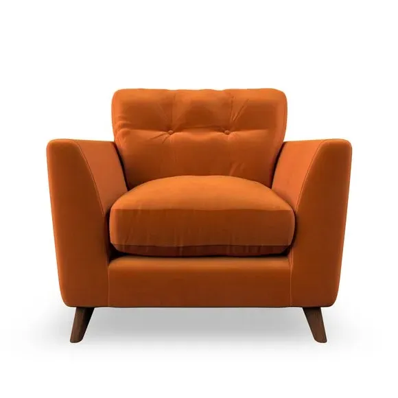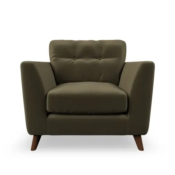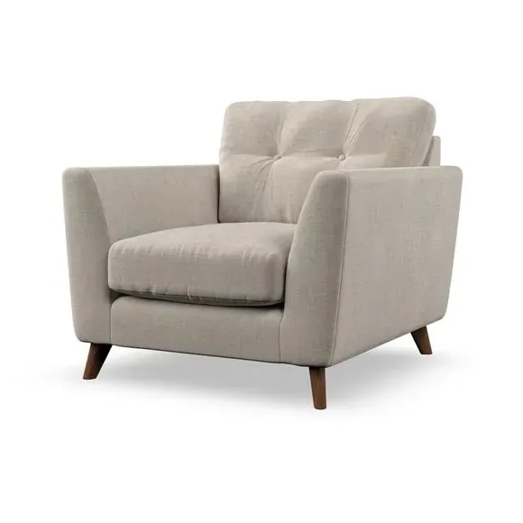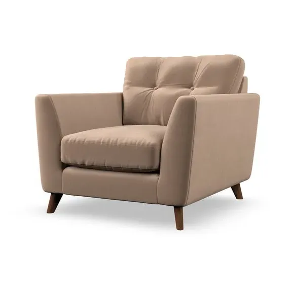 The armchair combines mid-century style with plush comfort, featuring fibre-filled arm pads and button-pull details on the supportive back cushion. Its higher back design provides excellent support for your back and shoulders, while the serpentine seat springs ensure lasting durability. The splayed hardwood legs add a customisable element to the overall design and are easy to fit.