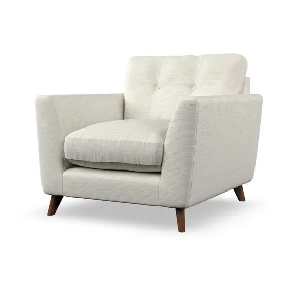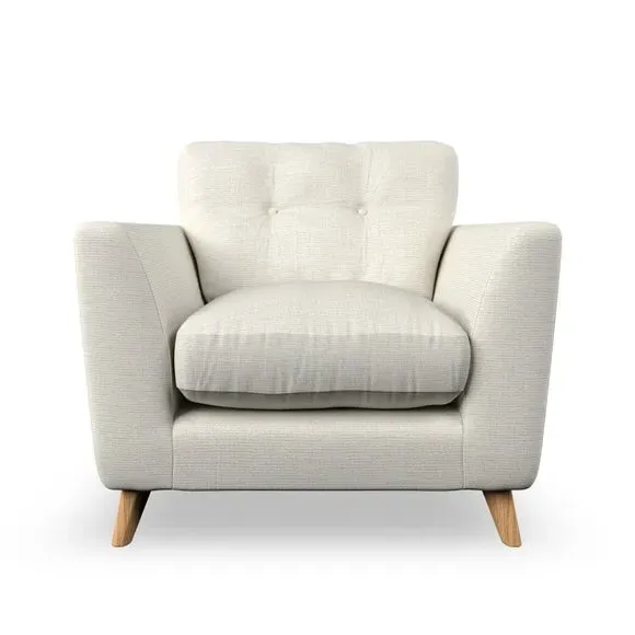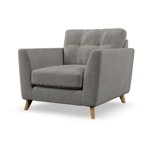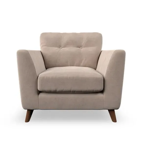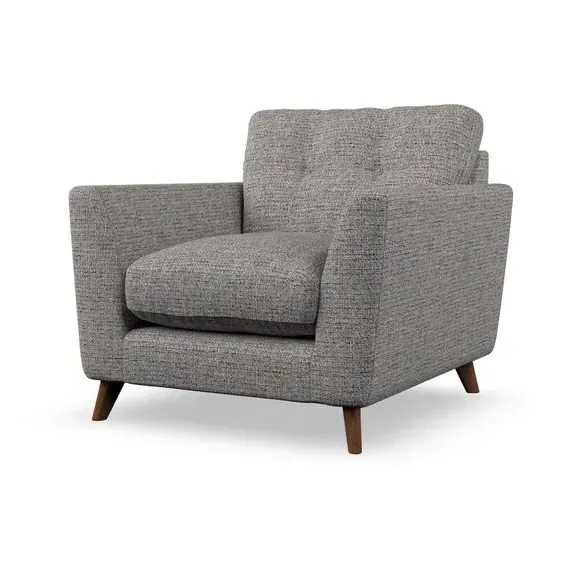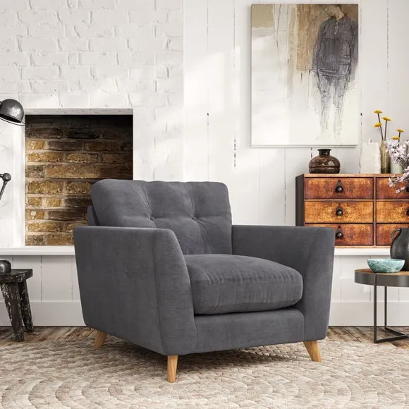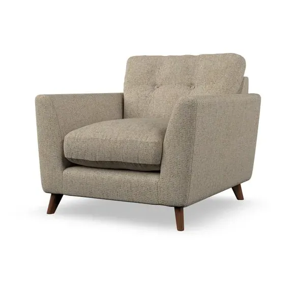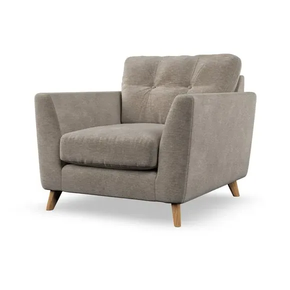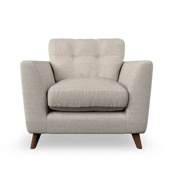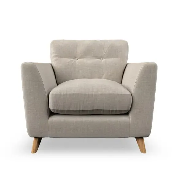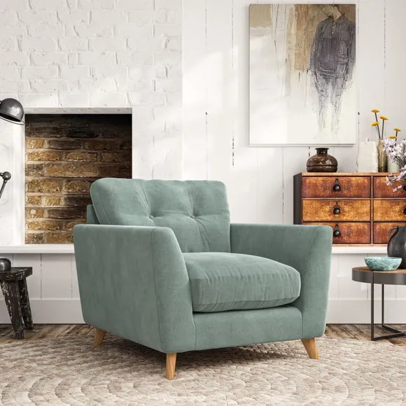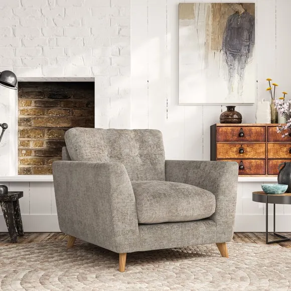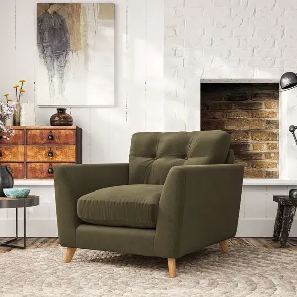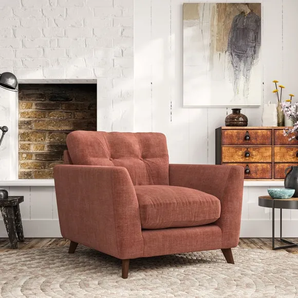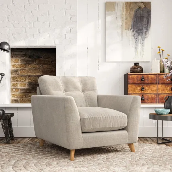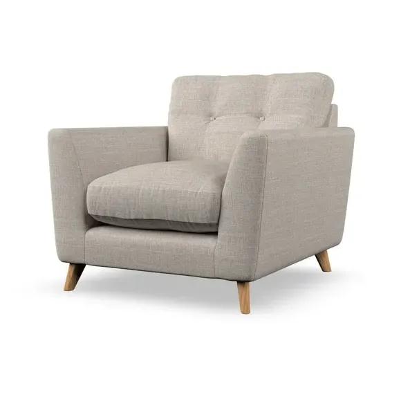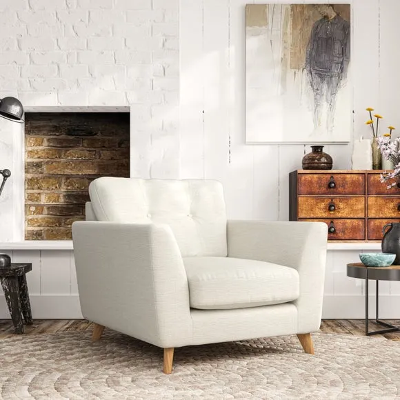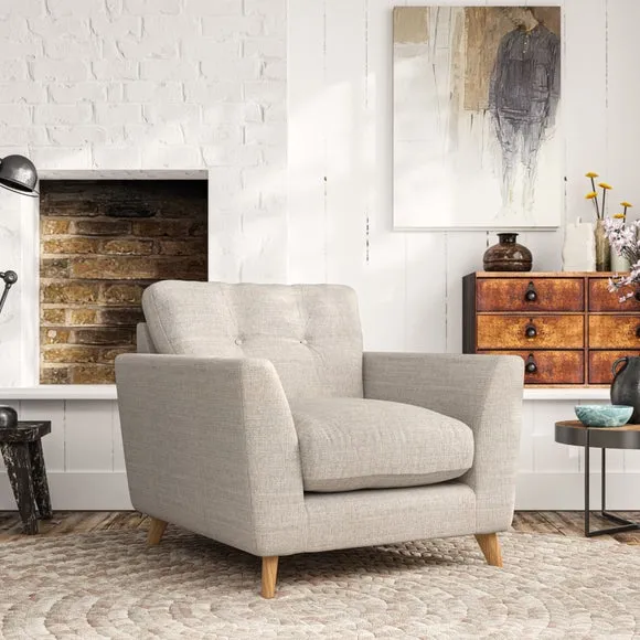 * Mid-century style* Pillow top arms* Button pull details* Choose fabric type, leg colour and cushion filling With its sleek, high-leg design and plush fibre-filled arm pads, this armchair offers both style and relaxation. The button-pull details on the supportive, fibre-filled back cushion add a refined touch, while the higher back cushion provides excellent support for your back and shoulders. Customise your Peyton armchair by selecting from a low-maintenance foam seat or a more relaxed 'Qualofill Blue' fibre seat. Featuring serpentine seat springs for durability, the chair is built to offer lasting comfort. The splayed hardwood legs, available in two finishes, are easy to fit and add a customisable element to the overall design.