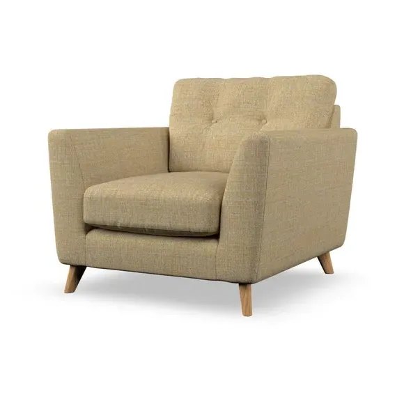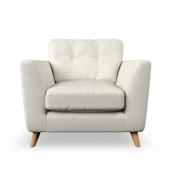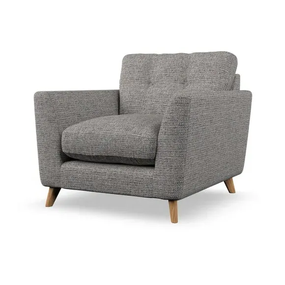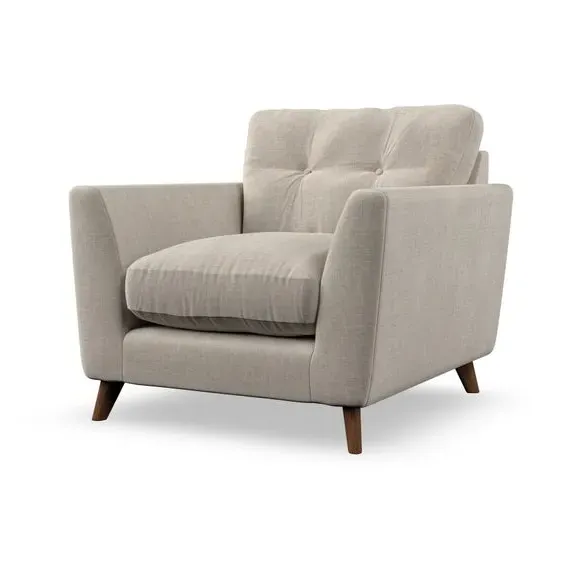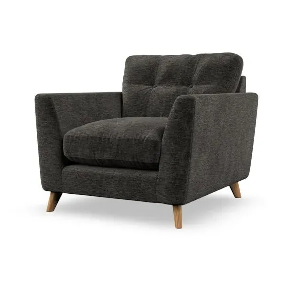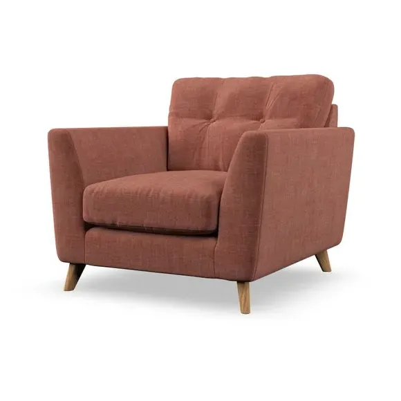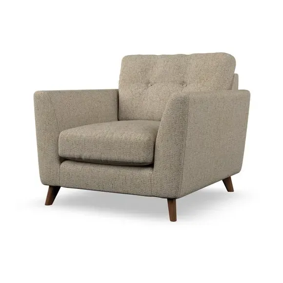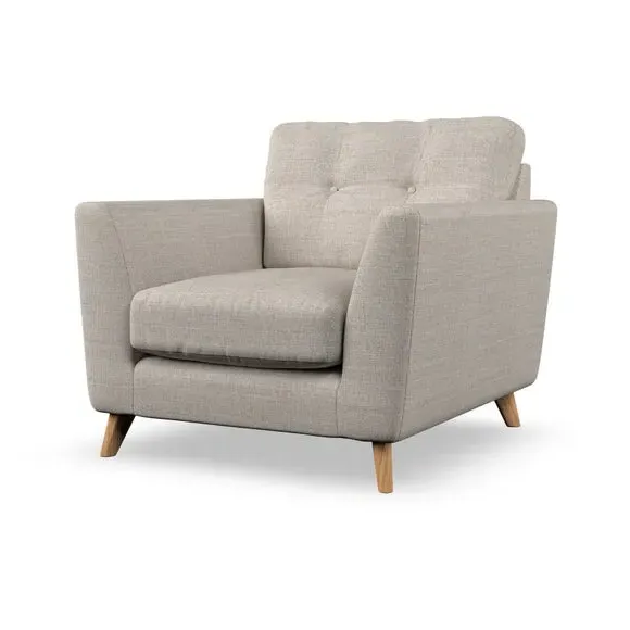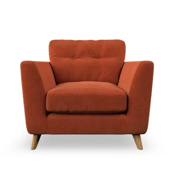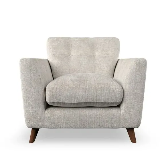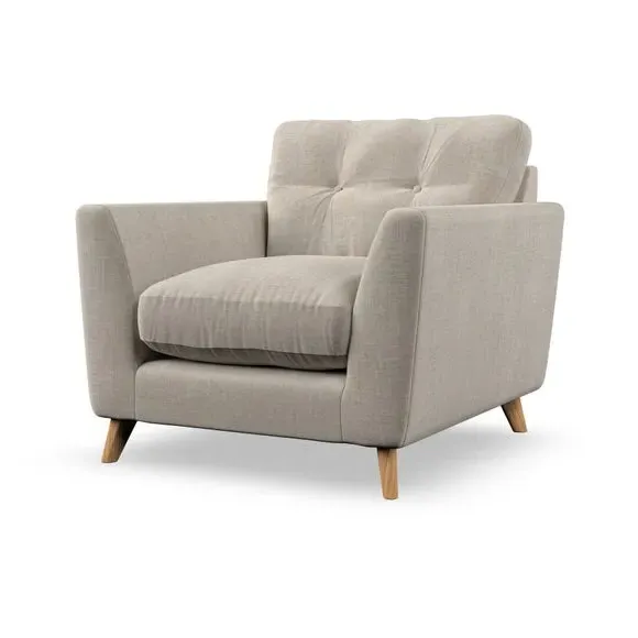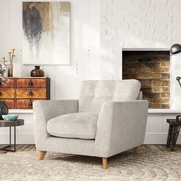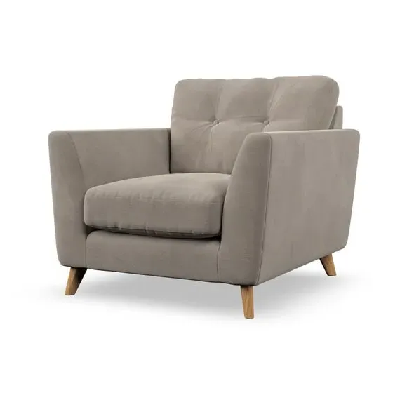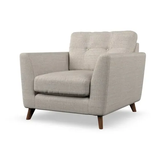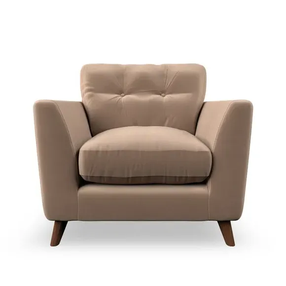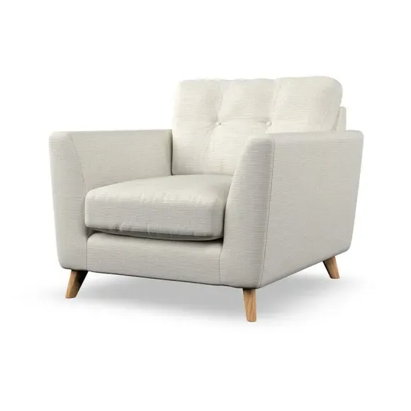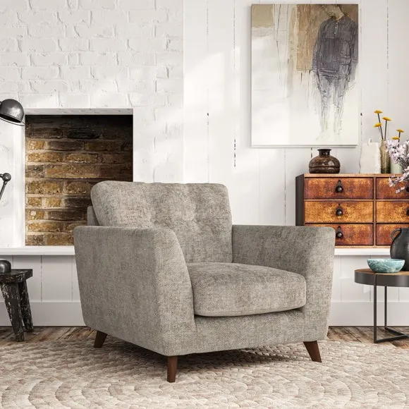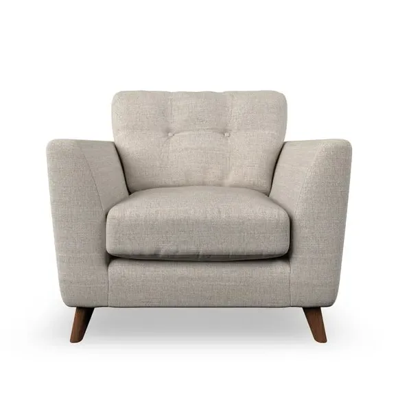 * Mid-century style* Pillow top arms* Button pull details* Choose fabric type, leg colour and cushion filling With its sleek, high-leg design and plush fibre-filled arm pads, this armchair offers both style and relaxation. The button-pull details on the supportive, fibre-filled back cushion add a refined touch, while the higher back cushion provides excellent support for your back and shoulders. Customise your Peyton armchair by selecting from a low-maintenance foam seat or a more relaxed 'Qualofill Blue' fibre seat. Featuring serpentine seat springs for durability, the chair is built to offer lasting comfort. The splayed hardwood legs, available in two finishes, are easy to fit and add a customisable element to the overall design.