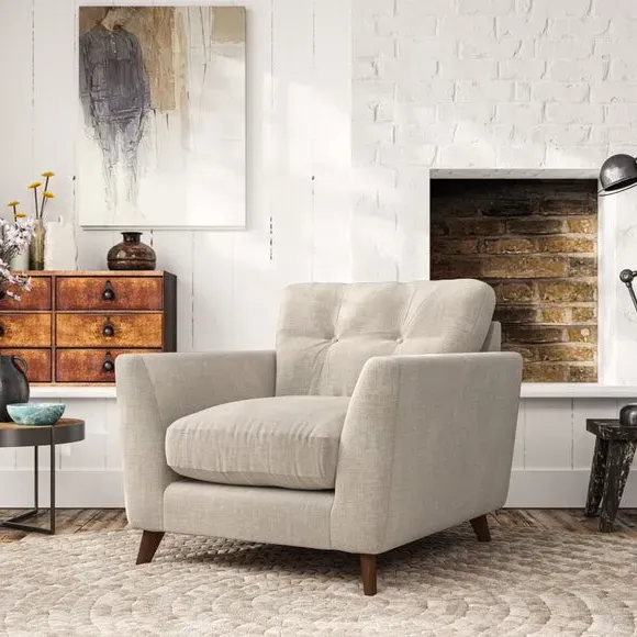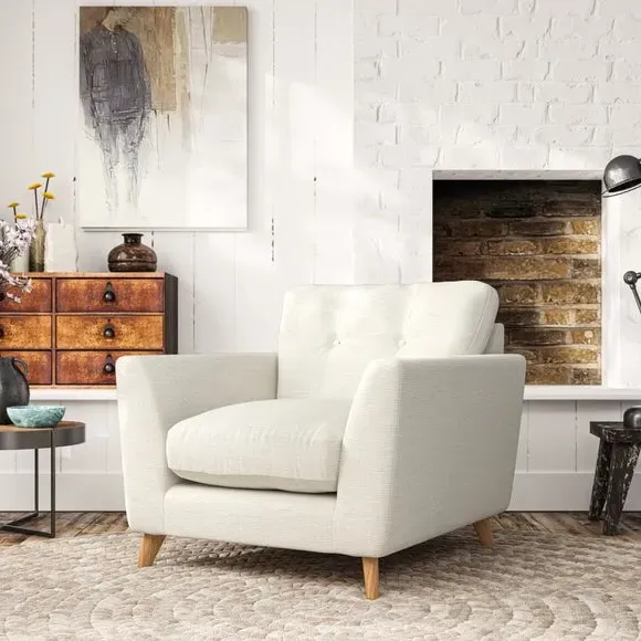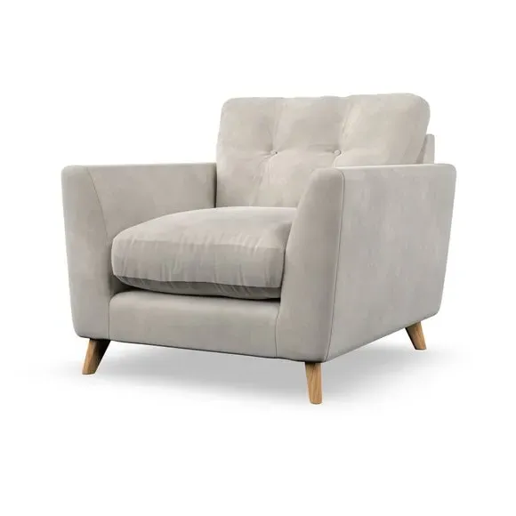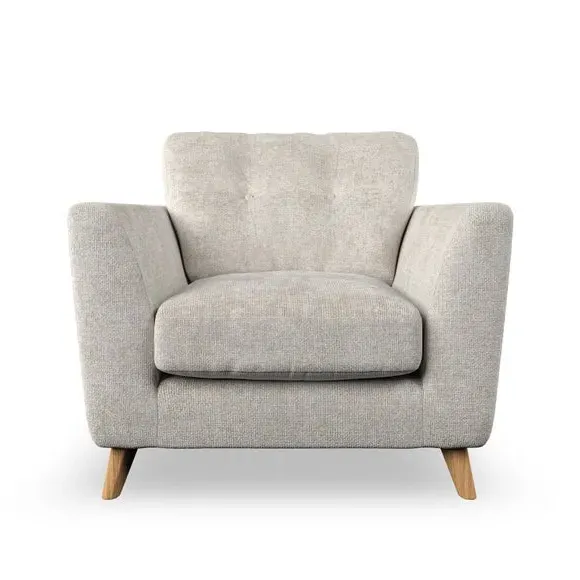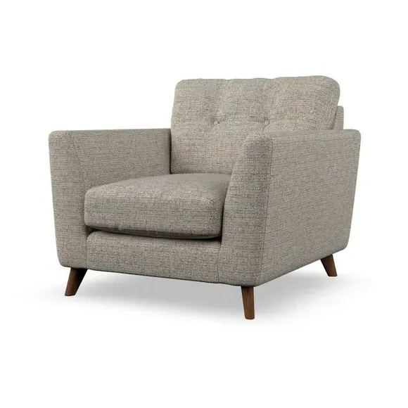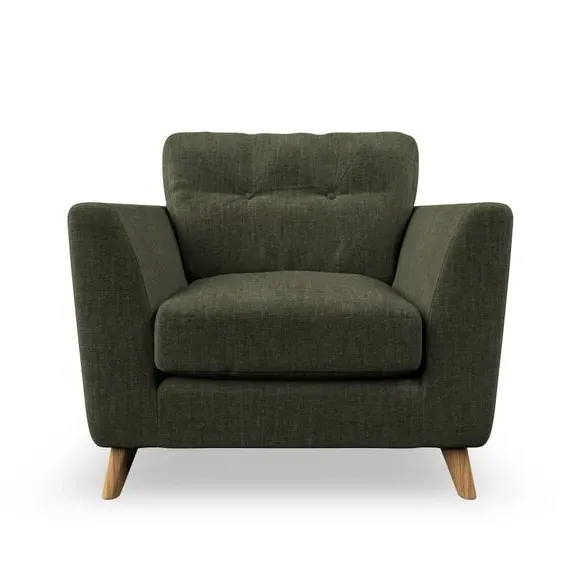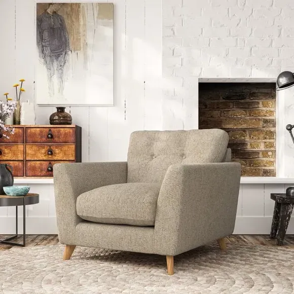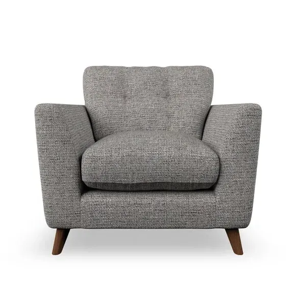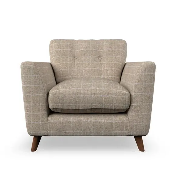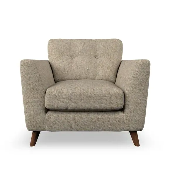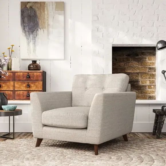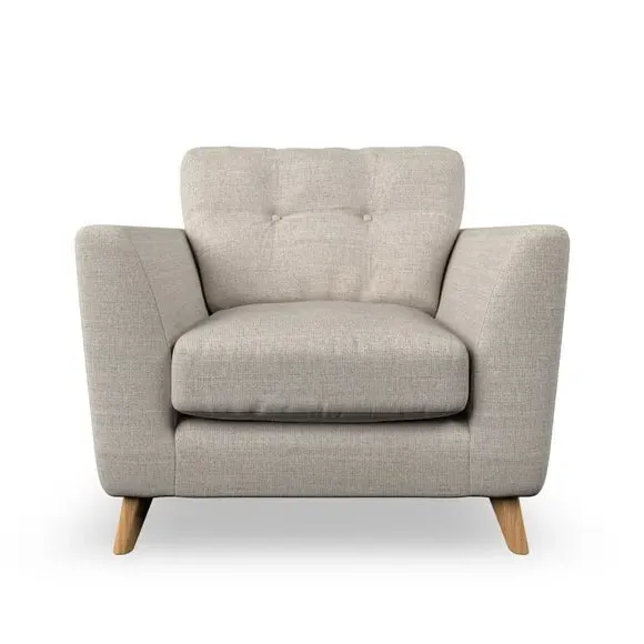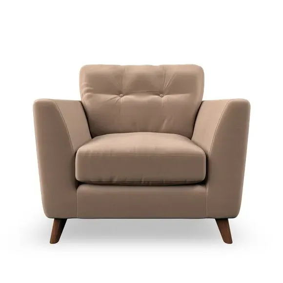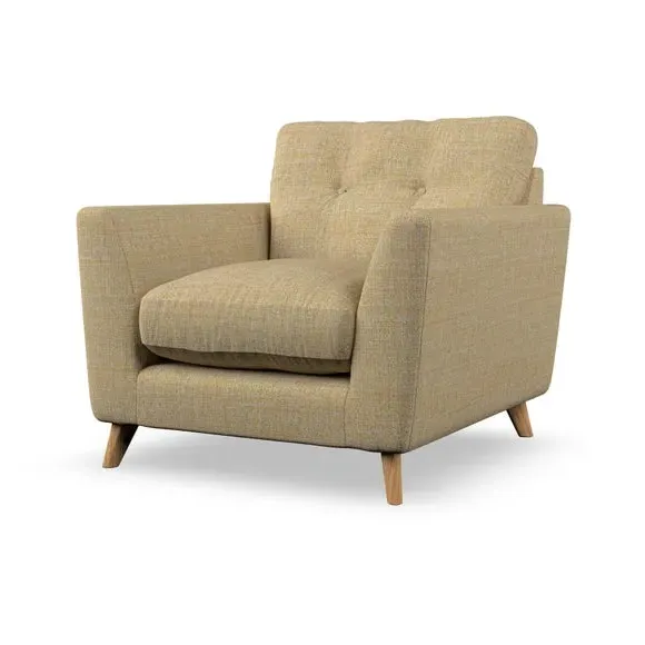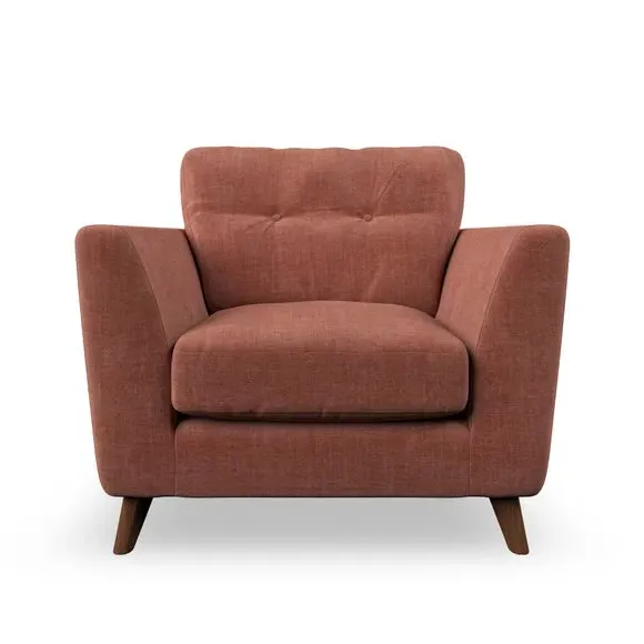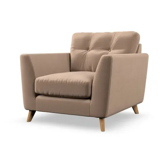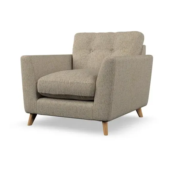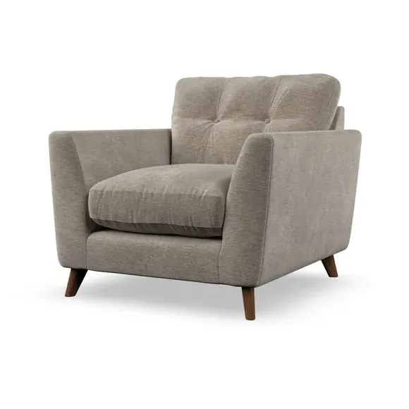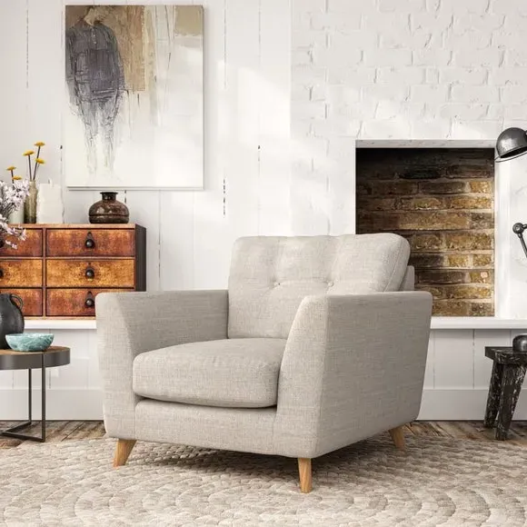 * Mid-century style* Pillow top arms* Button pull details* Choose fabric type, leg colour and cushion filling With its sleek, high-leg design and plush fibre-filled arm pads, this armchair offers both style and relaxation. The button-pull details on the supportive, fibre-filled back cushion add a refined touch, while the higher back cushion provides excellent support for your back and shoulders. Customise your Peyton armchair by selecting from a low-maintenance foam seat or a more relaxed 'Qualofill Blue' fibre seat. Featuring serpentine seat springs for durability, the chair is built to offer lasting comfort. The splayed hardwood legs, available in two finishes, are easy to fit and add a customisable element to the overall design.