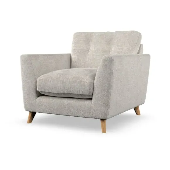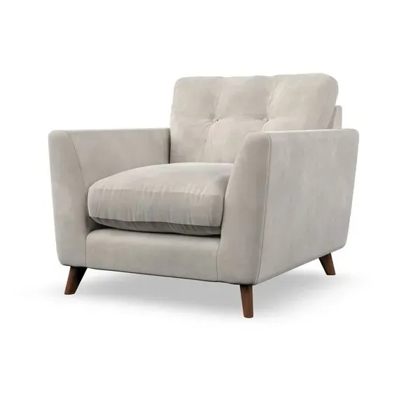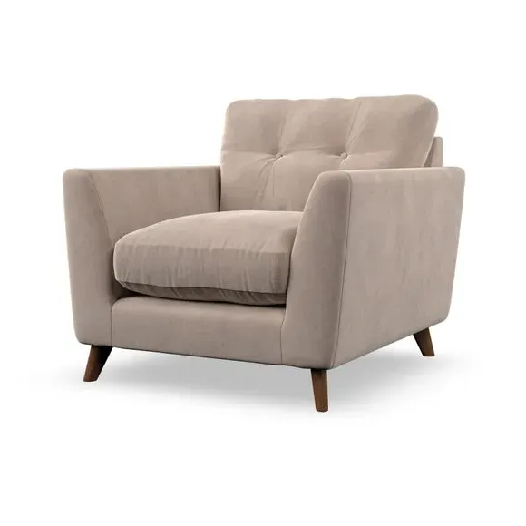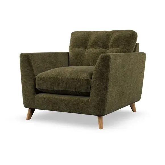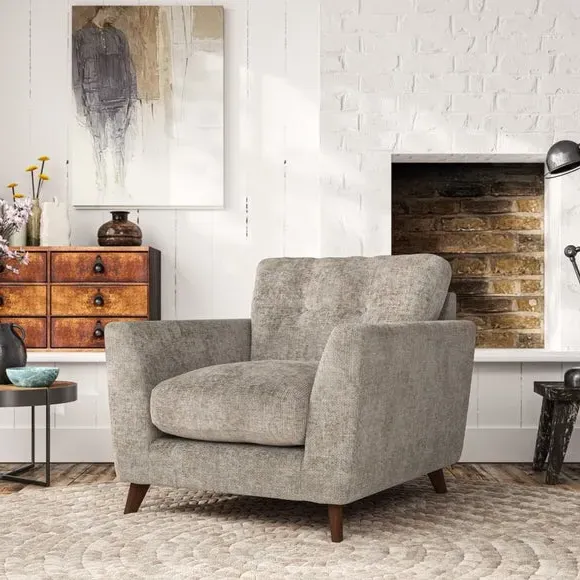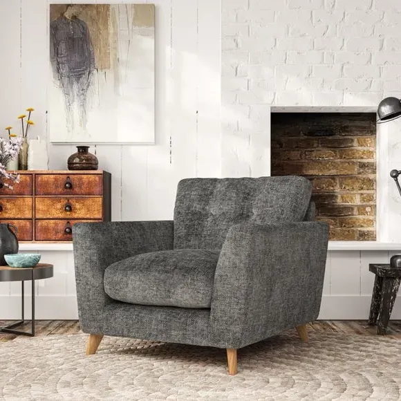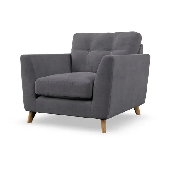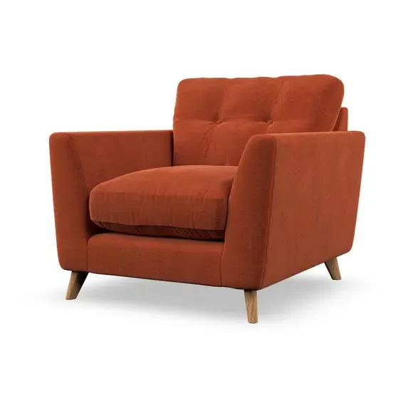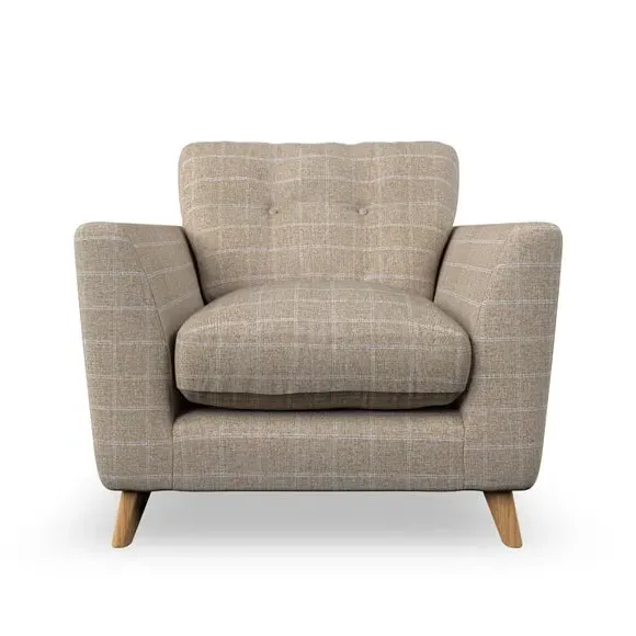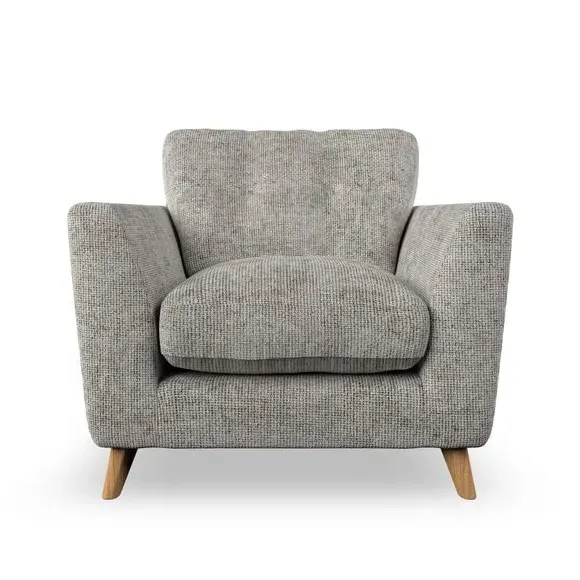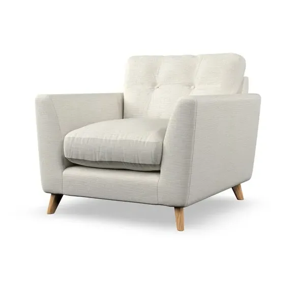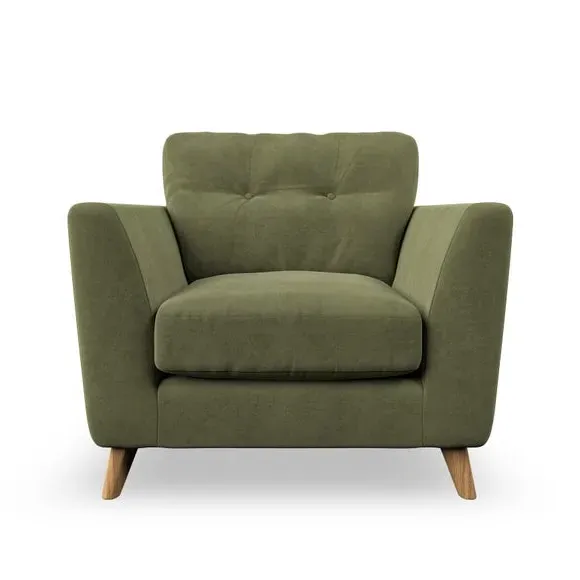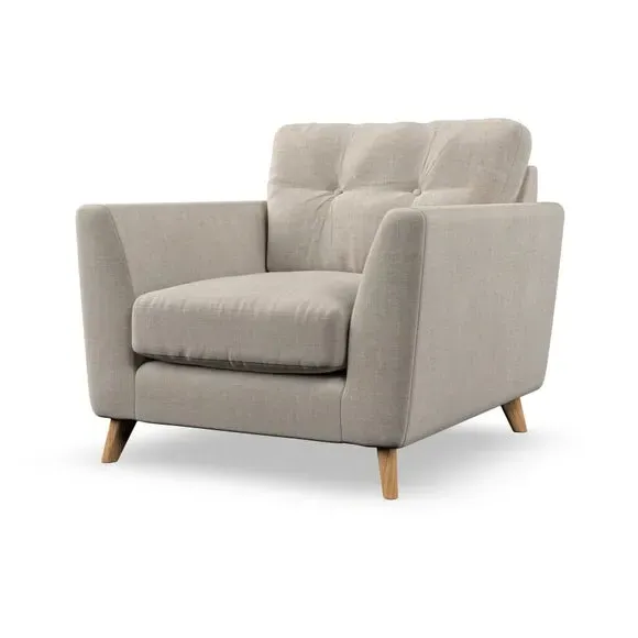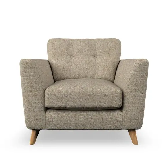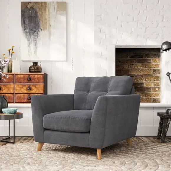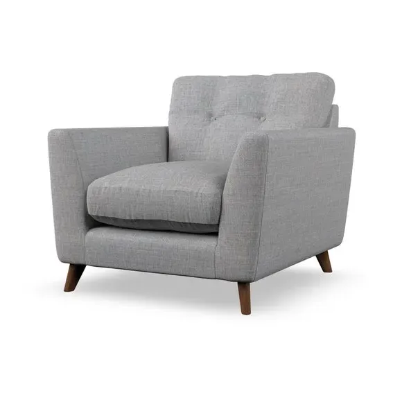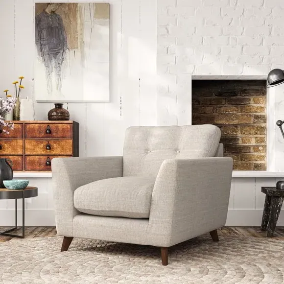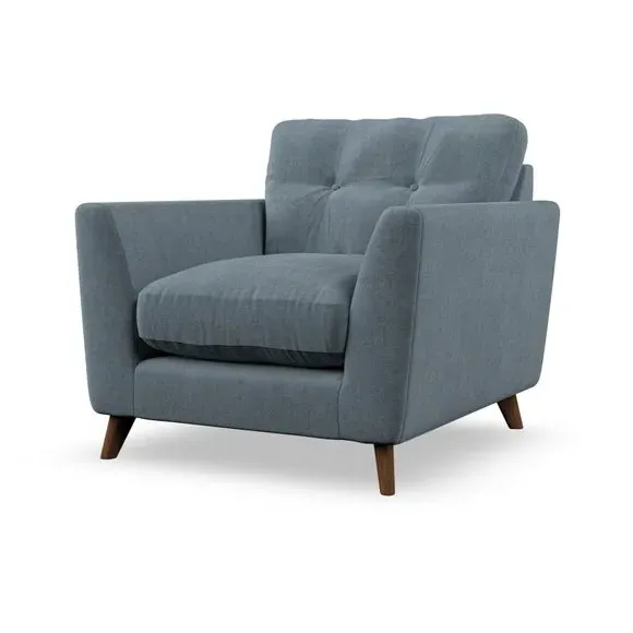 * Mid-century style* Pillow top arms* Button pull details* Choose fabric type, leg colour and cushion filling With its sleek, high-leg design and plush fibre-filled arm pads, this armchair offers both style and relaxation. The button-pull details on the supportive, fibre-filled back cushion add a refined touch, while the higher back cushion provides excellent support for your back and shoulders. Customise your Peyton armchair by selecting from a low-maintenance foam seat or a more relaxed 'Qualofill Blue' fibre seat. Featuring serpentine seat springs for durability, the chair is built to offer lasting comfort. The splayed hardwood legs, available in two finishes, are easy to fit and add a customisable element to the overall design.