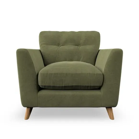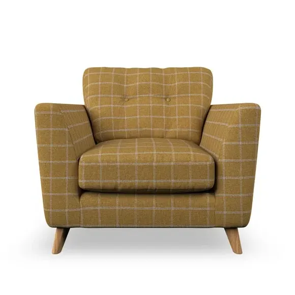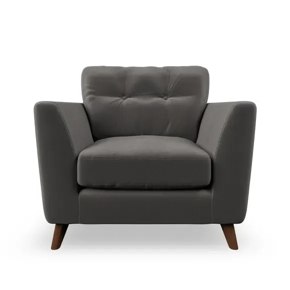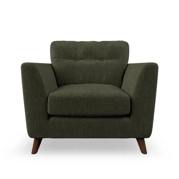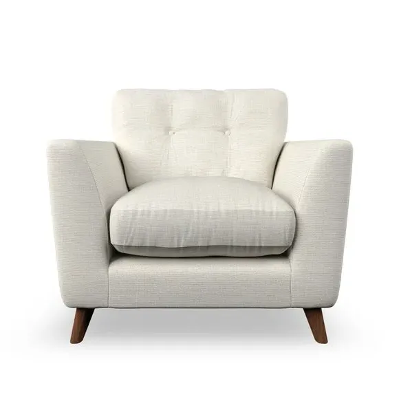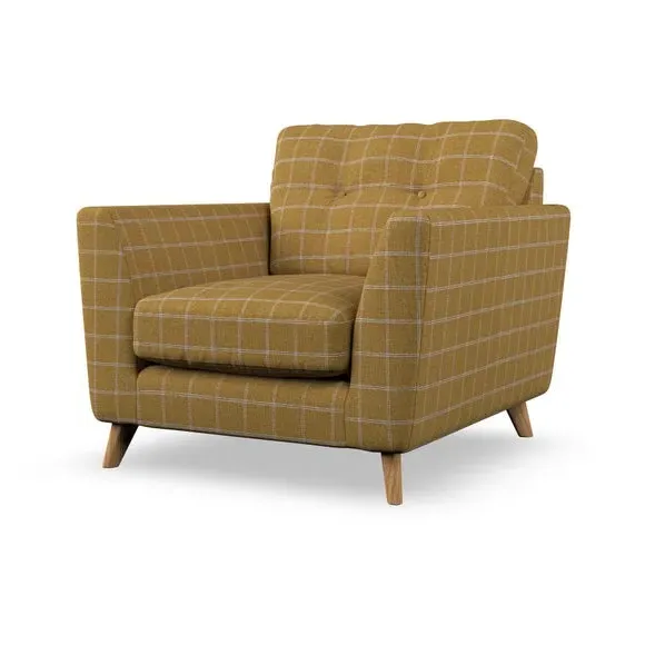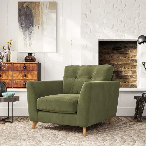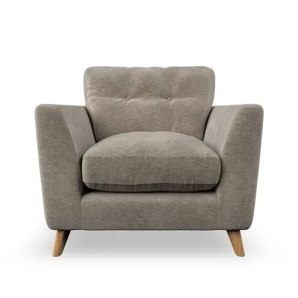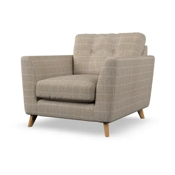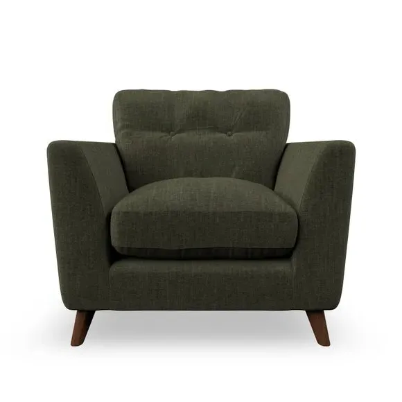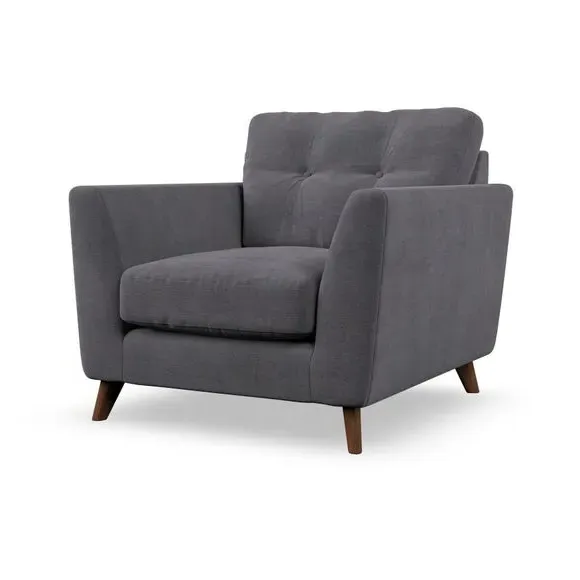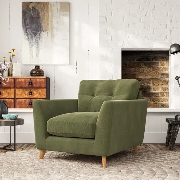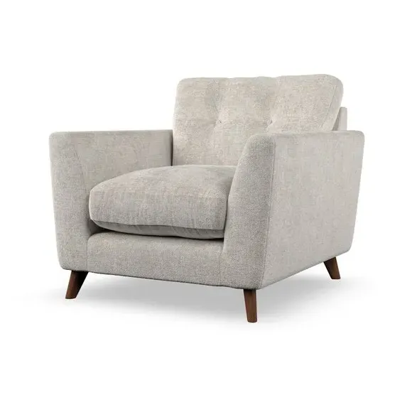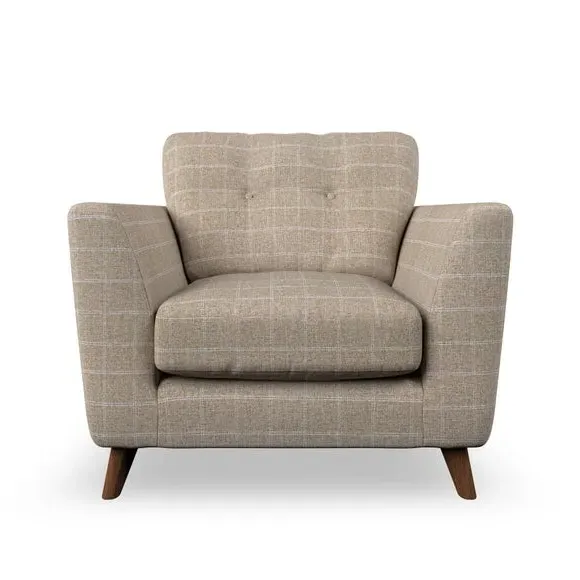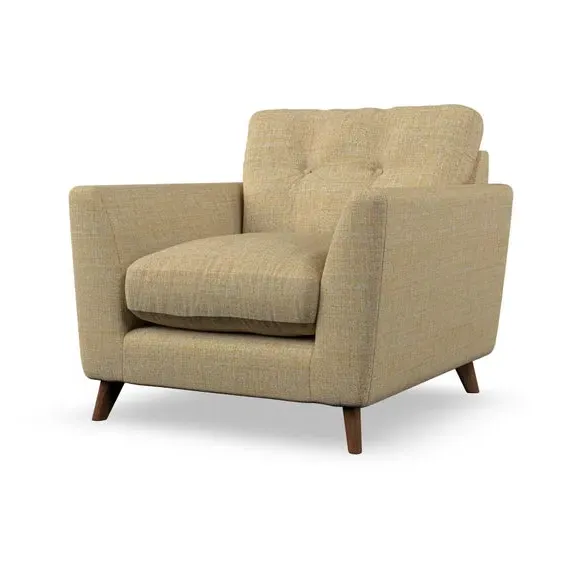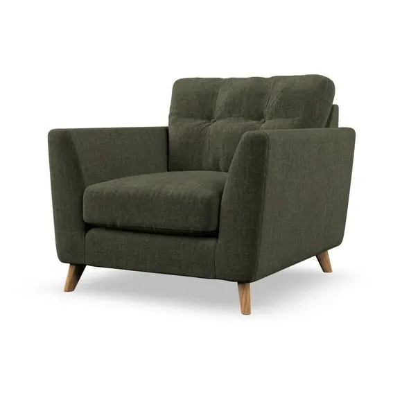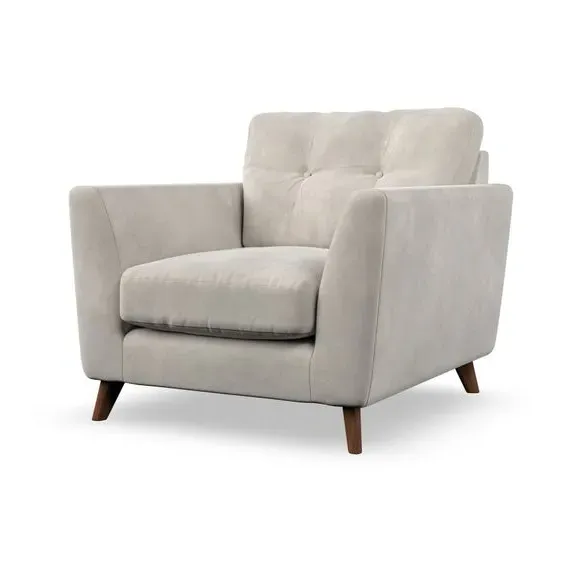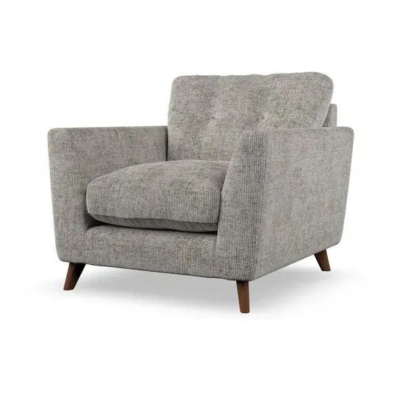 * Mid-century style* Pillow top arms* Button pull details* Choose fabric type, leg colour and cushion filling With its sleek, high-leg design and plush fibre-filled arm pads, this armchair offers both style and relaxation. The button-pull details on the supportive, fibre-filled back cushion add a refined touch, while the higher back cushion provides excellent support for your back and shoulders. Customise your Peyton armchair by selecting from a low-maintenance foam seat or a more relaxed 'Qualofill Blue' fibre seat. Featuring serpentine seat springs for durability, the chair is built to offer lasting comfort. The splayed hardwood legs, available in two finishes, are easy to fit and add a customisable element to the overall design.