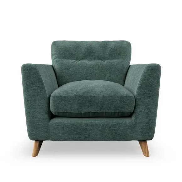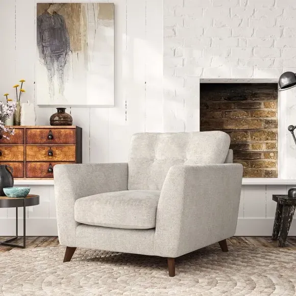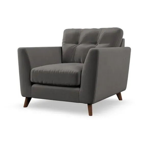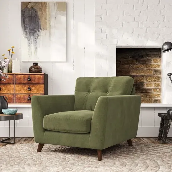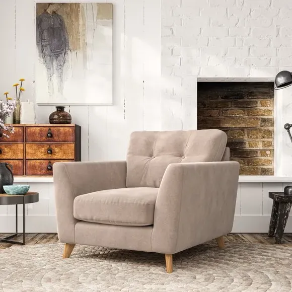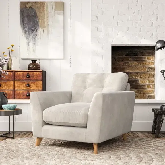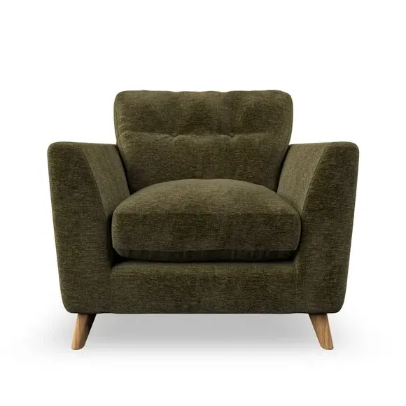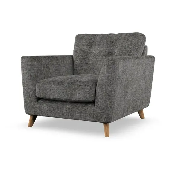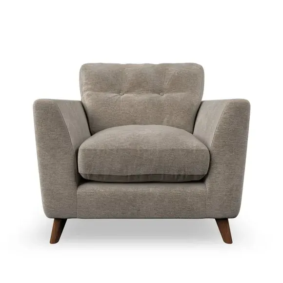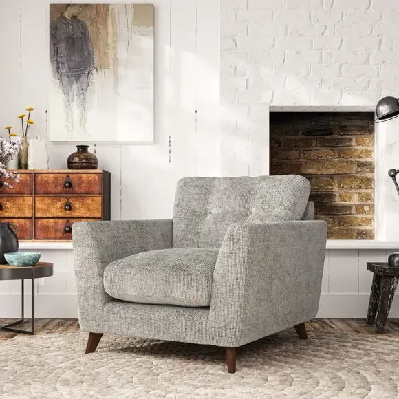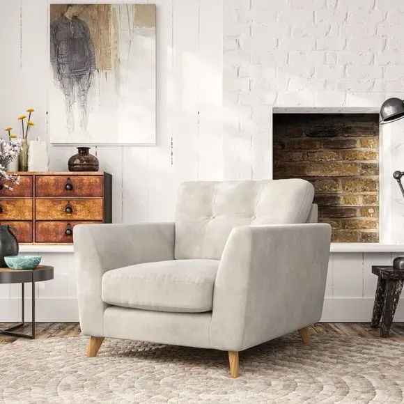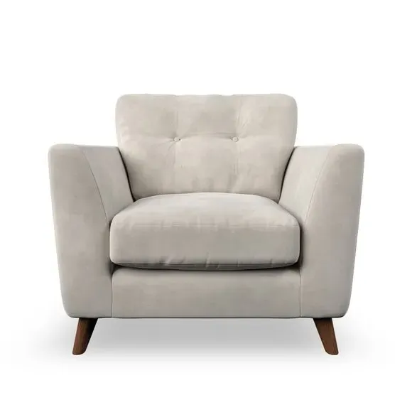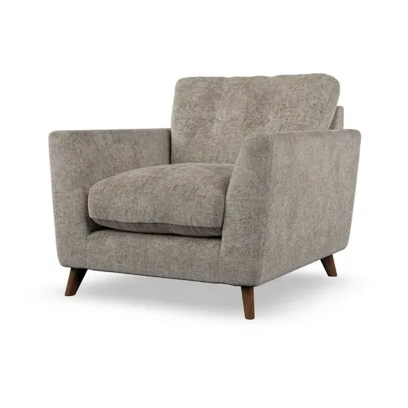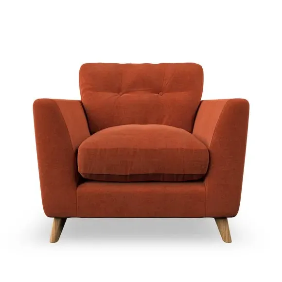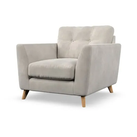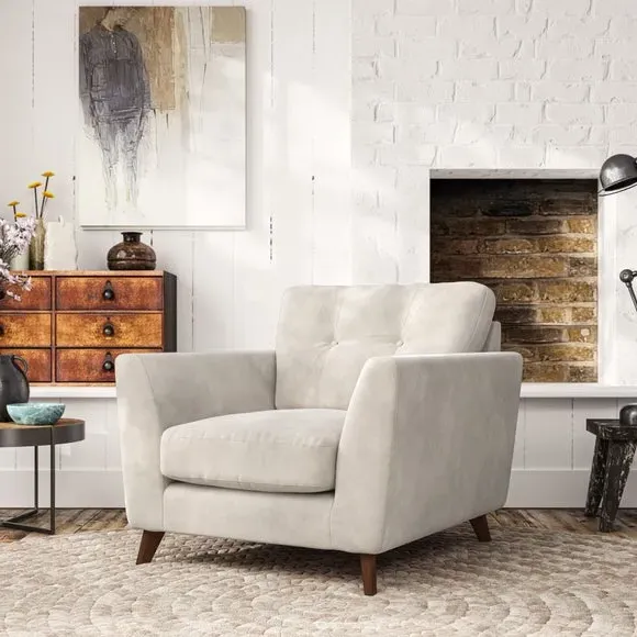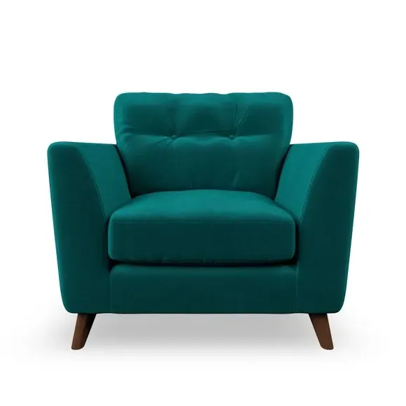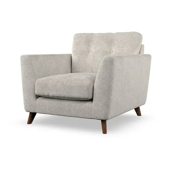 * Mid-century style* Pillow top arms* Button pull details* Choose fabric type, leg colour and cushion filling With its sleek, high-leg design and plush fibre-filled arm pads, this armchair offers both style and relaxation. The button-pull details on the supportive, fibre-filled back cushion add a refined touch, while the higher back cushion provides excellent support for your back and shoulders. Customise your Peyton armchair by selecting from a low-maintenance foam seat or a more relaxed 'Qualofill Blue' fibre seat. Featuring serpentine seat springs for durability, the chair is built to offer lasting comfort. The splayed hardwood legs, available in two finishes, are easy to fit and add a customisable element to the overall design.