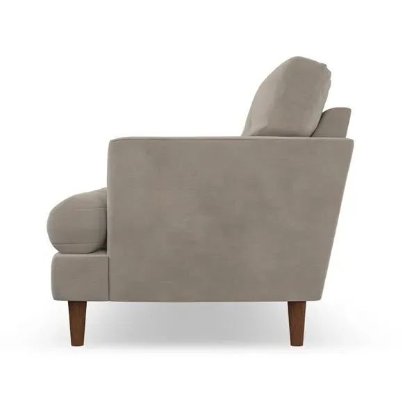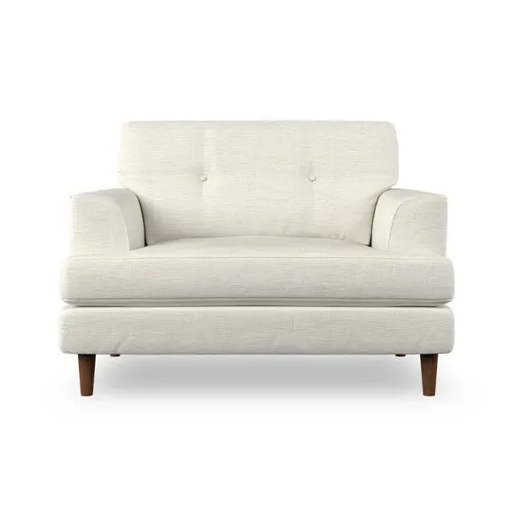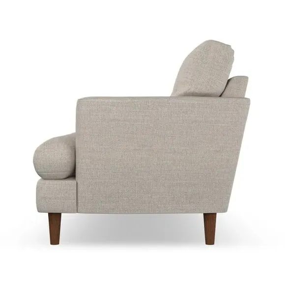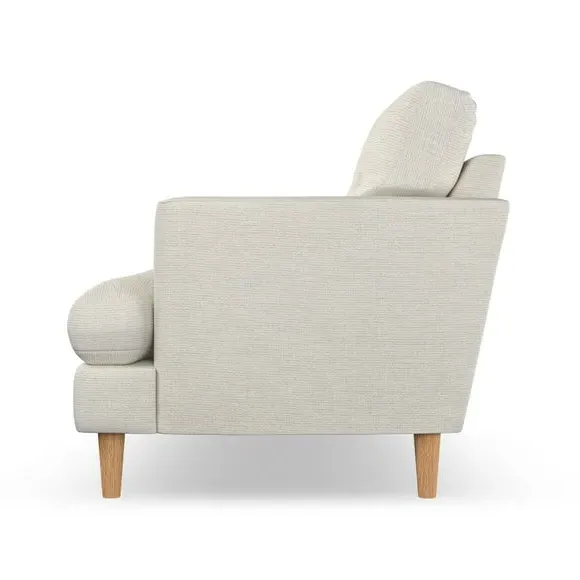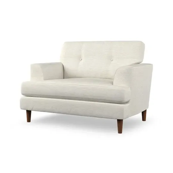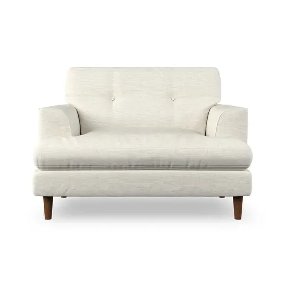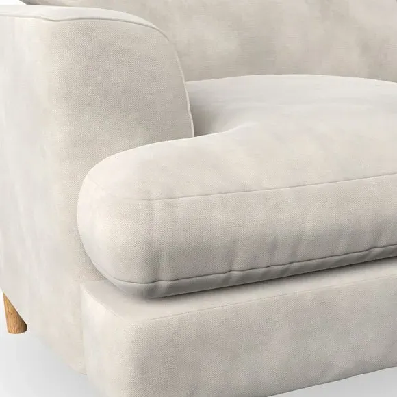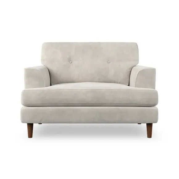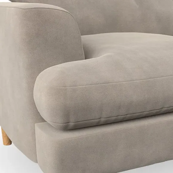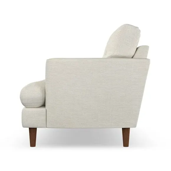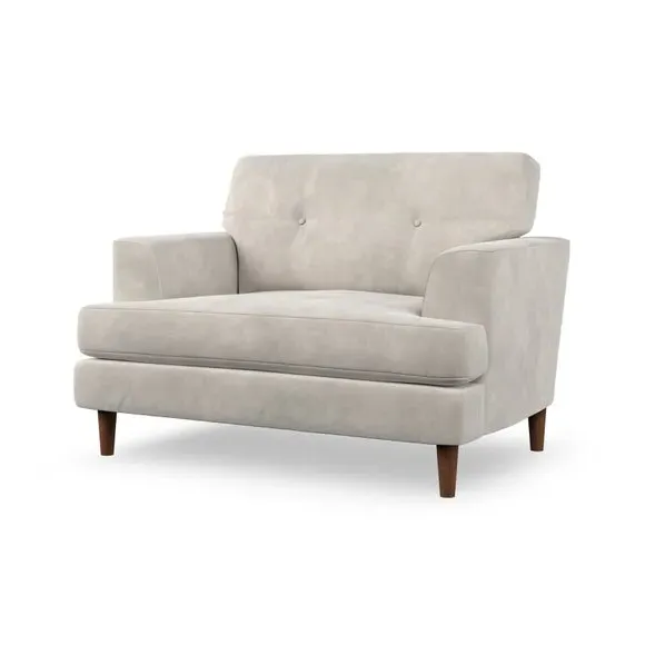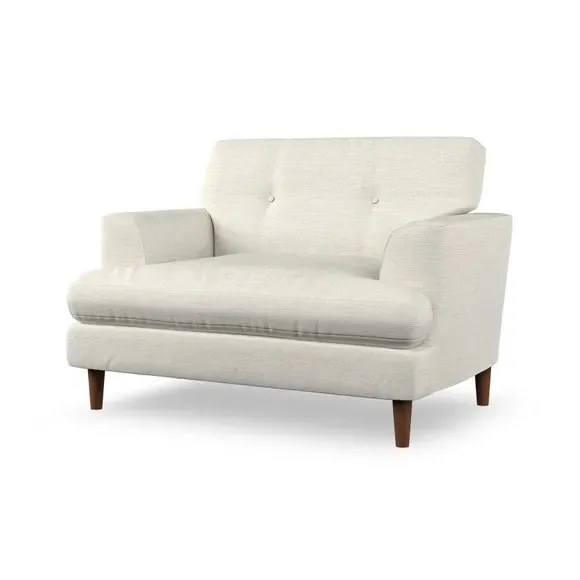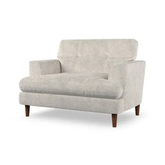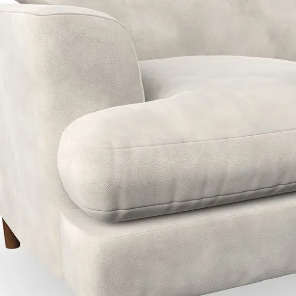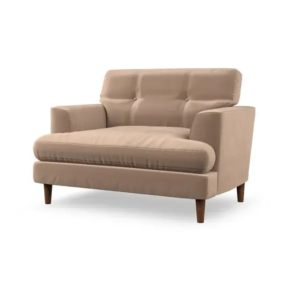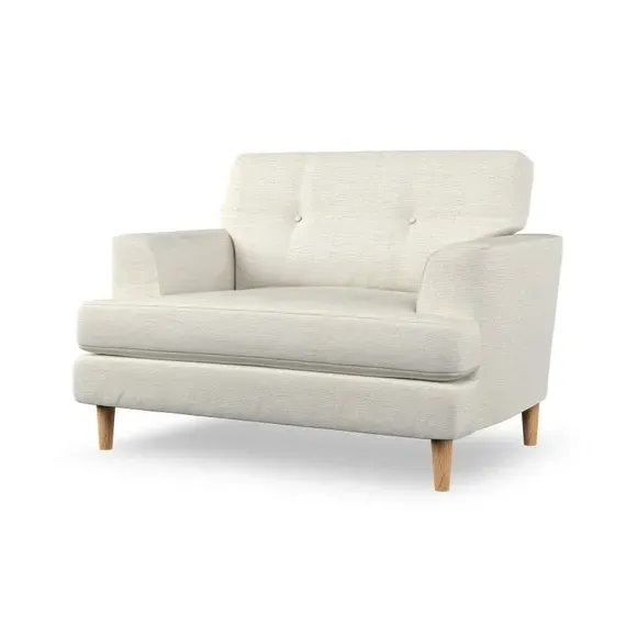 The snuggle chair combines compact luxury with Scandinavian-inspired design, featuring clean lines and elegant high legs. Its generous T-shaped seat cushion provides ample comfort, while the fibre-filled back cushion displays classic button-pull detailing. The customizable design allows you to choose your preferred fabric, leg finish, and cushion filling to match your space.