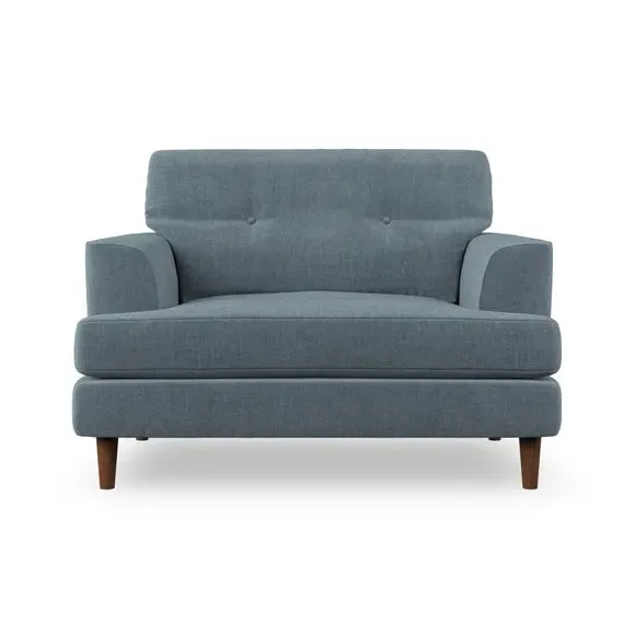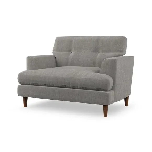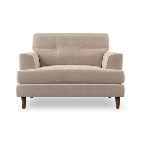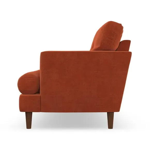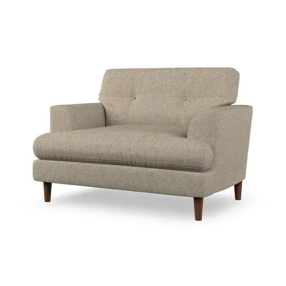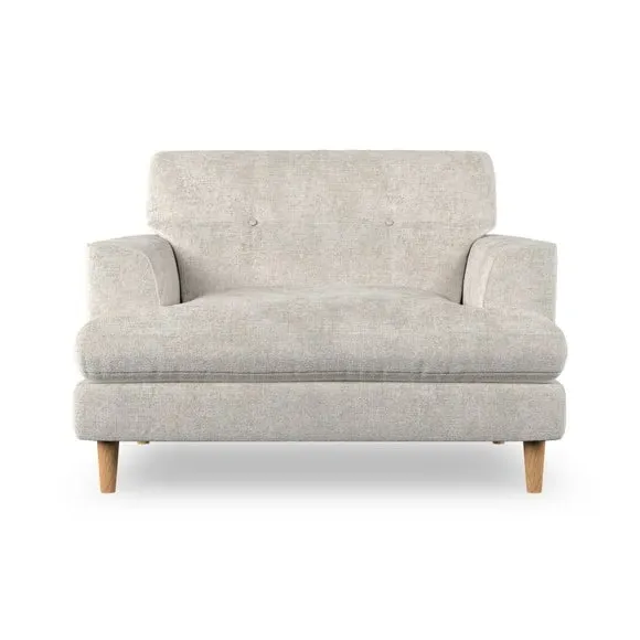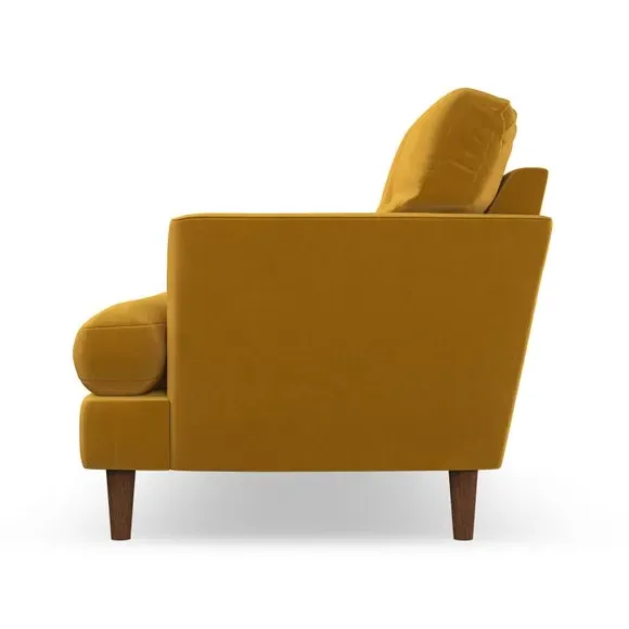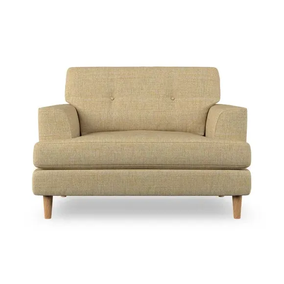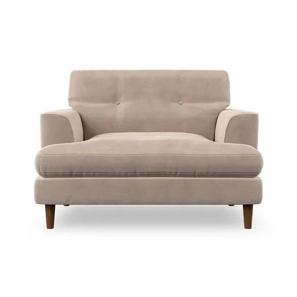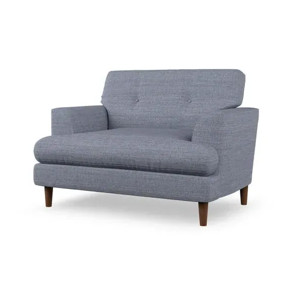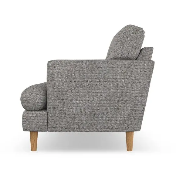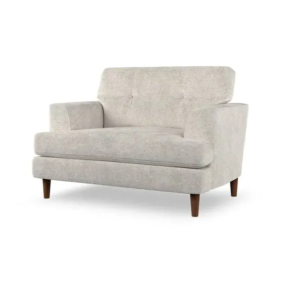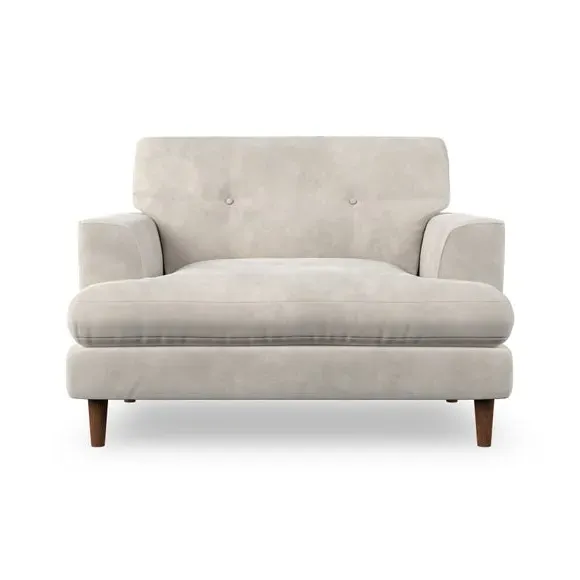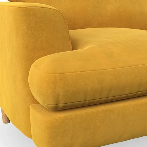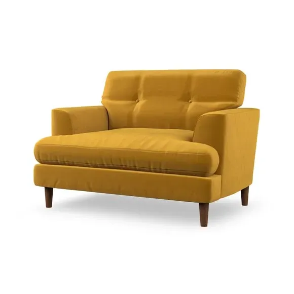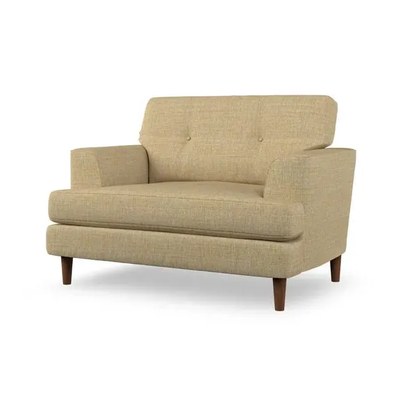 The snuggle chair combines compact luxury with Scandinavian-inspired design, featuring clean lines and elegant high legs. Its generous T-shaped seat cushion provides ample comfort, while the fibre-filled back cushion displays classic button-pull detailing. The customizable design allows you to choose your preferred fabric, leg finish, and cushion filling to match your space.