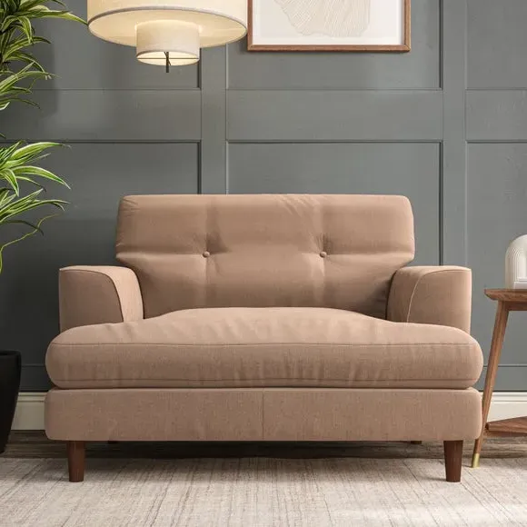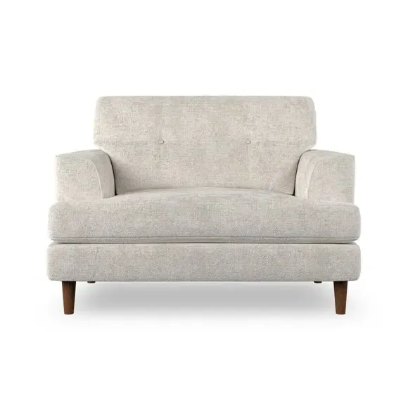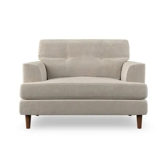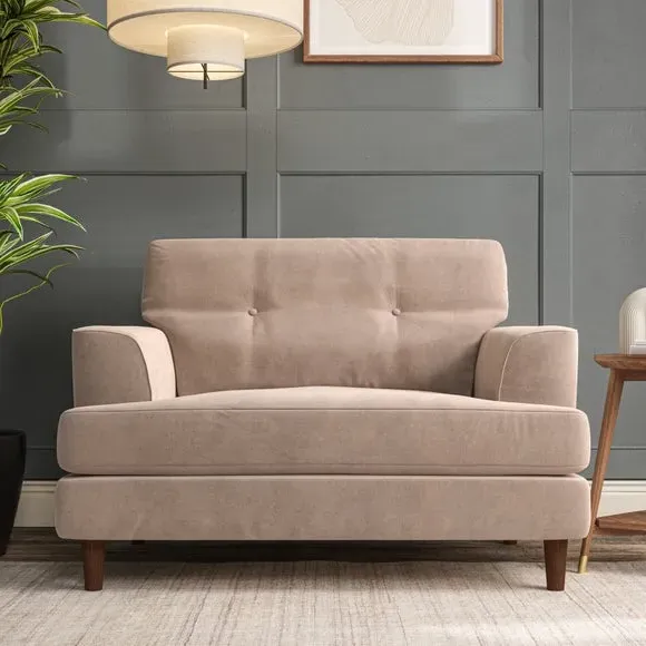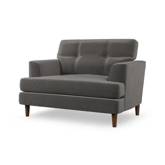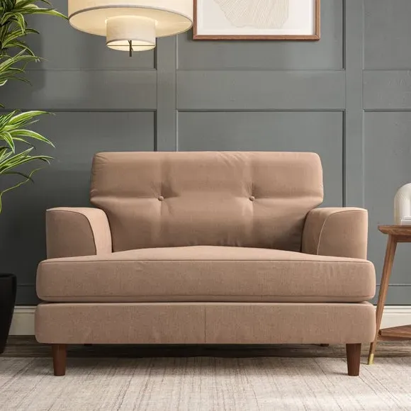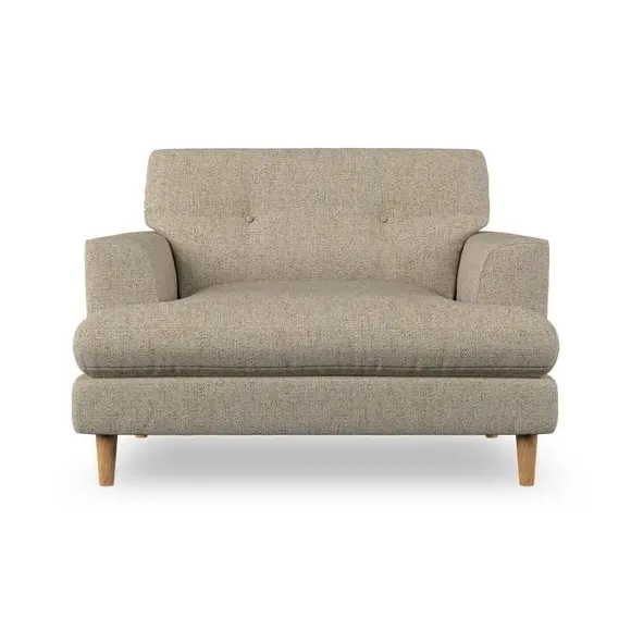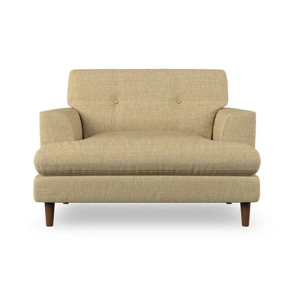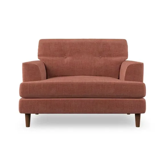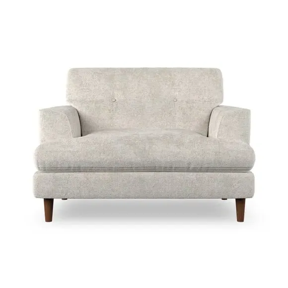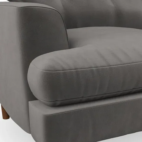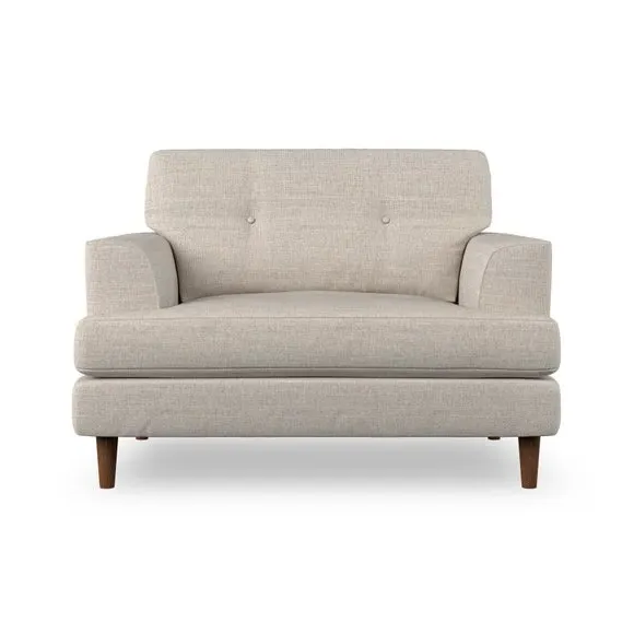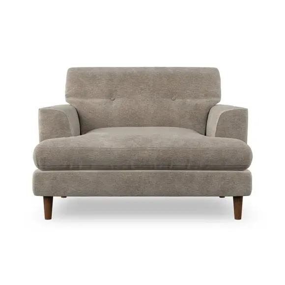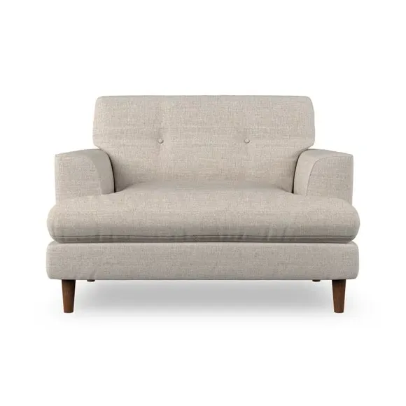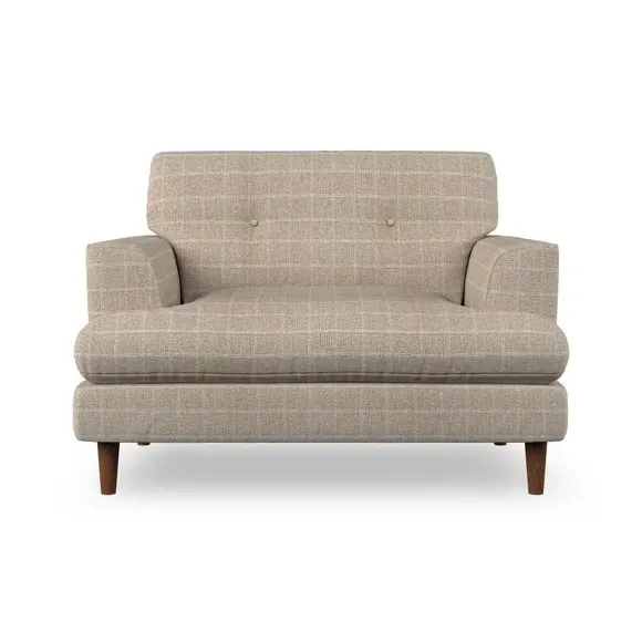 The snuggle chair combines compact luxury with Scandinavian-inspired design, featuring clean lines and elegant high legs. Its generous T-shaped seat cushion provides ample comfort, while the fibre-filled back cushion displays classic button-pull detailing. The customizable design allows you to choose your preferred fabric, leg finish, and cushion filling to match your space.
