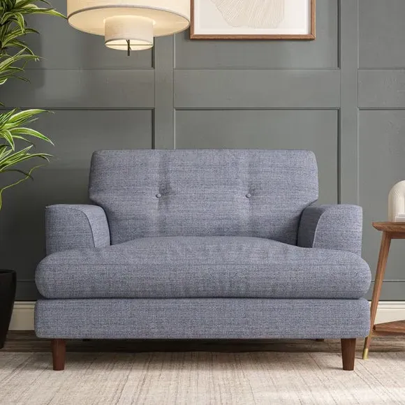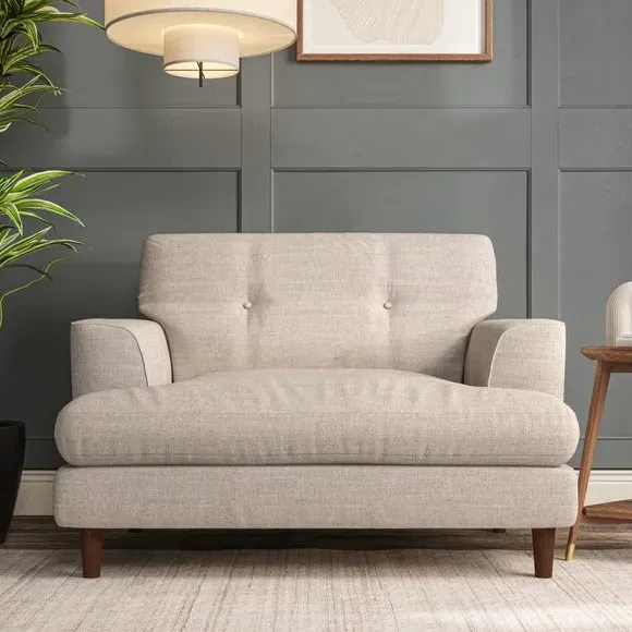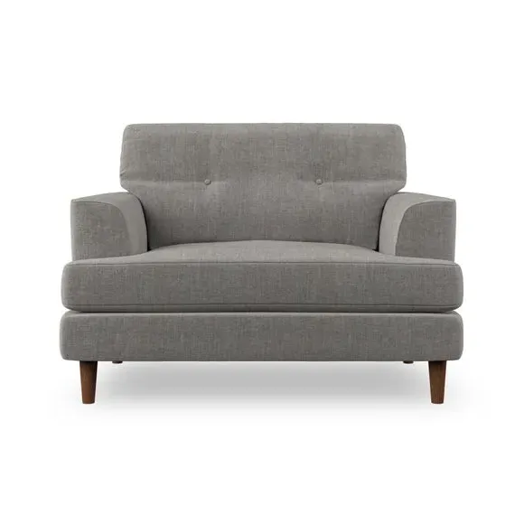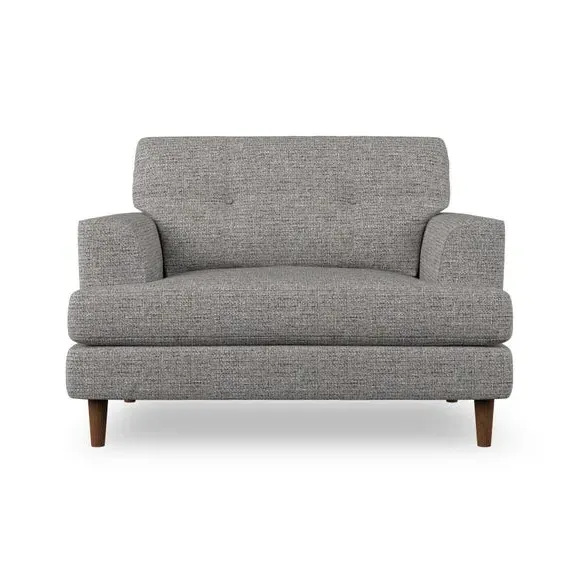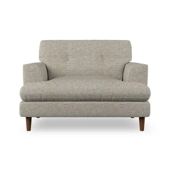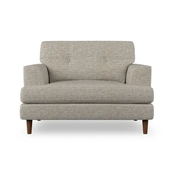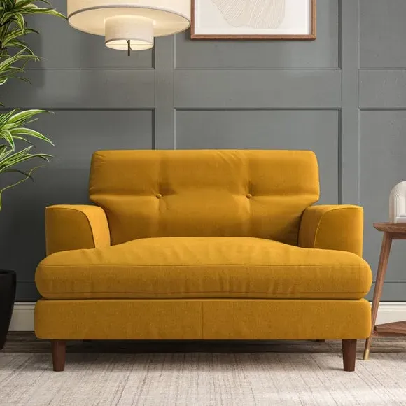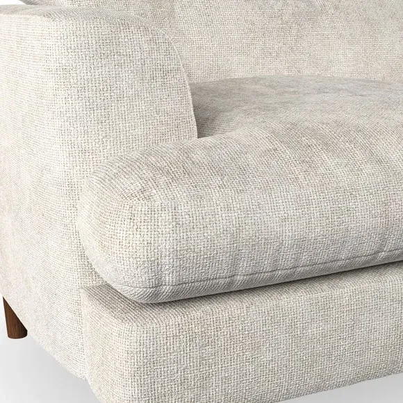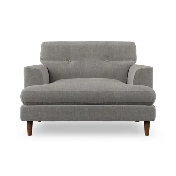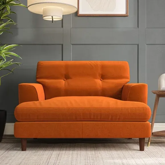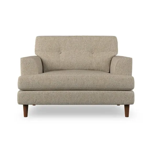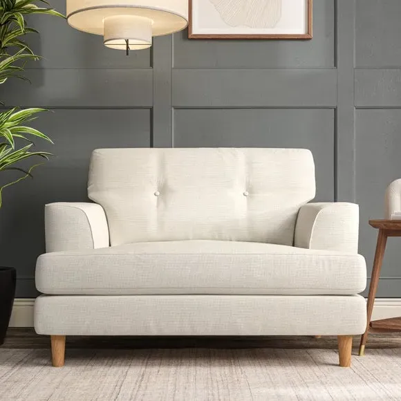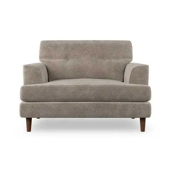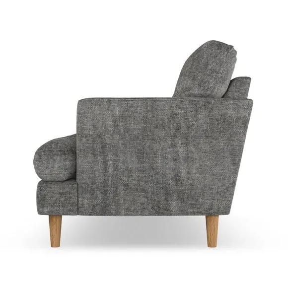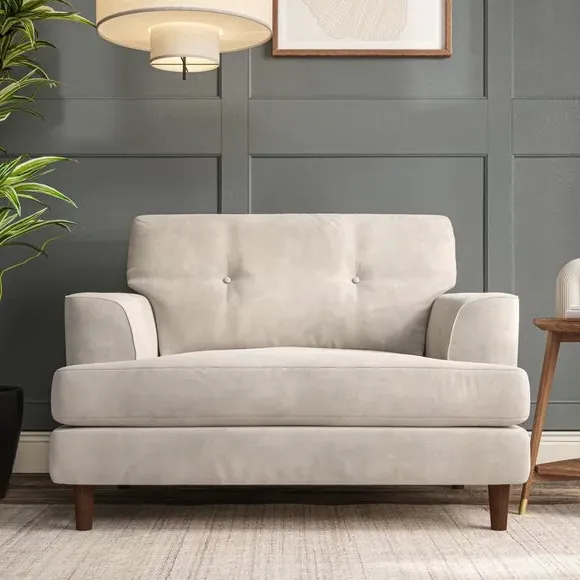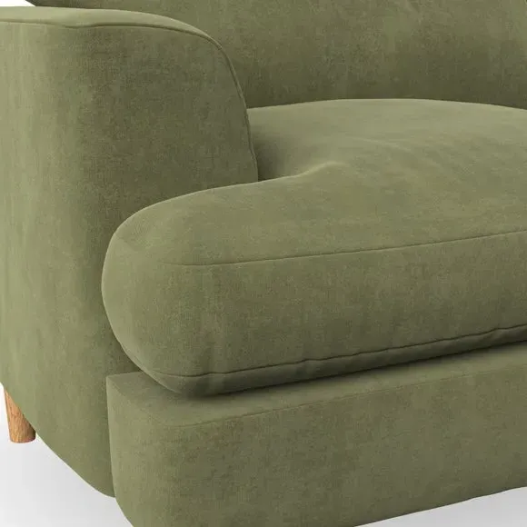 The snuggle chair combines compact luxury with Scandinavian-inspired design, featuring clean lines and elegant high legs. Its generous T-shaped seat cushion provides ample comfort, while the fibre-filled back cushion displays classic button-pull detailing. The customizable design allows you to choose your preferred fabric, leg finish, and cushion filling to match your space.