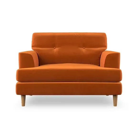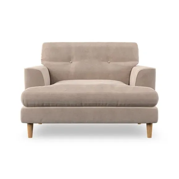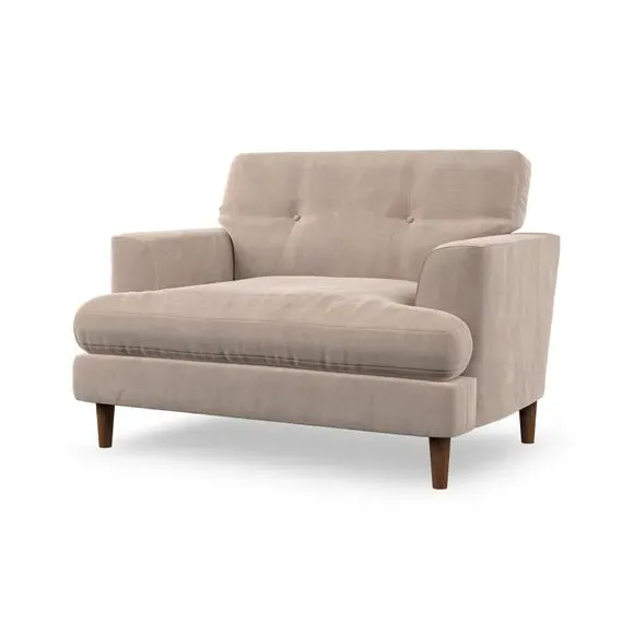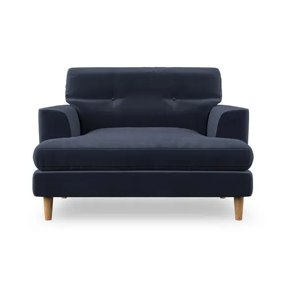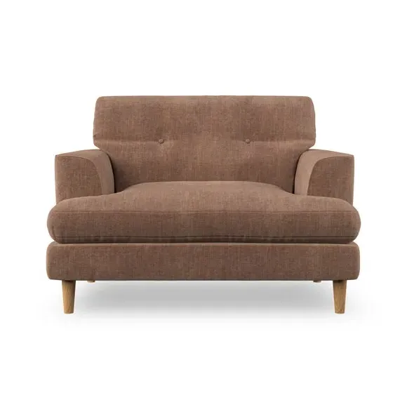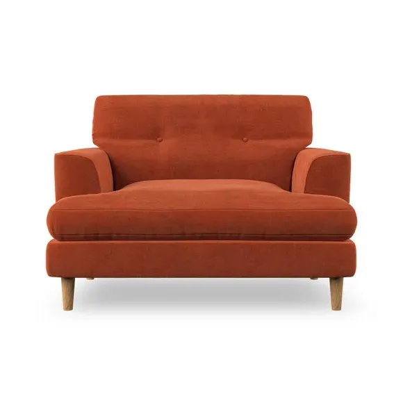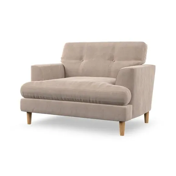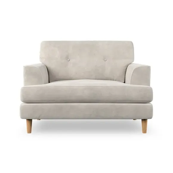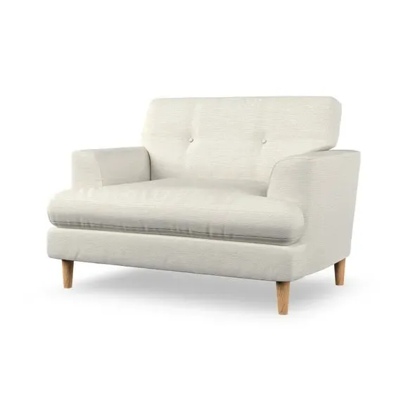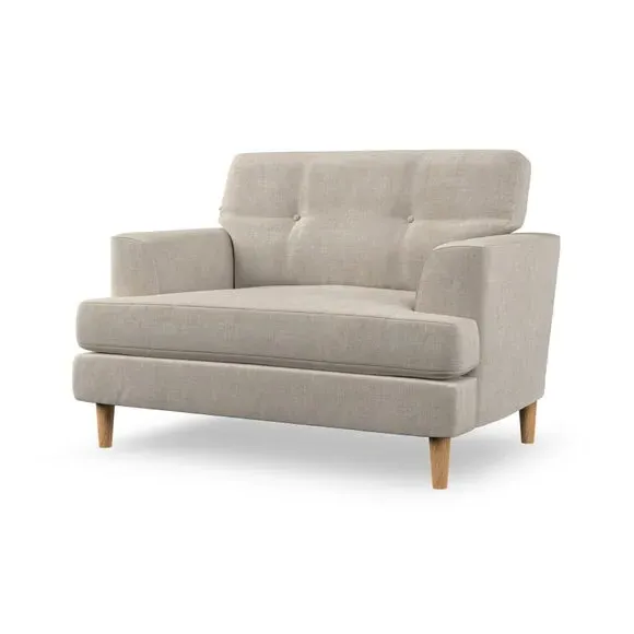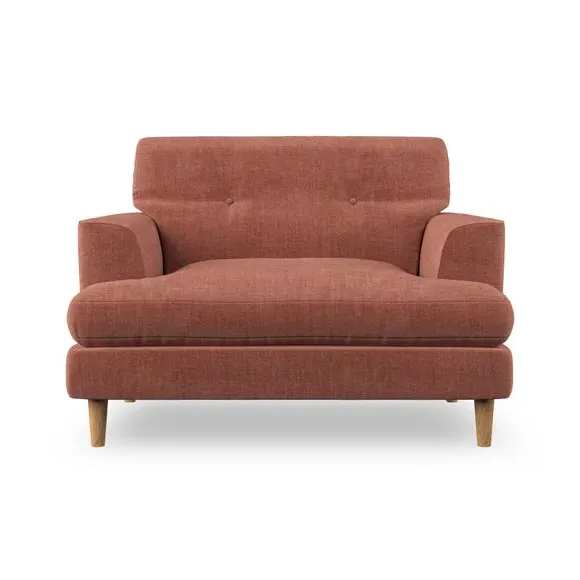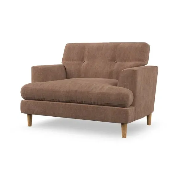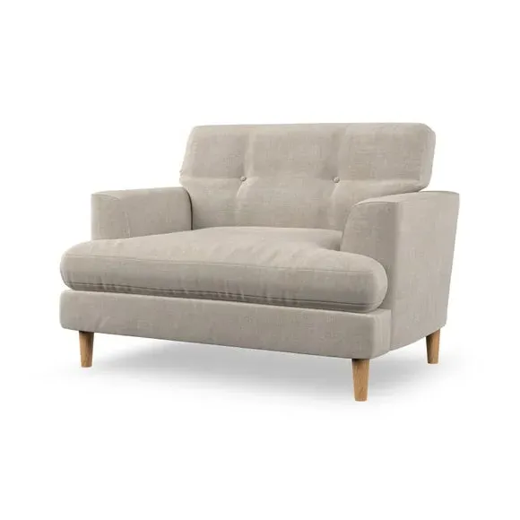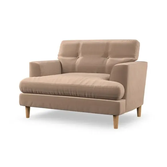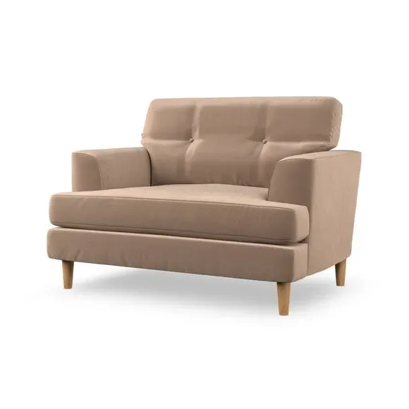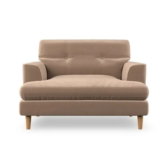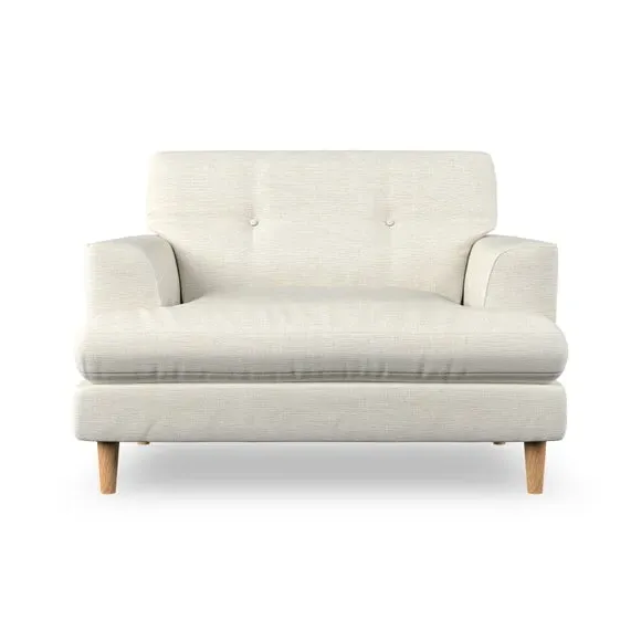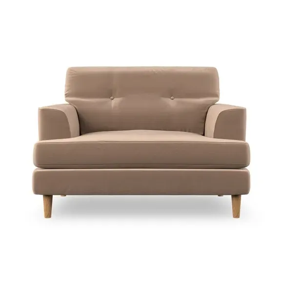 * Scandi inspired design* High legs* Button pull detailing* Choose the cushion filling, leg colour and fabric The Cooper Snuggle Chair is a compact yet luxurious seating option, perfect for creating a cosy retreat. Its Scandinavian-inspired design features clean lines, an elegant high leg, and a generous T-shaped seat cushion. The fibre-filled back cushion is adorned with classic button-pull detailing, ensuring both comfort and style. Customise this snug chair with your preferred fabric, leg finish, and cushion filling to suit your décor.