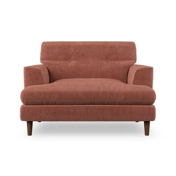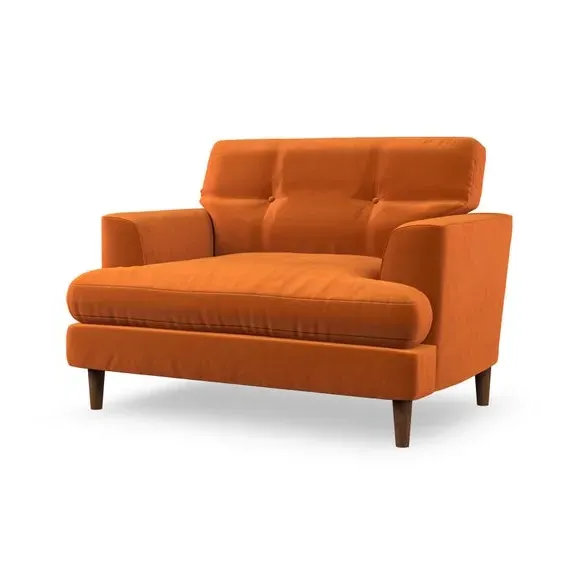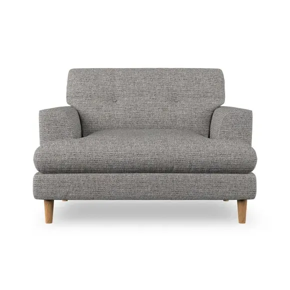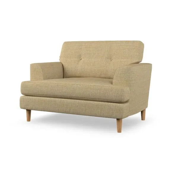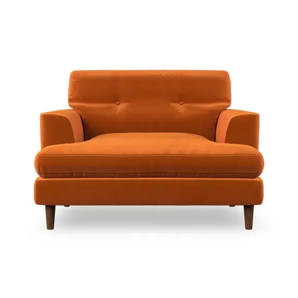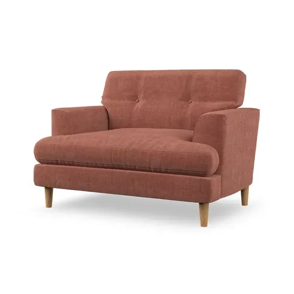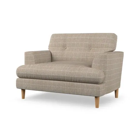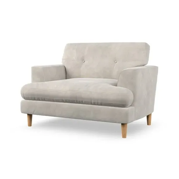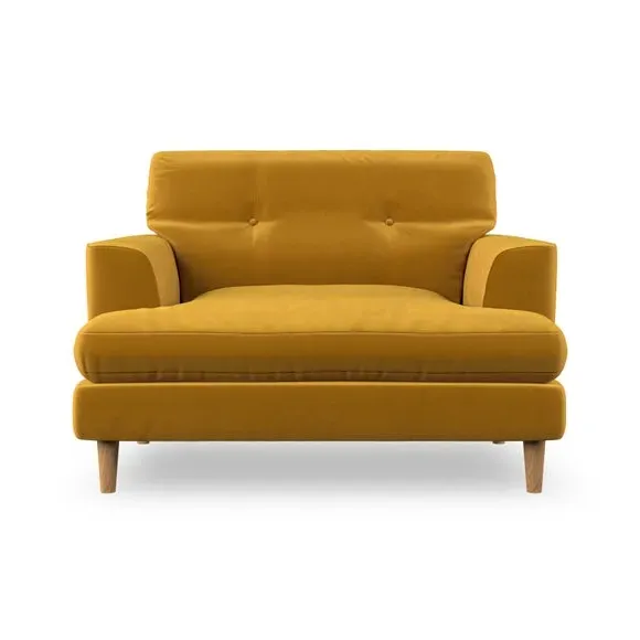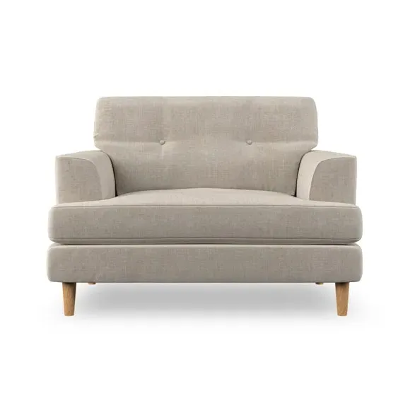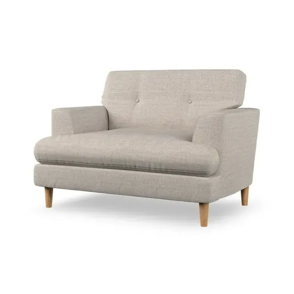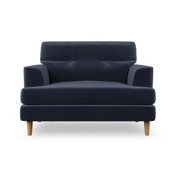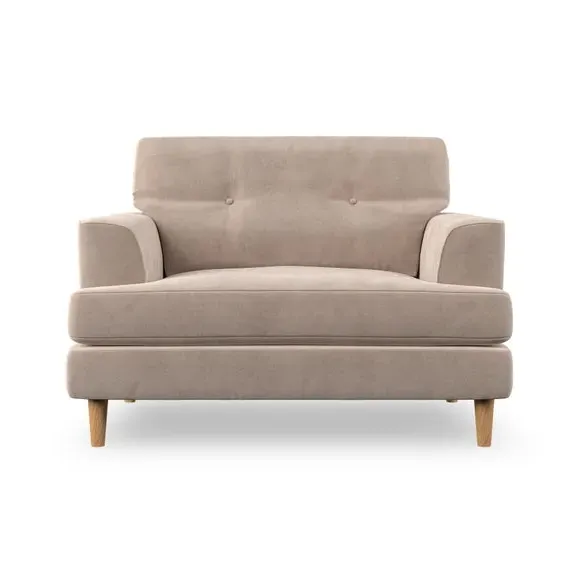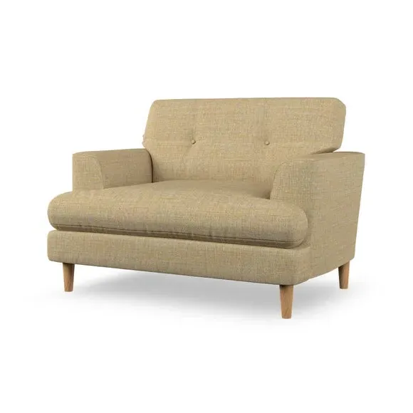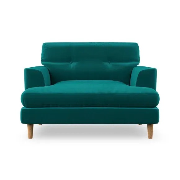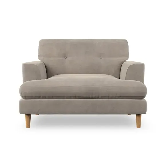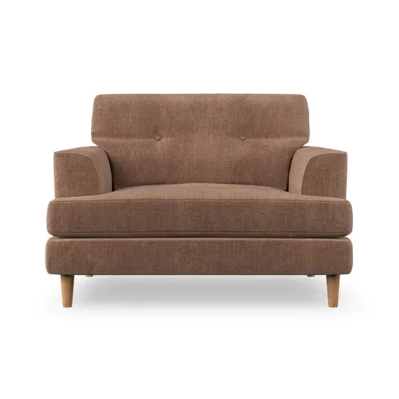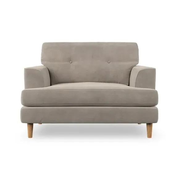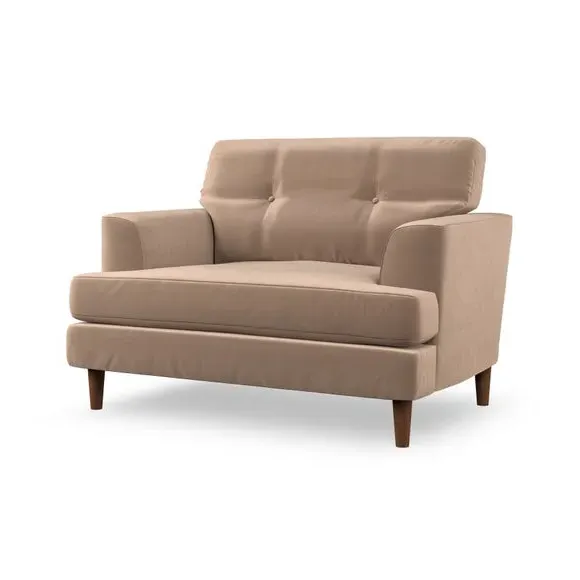 * Scandi inspired design* High legs* Button pull detailing* Choose the cushion filling, leg colour and fabric The Cooper Snuggle Chair is a compact yet luxurious seating option, perfect for creating a cosy retreat. Its Scandinavian-inspired design features clean lines, an elegant high leg, and a generous T-shaped seat cushion. The fibre-filled back cushion is adorned with classic button-pull detailing, ensuring both comfort and style. Customise this snug chair with your preferred fabric, leg finish, and cushion filling to suit your décor.