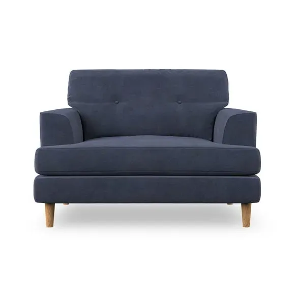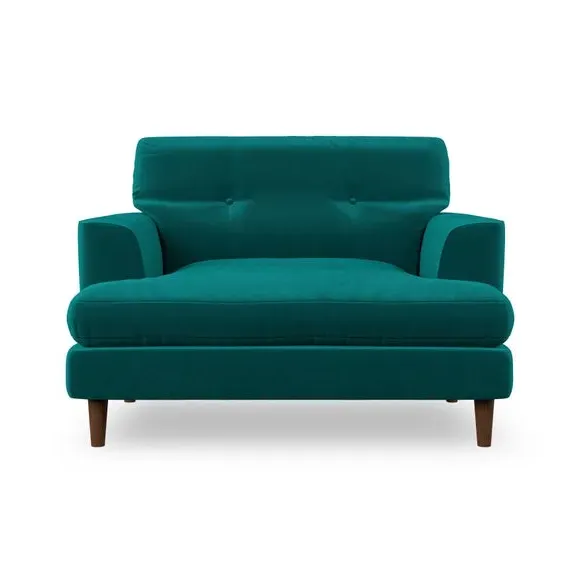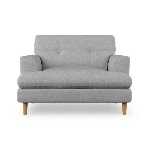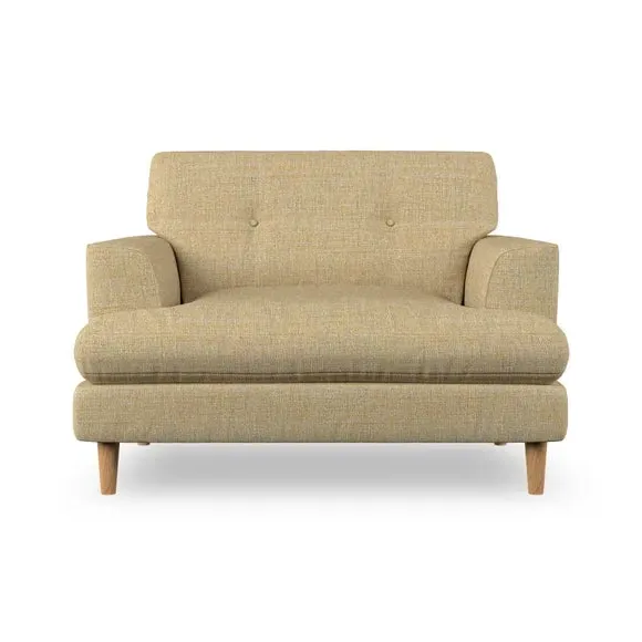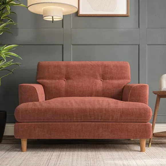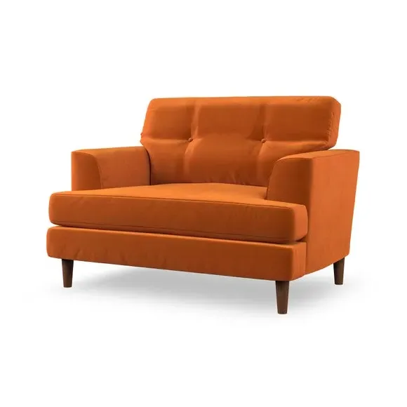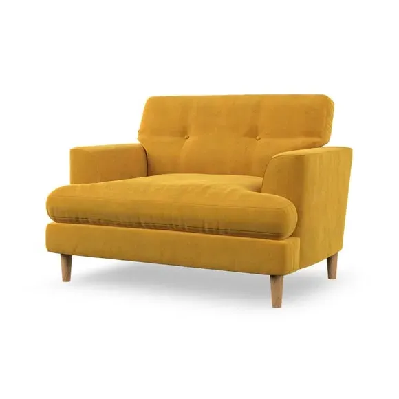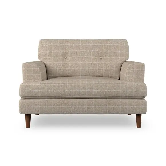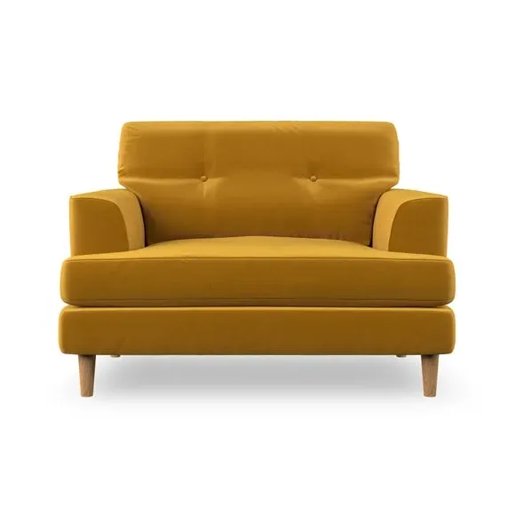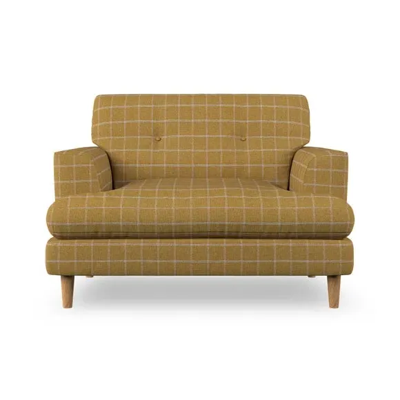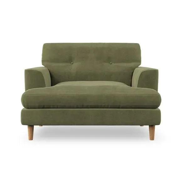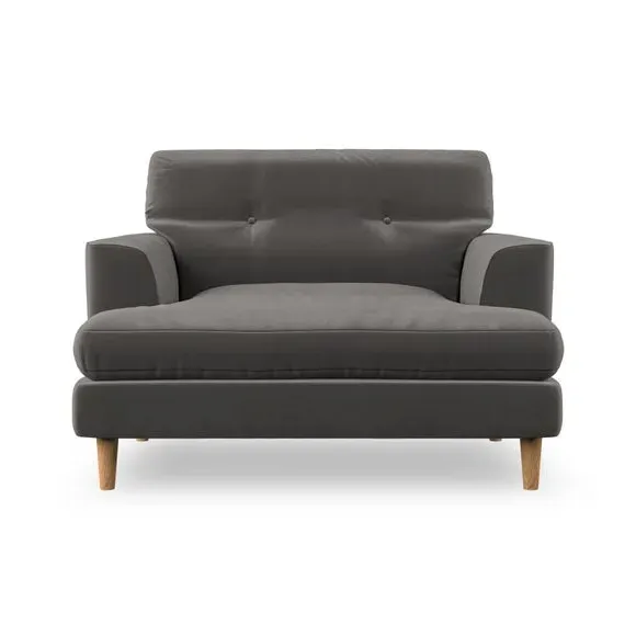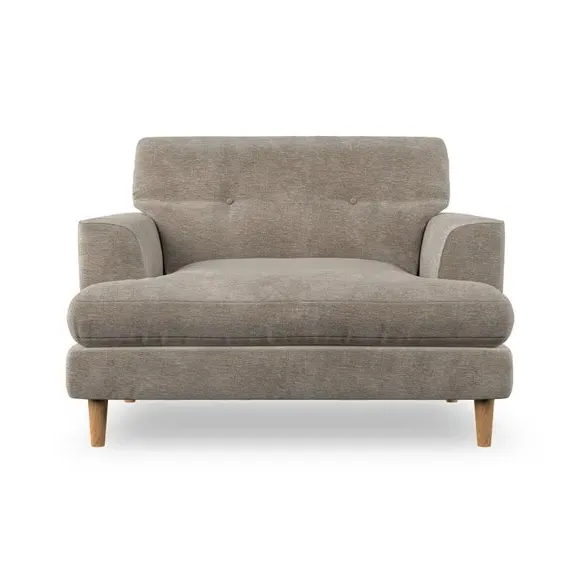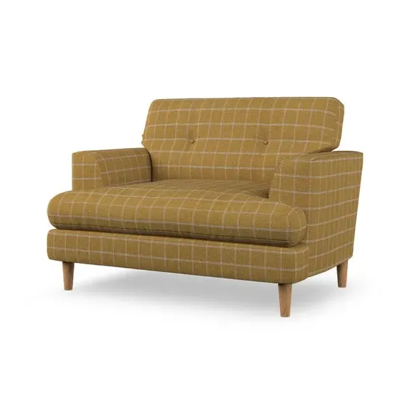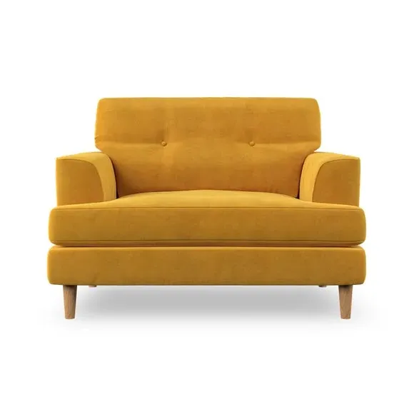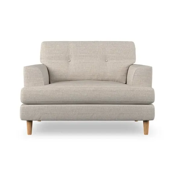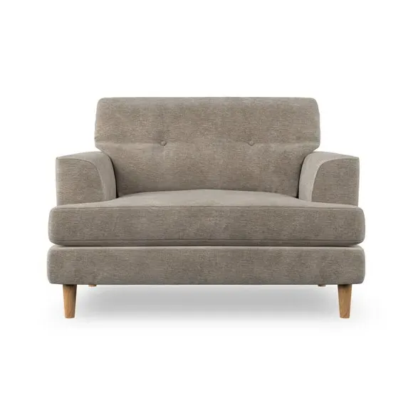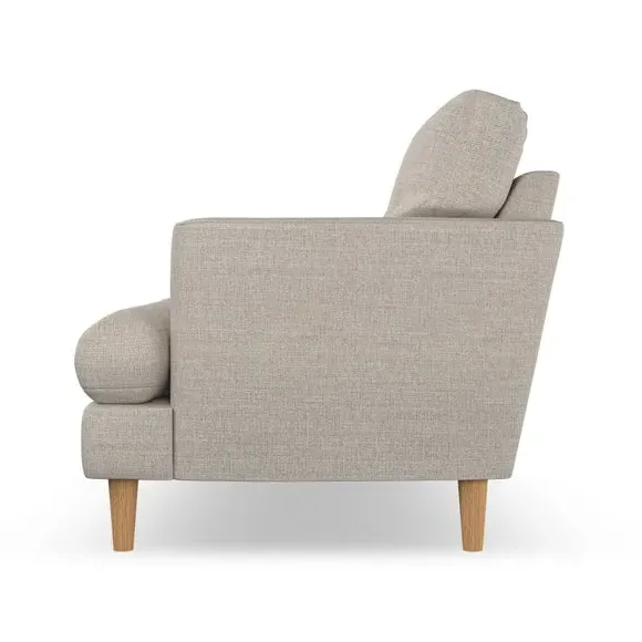 * Scandi inspired design* High legs* Button pull detailing* Choose the cushion filling, leg colour and fabric The Cooper Snuggle Chair is a compact yet luxurious seating option, perfect for creating a cosy retreat. Its Scandinavian-inspired design features clean lines, an elegant high leg, and a generous T-shaped seat cushion. The fibre-filled back cushion is adorned with classic button-pull detailing, ensuring both comfort and style. Customise this snug chair with your preferred fabric, leg finish, and cushion filling to suit your décor.