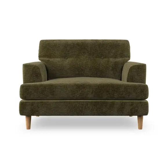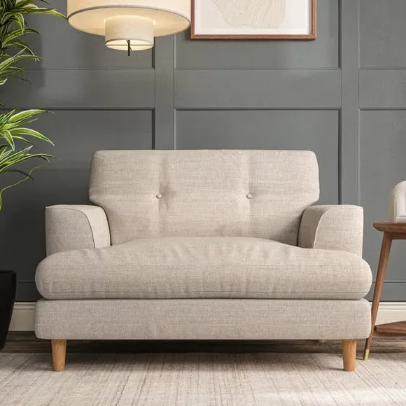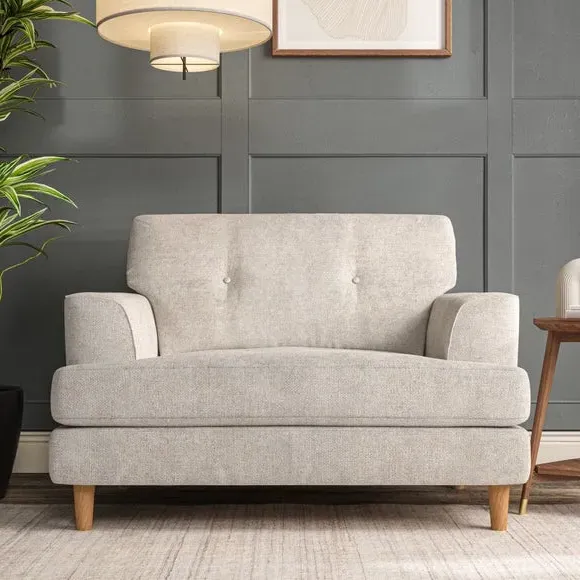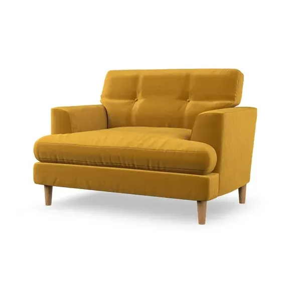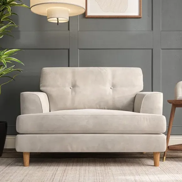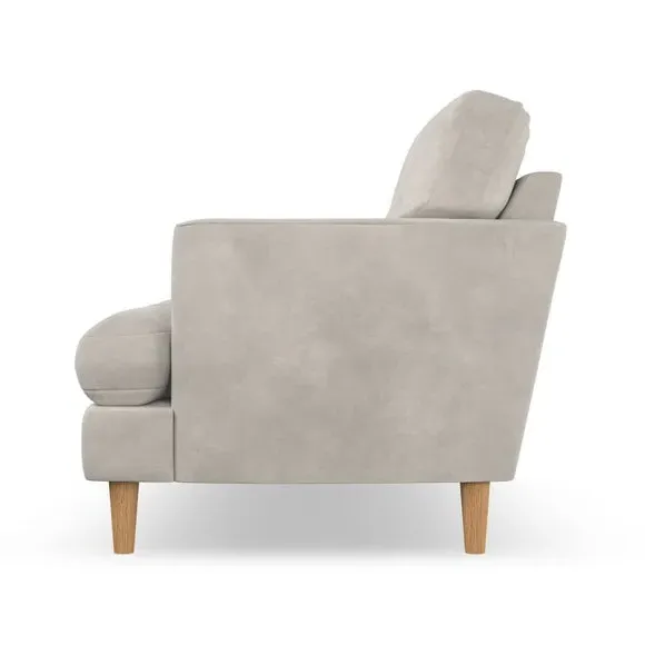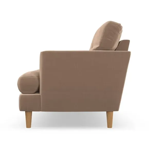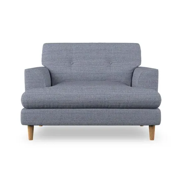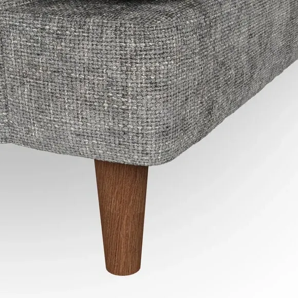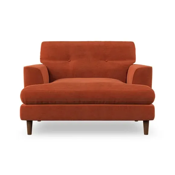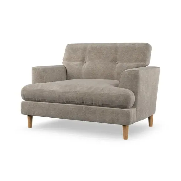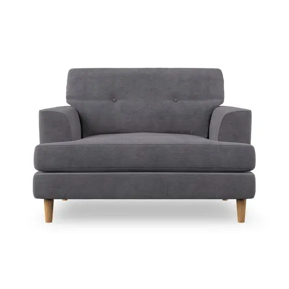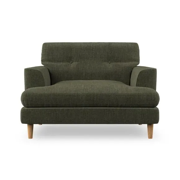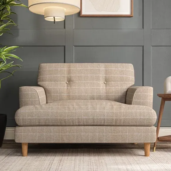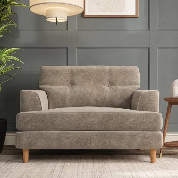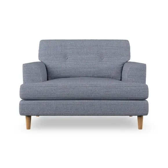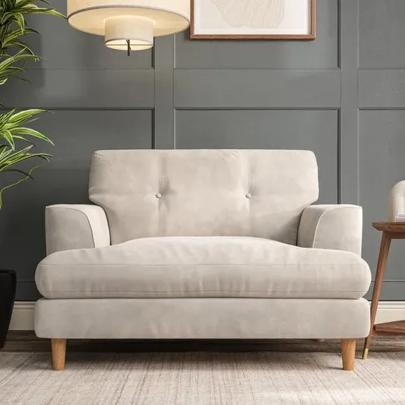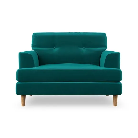 * Scandi inspired design* High legs* Button pull detailing* Choose the cushion filling, leg colour and fabric The Cooper Snuggle Chair is a compact yet luxurious seating option, perfect for creating a cosy retreat. Its Scandinavian-inspired design features clean lines, an elegant high leg, and a generous T-shaped seat cushion. The fibre-filled back cushion is adorned with classic button-pull detailing, ensuring both comfort and style. Customise this snug chair with your preferred fabric, leg finish, and cushion filling to suit your décor.