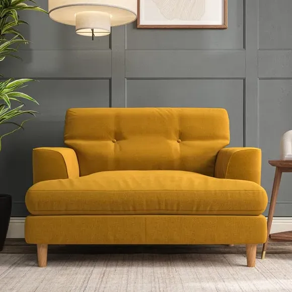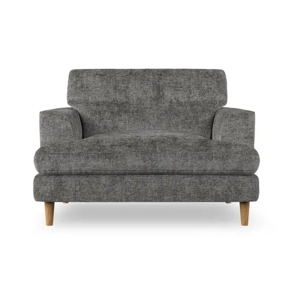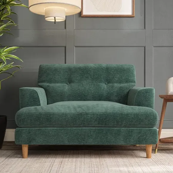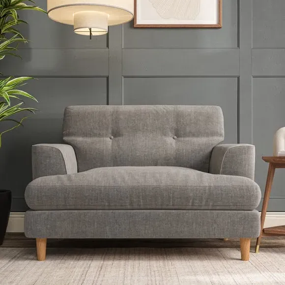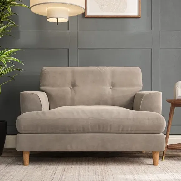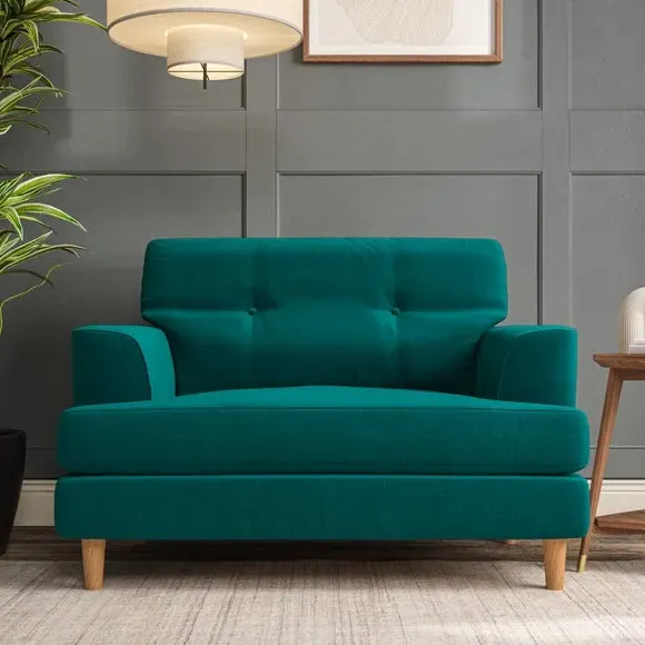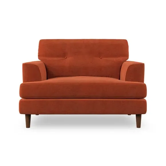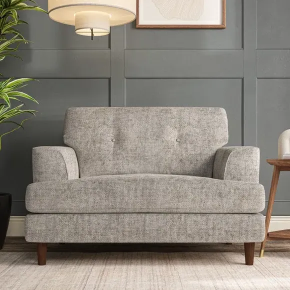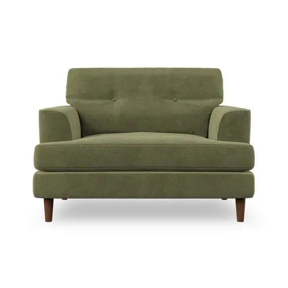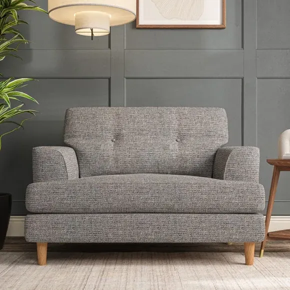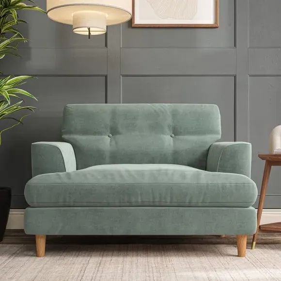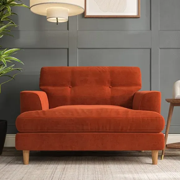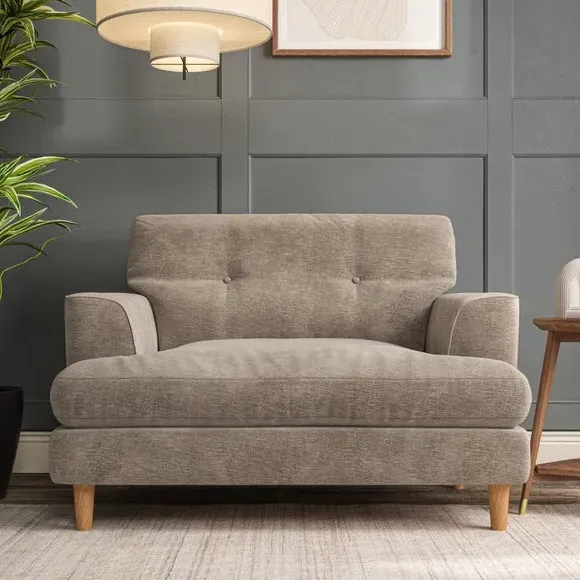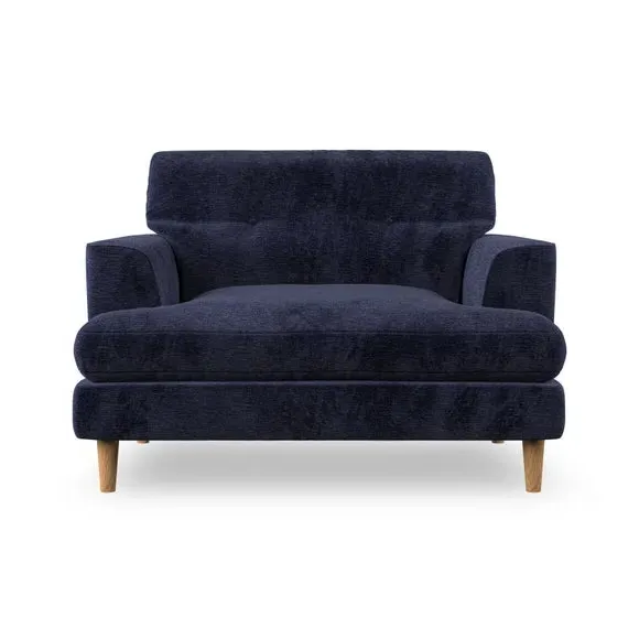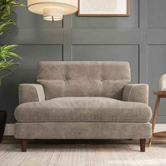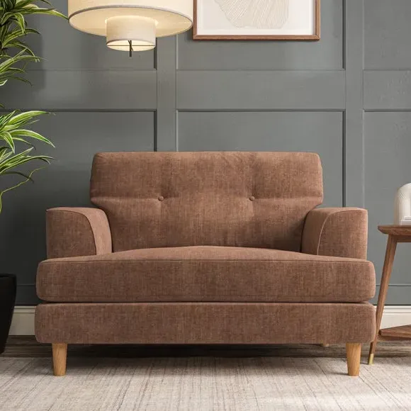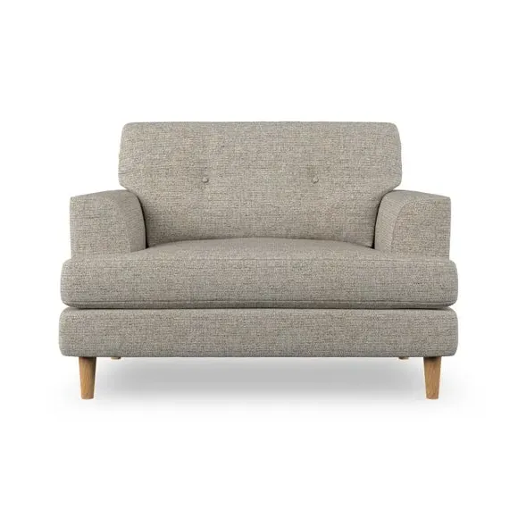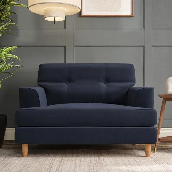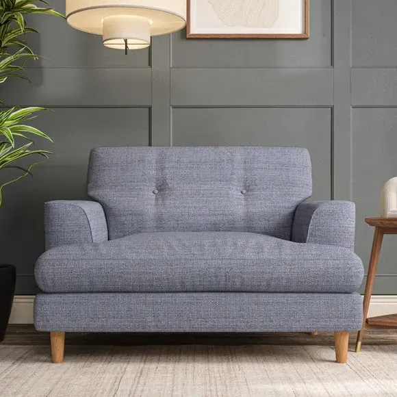 * Scandi inspired design* High legs* Button pull detailing* Choose the cushion filling, leg colour and fabric The Cooper Snuggle Chair is a compact yet luxurious seating option, perfect for creating a cosy retreat. Its Scandinavian-inspired design features clean lines, an elegant high leg, and a generous T-shaped seat cushion. The fibre-filled back cushion is adorned with classic button-pull detailing, ensuring both comfort and style. Customise this snug chair with your preferred fabric, leg finish, and cushion filling to suit your décor.