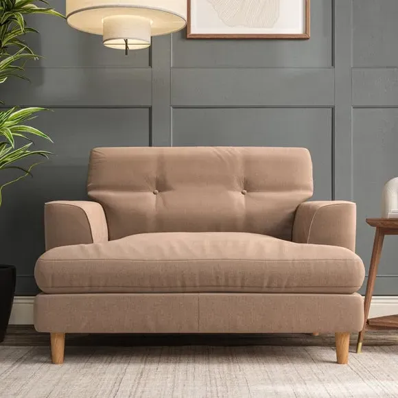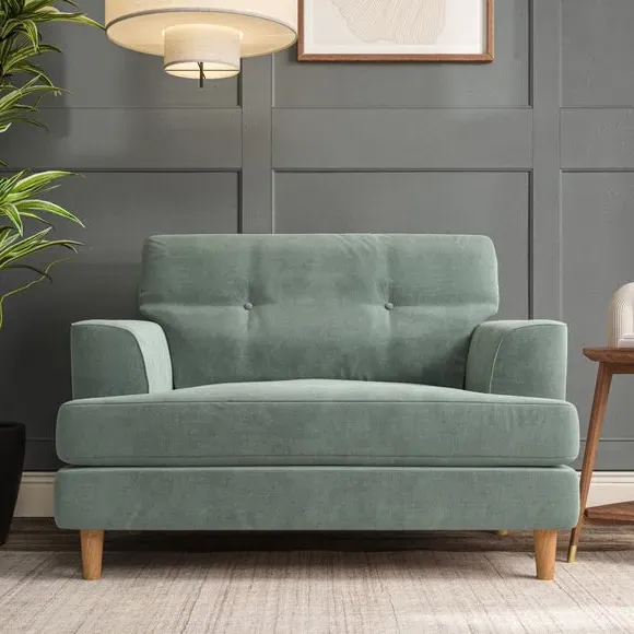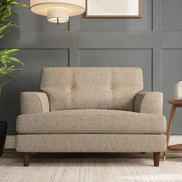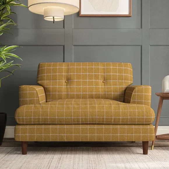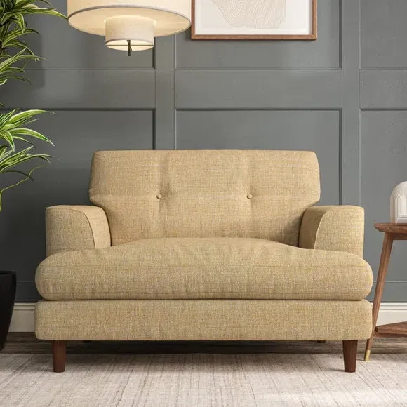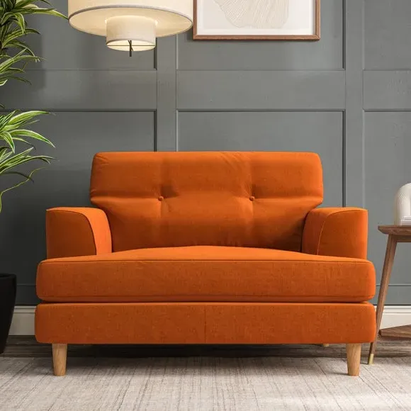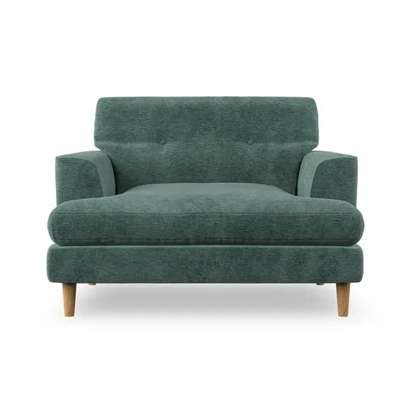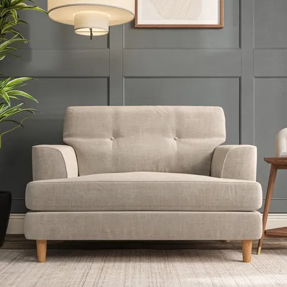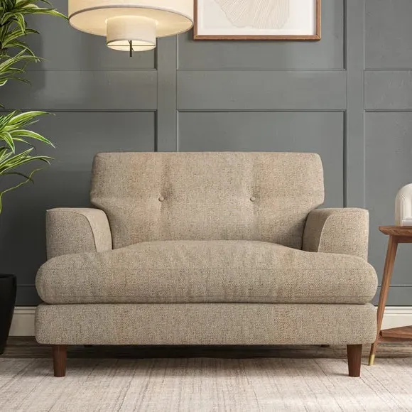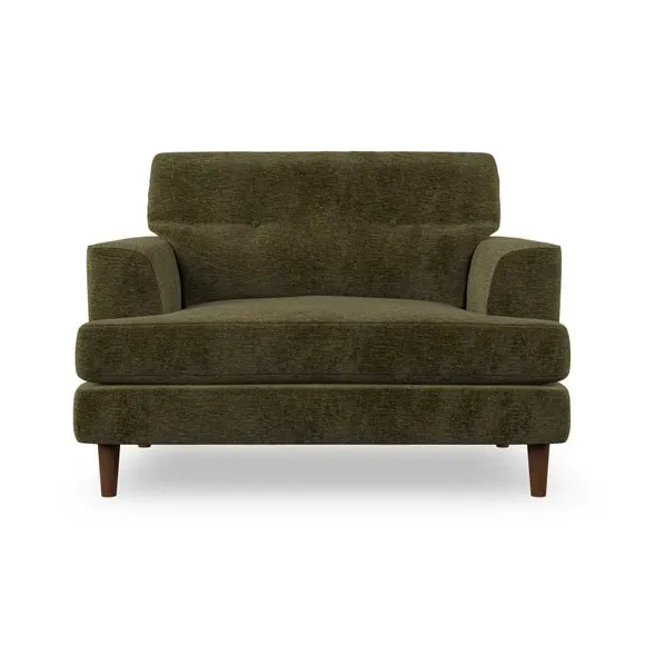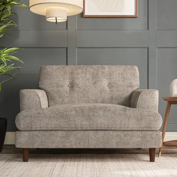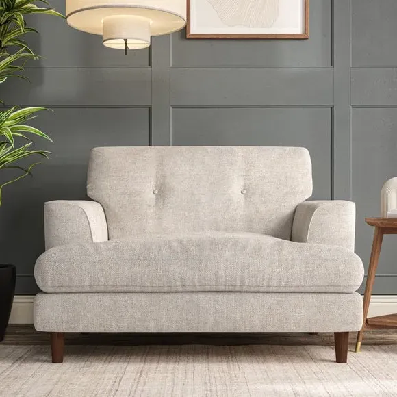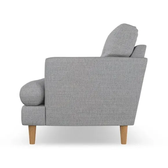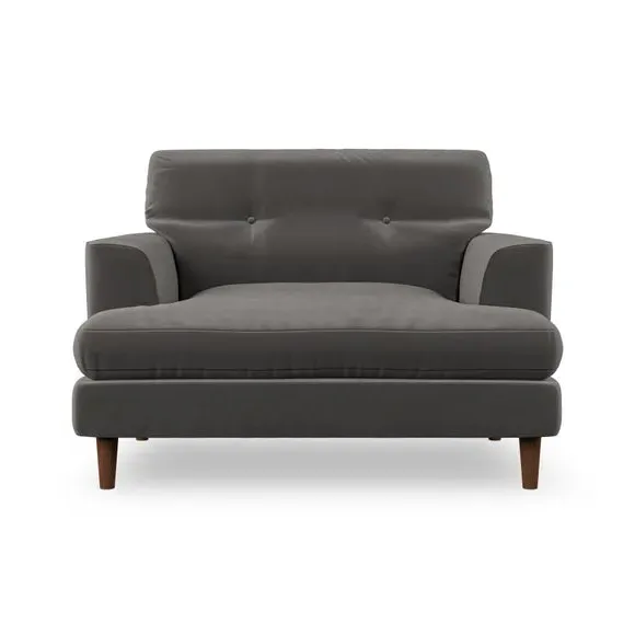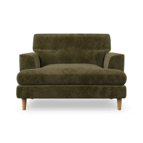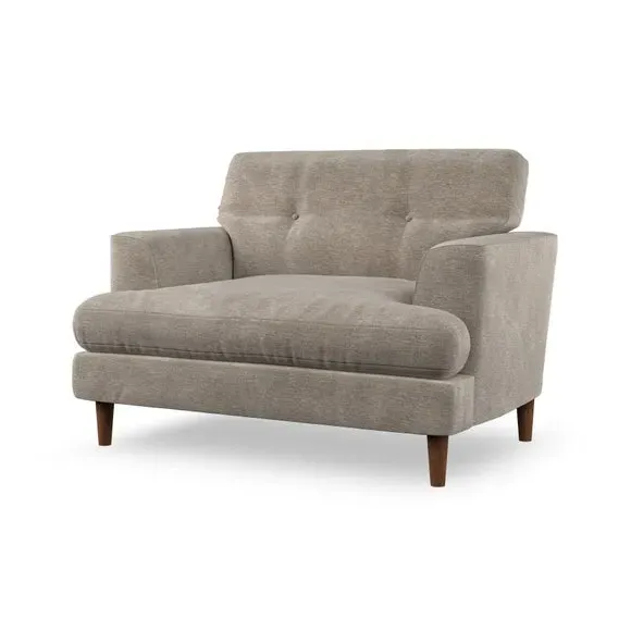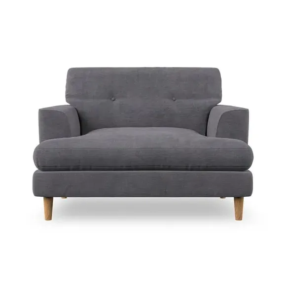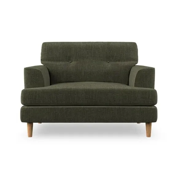 * Scandi inspired design* High legs* Button pull detailing* Choose the cushion filling, leg colour and fabric The Cooper Snuggle Chair is a compact yet luxurious seating option, perfect for creating a cosy retreat. Its Scandinavian-inspired design features clean lines, an elegant high leg, and a generous T-shaped seat cushion. The fibre-filled back cushion is adorned with classic button-pull detailing, ensuring both comfort and style. Customise this snug chair with your preferred fabric, leg finish, and cushion filling to suit your décor.