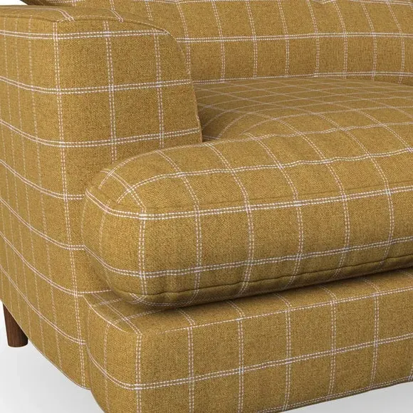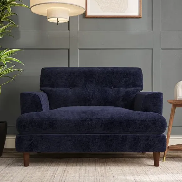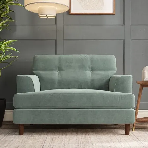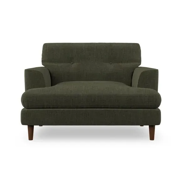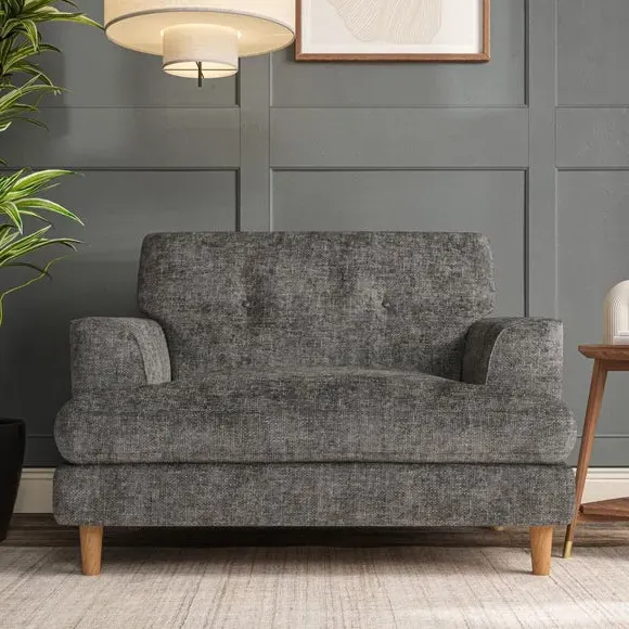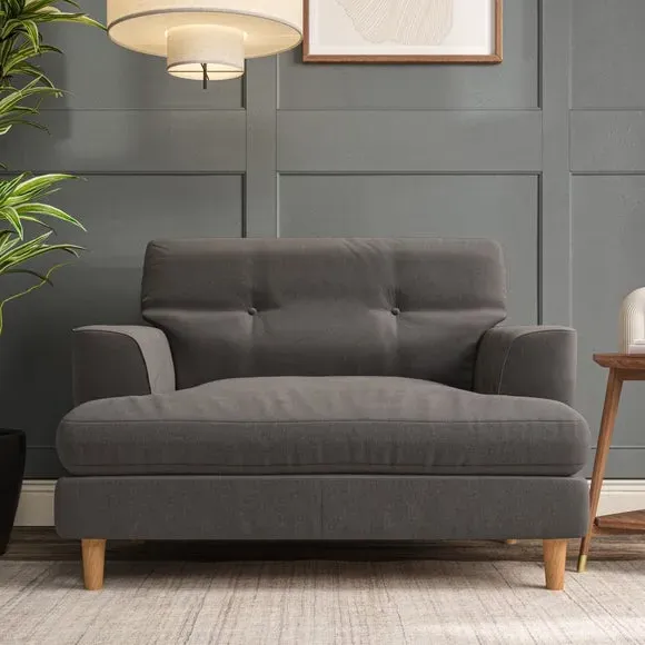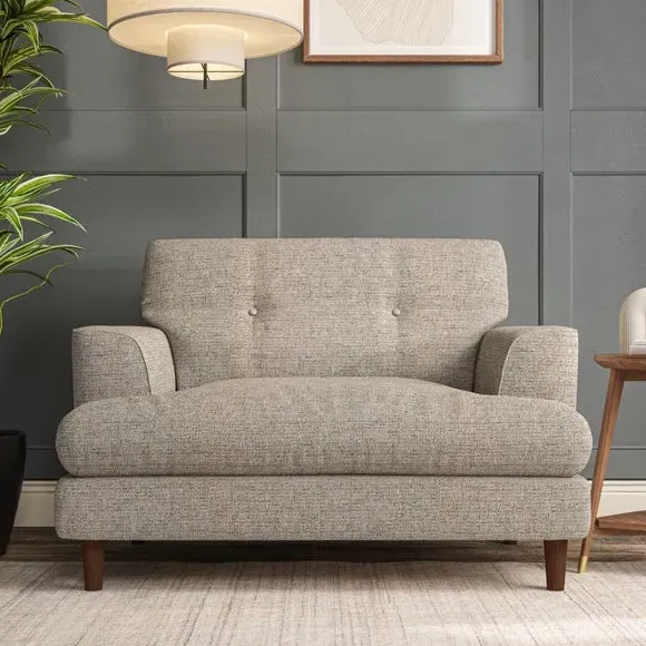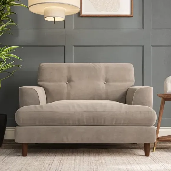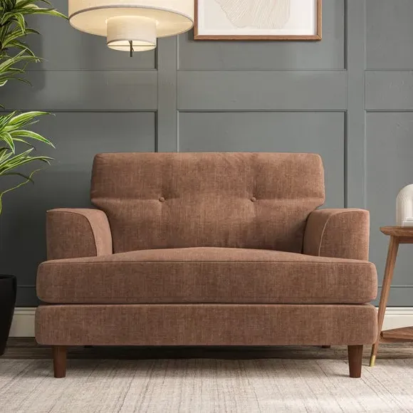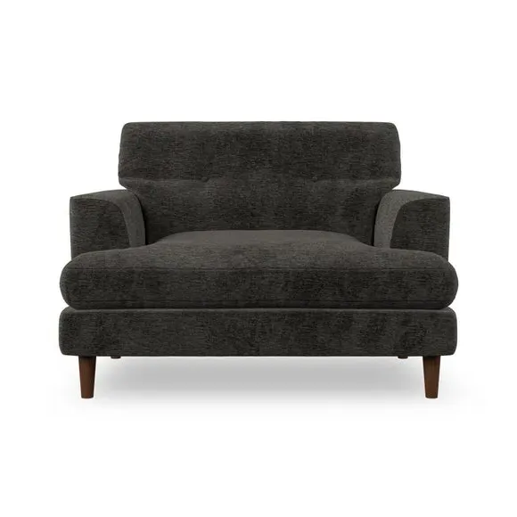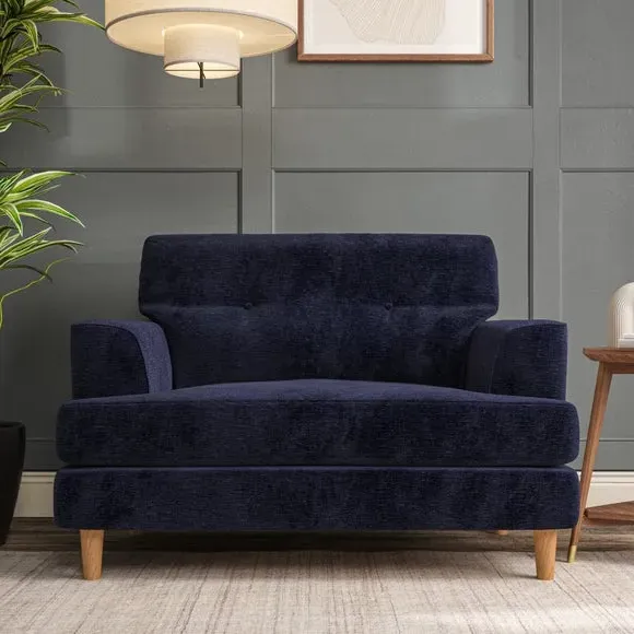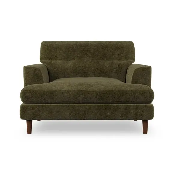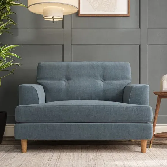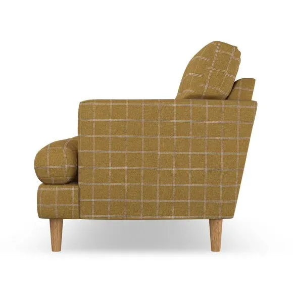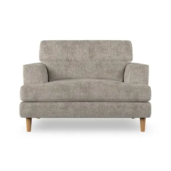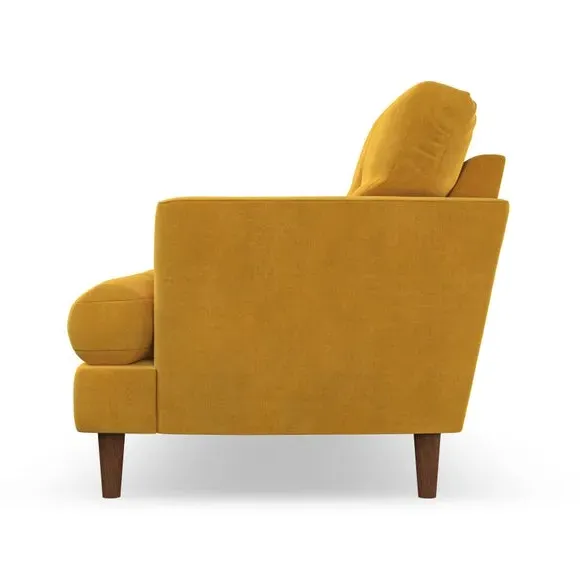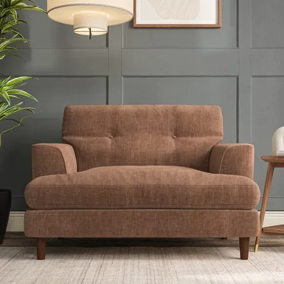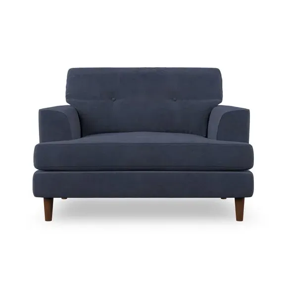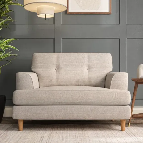 * Scandi inspired design* High legs* Button pull detailing* Choose the cushion filling, leg colour and fabric The Cooper Snuggle Chair is a compact yet luxurious seating option, perfect for creating a cosy retreat. Its Scandinavian-inspired design features clean lines, an elegant high leg, and a generous T-shaped seat cushion. The fibre-filled back cushion is adorned with classic button-pull detailing, ensuring both comfort and style. Customise this snug chair with your preferred fabric, leg finish, and cushion filling to suit your décor.