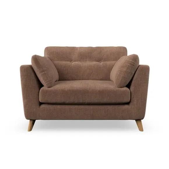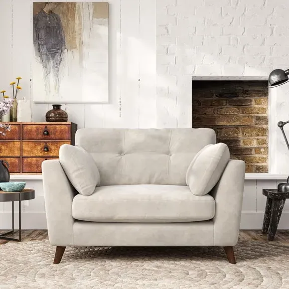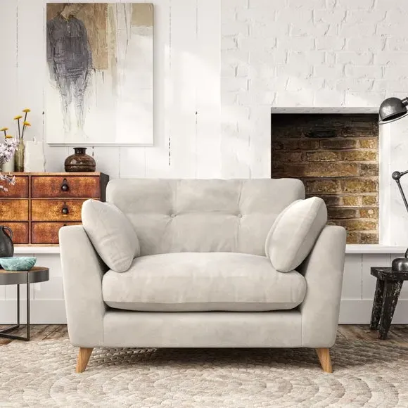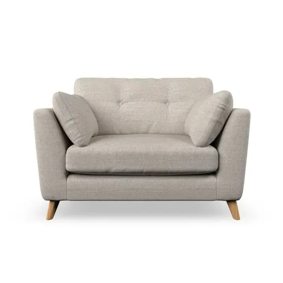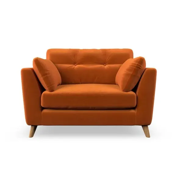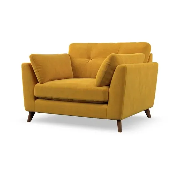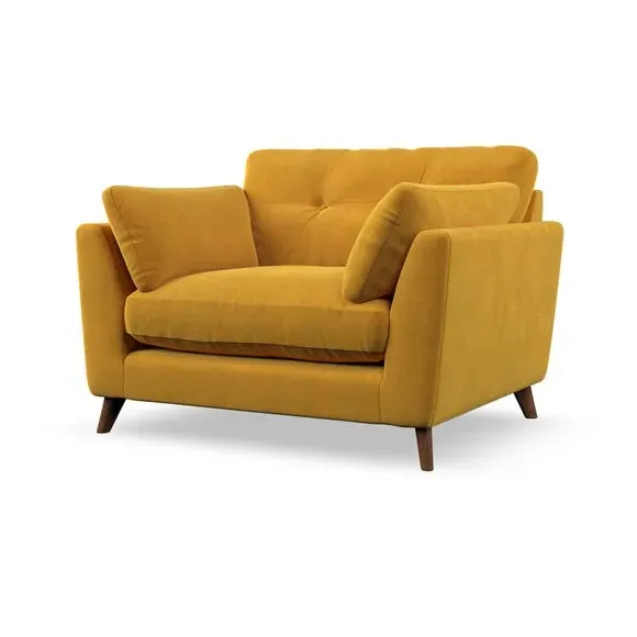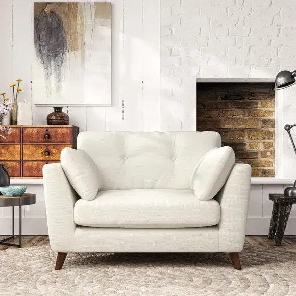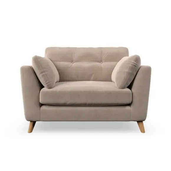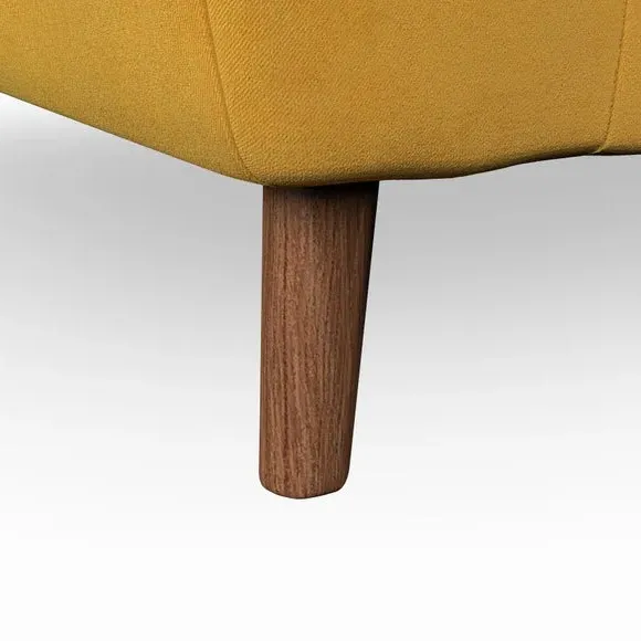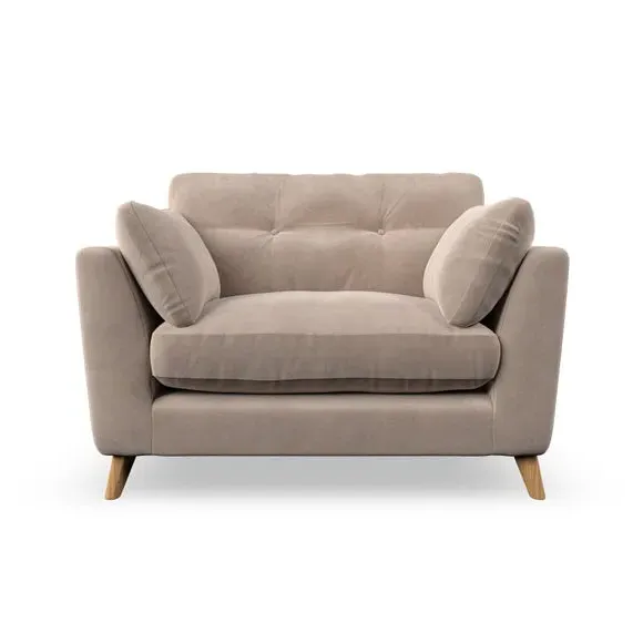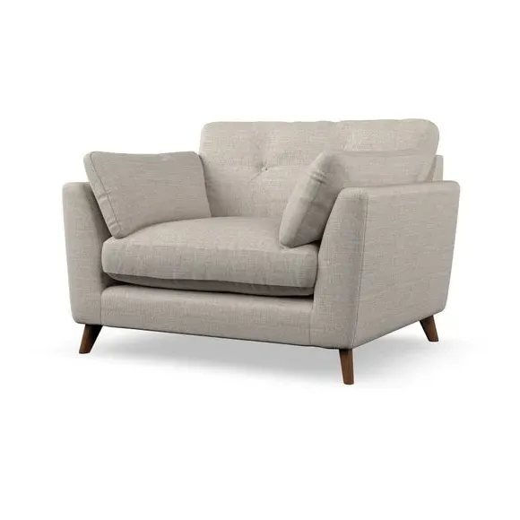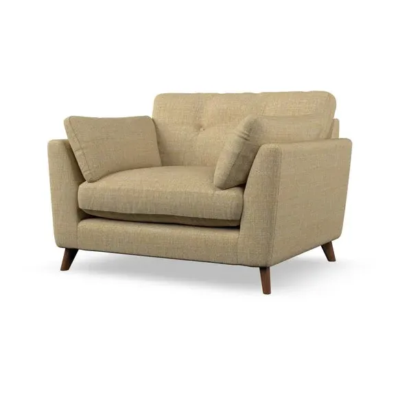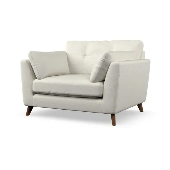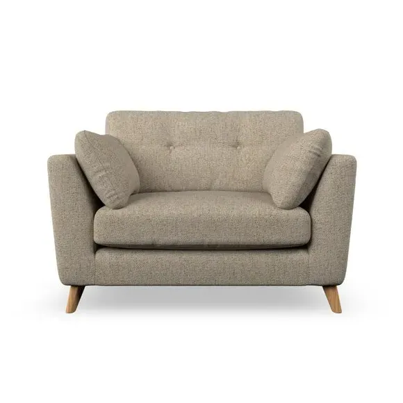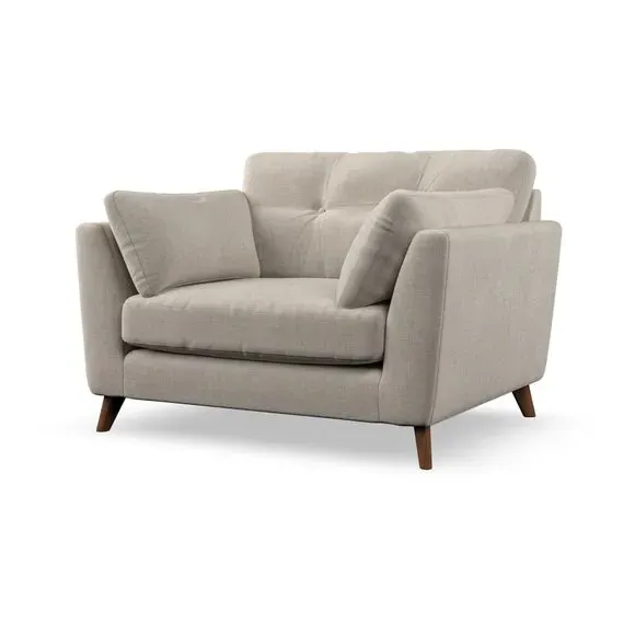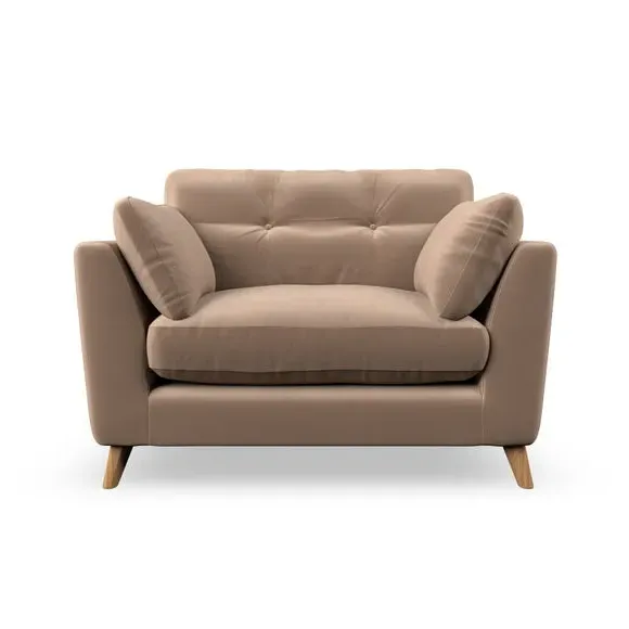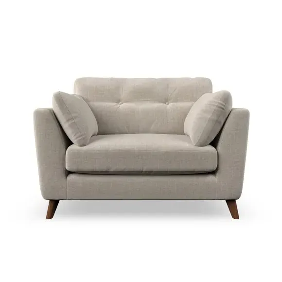 The snuggle chair combines mid-century style with plush pillow top arms for enhanced comfort. Its button pull details on the back cushions add refined character, while the supportive construction ensures lasting durability. The customizable design allows selection of fabric type, leg colour, and cushion filling to suit individual preferences.