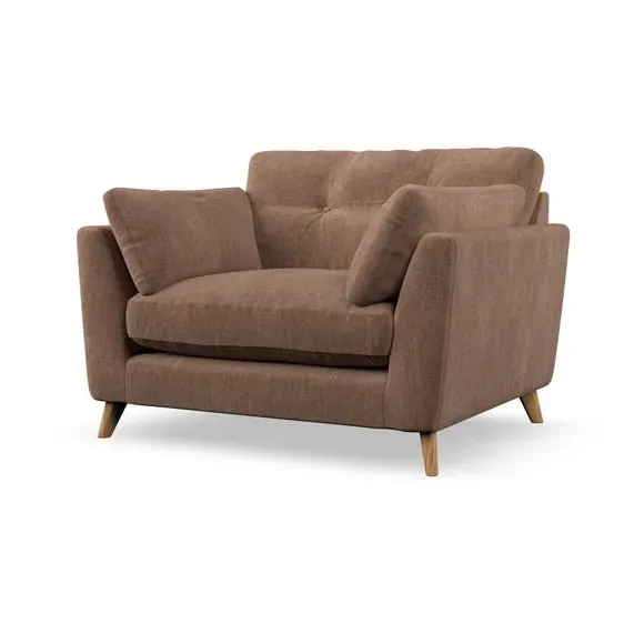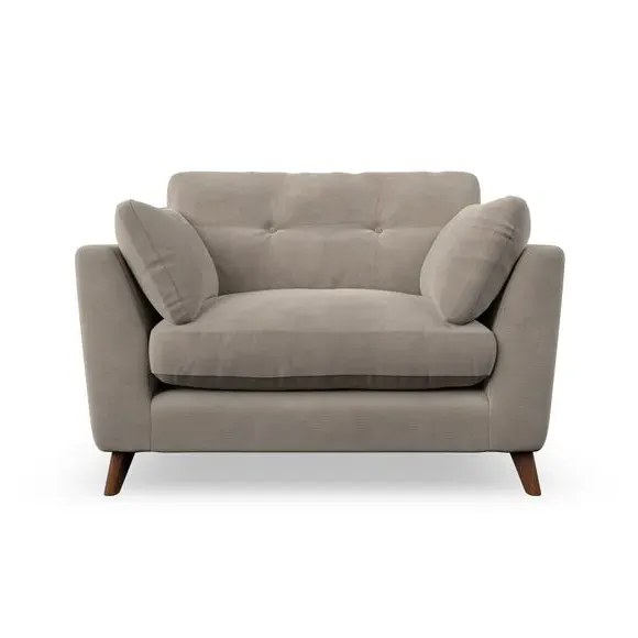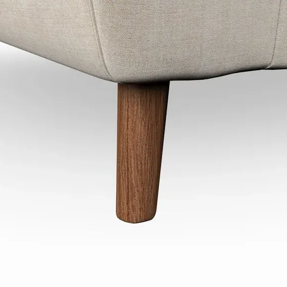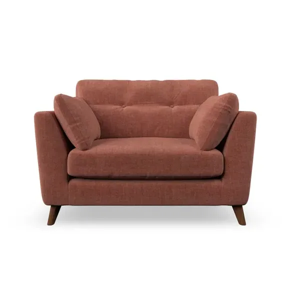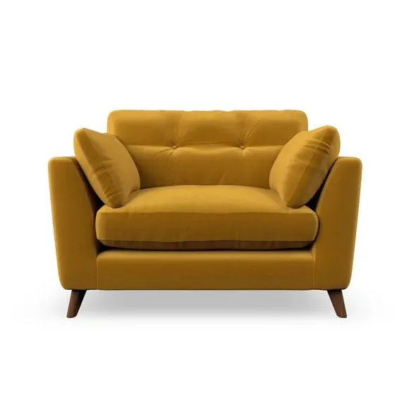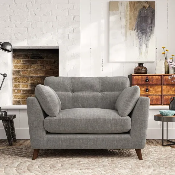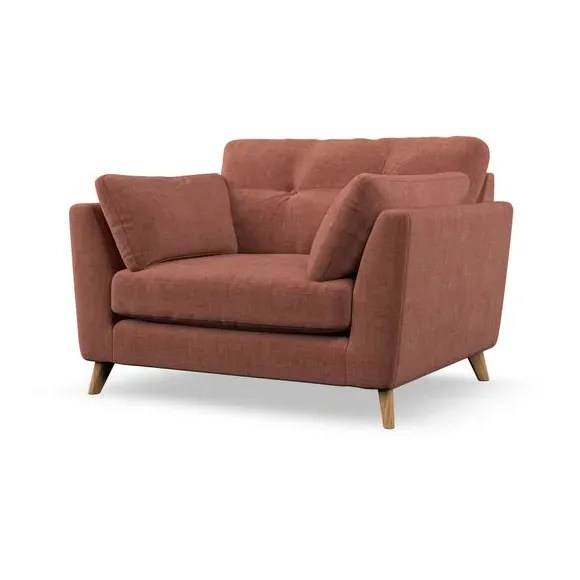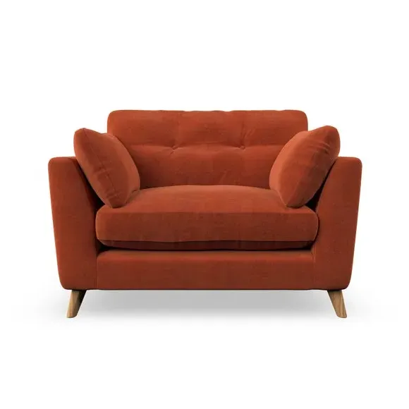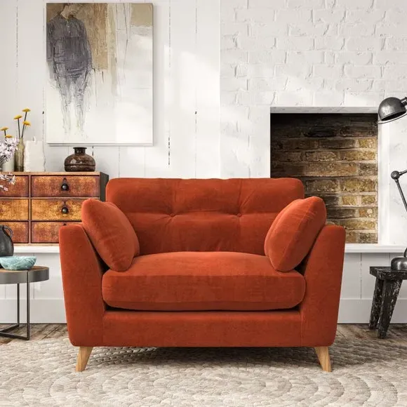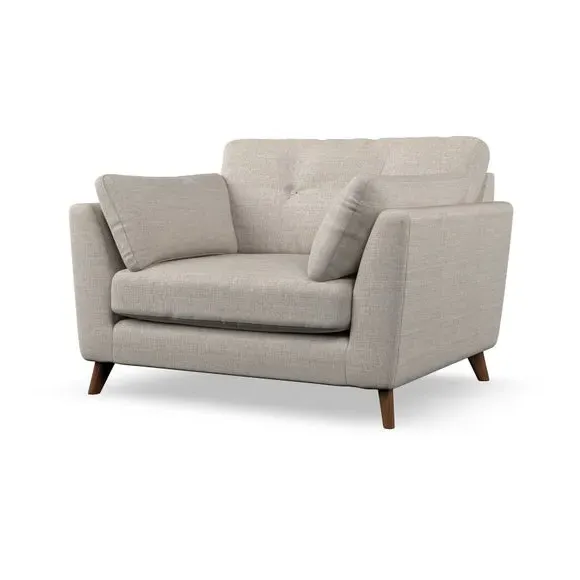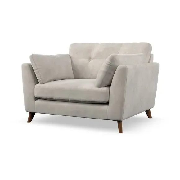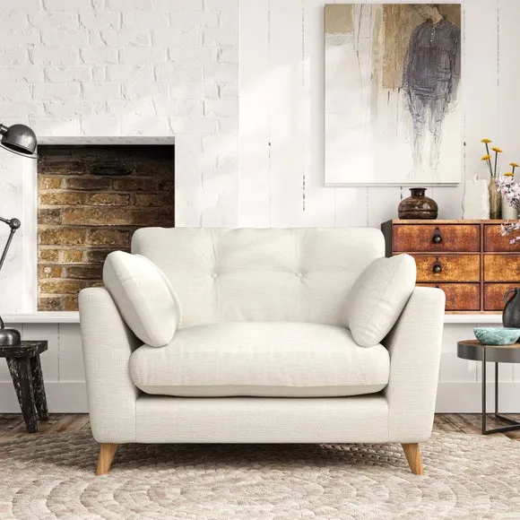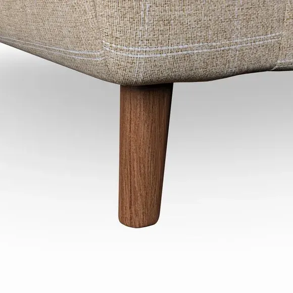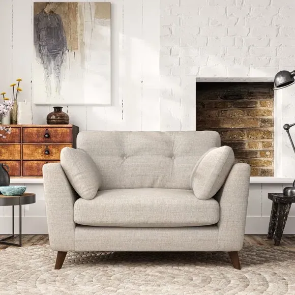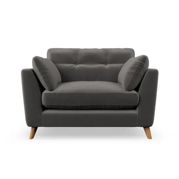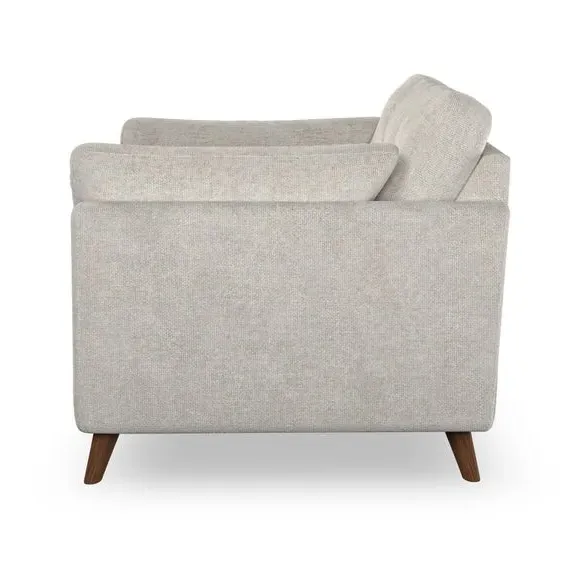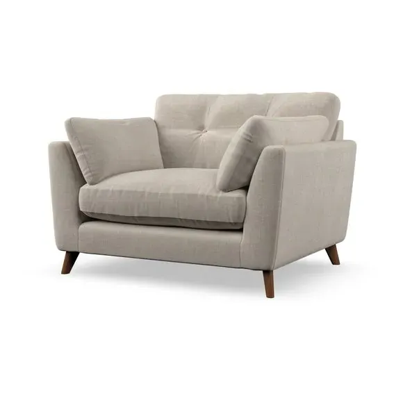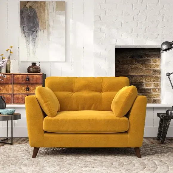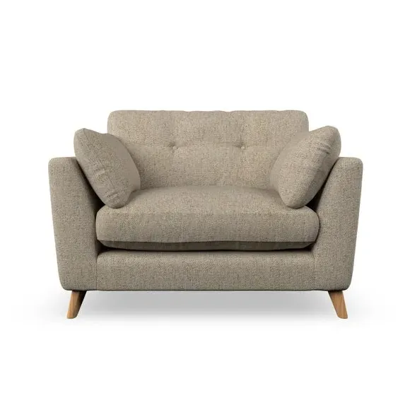 The snuggle chair combines mid-century style with plush pillow top arms for enhanced comfort. Its button pull details on the back cushions add refined character, while the supportive construction ensures lasting durability. The customizable design allows selection of fabric type, leg colour, and cushion filling to suit individual preferences.