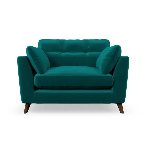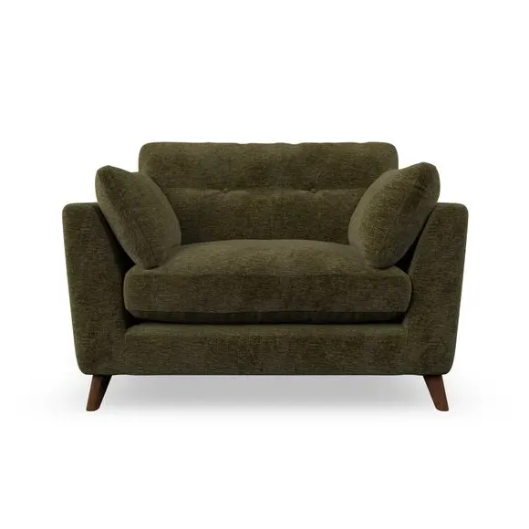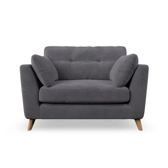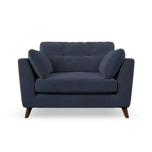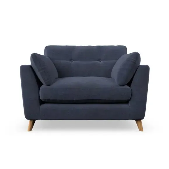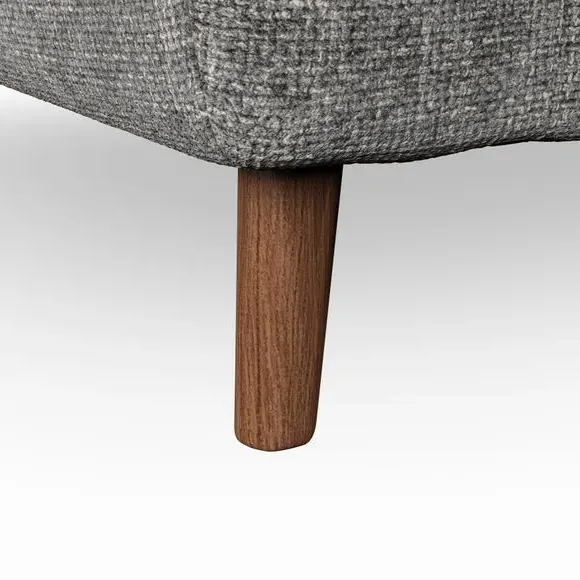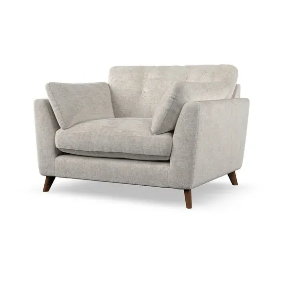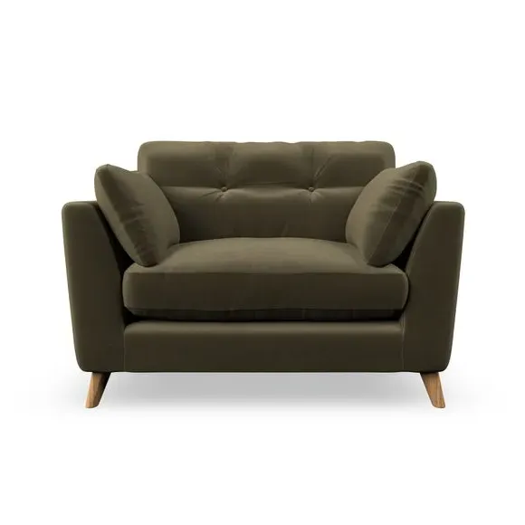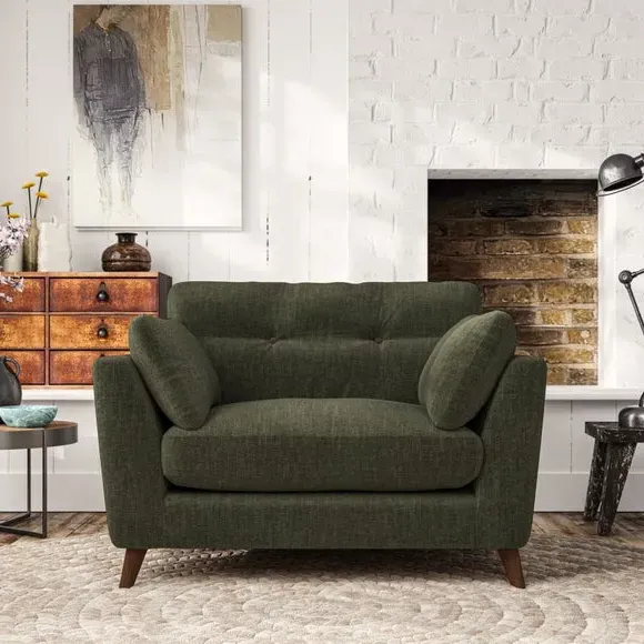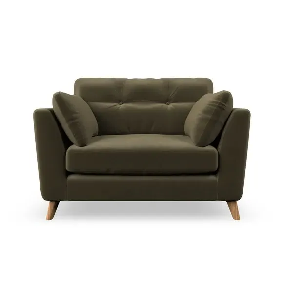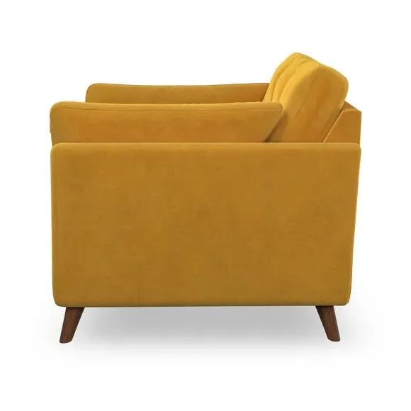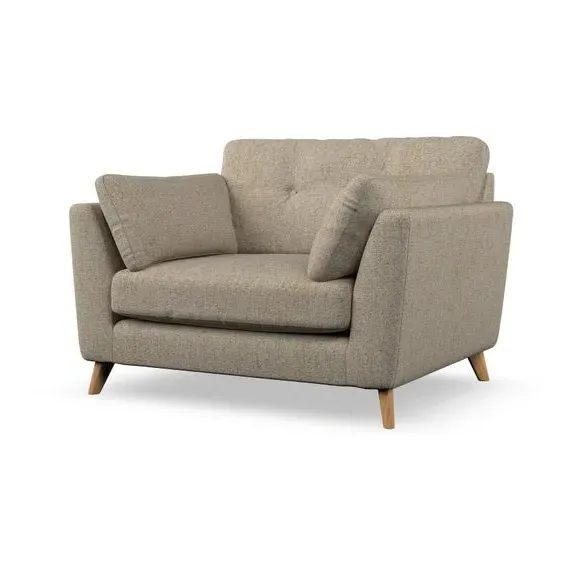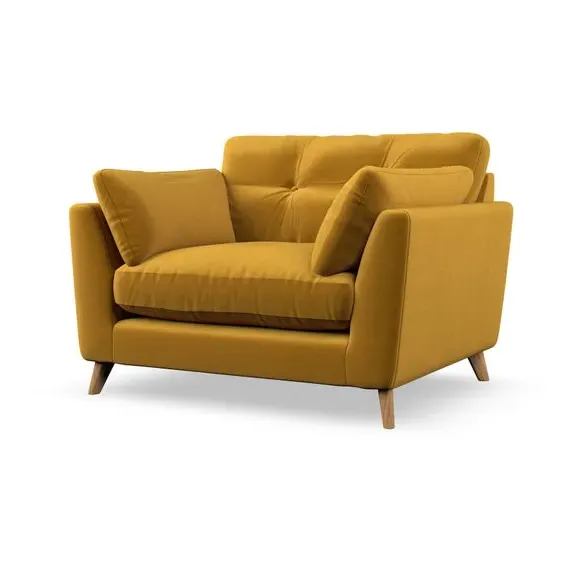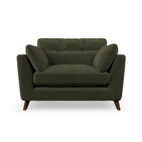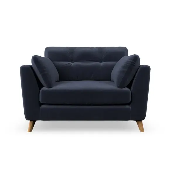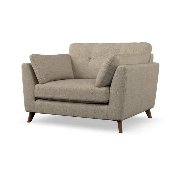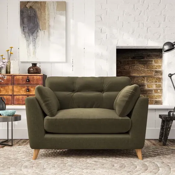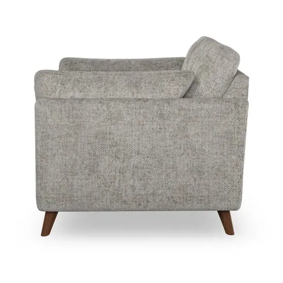 The snuggle chair combines mid-century style with plush pillow top arms for enhanced comfort. Its button pull details on the back cushions add refined character, while the supportive construction ensures lasting durability. The customizable design allows selection of fabric type, leg colour, and cushion filling to suit individual preferences.