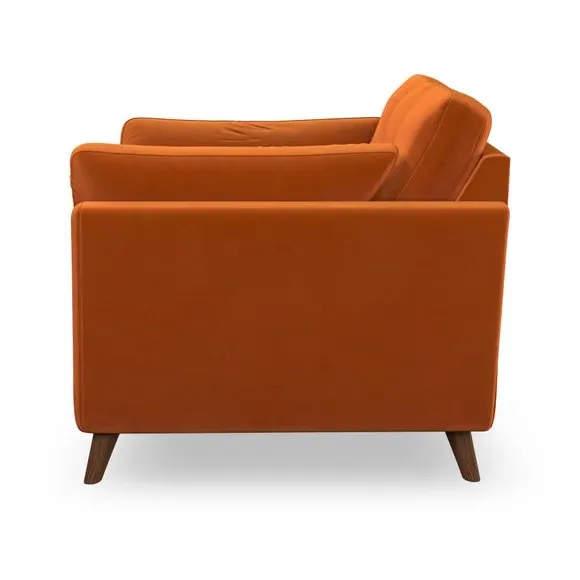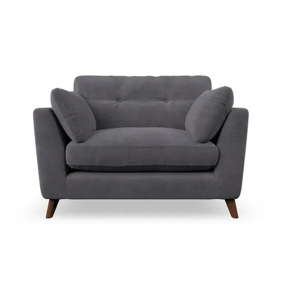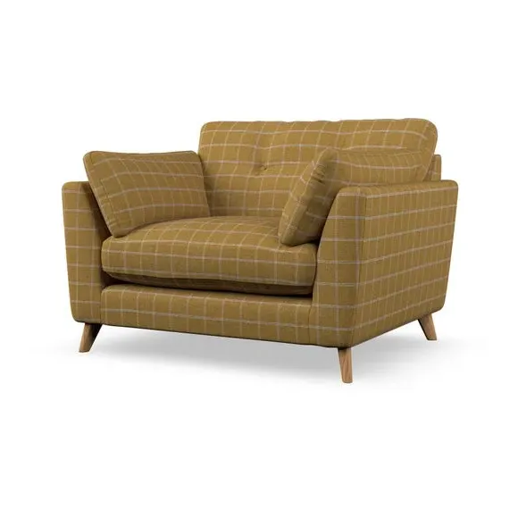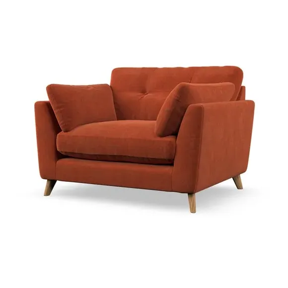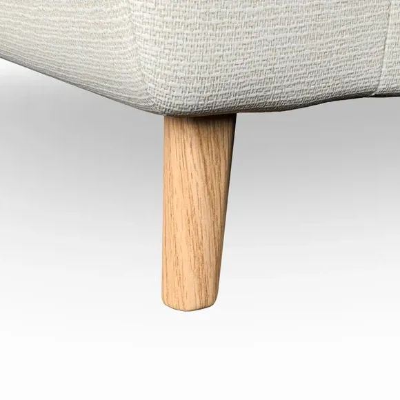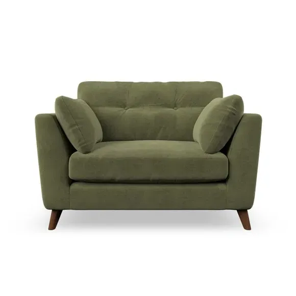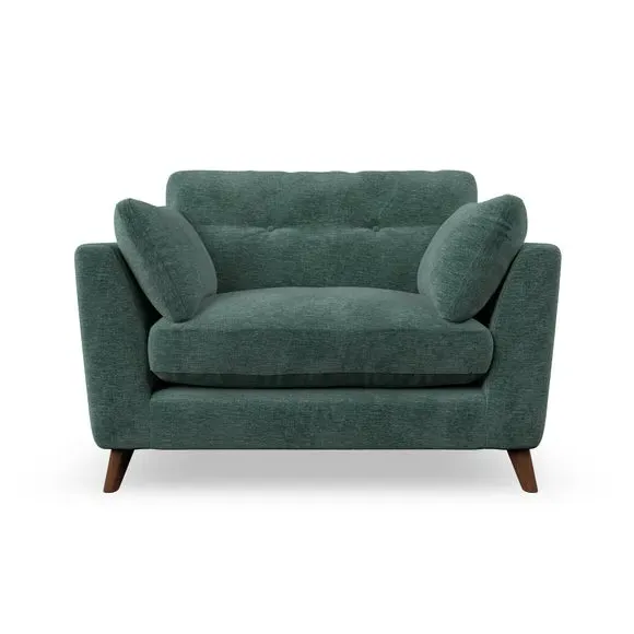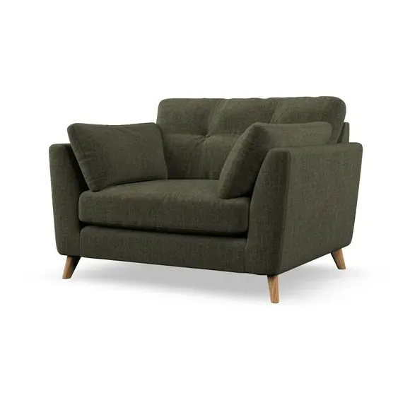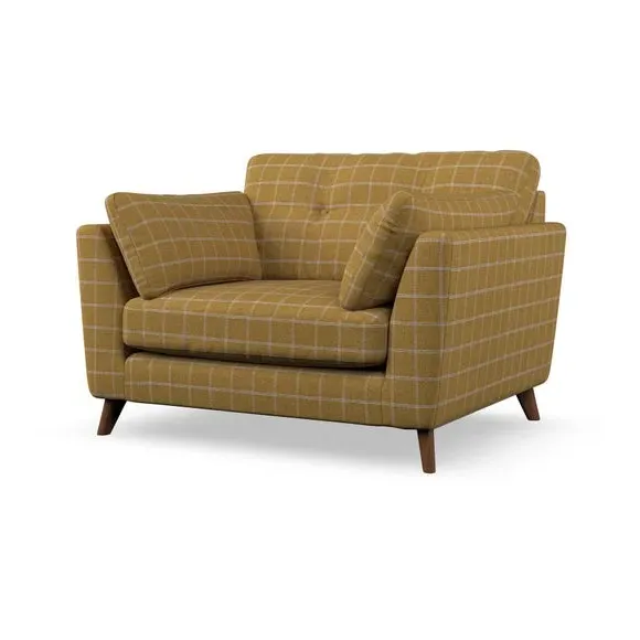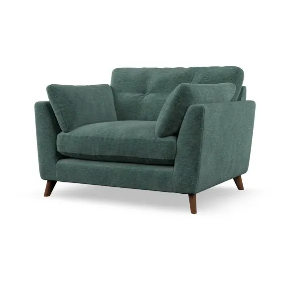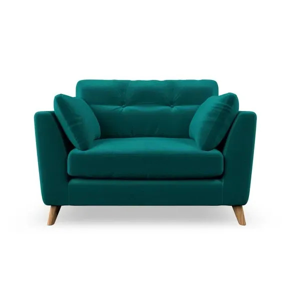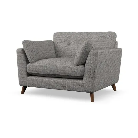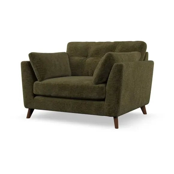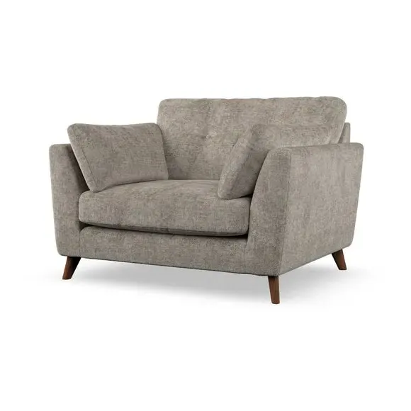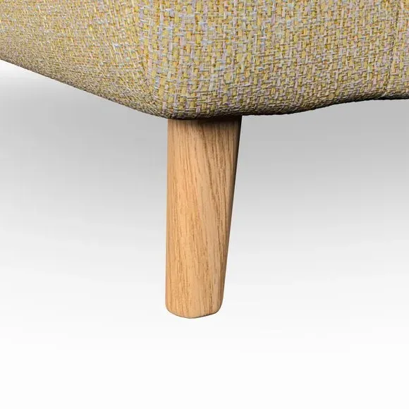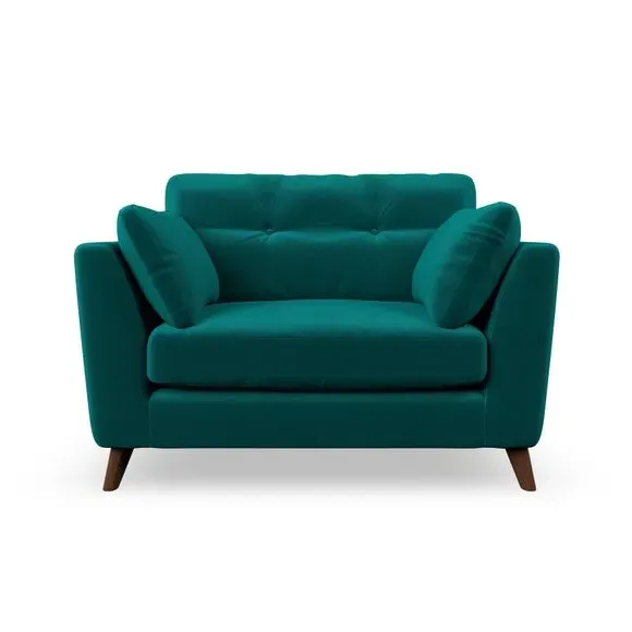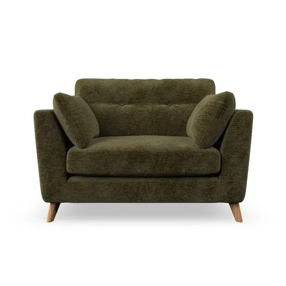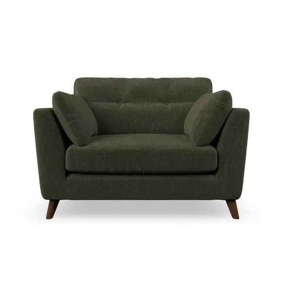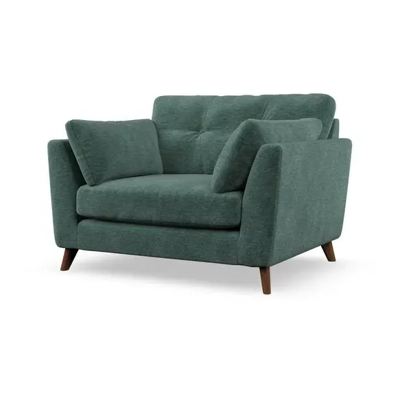 The snuggle chair combines mid-century style with plush pillow top arms for enhanced comfort. Its button pull details on the back cushions add refined character, while the supportive construction ensures lasting durability. The customizable design allows selection of fabric type, leg colour, and cushion filling to suit individual preferences.