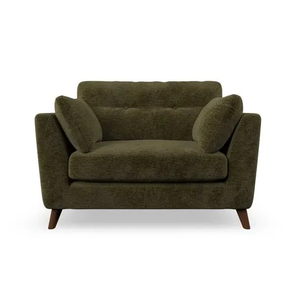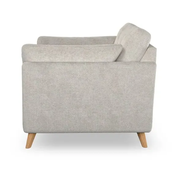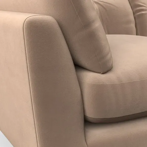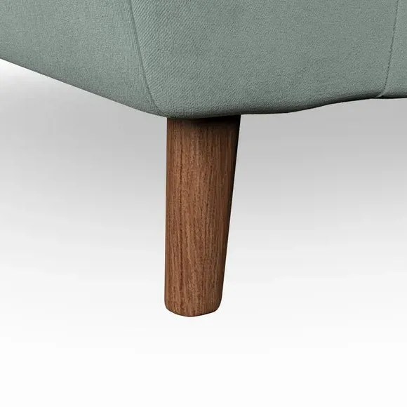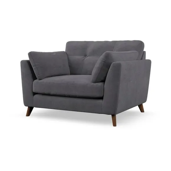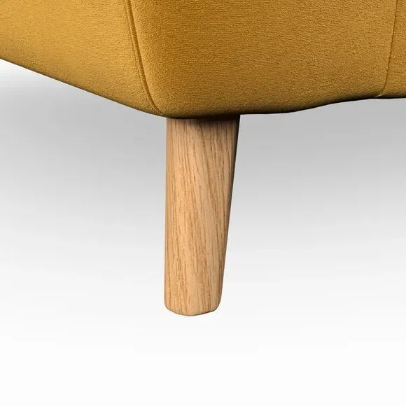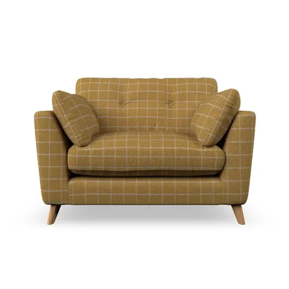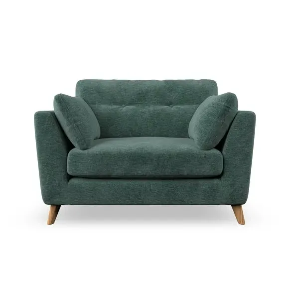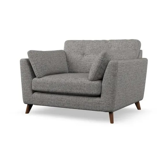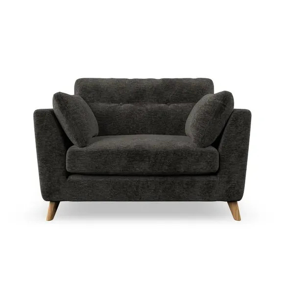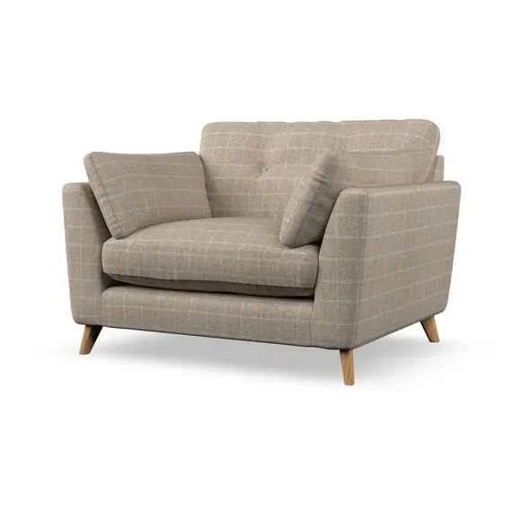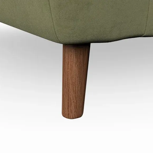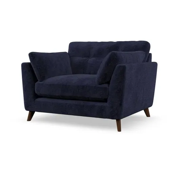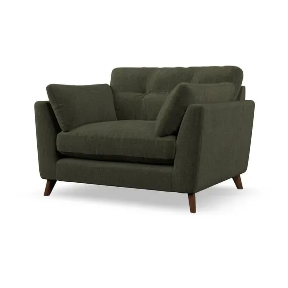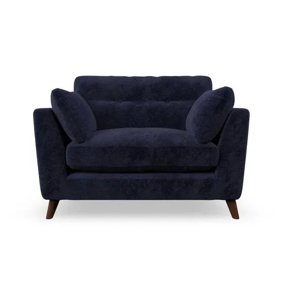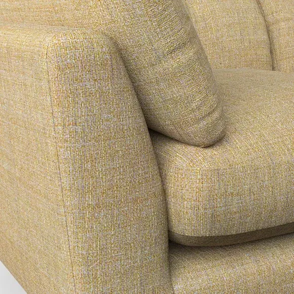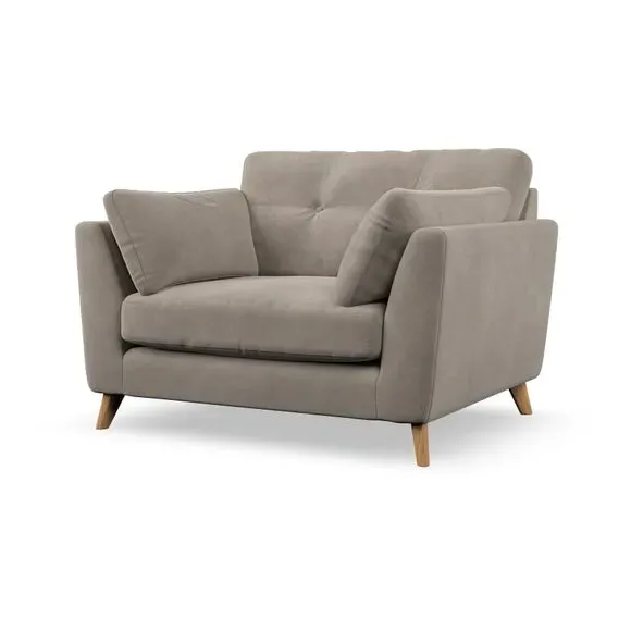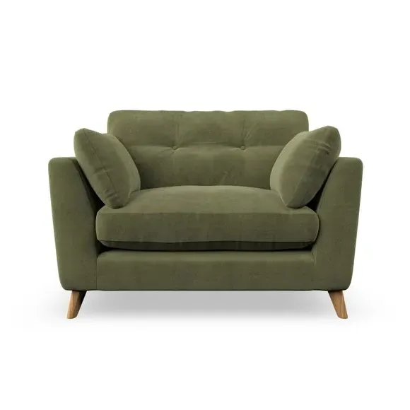 The snuggle chair combines mid-century style with plush pillow top arms for enhanced comfort. Its button pull details on the back cushions add refined character, while the supportive construction ensures lasting durability. The customizable design allows selection of fabric type, leg colour, and cushion filling to suit individual preferences.