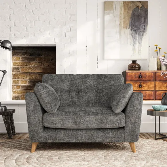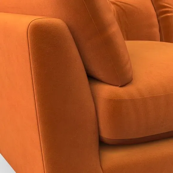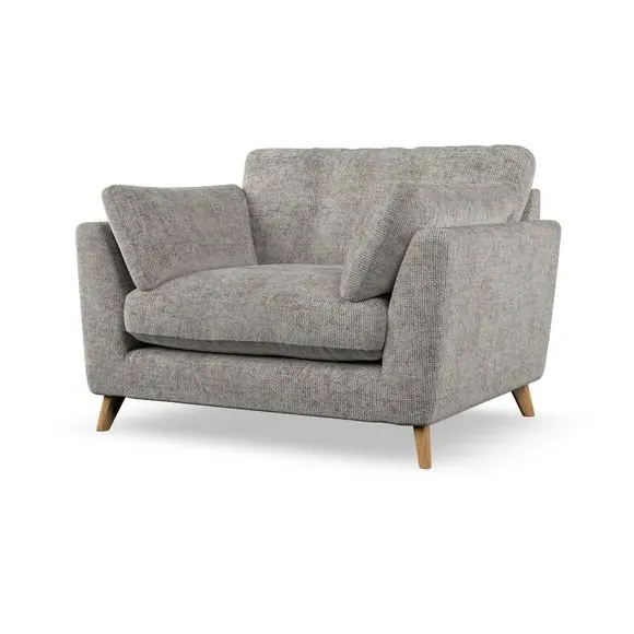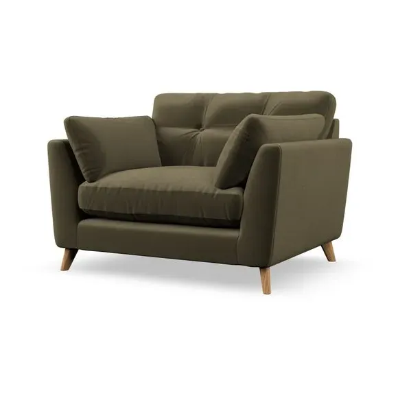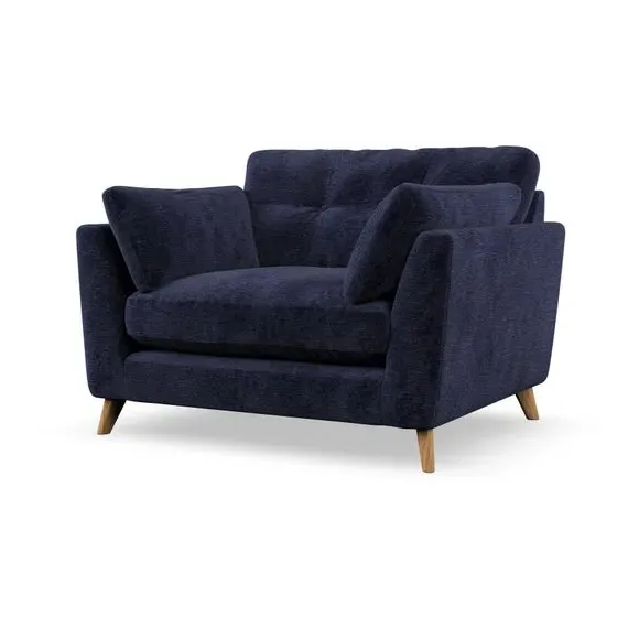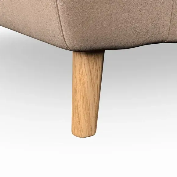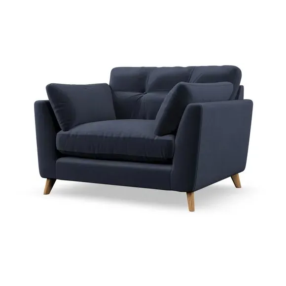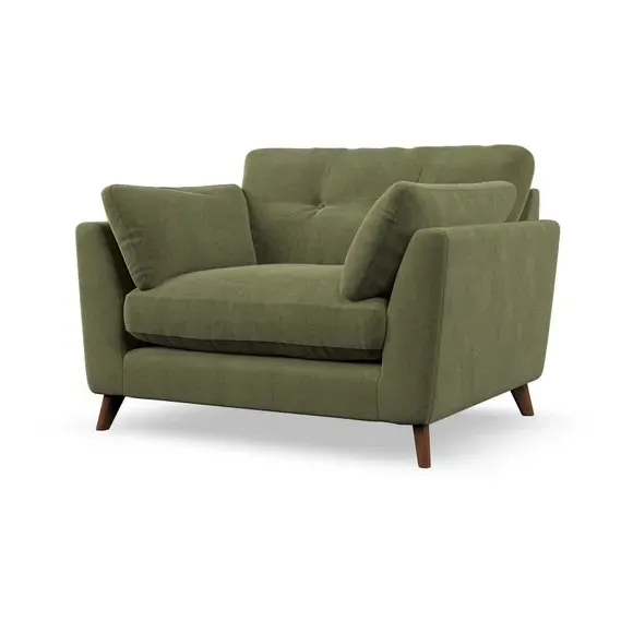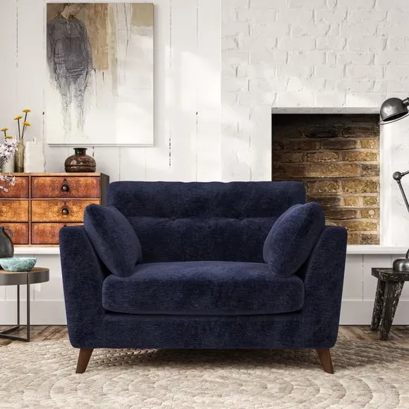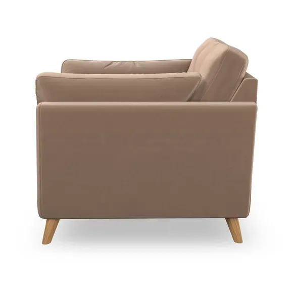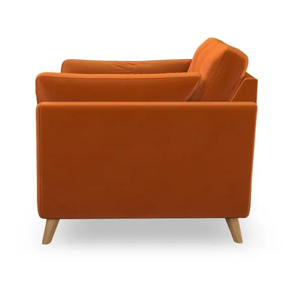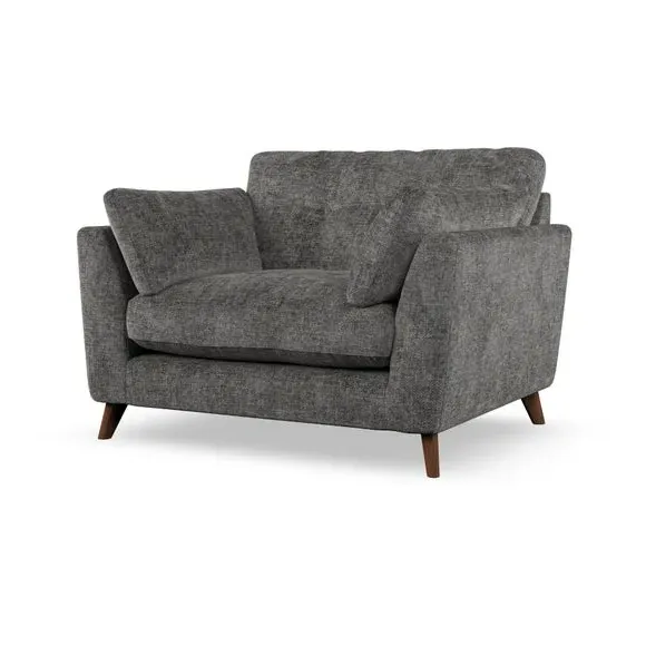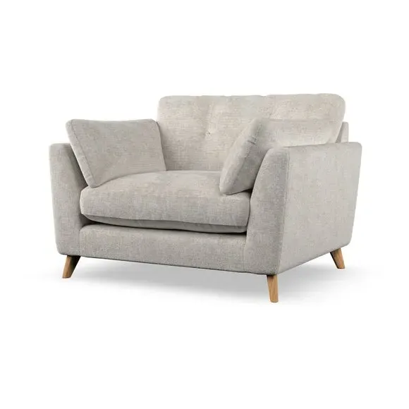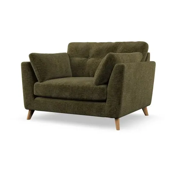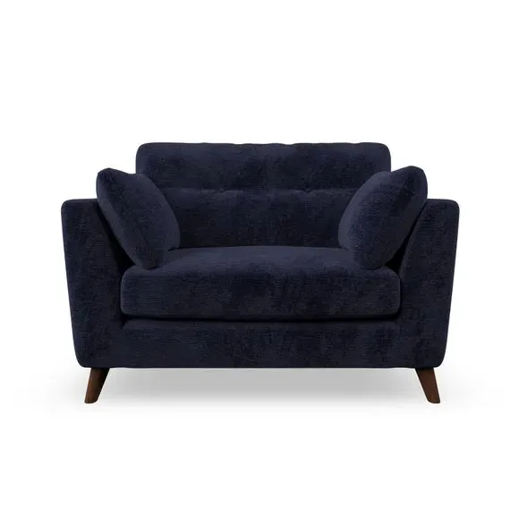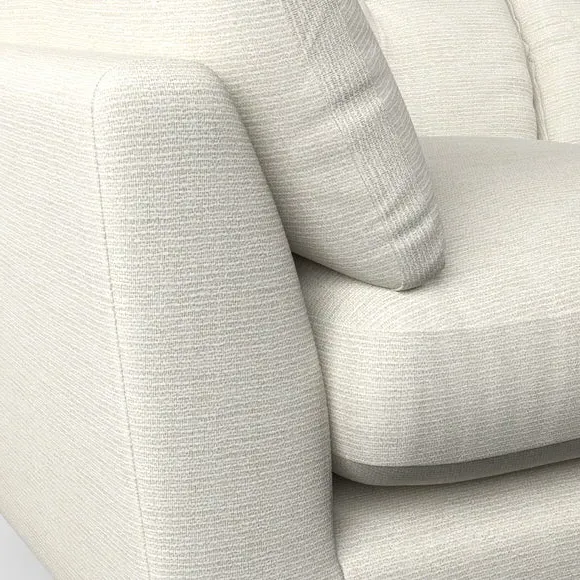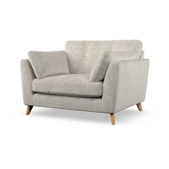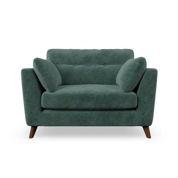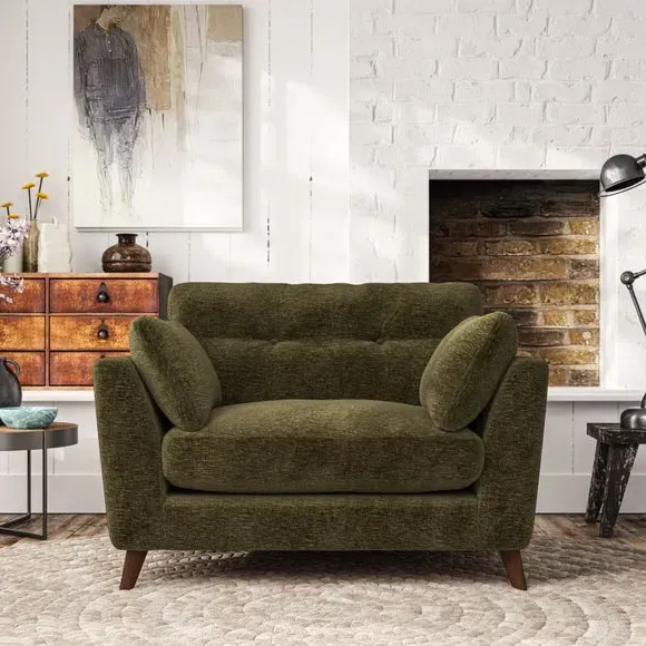The snuggle chair combines mid-century style with plush pillow top arms for enhanced comfort. Its button pull details on the back cushions add refined character, while the supportive construction ensures lasting durability. The customizable design allows selection of fabric type, leg colour, and cushion filling to suit individual preferences.