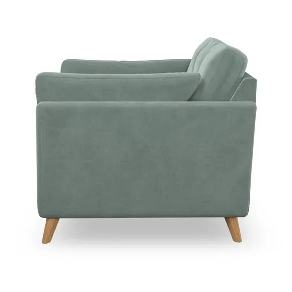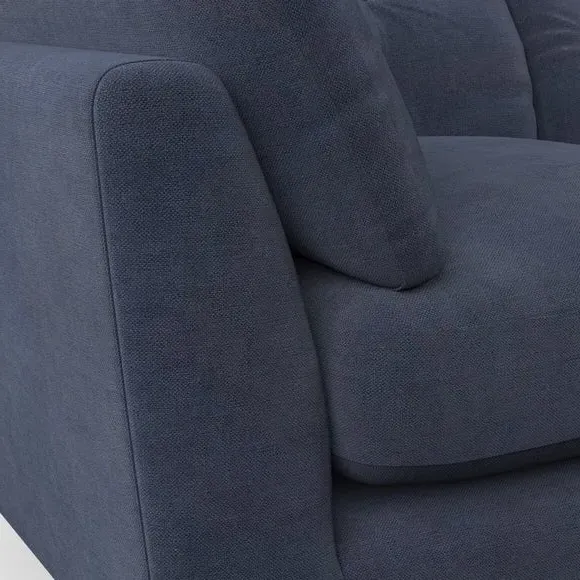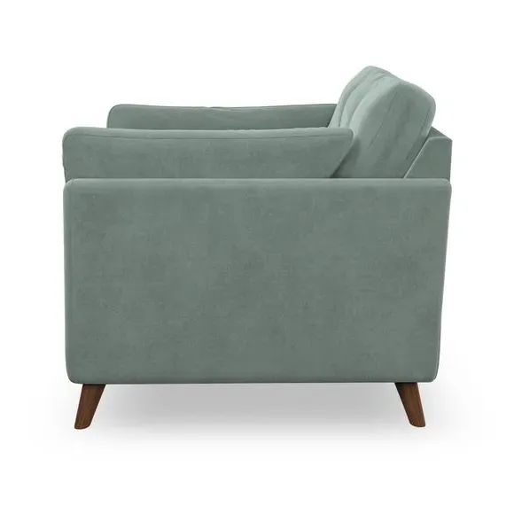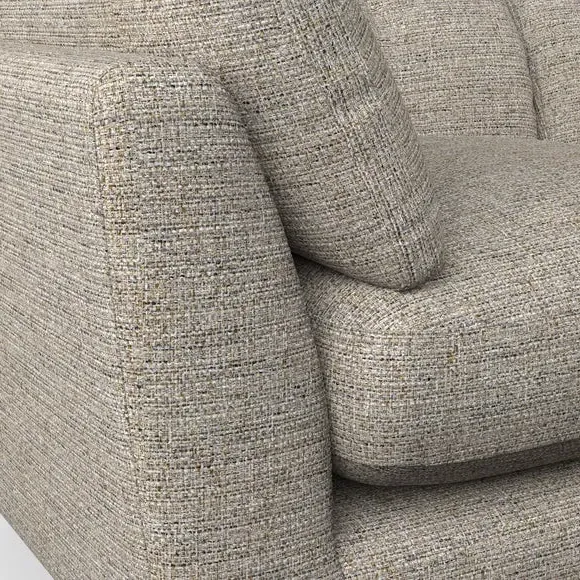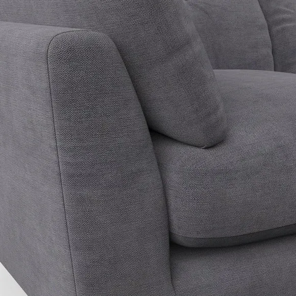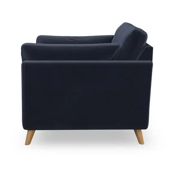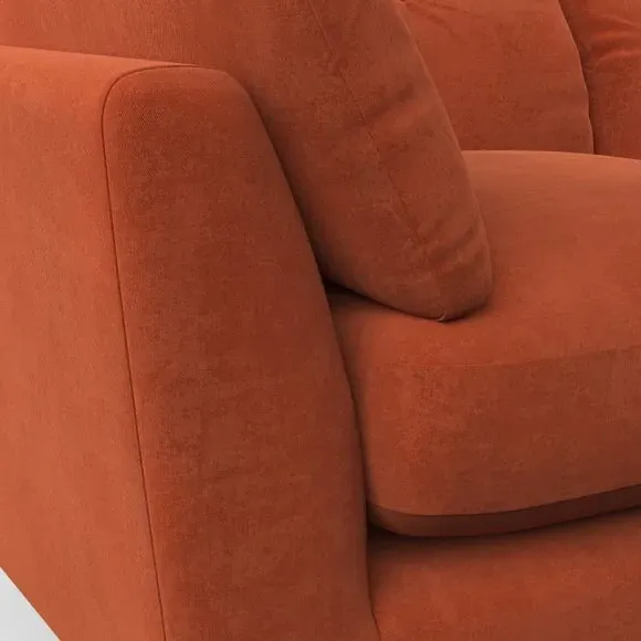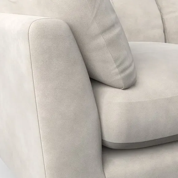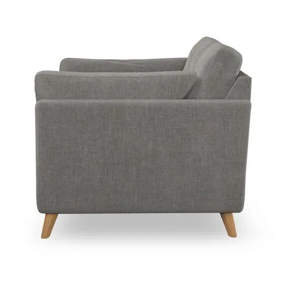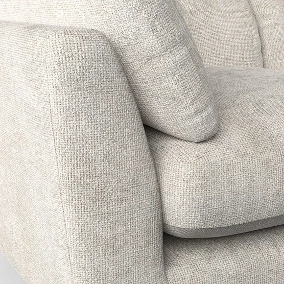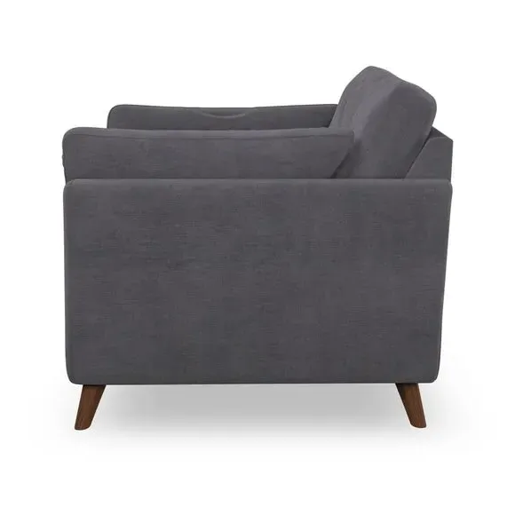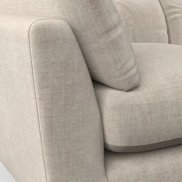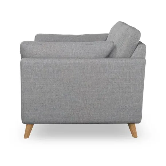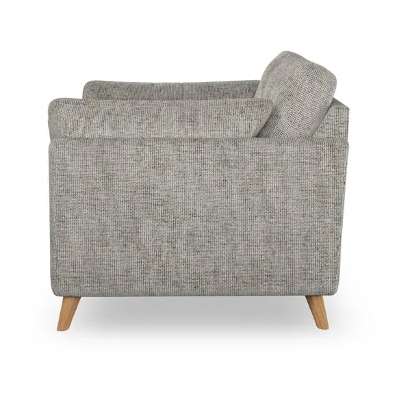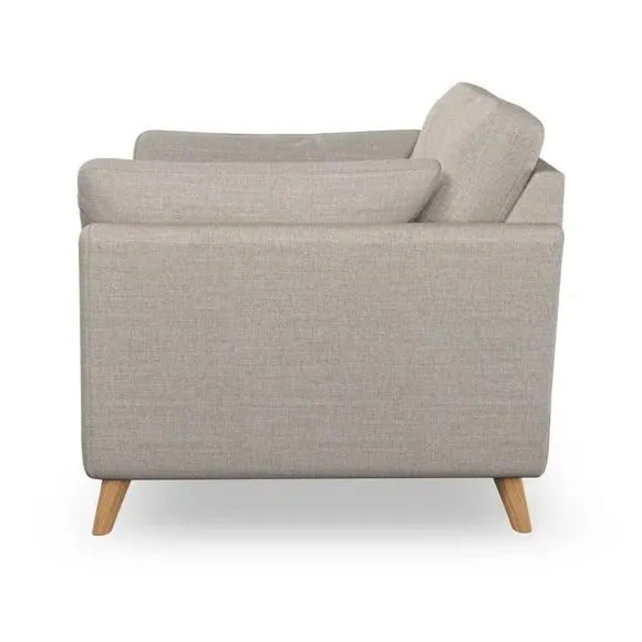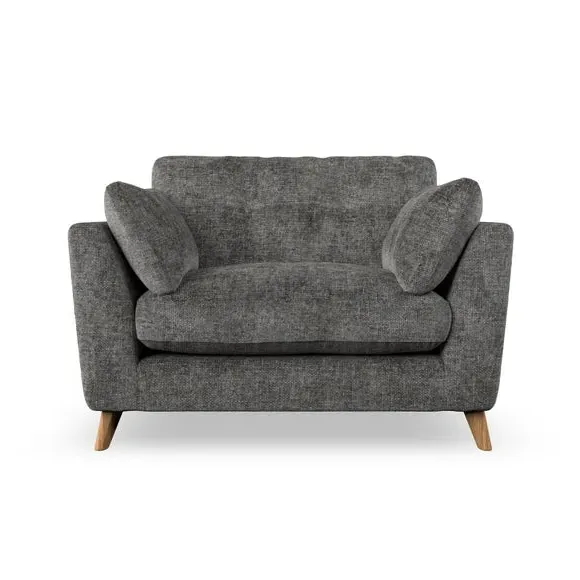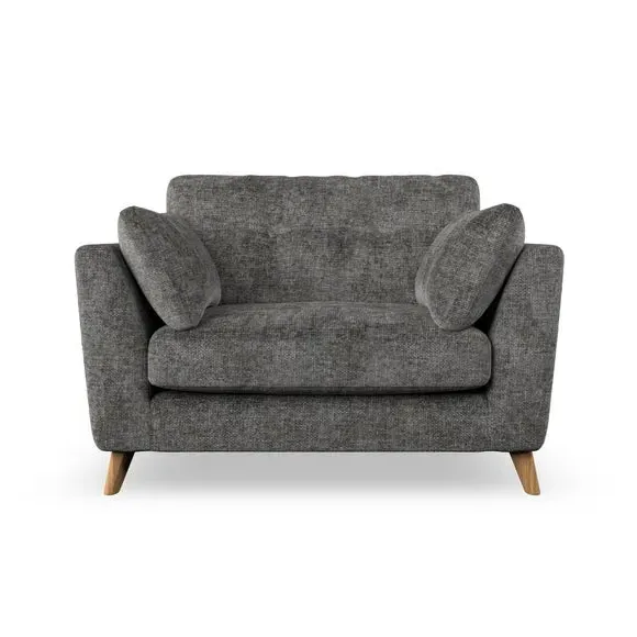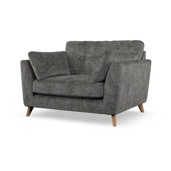 The snuggle chair combines mid-century style with plush pillow top arms for enhanced comfort. Its button pull details on the back cushions add refined character, while the supportive construction ensures lasting durability. The customizable design allows selection of fabric type, leg colour, and cushion filling to suit individual preferences.