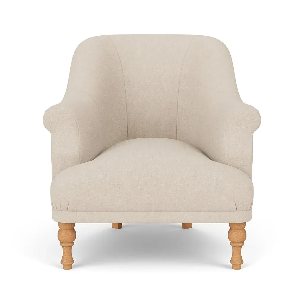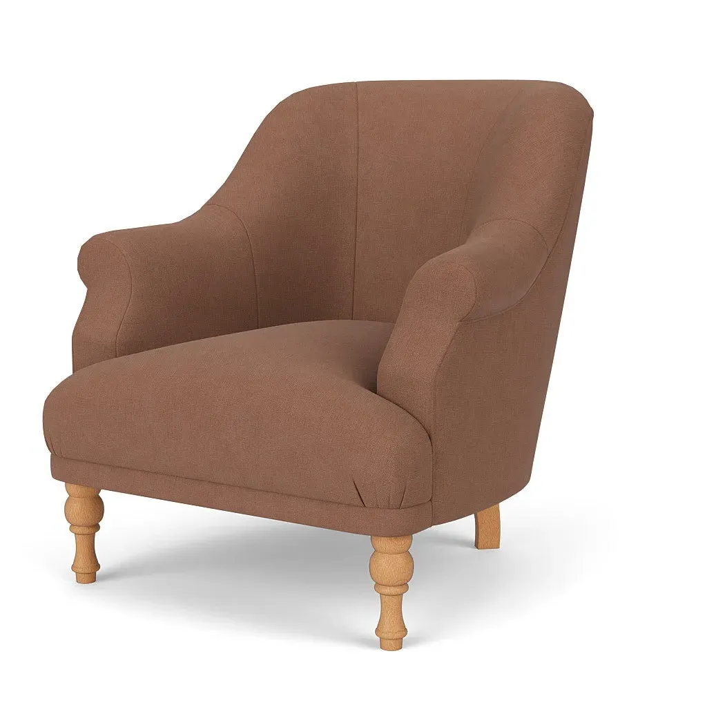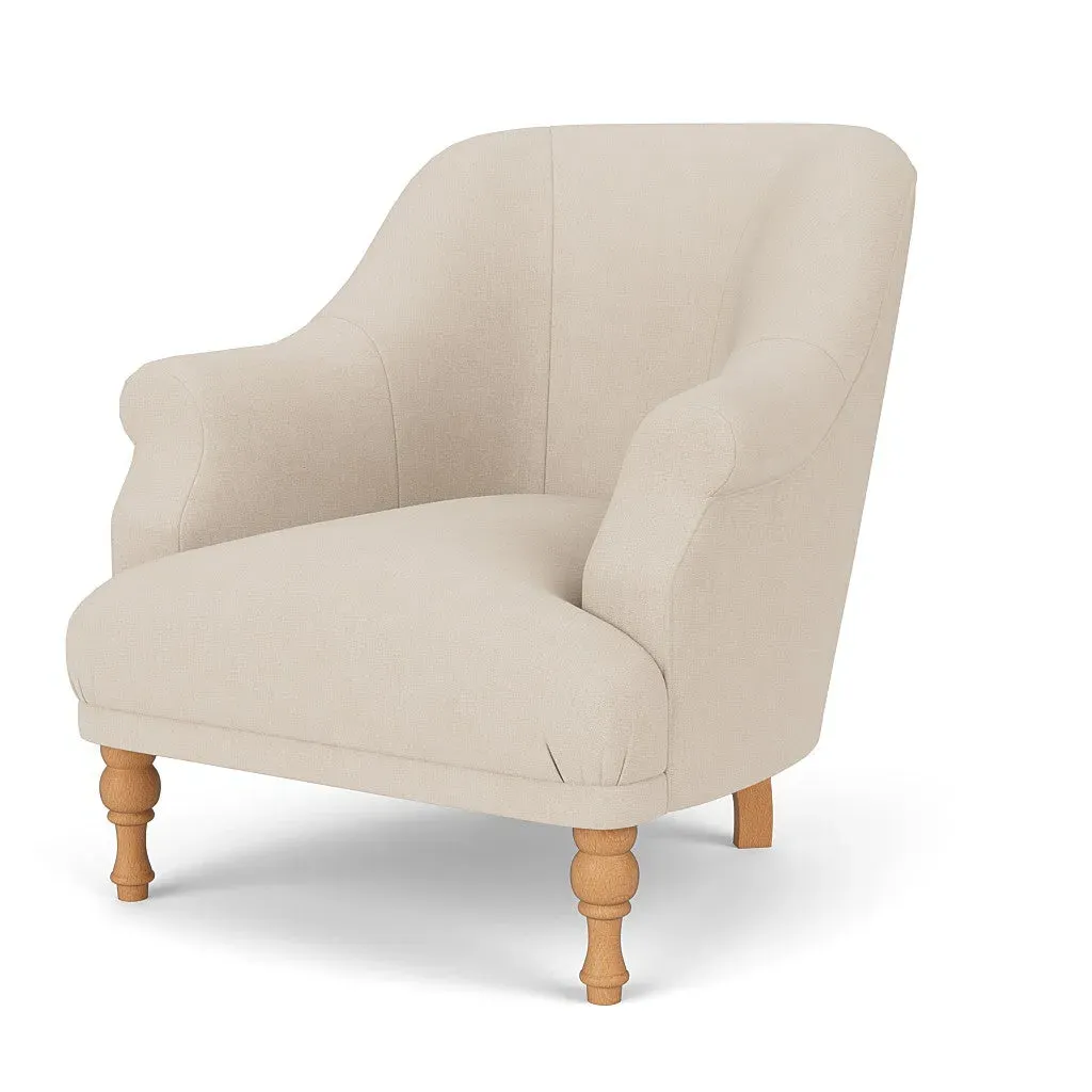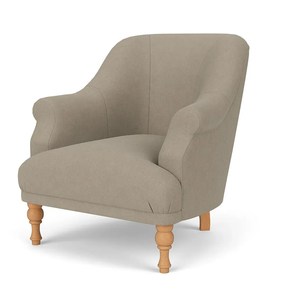 The armchair offers a petite, mid-century inspired design with its fixed seat and back construction. Its tailored silhouette provides refined comfort, while the house linen mix upholstery adds durability and texture. The compact frame suits smaller spaces, and the structured design ensures lasting support.
