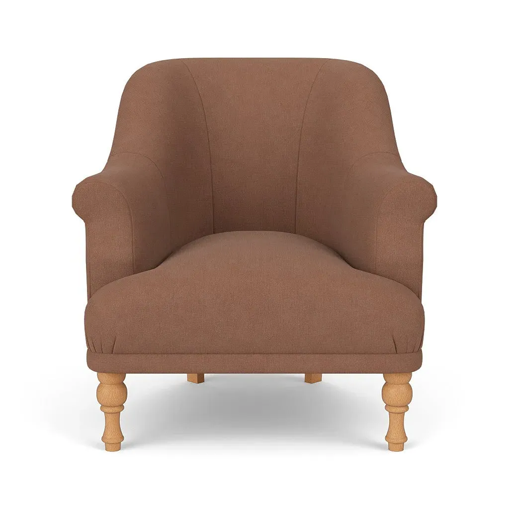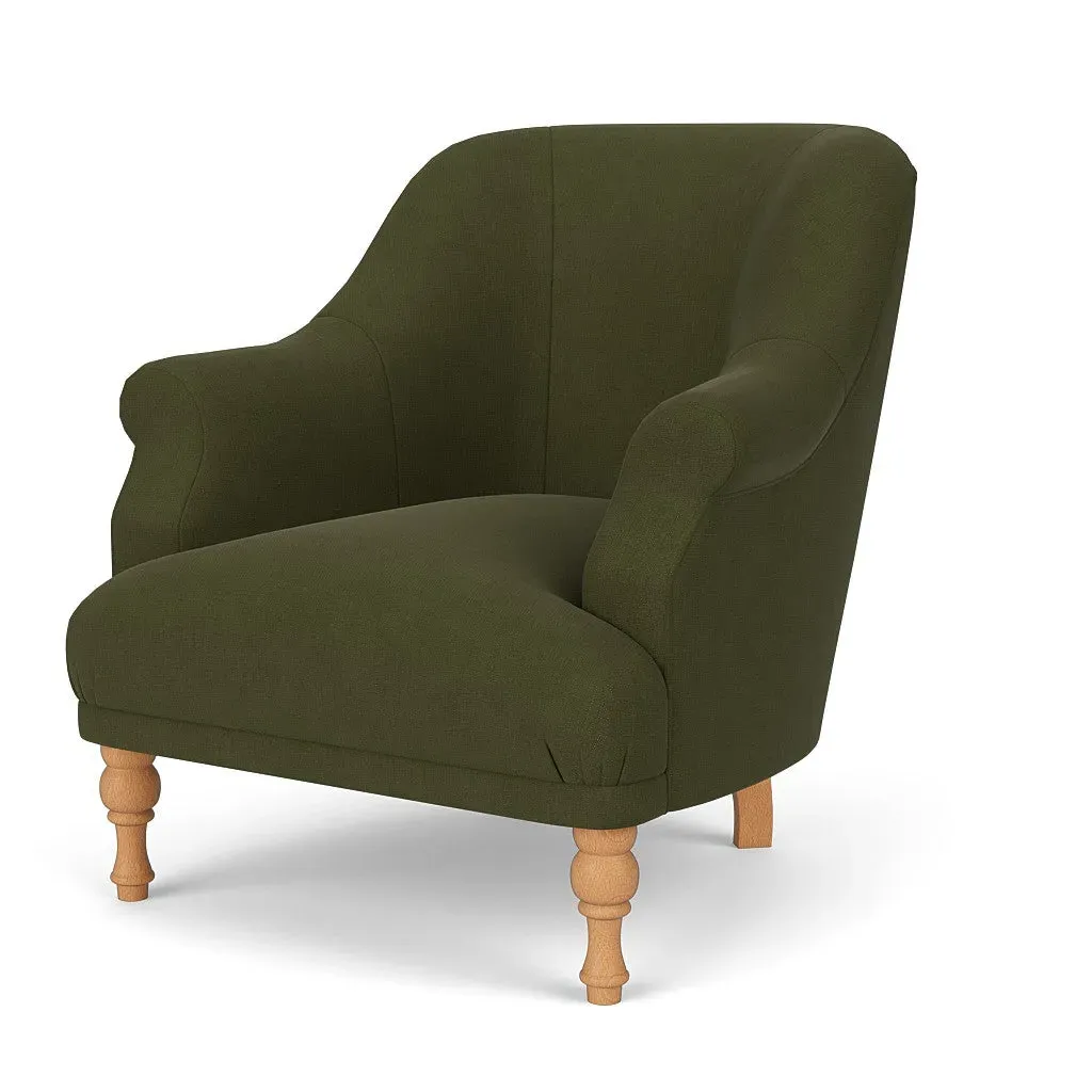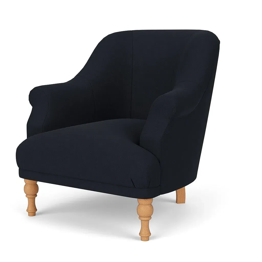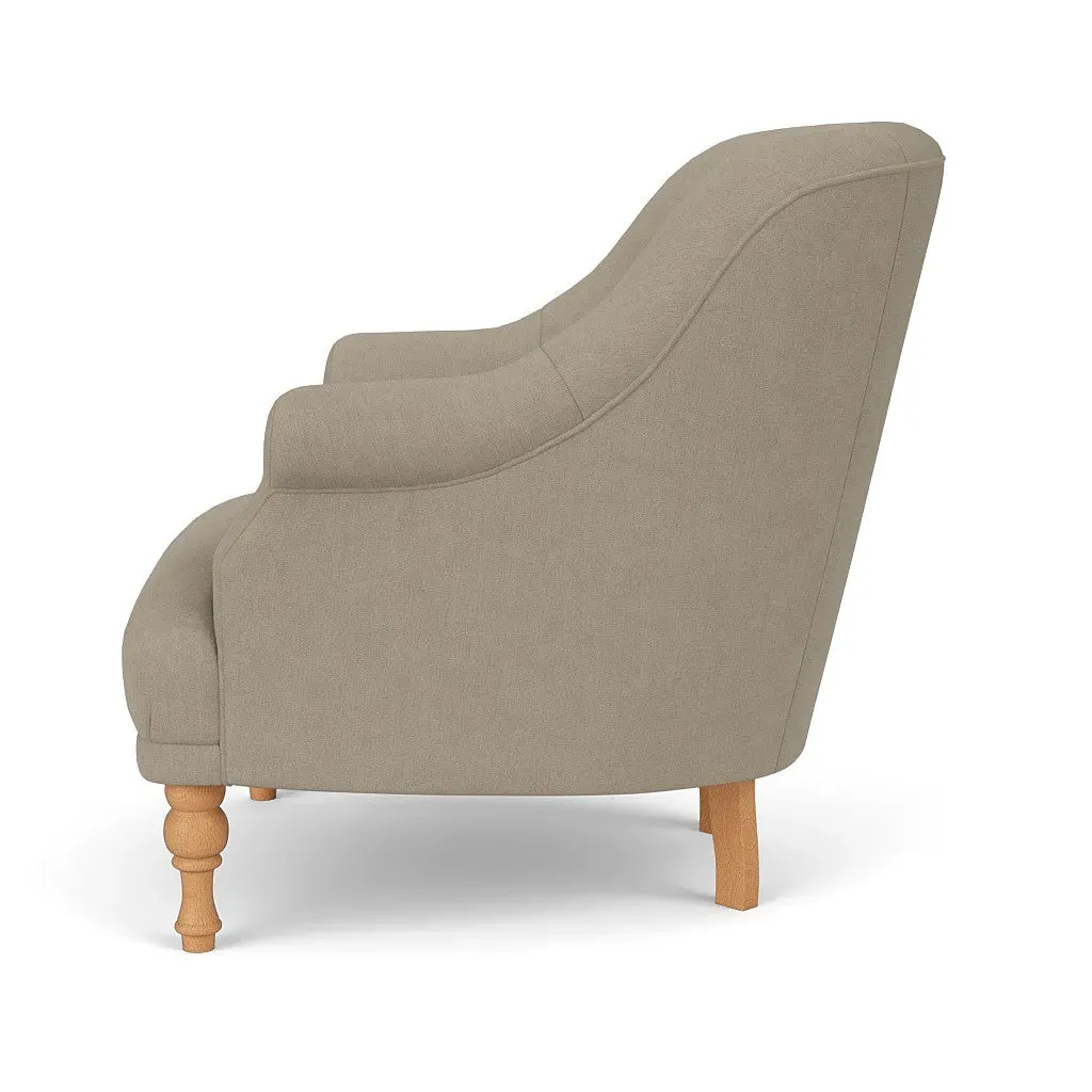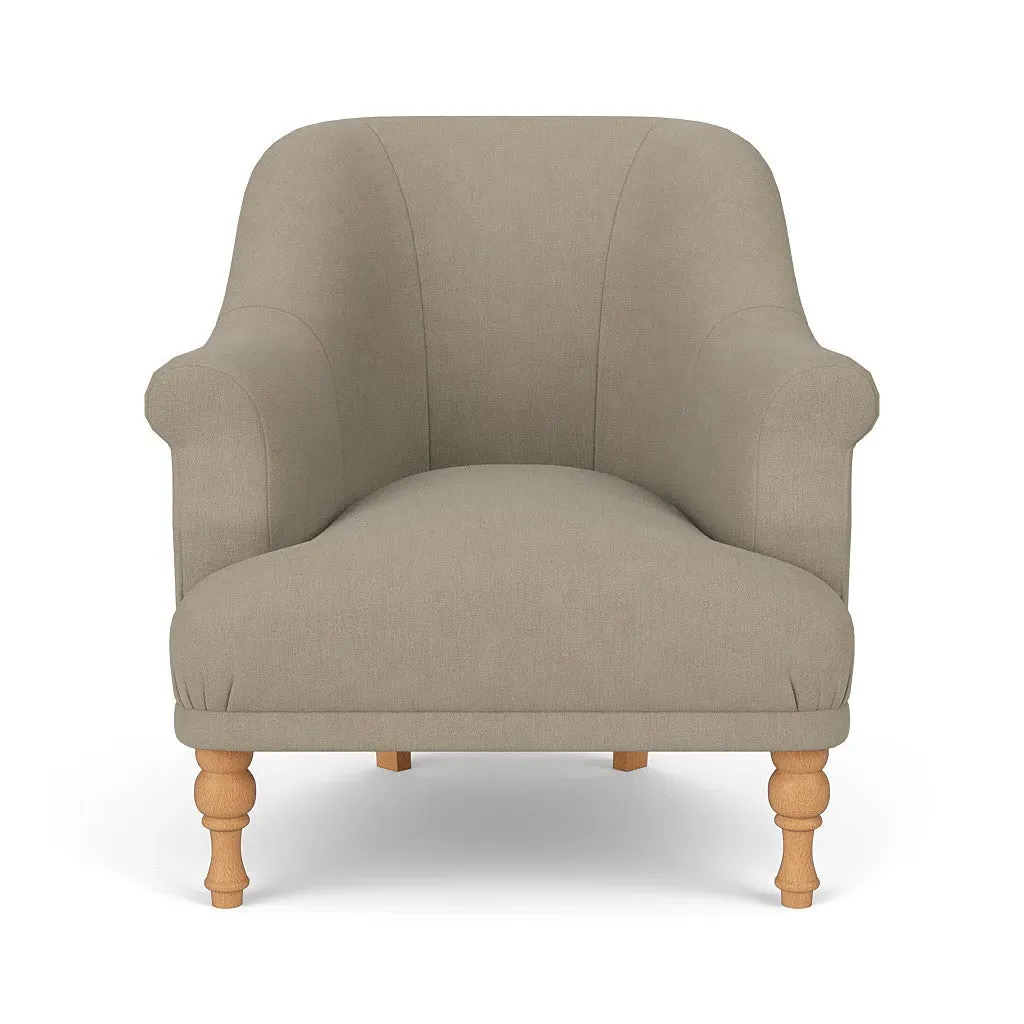 The armchair offers a petite, mid-century inspired design with its fixed seat and back construction. Its tailored silhouette provides refined comfort, while the house linen mix upholstery adds durability and texture. The compact frame suits smaller spaces, and the structured design ensures lasting support.