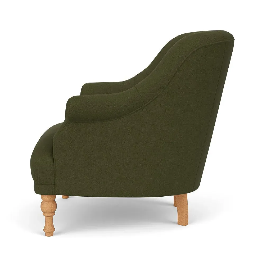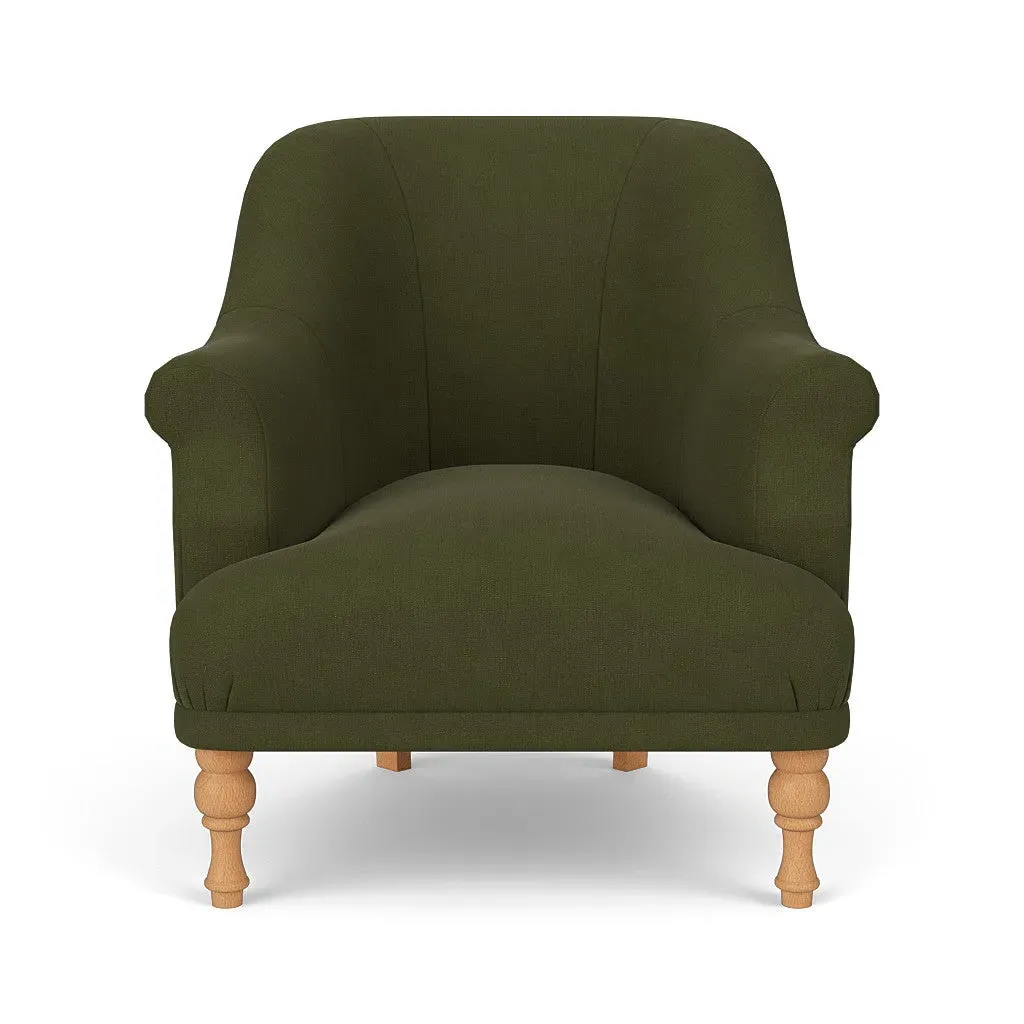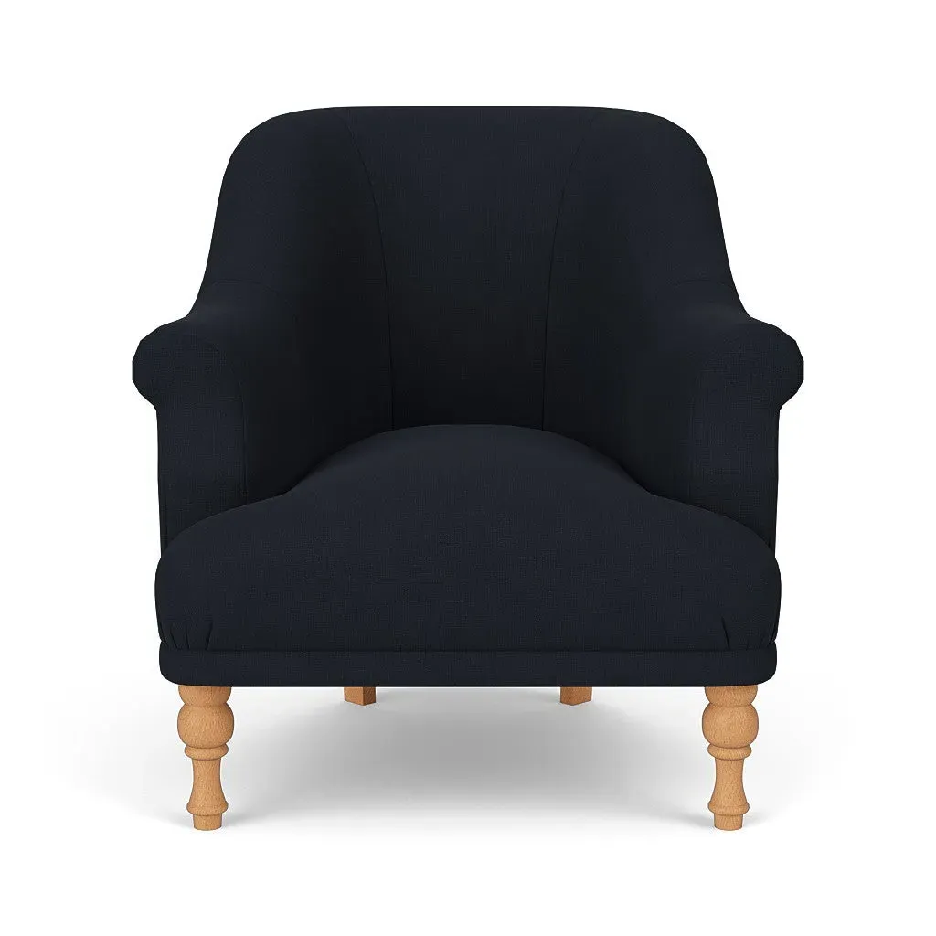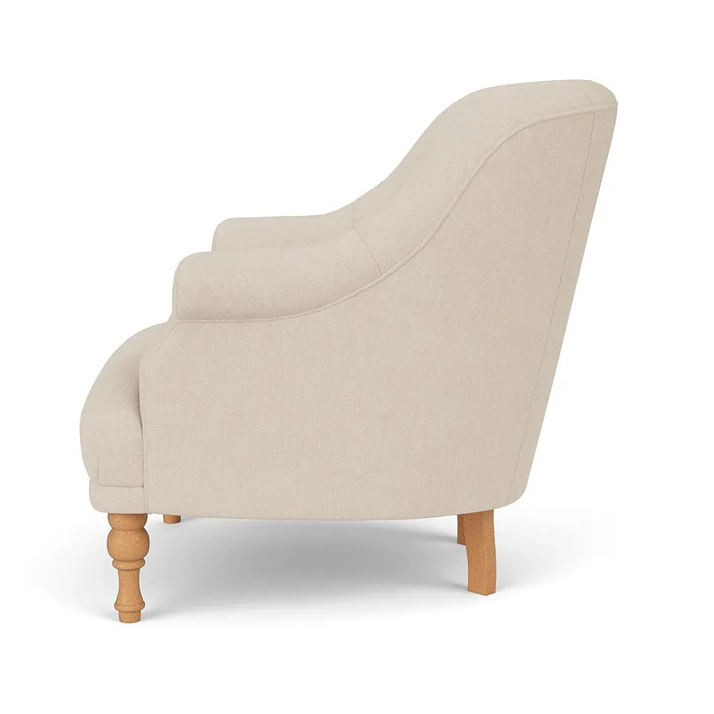 The armchair offers a petite, mid-century inspired design with its fixed seat and back construction. Its tailored silhouette provides refined comfort, while the house linen mix upholstery adds durability and texture. The compact frame suits smaller spaces, and the structured design ensures lasting support.