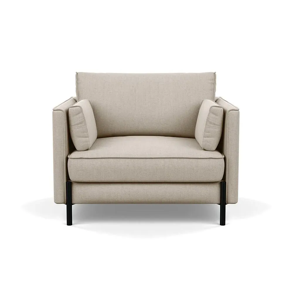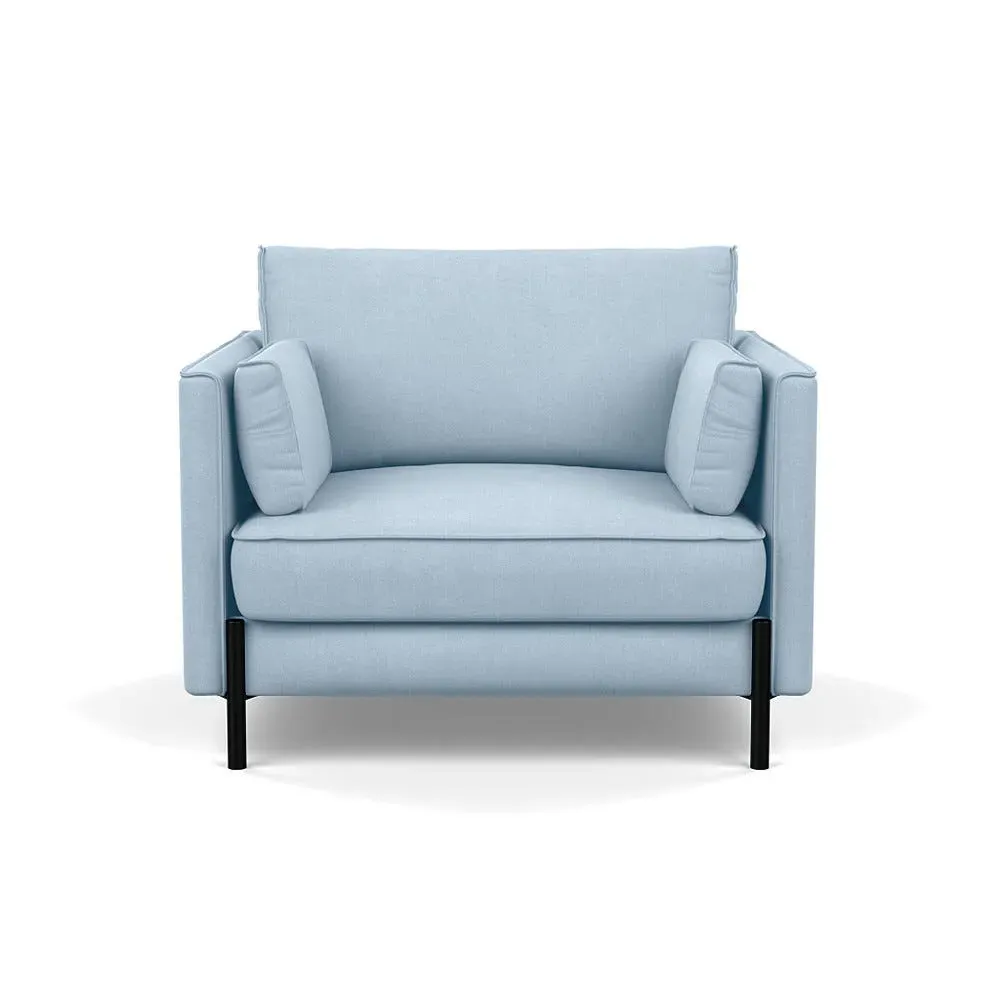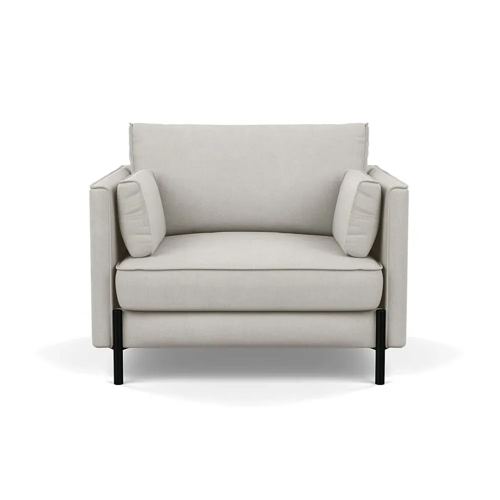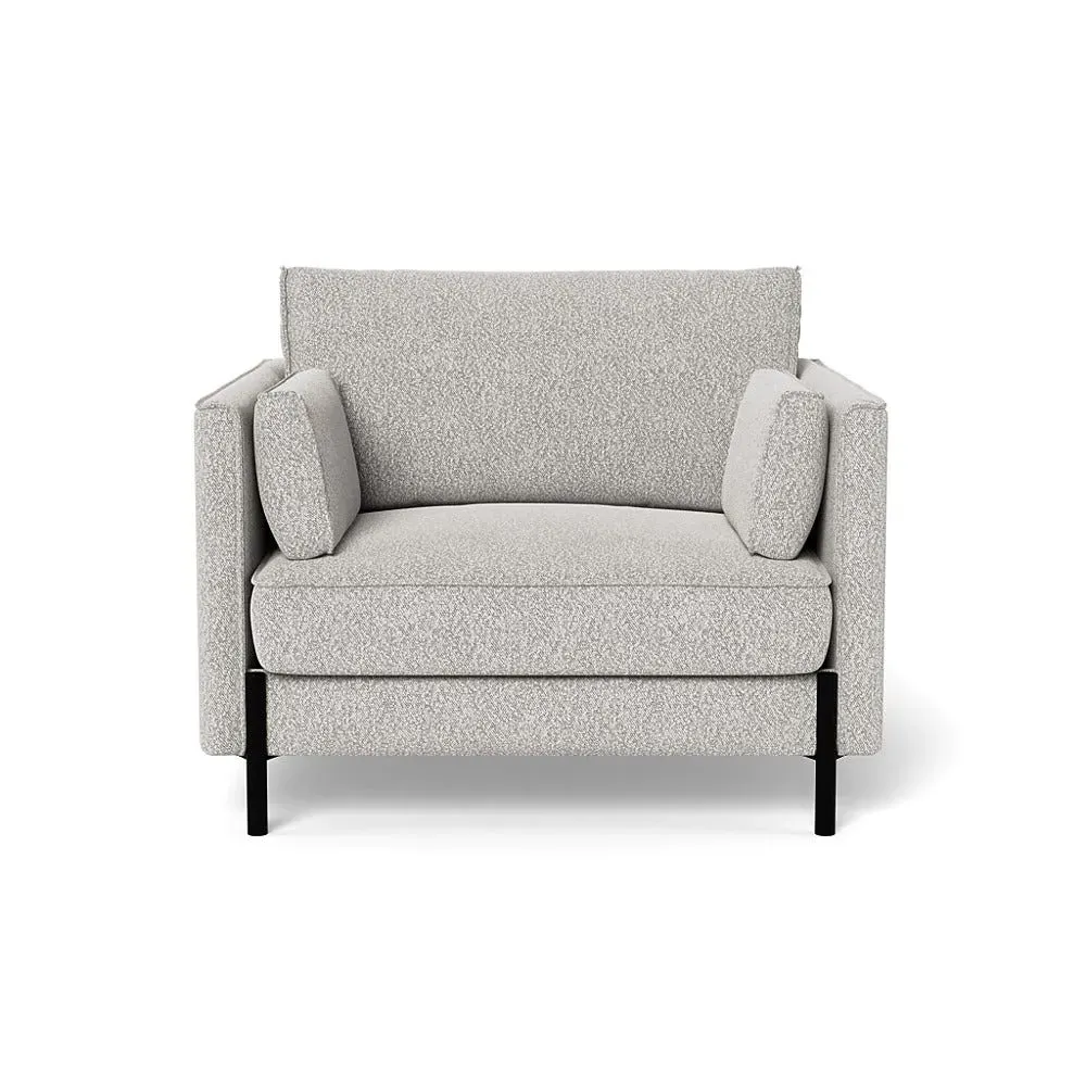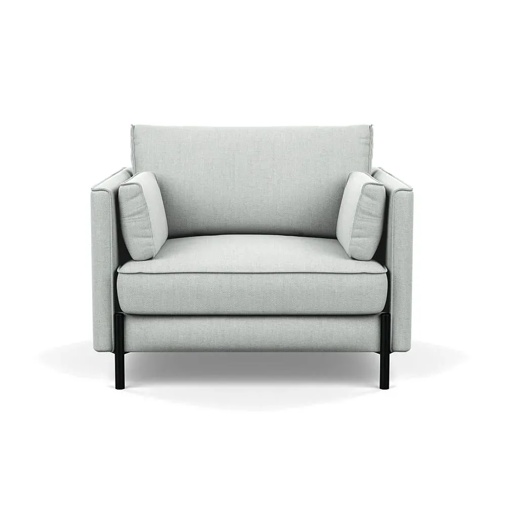 The armchair combines comfort with contemporary design through its deep foam seat cushions wrapped in duck feather jackets for a soft-to-medium feel. Slim arms create generous seating space while maintaining an elegant profile, with French seam detailing adding refined finishing touches. The powder-coated steel legs provide sturdy support with a sleek appearance that complements the overall minimalist aesthetic.