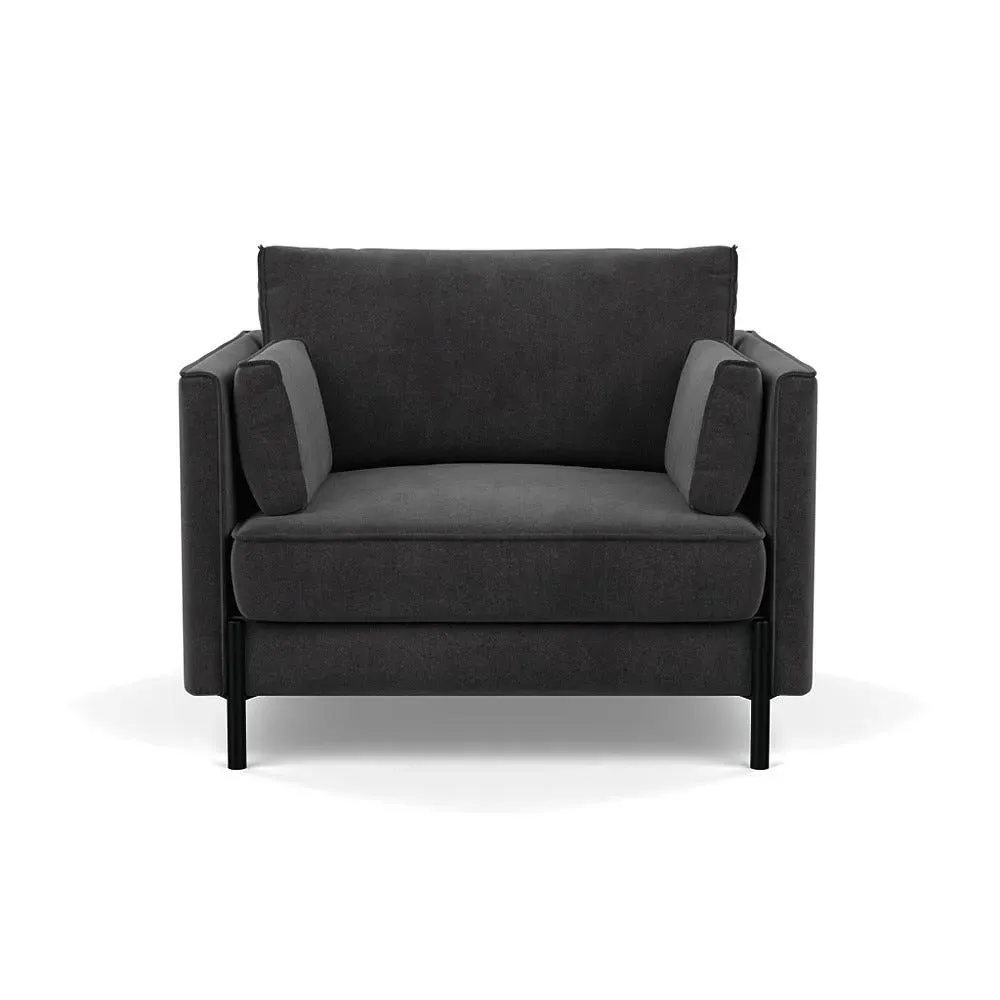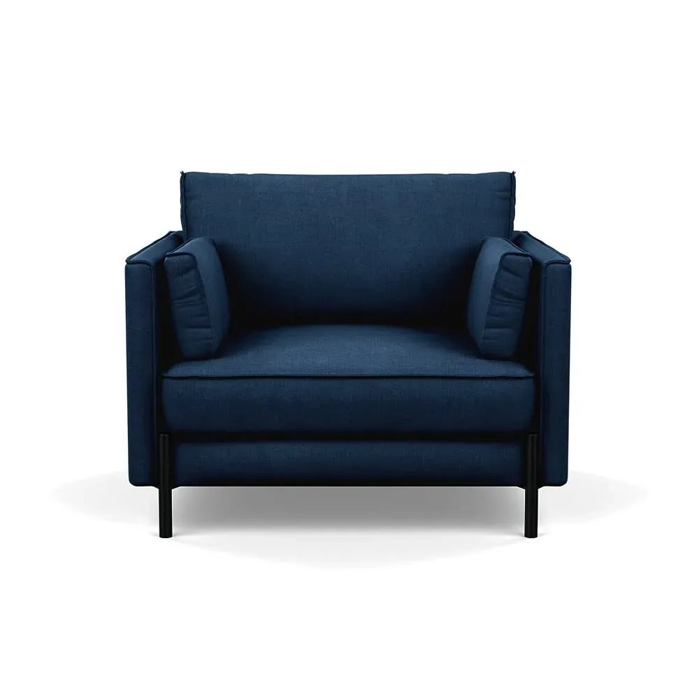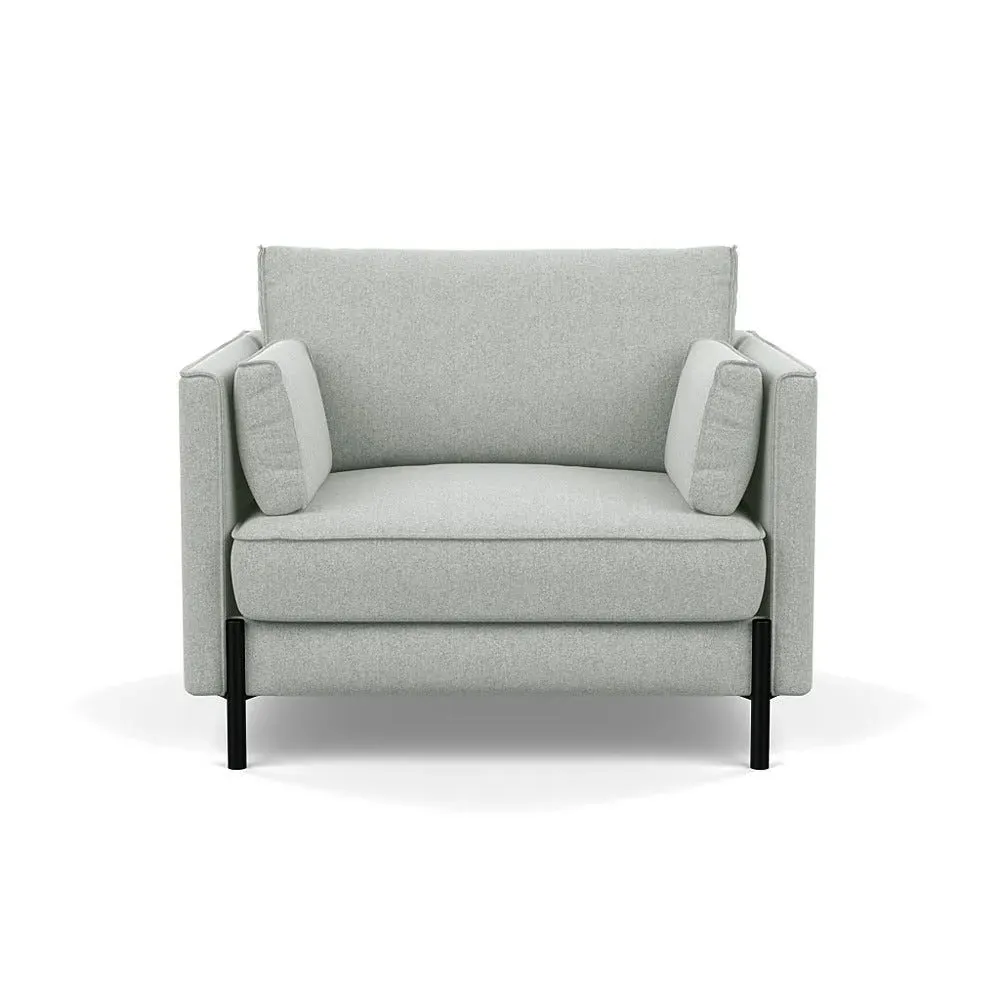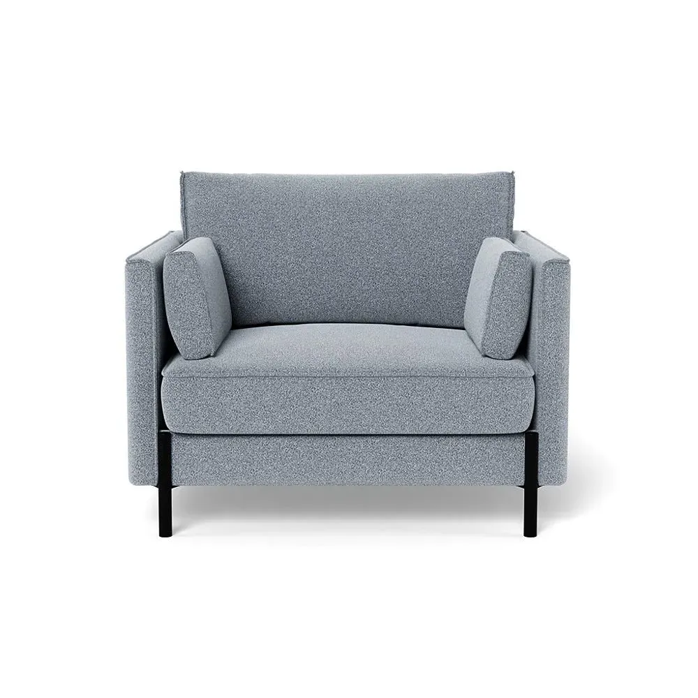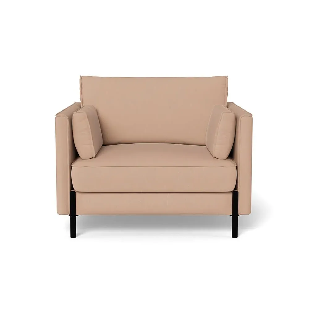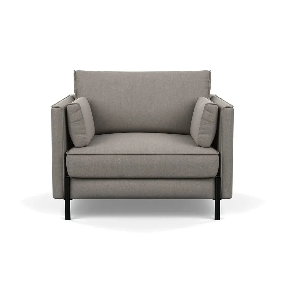 The armchair combines comfort with contemporary design through its deep foam seat cushions wrapped in duck feather jackets for a soft-to-medium feel. Slim arms create generous seating space while maintaining an elegant profile, with French seam detailing adding refined finishing touches. The powder-coated steel legs provide sturdy support with a sleek appearance that complements the overall minimalist aesthetic.