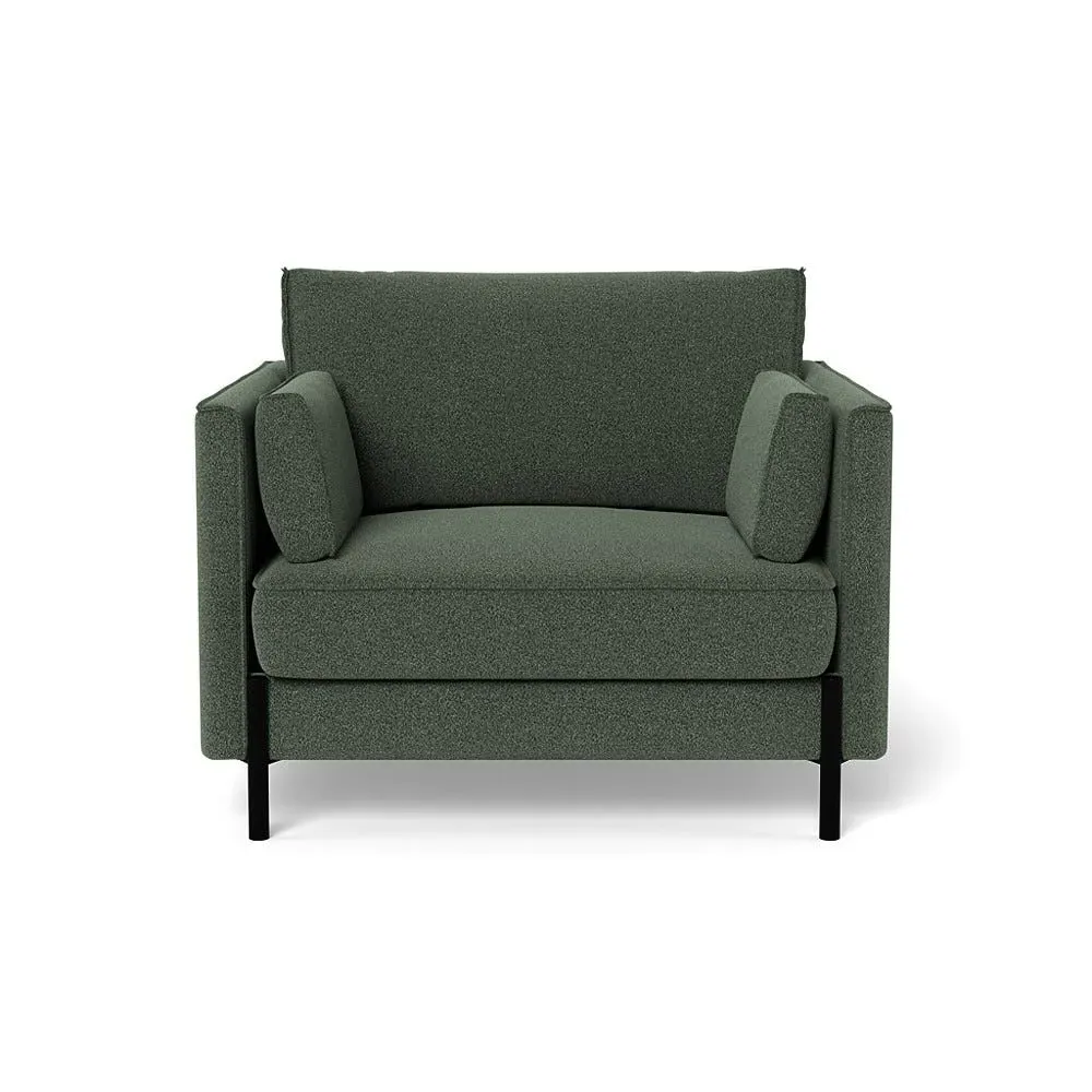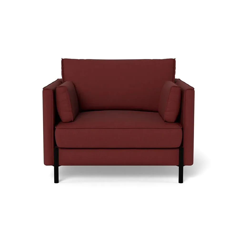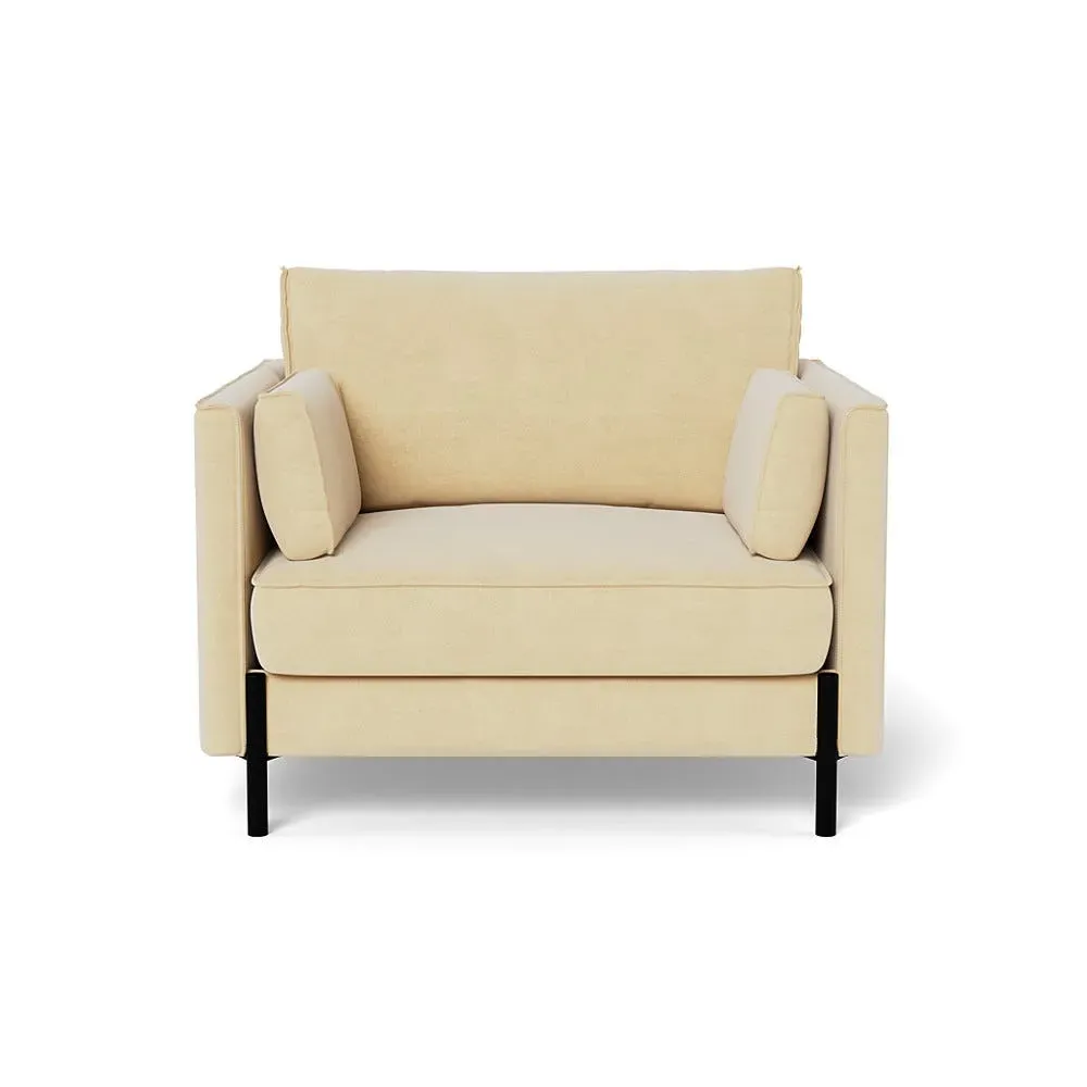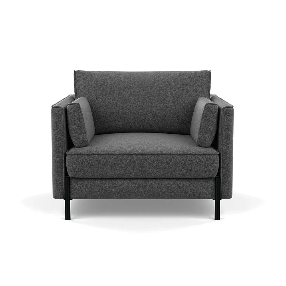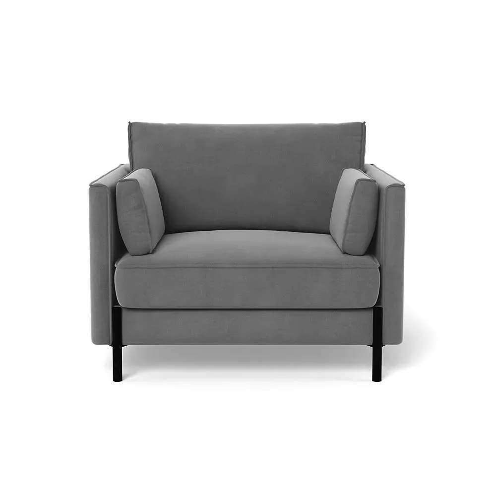 The armchair combines comfort with contemporary design through its deep foam seat cushions wrapped in duck feather jackets for a soft-to-medium feel. Slim arms create generous seating space while maintaining an elegant profile, with French seam detailing adding refined finishing touches. The powder-coated steel legs provide sturdy support with a sleek appearance that complements the overall minimalist aesthetic.