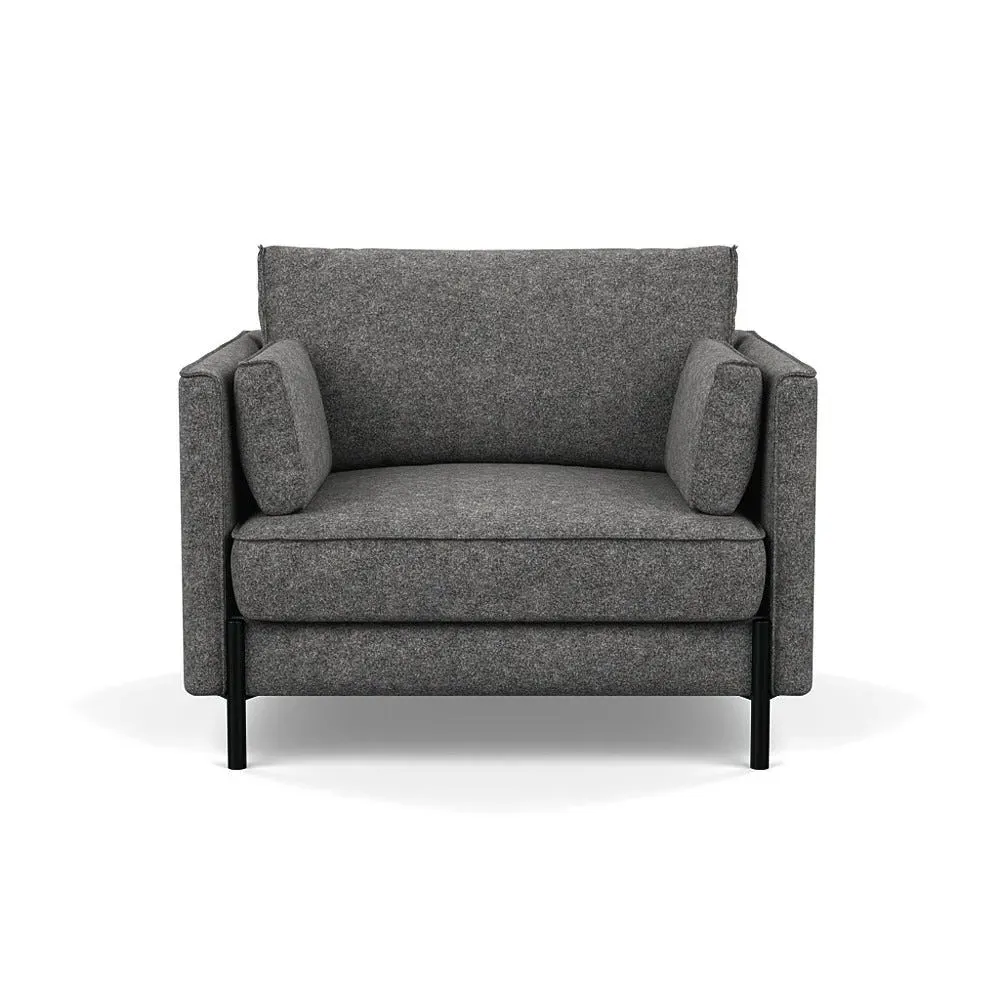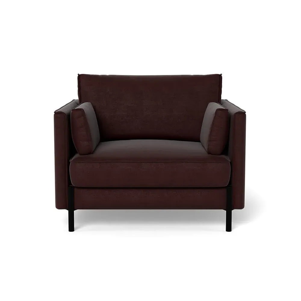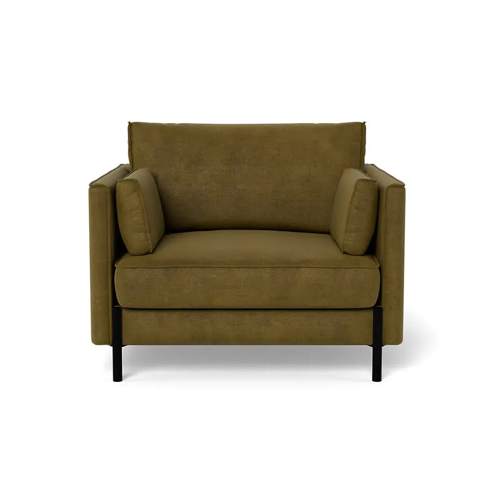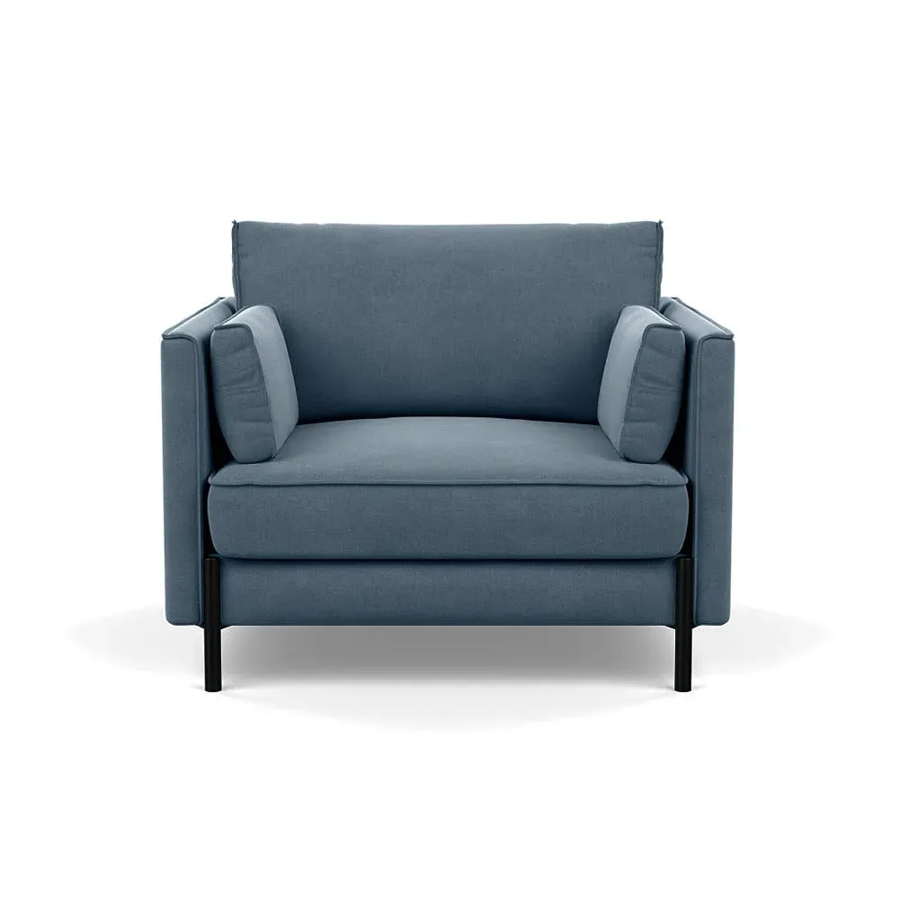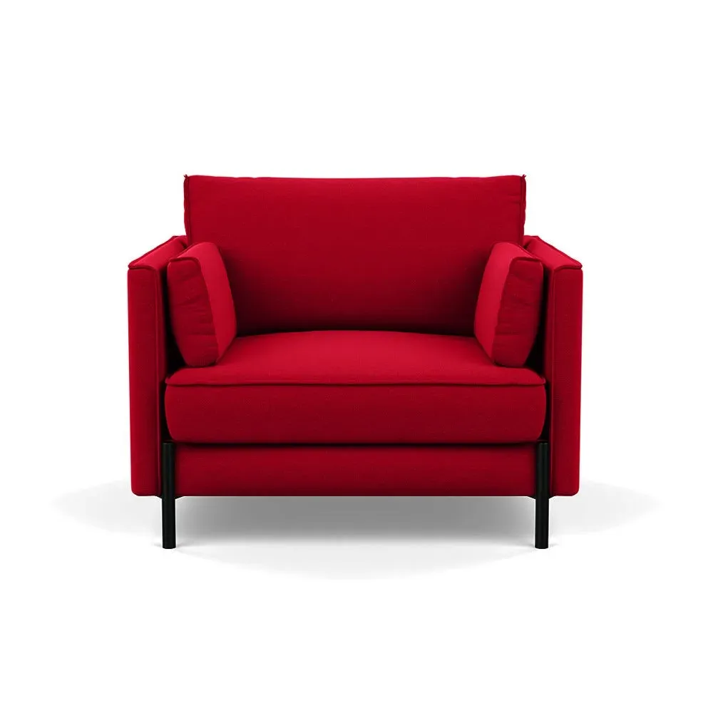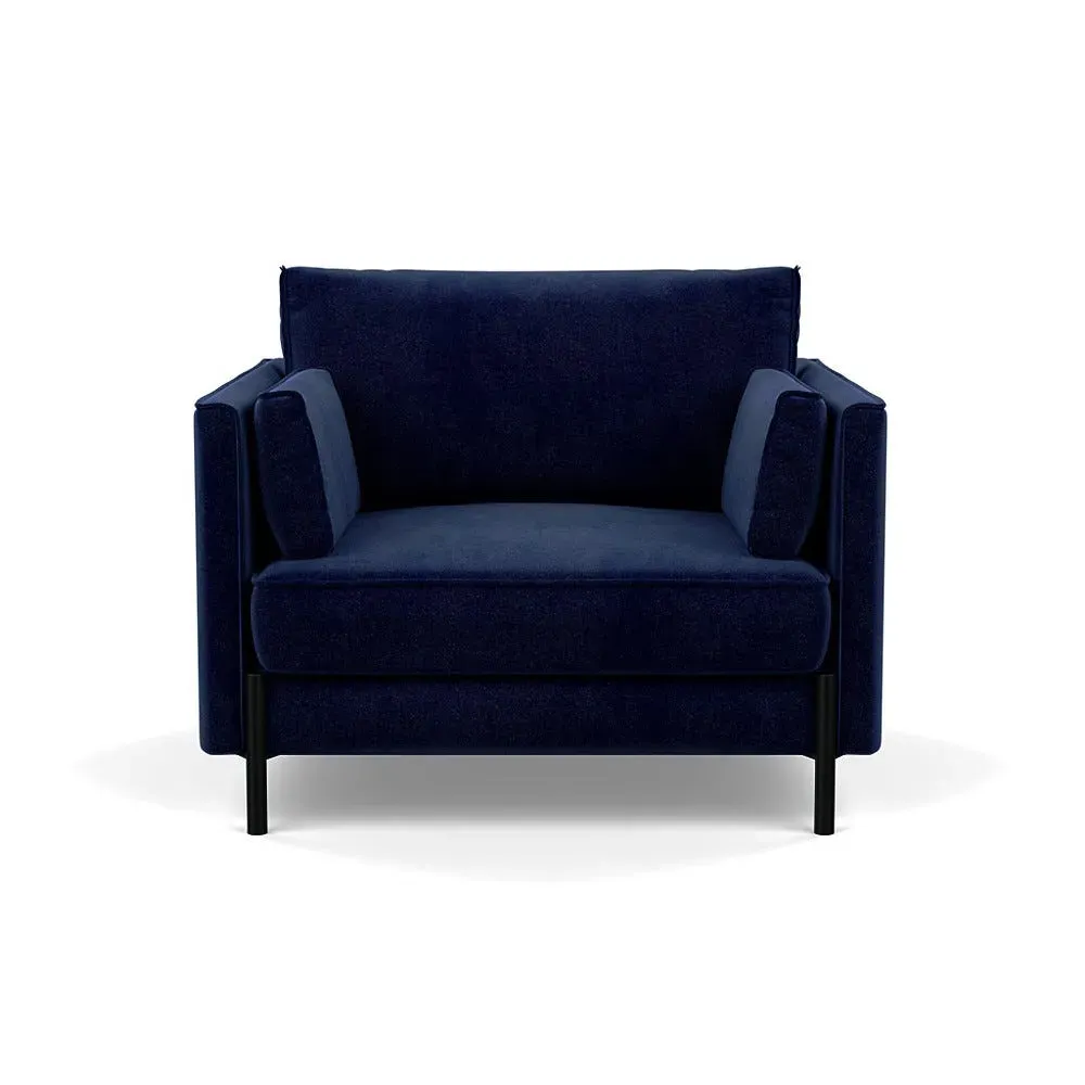 The armchair combines comfort with contemporary design through its deep foam seat cushions wrapped in duck feather jackets for a soft-to-medium feel. Slim arms create generous seating space while maintaining an elegant profile, with French seam detailing adding refined finishing touches. The powder-coated steel legs provide sturdy support with a sleek appearance that complements the overall minimalist aesthetic.