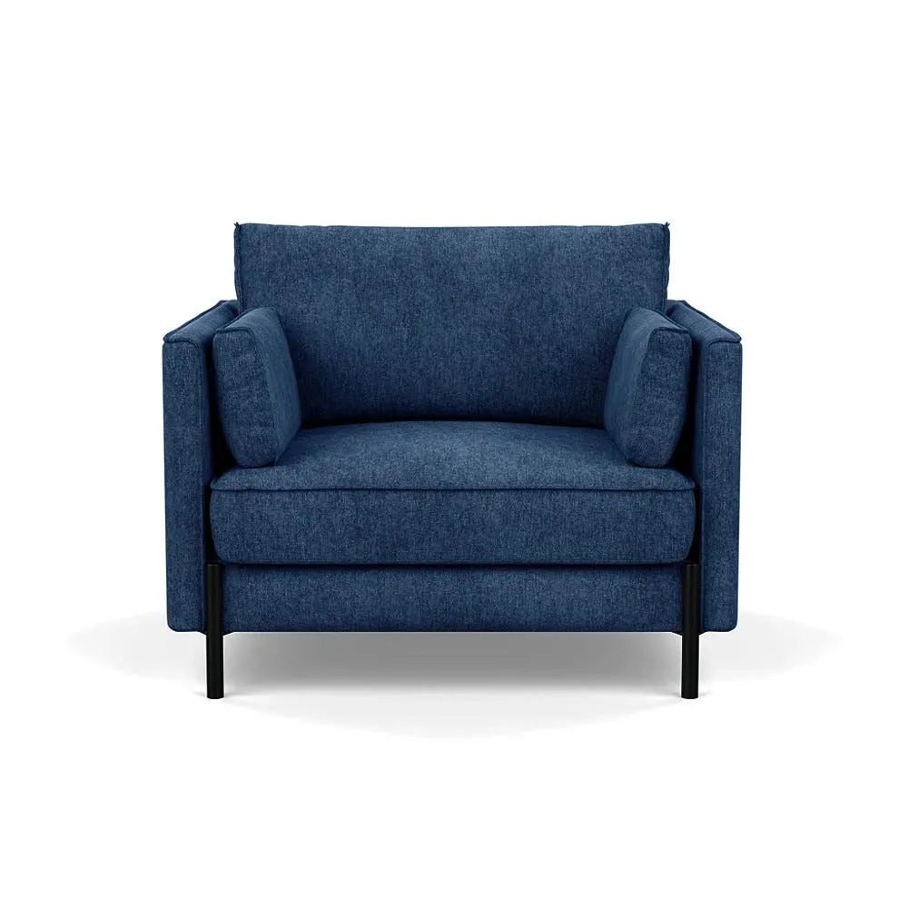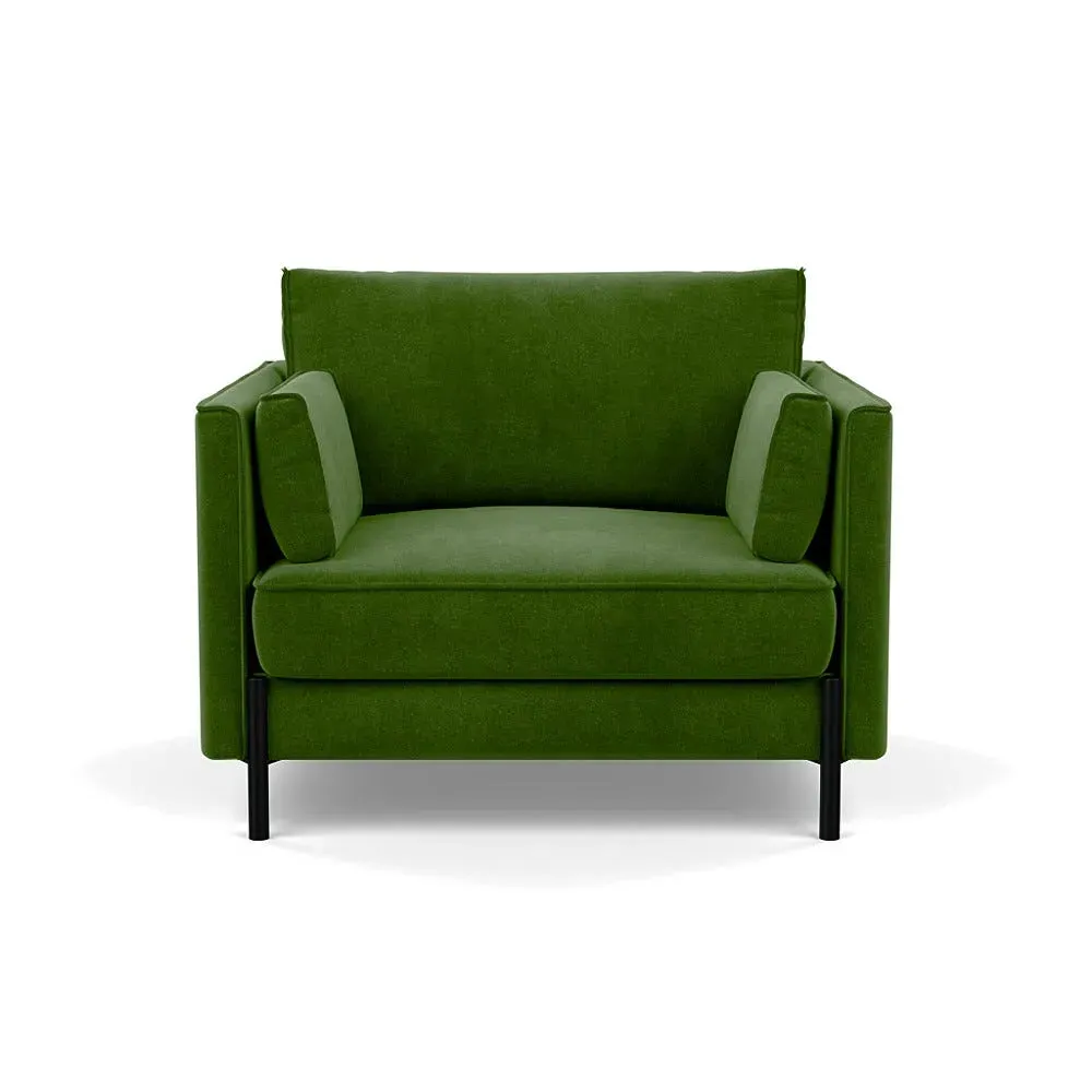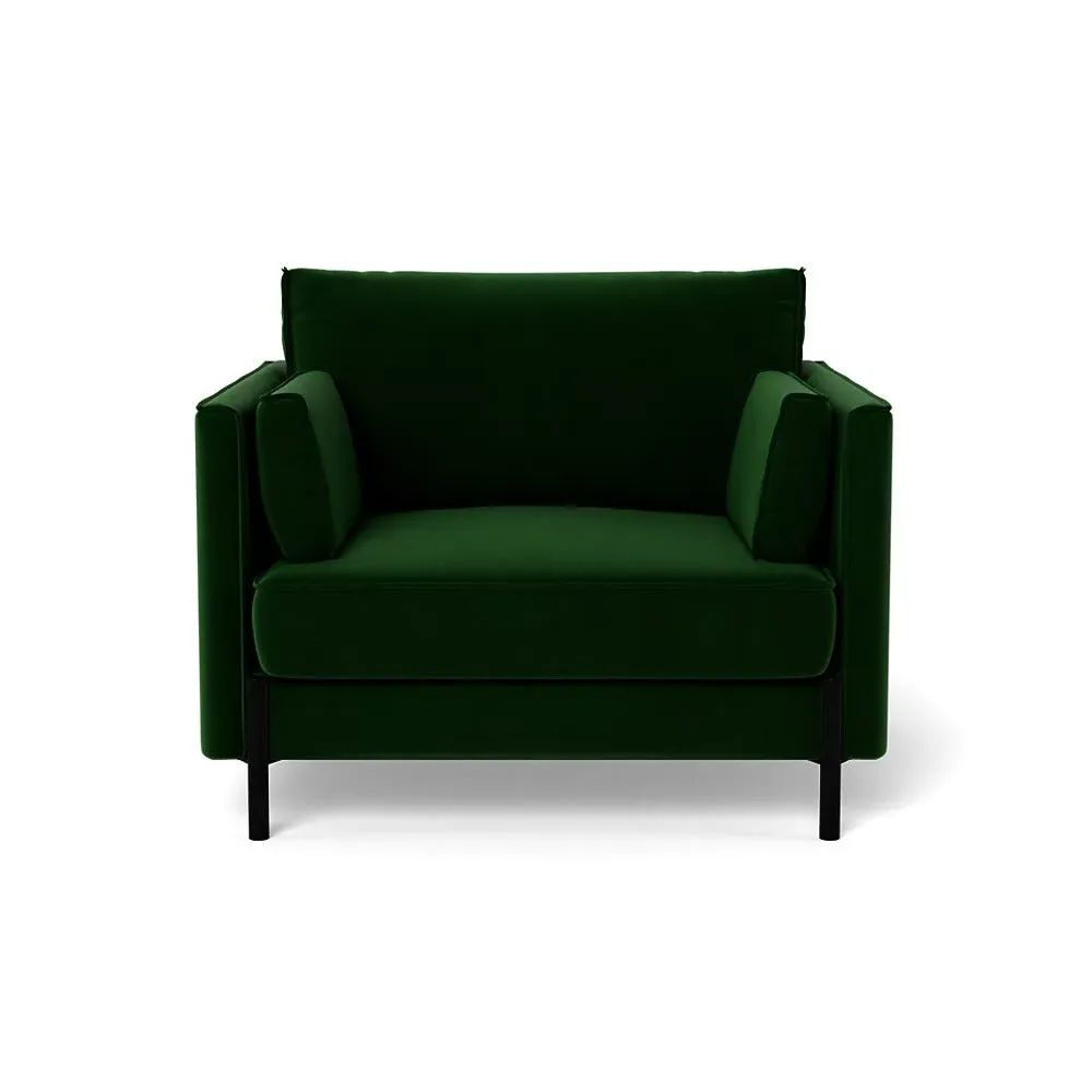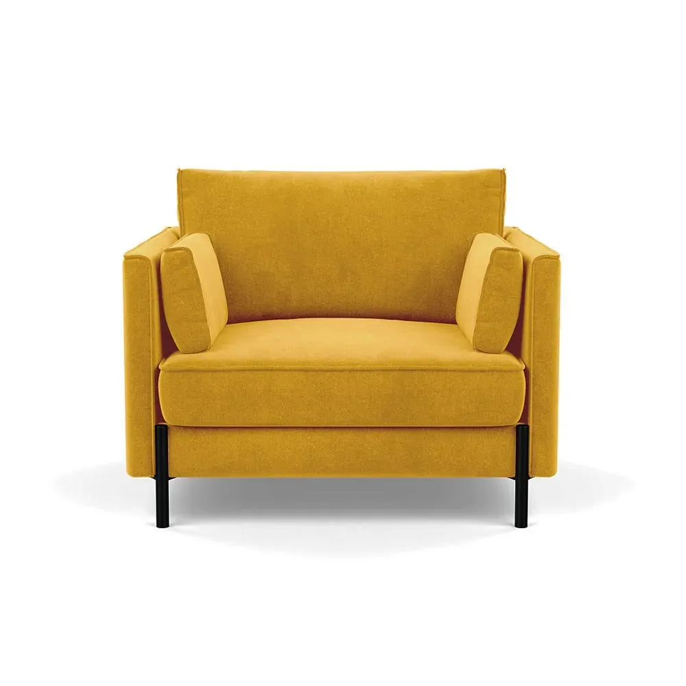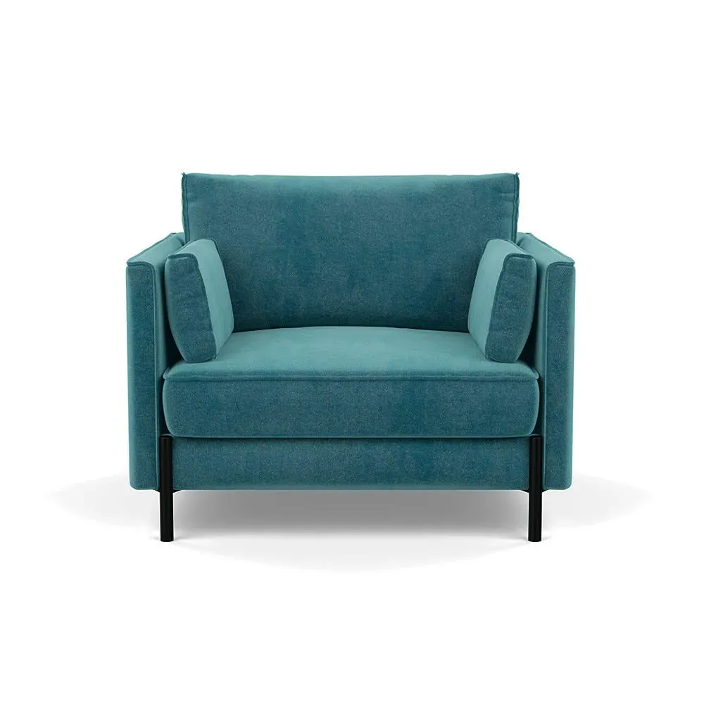 The armchair combines comfort with contemporary design through its deep foam seat cushions wrapped in duck feather jackets for a soft-to-medium feel. Slim arms create generous seating space while maintaining an elegant profile, with French seam detailing adding refined finishing touches. The powder-coated steel legs provide sturdy support with a sleek appearance that complements the overall minimalist aesthetic.
