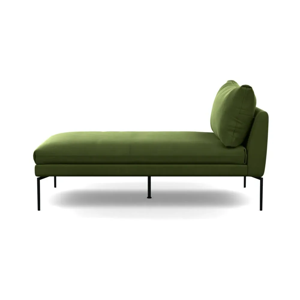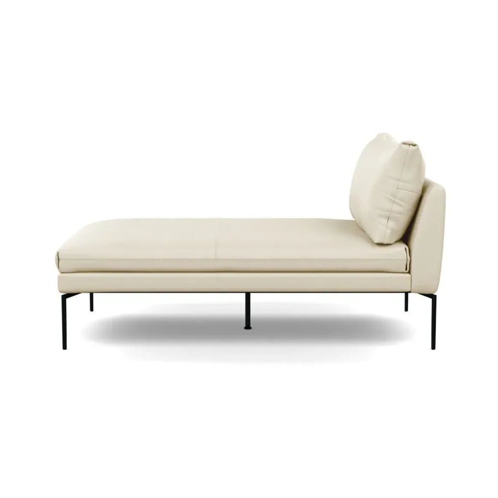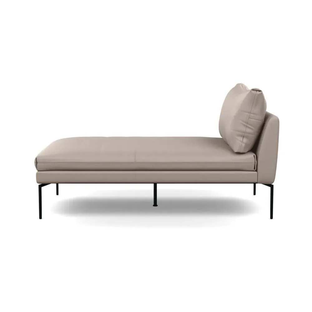 The chaise longue combines contemporary design with traditional Italian craftsmanship, featuring a streamlined silhouette and pleated detailing. Its memory foam padding maintains shape over time, while the slim black metal legs provide stable support. The pared-back design offers versatile placement options, and the elegant construction ensures lasting comfort.