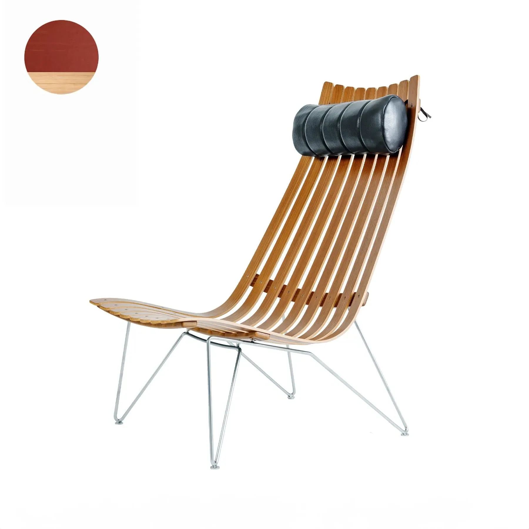 The lounge chair combines mid-century design with contemporary comfort through its arched laminated shell and oak veneer construction. Its high-back profile provides excellent support, while the leather neck cushion adds luxurious comfort. The black lacquered swivel base offers smooth rotation and stability, and the laminated shell construction ensures lasting durability.